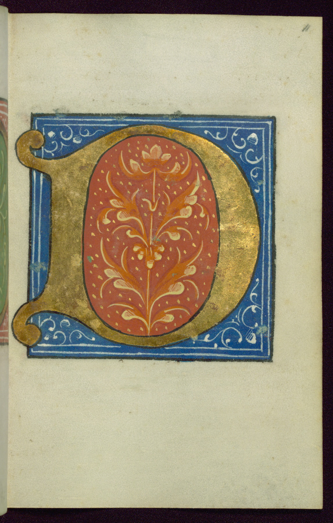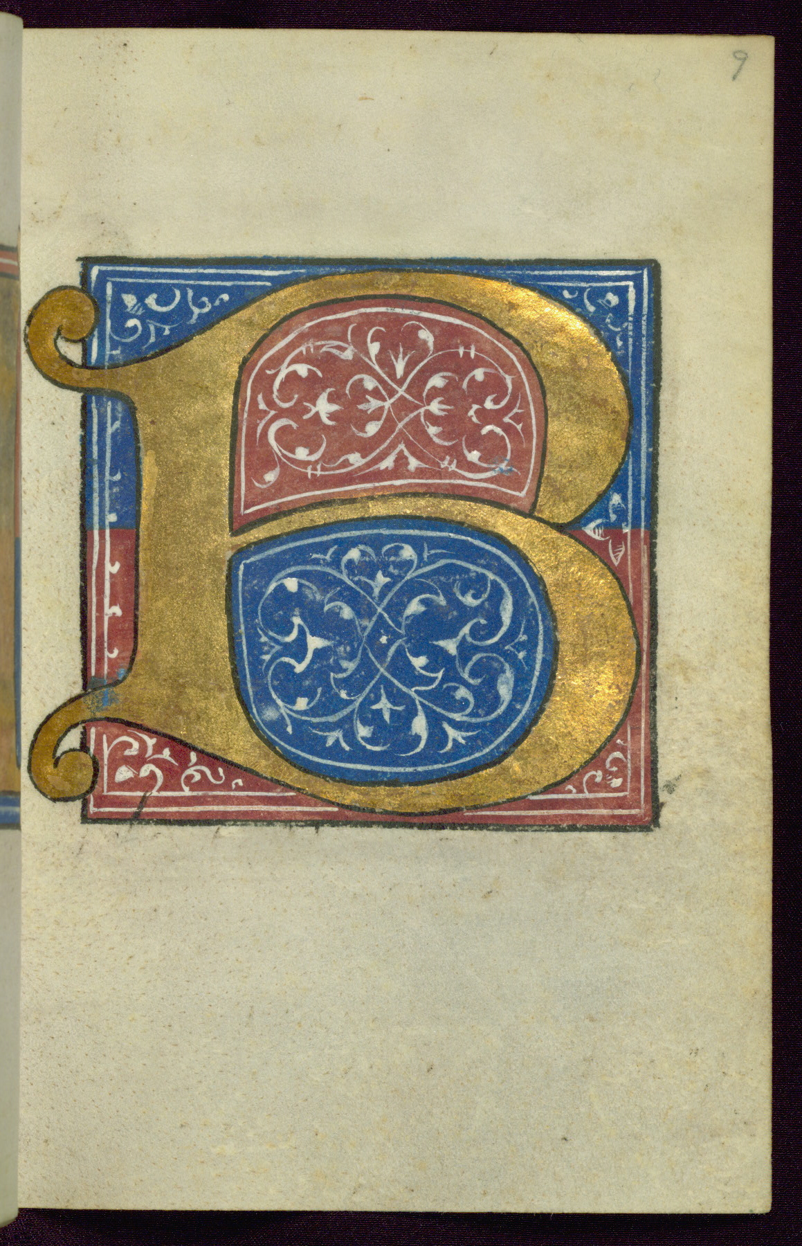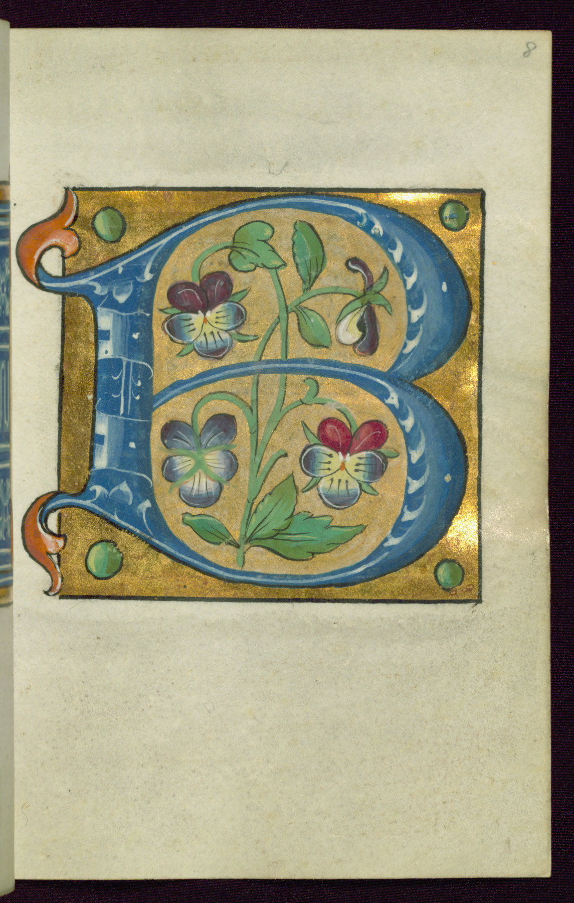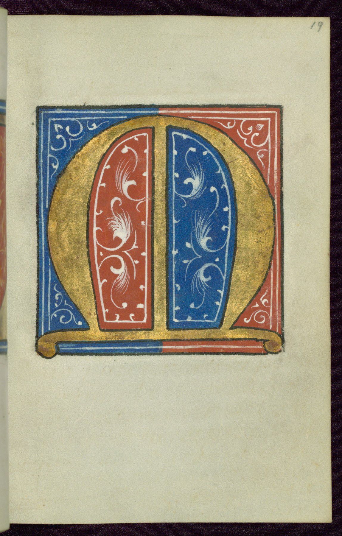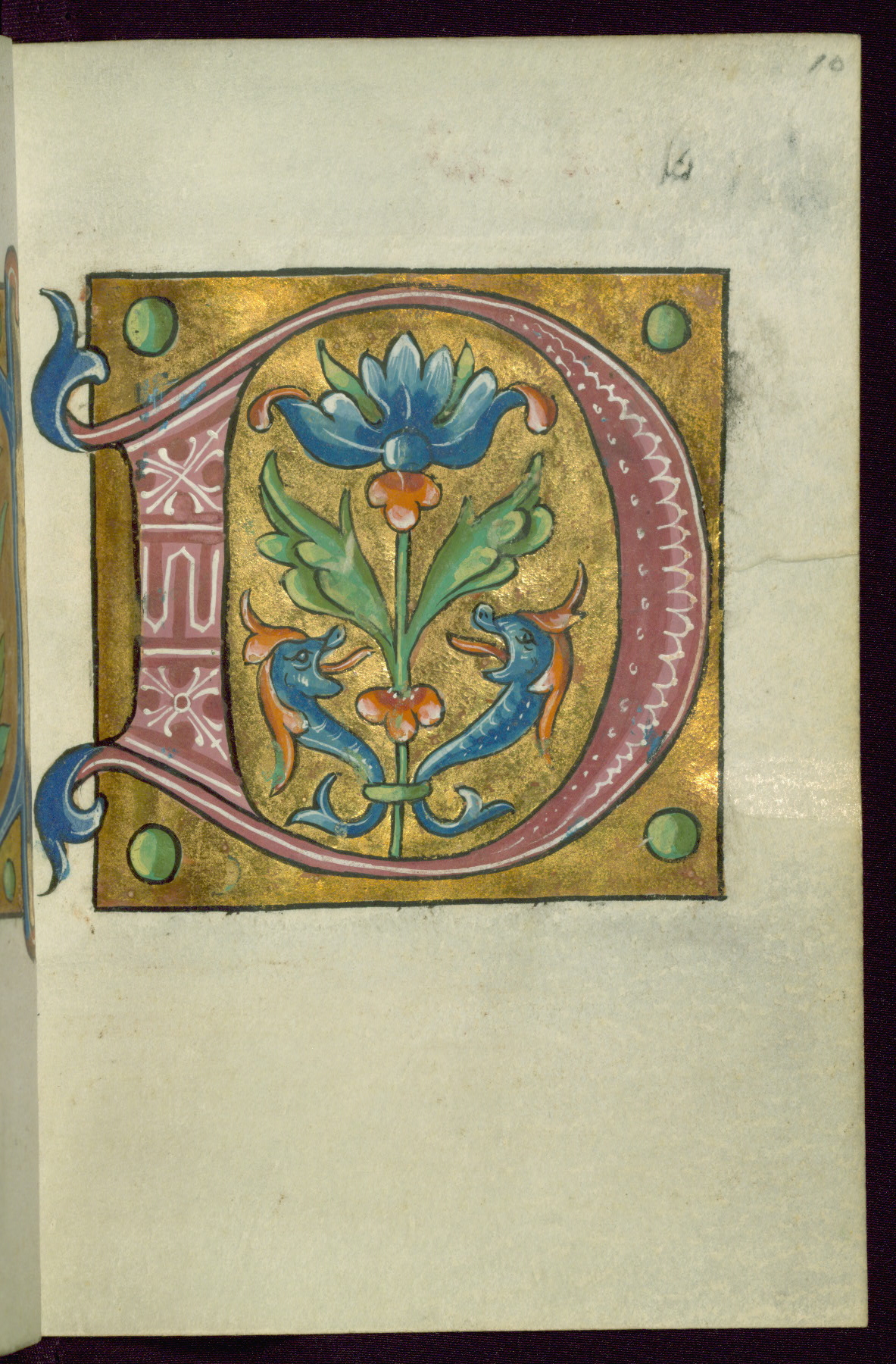 - Decoration note: Twenty-four illuminated letters of the medieval alphabet (excludes J and V) in two alternating styles; Style 1: found on fols. 7v-8r, 9v-10r, etc.; stylistically tied to French 16th century illuminations; blue or rose initials with white patterning, ending in blue, orange, or rose foliate terminals, outlined in black, on black-outlined backgrounds of burnished and/or liquid gold, two or four green disks in corners of the background, infill of naturalistic flowers and fruits; Style 2: found on fols. 8v-9r, 10v-11r, etc.; stylistically tied to Dutch 15th century initials; burnished gold intials with lobed terminals, outlined in black, backgrounds in blue and deep red with white foliate patterning, floral motifs in some infills with lead tin yellow and malachite green detailing; Impression from a rectangular plaque in the front endleaves, showing a seated nimbed figure, possibly the Virgin Mary and Christ child
