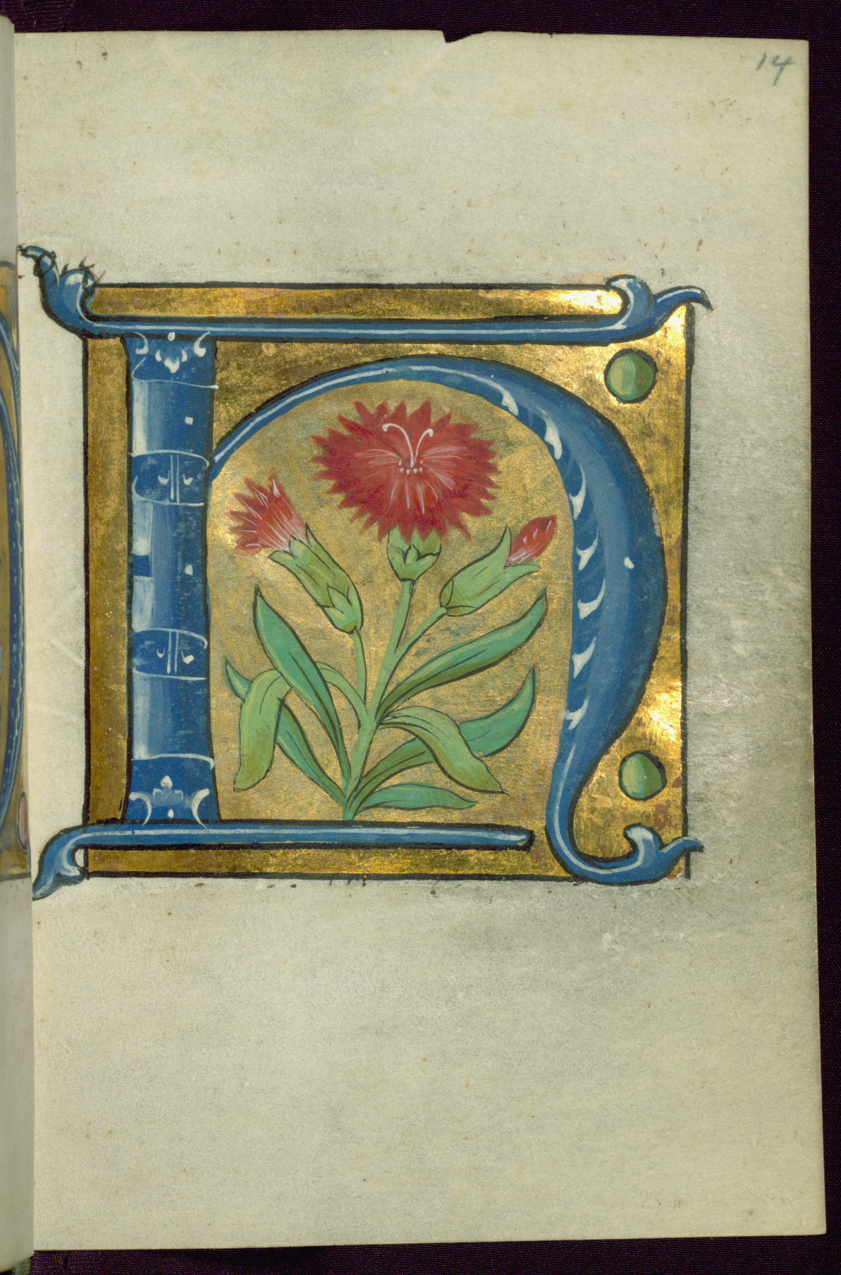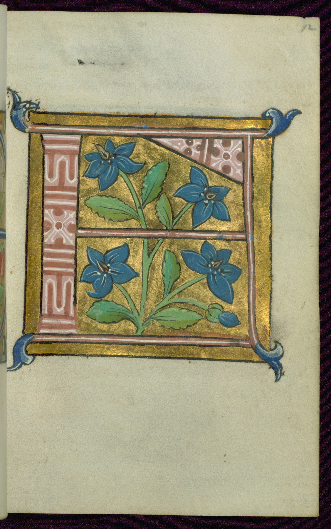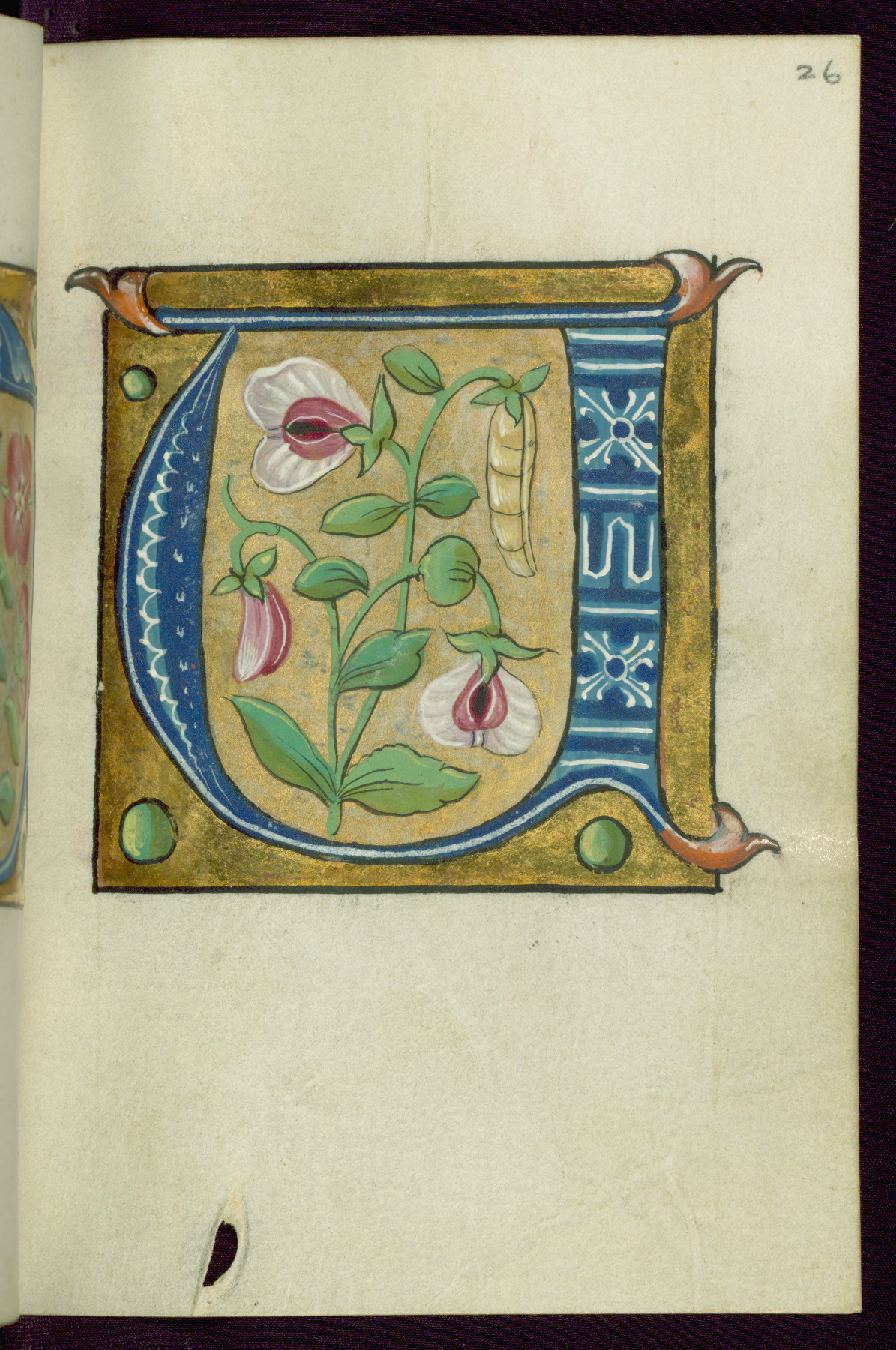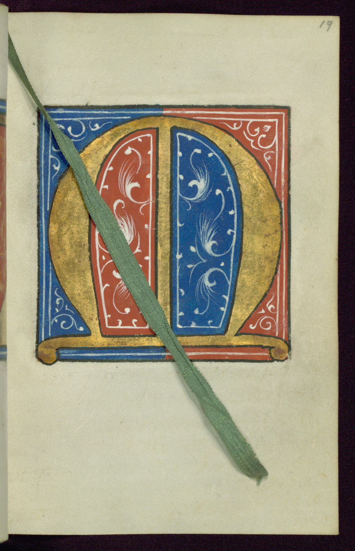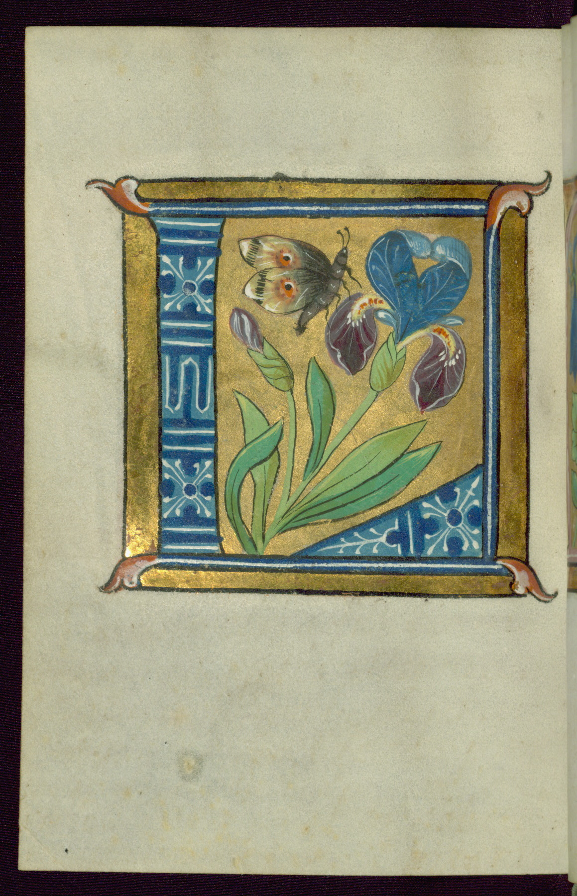 - Decoration note: Twenty-four illuminated letters of the medieval alphabet (excludes J and V) in two alternating styles; Style 1: found on fols. 7v-8r, 9v-10r, etc.; stylistically tied to French 16th century illuminations; blue or rose initials with white patterning, ending in blue, orange, or rose foliate terminals, outlined in black, on black-outlined backgrounds of burnished and/or liquid gold, two or four green disks in corners of the background, infill of naturalistic flowers and fruits; Style 2: found on fols. 8v-9r, 10v-11r, etc.; stylistically tied to Dutch 15th century initials; burnished gold intials with lobed terminals, outlined in black, backgrounds in blue and deep red with white foliate patterning, floral motifs in some infills with lead tin yellow and malachite green detailing; Impression from a rectangular plaque in the front endleaves, showing a seated nimbed figure, possibly the Virgin Mary and Christ child