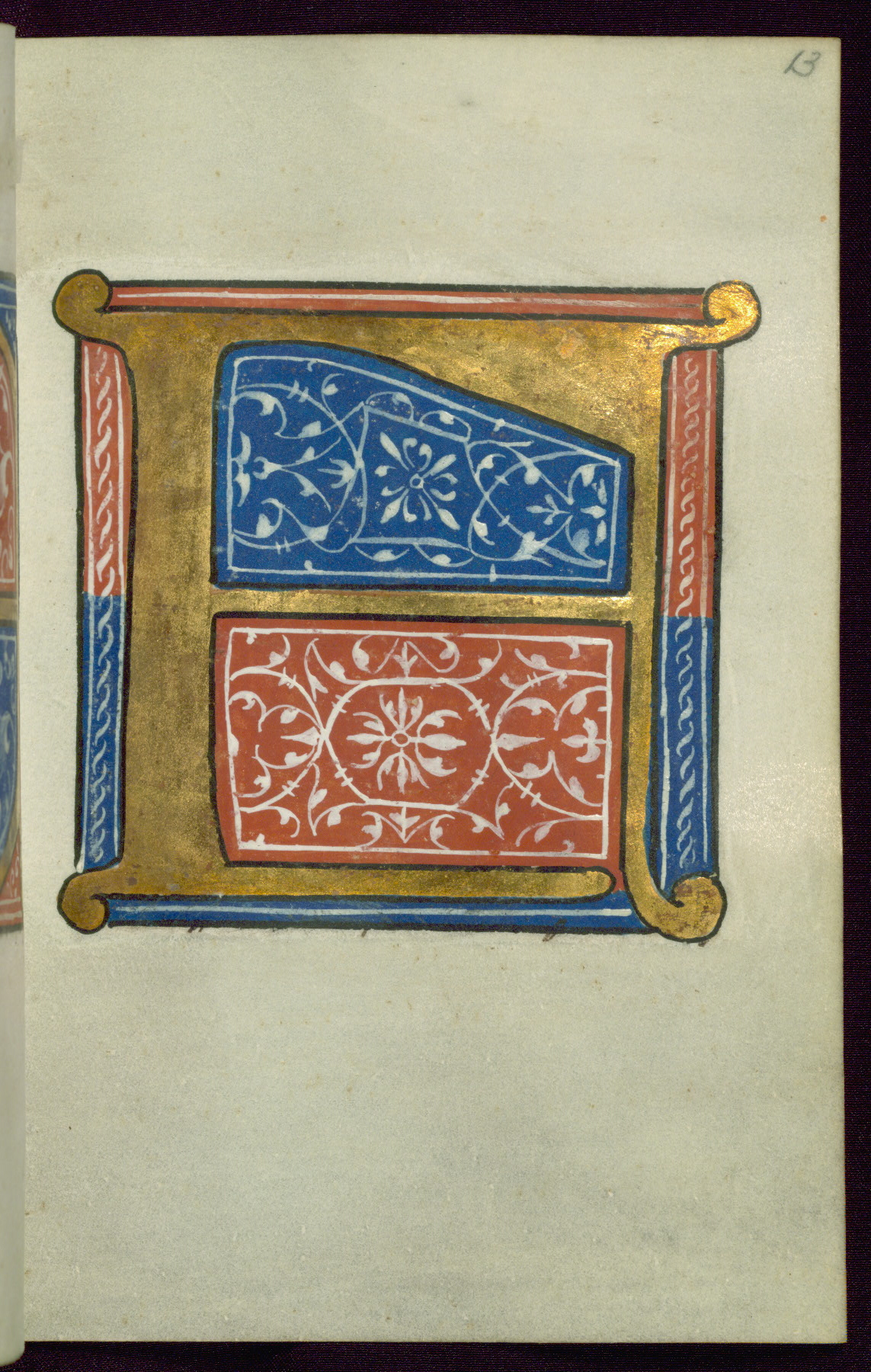 The medieval alphabet is illuminated in two different styles. Without any accompanying text, the original purpose of the book remains unclear, but scholars have suggested that it was a sample or model book for manuscript illuminators, or that it was intended as a gift. The book was rebound in the eighteenth century, and in the same century extensive notes, which have since been erased, were made alongside the initials.