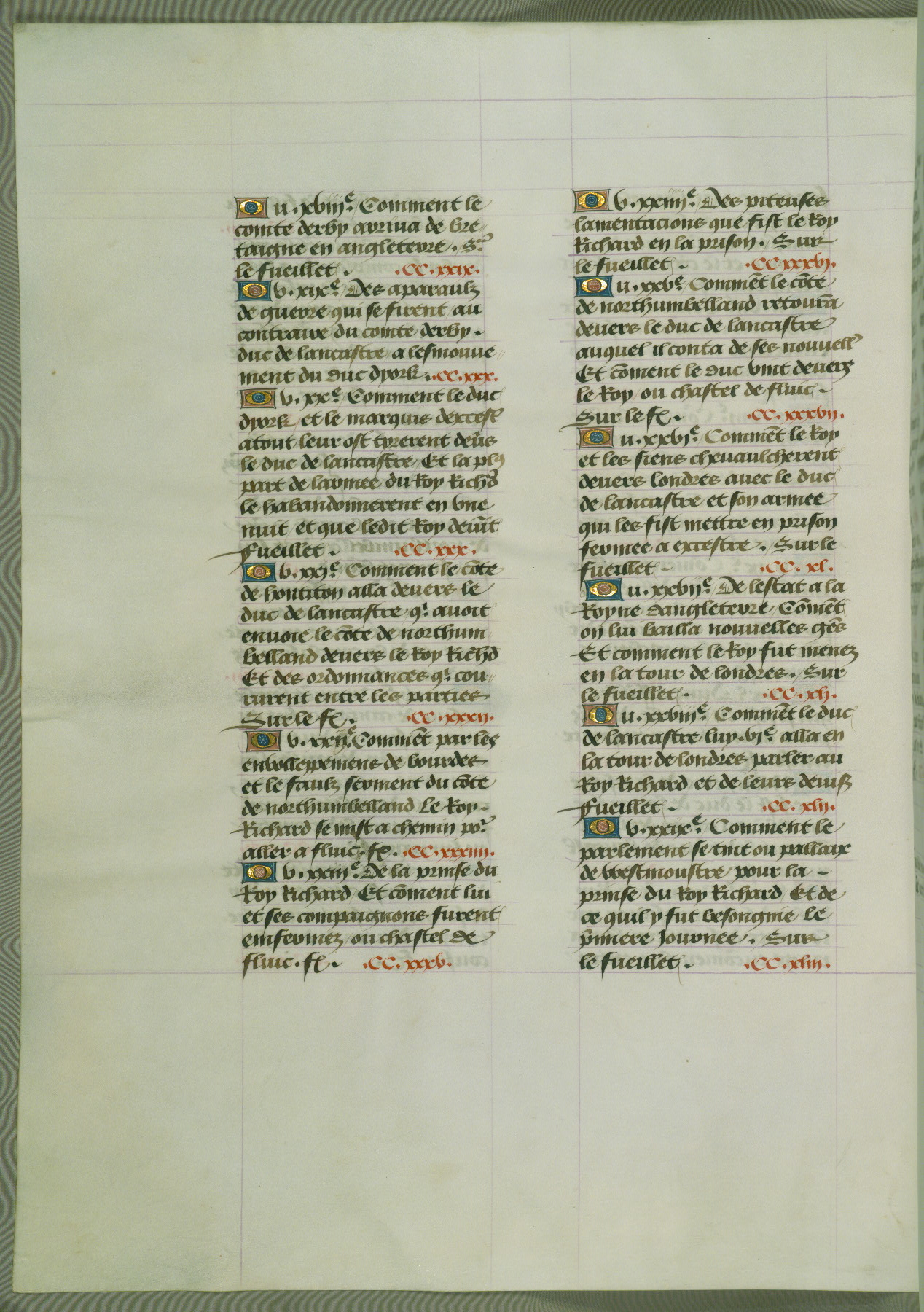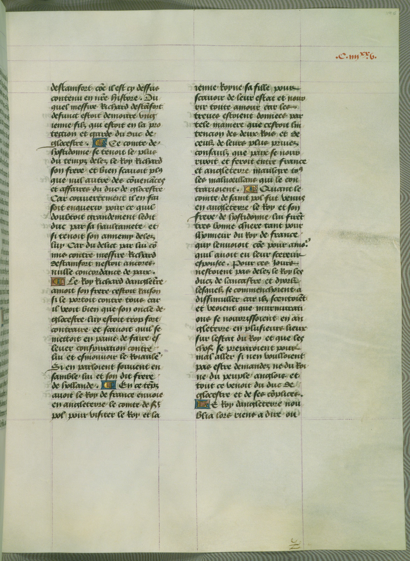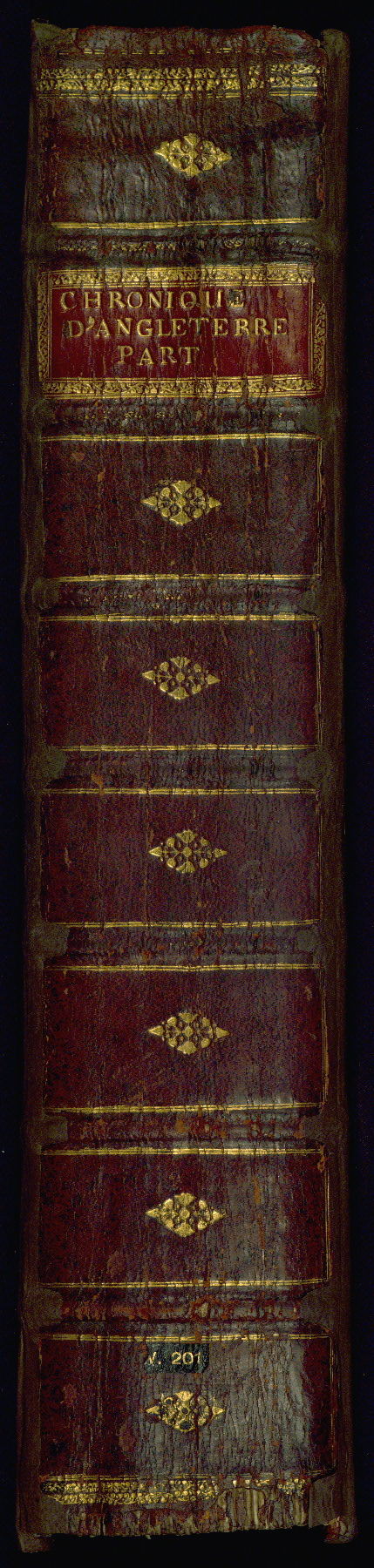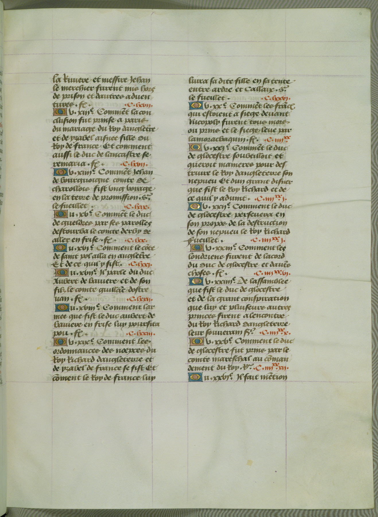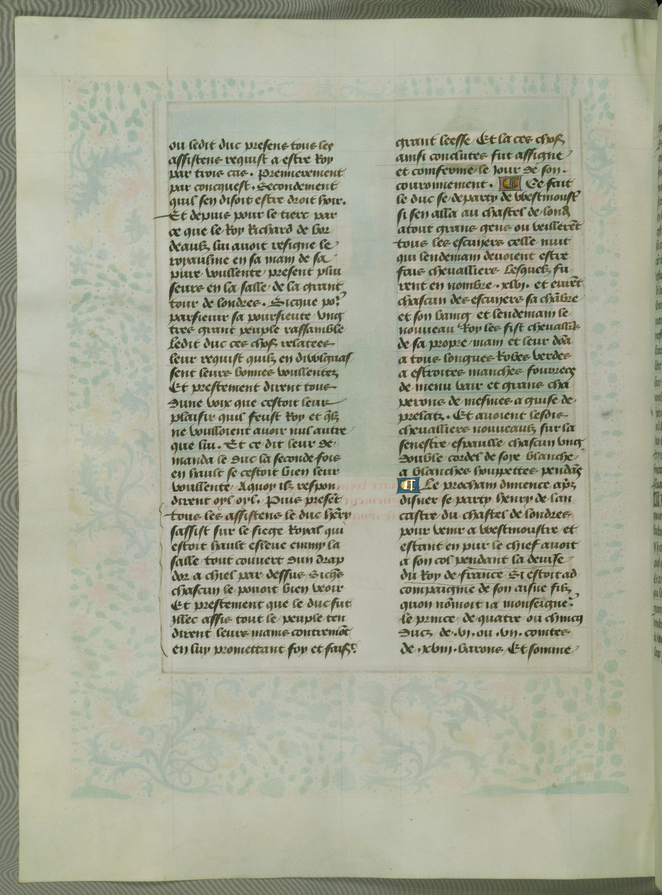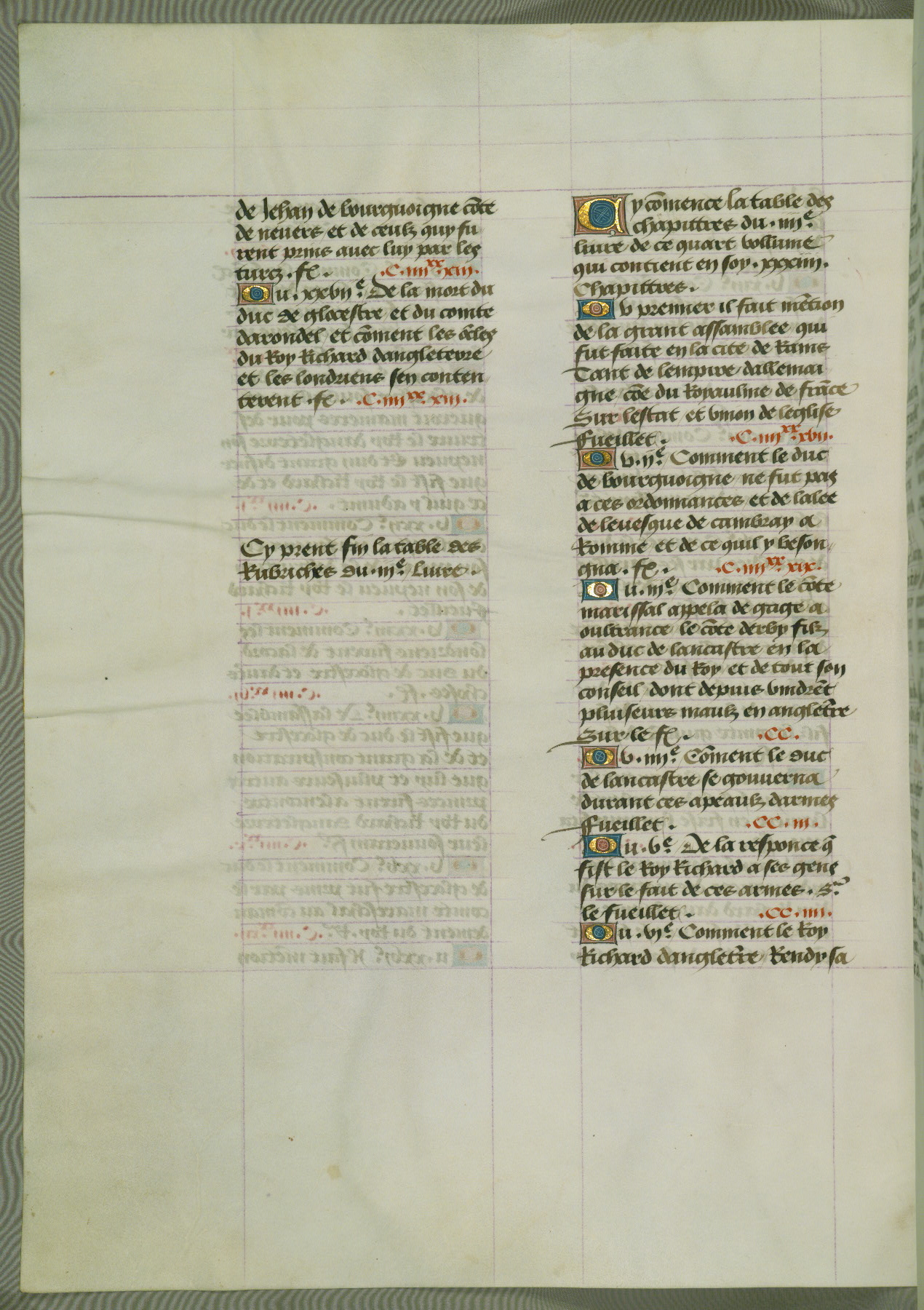This manuscript is volume IV in a set of five from the collection "Recueil des chroniques et anchiennes istories de la Grant Bretaigne," written by Phillip the Good's counselor and chamberlain Jean de Wavrin. It chronicles the history of England from the early years of the reign of Richard II in 1377 to the demise of Henry IV, his successor, between 1400 and 1413. This volume, produced in Flanders between 1470 and 1480, was part of a set of which volumes II, III and V were recorded in the inventory of the library of William III of Orange in 1686, and was later rebound during the seventeenth or eighteenth century. Six three-quarter-page miniatures open the text of each book and depict events documented therein (with the exception of that of Book 1, portraying Richard II's coronation, which occurs prior to the period detailed in that book). The manuscript's margins are wide and relatively pristine throughout the textblock, but show significant signs of use on illuminated folios, indicating that this manuscript was primarily used for display and not as a historical text. Although few volumes of the Chroniques remain, this manuscript is particularly rare in that it is one of the two surviving exemplars of the text of volume IV, the other being part of the complete set in the Bibliothèque nationale de France (BN fr. 74-85). Volumes II, III, and V of the set to which this volume originally belonged are now in the collection of the Koninklijke Bibliotheek (Den Haag, KB : 133 A 7).