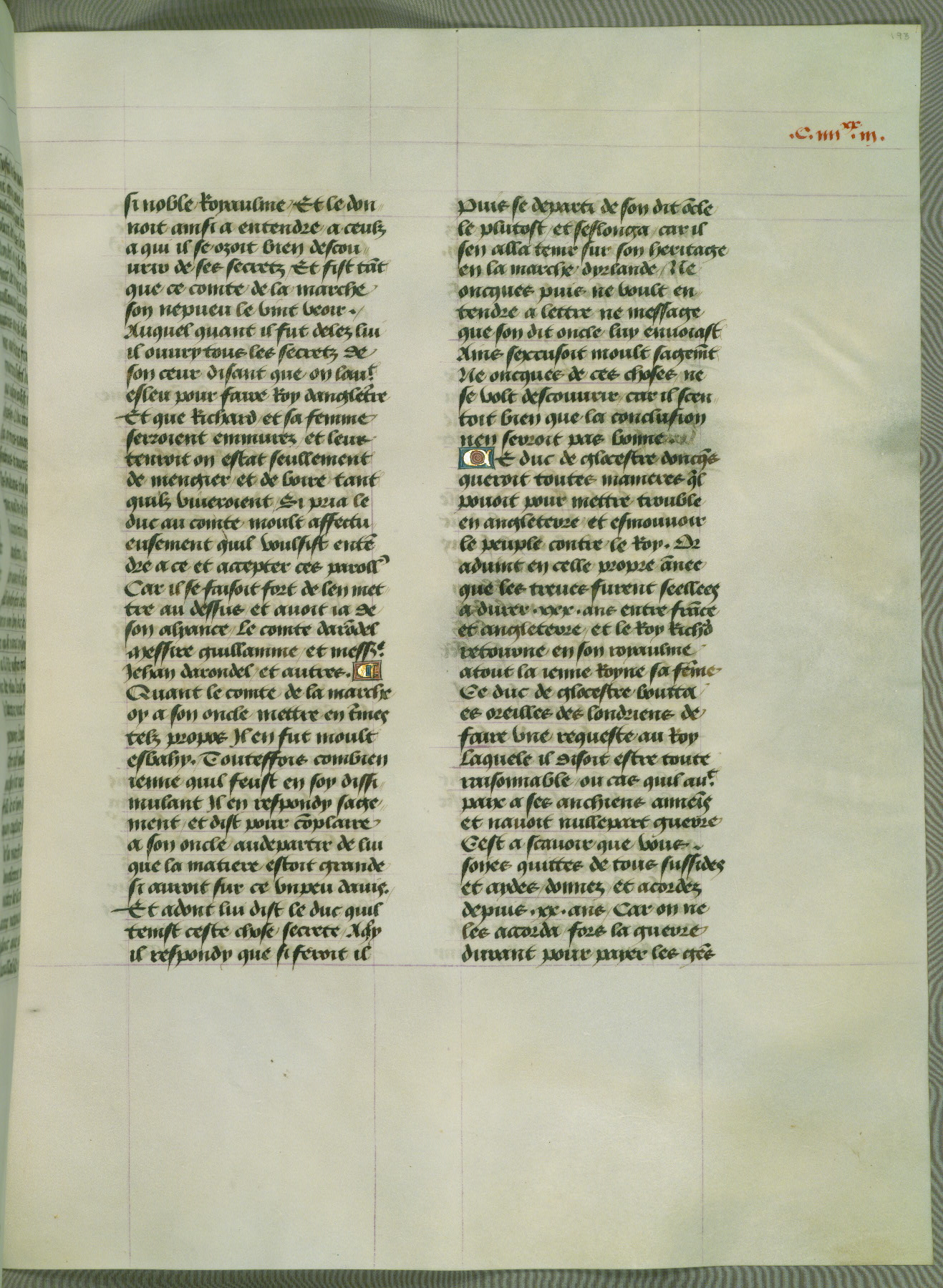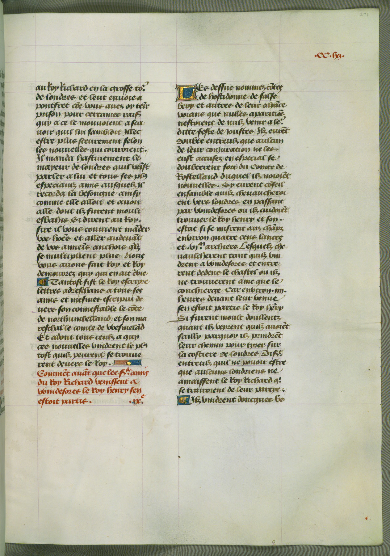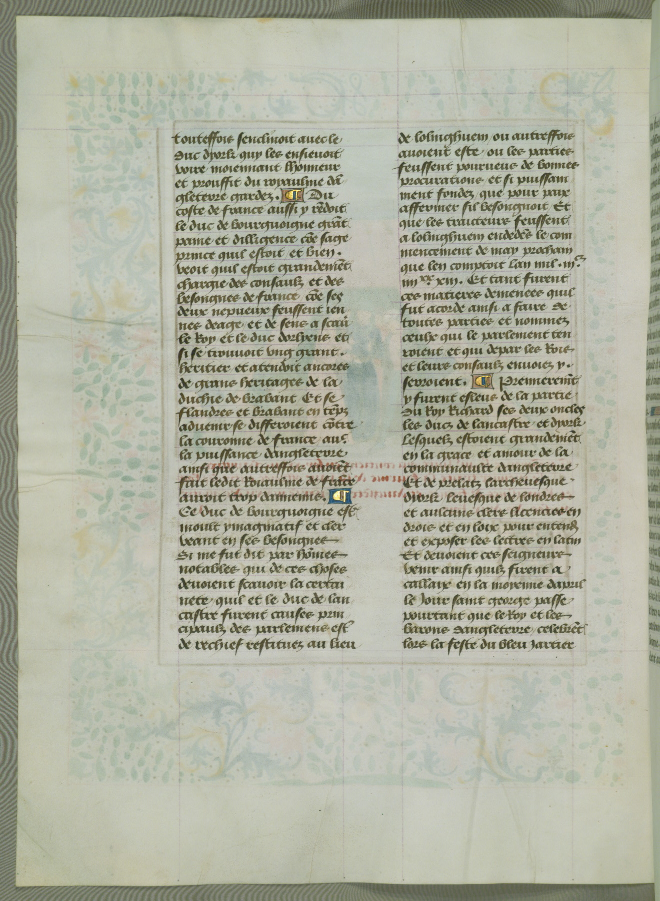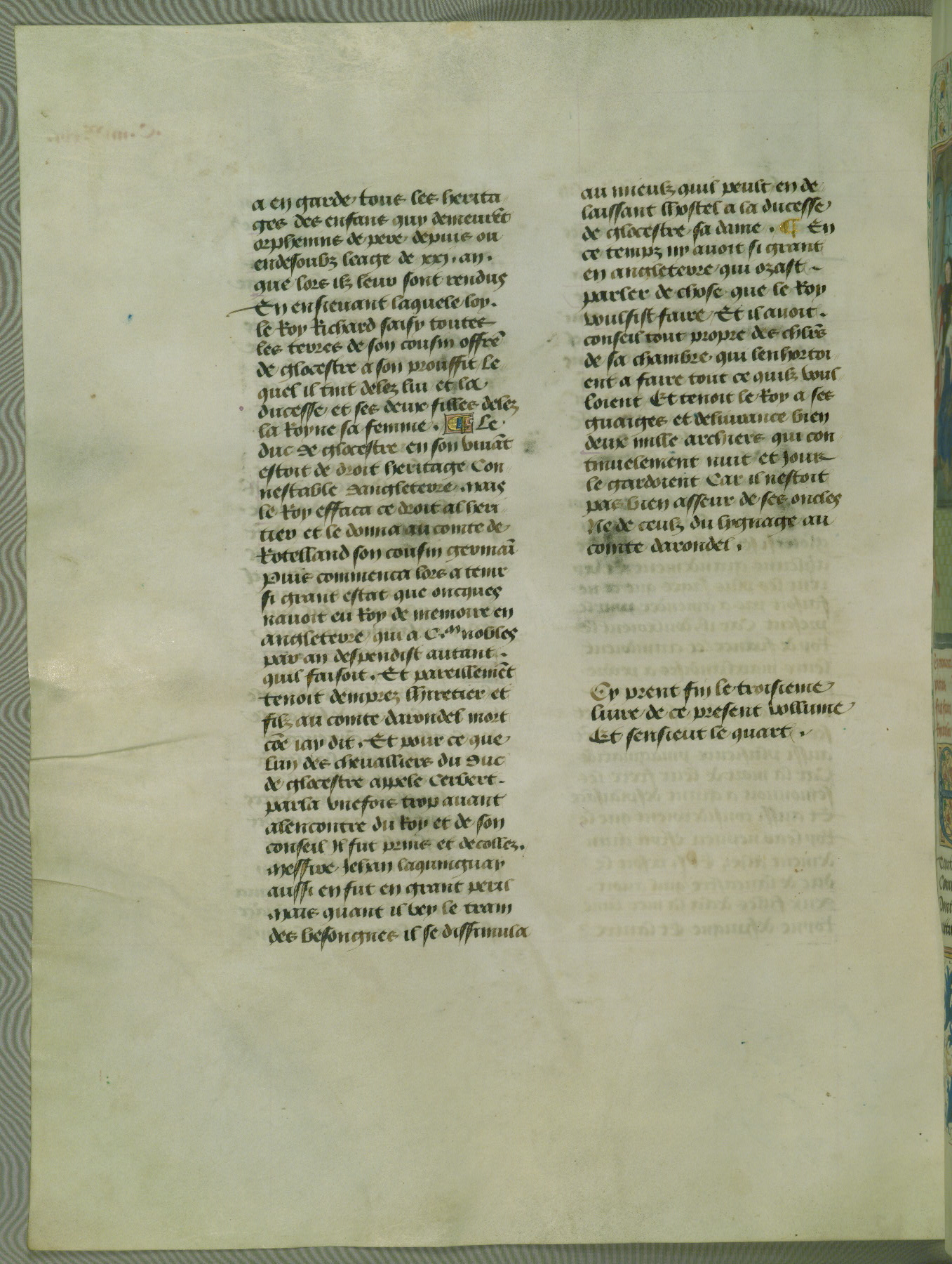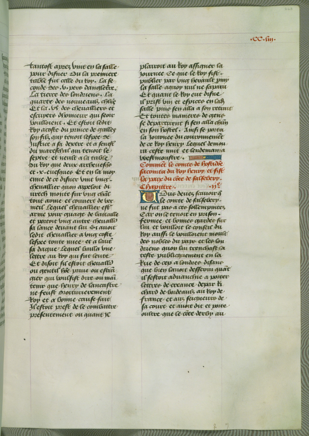 This manuscript is volume IV in a set of five from the collection "Recueil des chroniques et anchiennes istories de la Grant Bretaigne," written by Phillip the Good's counselor and chamberlain Jean de Wavrin. It chronicles the history of England from the early years of the reign of Richard II in 1377 to the demise of Henry IV, his successor, between 1400 and 1413. This volume, produced in Flanders between 1470 and 1480, was part of a set of which volumes II, III and V were recorded in the inventory of the library of William III of Orange in 1686, and was later rebound during the seventeenth or eighteenth century. Six three-quarter-page miniatures open the text of each book and depict events documented therein (with the exception of that of Book 1, portraying Richard II's coronation, which occurs prior to the period detailed in that book). The manuscript's margins are wide and relatively pristine throughout the textblock, but show significant signs of use on illuminated folios, indicating that this manuscript was primarily used for display and not as a historical text. Although few volumes of the Chroniques remain, this manuscript is particularly rare in that it is one of the two surviving exemplars of the text of volume IV, the other being part of the complete set in the Bibliothèque nationale de France (BN fr. 74-85). Volumes II, III, and V of the set to which this volume originally belonged are now in the collection of the Koninklijke Bibliotheek (Den Haag, KB : 133 A 7).