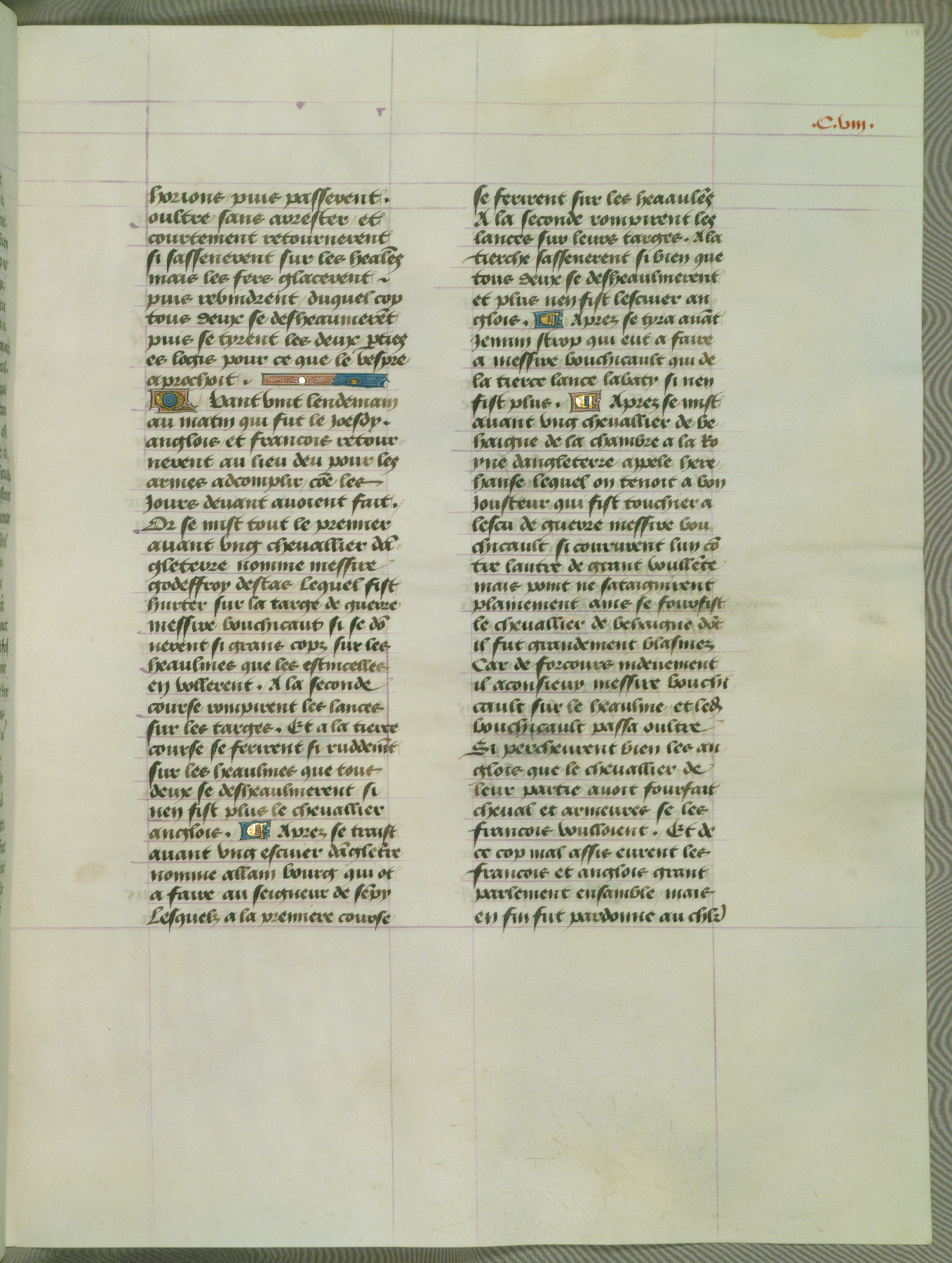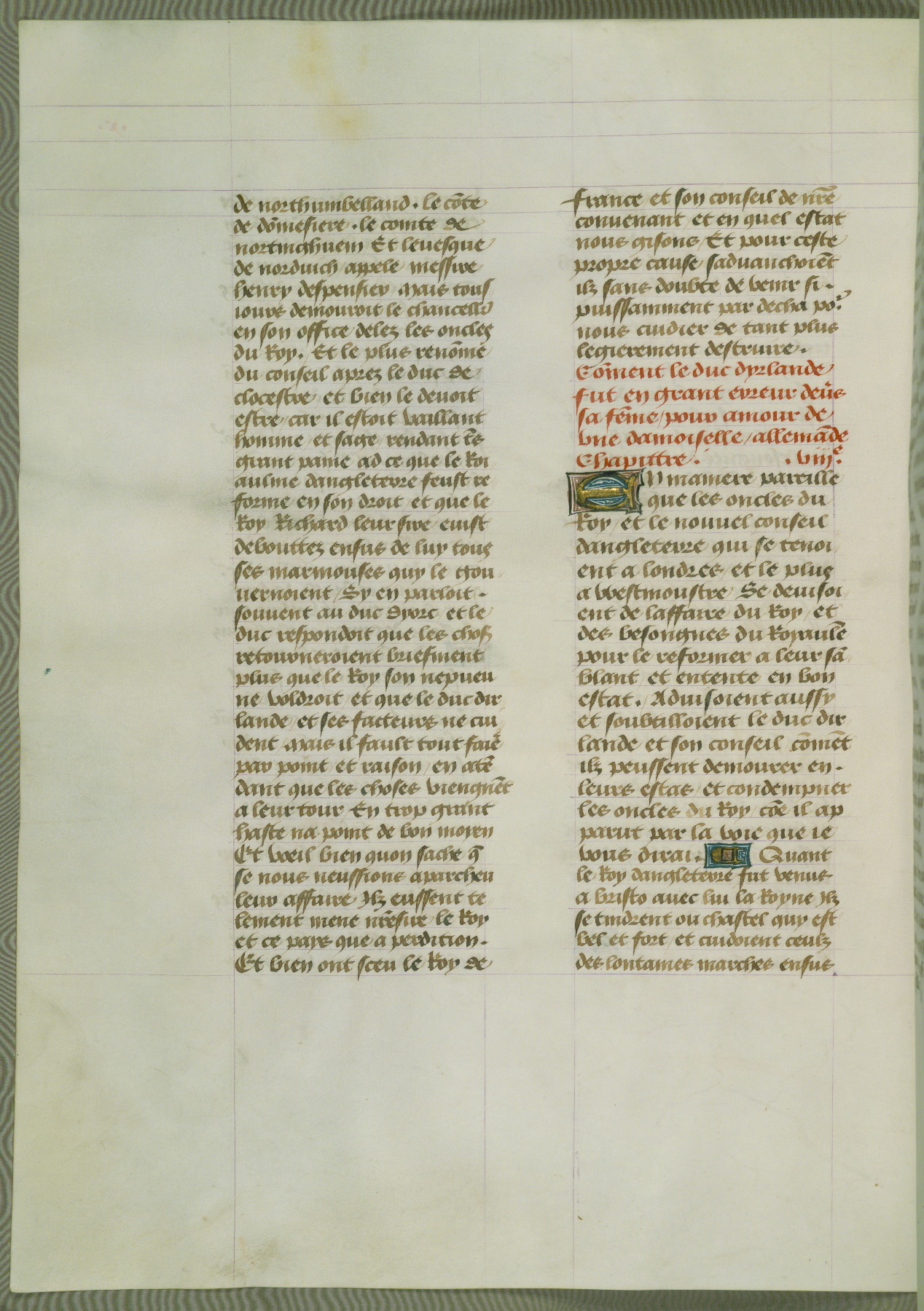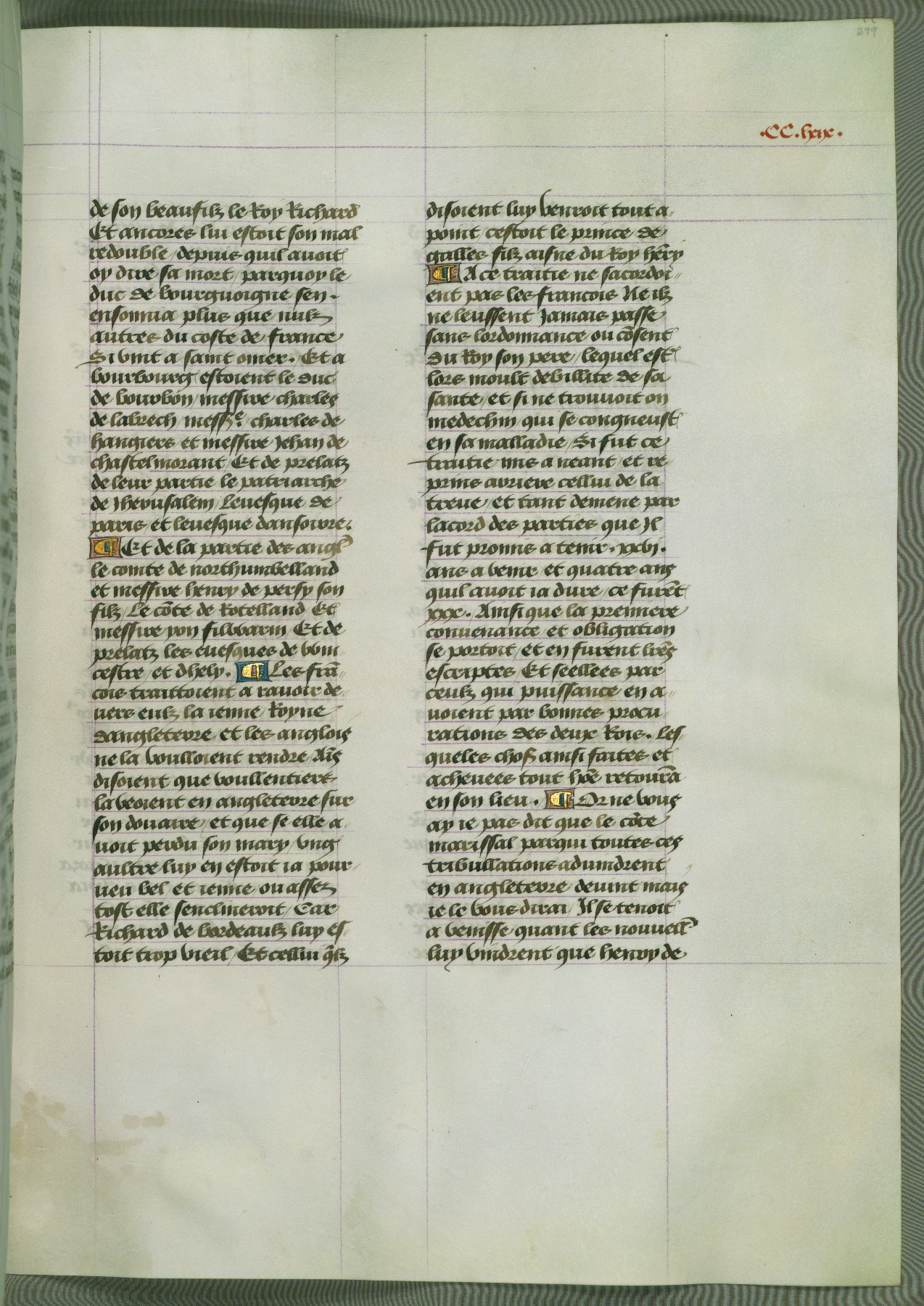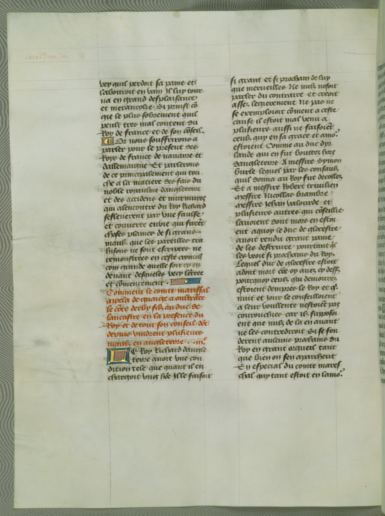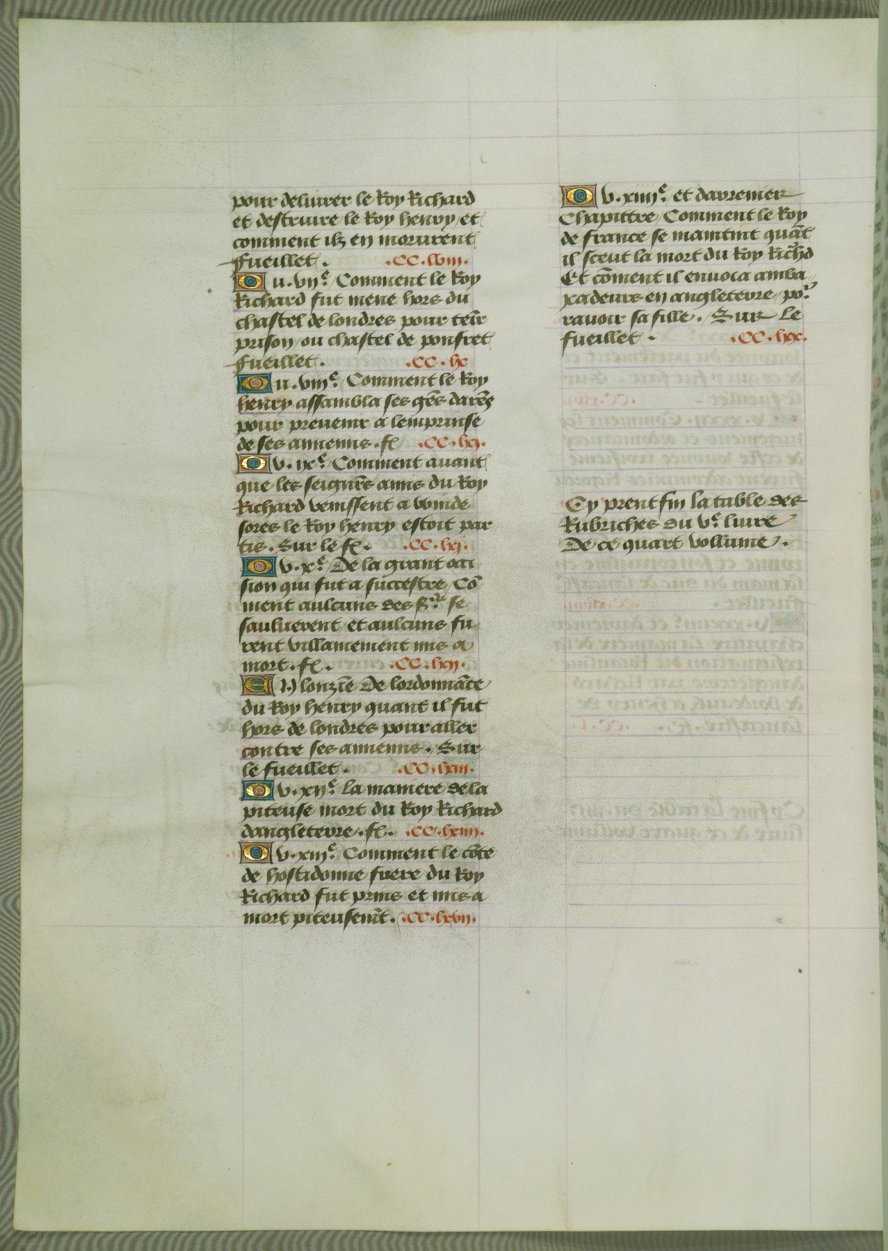 This manuscript is volume IV in a set of five from the collection "Recueil des chroniques et anchiennes istories de la Grant Bretaigne," written by Phillip the Good's counselor and chamberlain Jean de Wavrin. It chronicles the history of England from the early years of the reign of Richard II in 1377 to the demise of Henry IV, his successor, between 1400 and 1413. This volume, produced in Flanders between 1470 and 1480, was part of a set of which volumes II, III and V were recorded in the inventory of the library of William III of Orange in 1686, and was later rebound during the seventeenth or eighteenth century. Six three-quarter-page miniatures open the text of each book and depict events documented therein (with the exception of that of Book 1, portraying Richard II's coronation, which occurs prior to the period detailed in that book). The manuscript's margins are wide and relatively pristine throughout the textblock, but show significant signs of use on illuminated folios, indicating that this manuscript was primarily used for display and not as a historical text. Although few volumes of the Chroniques remain, this manuscript is particularly rare in that it is one of the two surviving exemplars of the text of volume IV, the other being part of the complete set in the Bibliothèque nationale de France (BN fr. 74-85). Volumes II, III, and V of the set to which this volume originally belonged are now in the collection of the Koninklijke Bibliotheek (Den Haag, KB : 133 A 7).