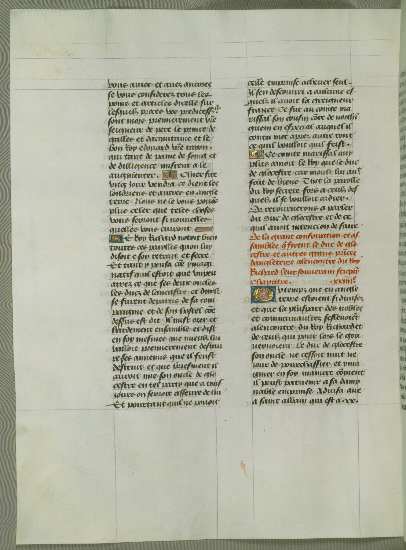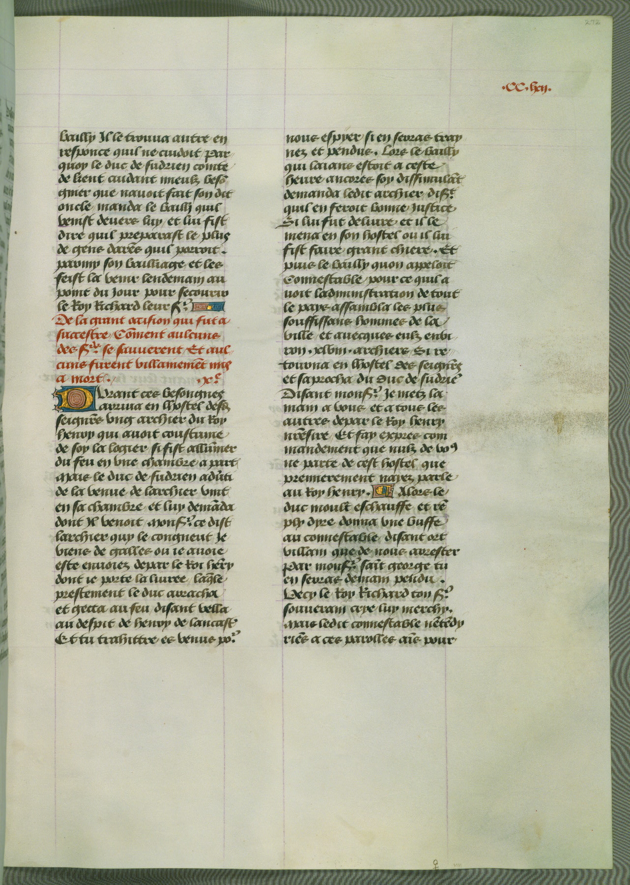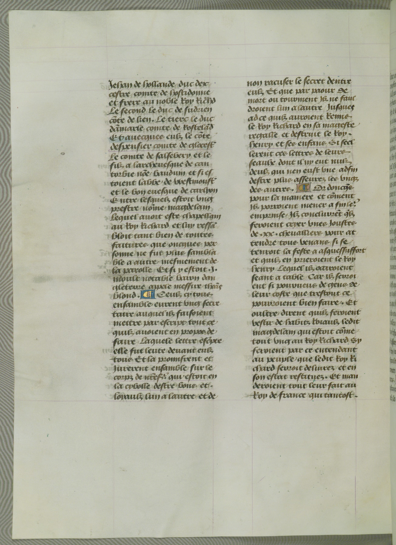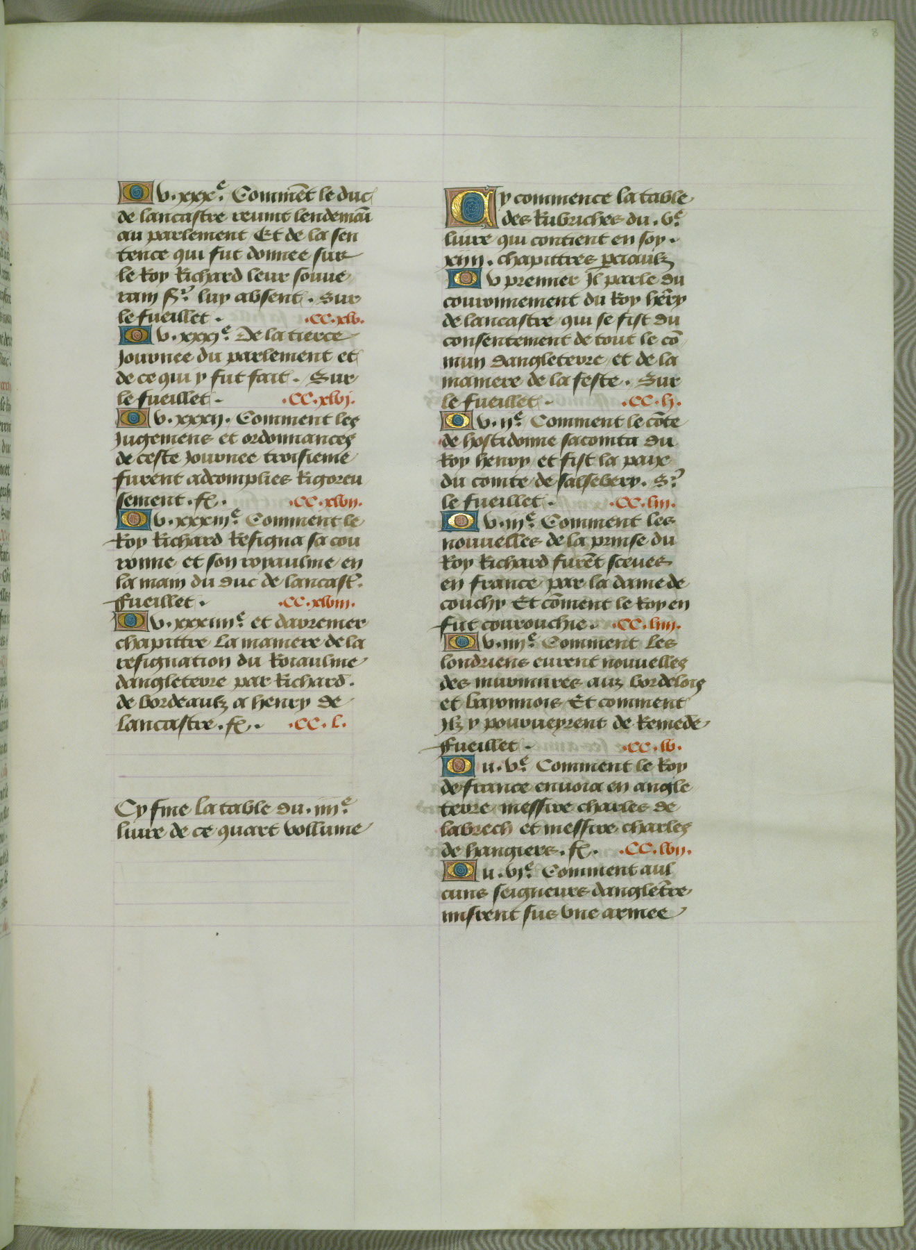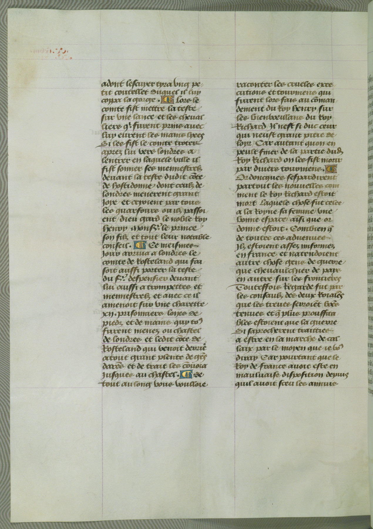 This manuscript is volume IV in a set of five from the collection "Recueil des chroniques et anchiennes istories de la Grant Bretaigne," written by Phillip the Good's counselor and chamberlain Jean de Wavrin. It chronicles the history of England from the early years of the reign of Richard II in 1377 to the demise of Henry IV, his successor, between 1400 and 1413. This volume, produced in Flanders between 1470 and 1480, was part of a set of which volumes II, III and V were recorded in the inventory of the library of William III of Orange in 1686, and was later rebound during the seventeenth or eighteenth century. Six three-quarter-page miniatures open the text of each book and depict events documented therein (with the exception of that of Book 1, portraying Richard II's coronation, which occurs prior to the period detailed in that book). The manuscript's margins are wide and relatively pristine throughout the textblock, but show significant signs of use on illuminated folios, indicating that this manuscript was primarily used for display and not as a historical text. Although few volumes of the Chroniques remain, this manuscript is particularly rare in that it is one of the two surviving exemplars of the text of volume IV, the other being part of the complete set in the Bibliothèque nationale de France (BN fr. 74-85). Volumes II, III, and V of the set to which this volume originally belonged are now in the collection of the Koninklijke Bibliotheek (Den Haag, KB : 133 A 7).