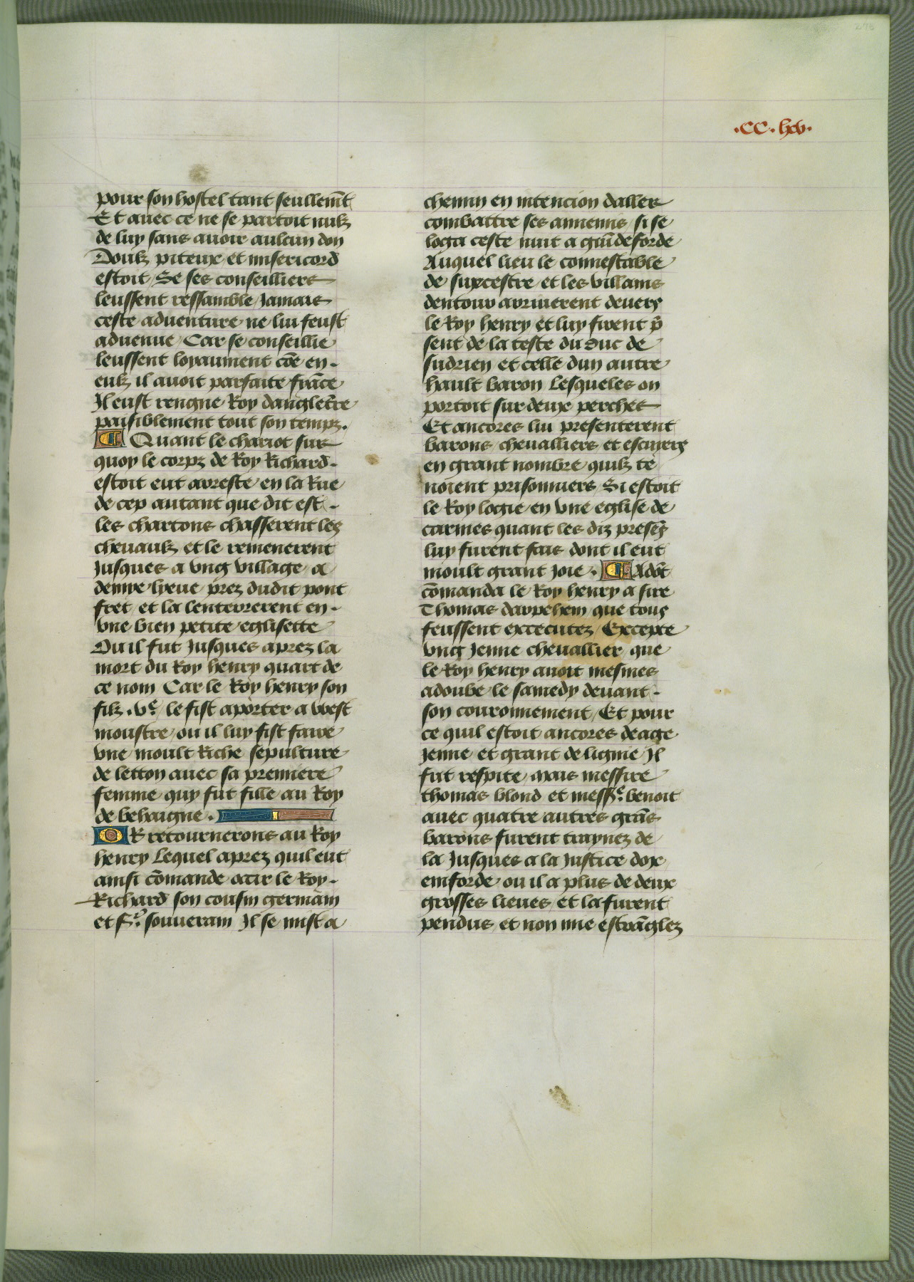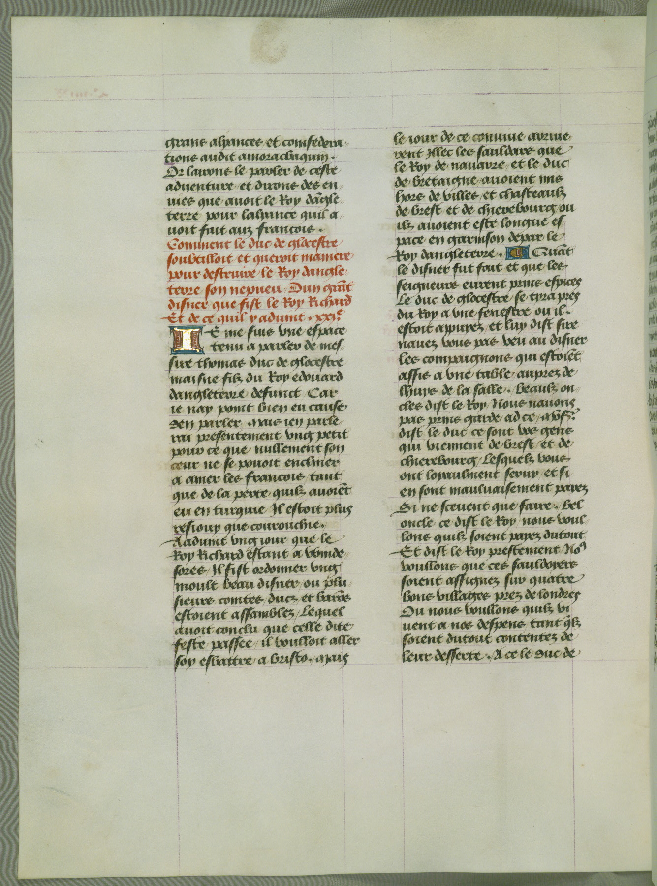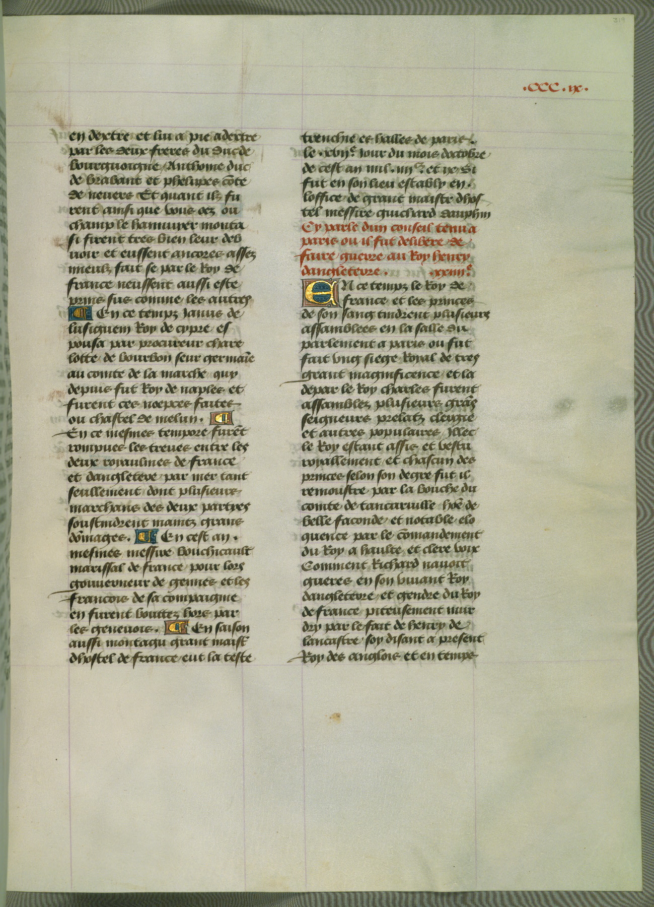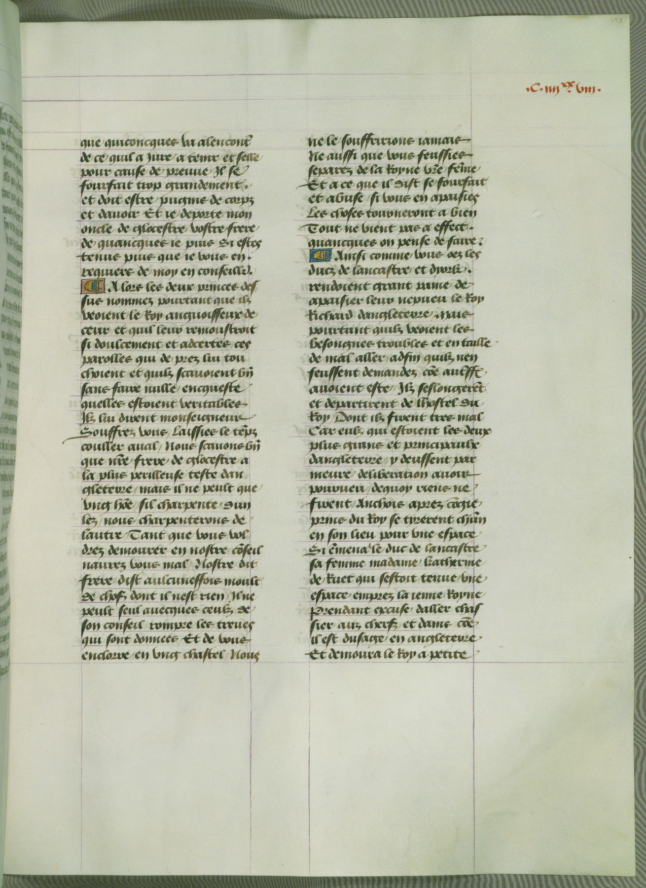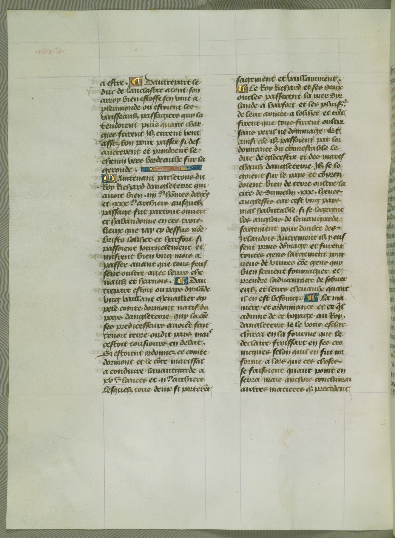 This manuscript is volume IV in a set of five from the collection "Recueil des chroniques et anchiennes istories de la Grant Bretaigne," written by Phillip the Good's counselor and chamberlain Jean de Wavrin. It chronicles the history of England from the early years of the reign of Richard II in 1377 to the demise of Henry IV, his successor, between 1400 and 1413. This volume, produced in Flanders between 1470 and 1480, was part of a set of which volumes II, III and V were recorded in the inventory of the library of William III of Orange in 1686, and was later rebound during the seventeenth or eighteenth century. Six three-quarter-page miniatures open the text of each book and depict events documented therein (with the exception of that of Book 1, portraying Richard II's coronation, which occurs prior to the period detailed in that book). The manuscript's margins are wide and relatively pristine throughout the textblock, but show significant signs of use on illuminated folios, indicating that this manuscript was primarily used for display and not as a historical text. Although few volumes of the Chroniques remain, this manuscript is particularly rare in that it is one of the two surviving exemplars of the text of volume IV, the other being part of the complete set in the Bibliothèque nationale de France (BN fr. 74-85). Volumes II, III, and V of the set to which this volume originally belonged are now in the collection of the Koninklijke Bibliotheek (Den Haag, KB : 133 A 7).
