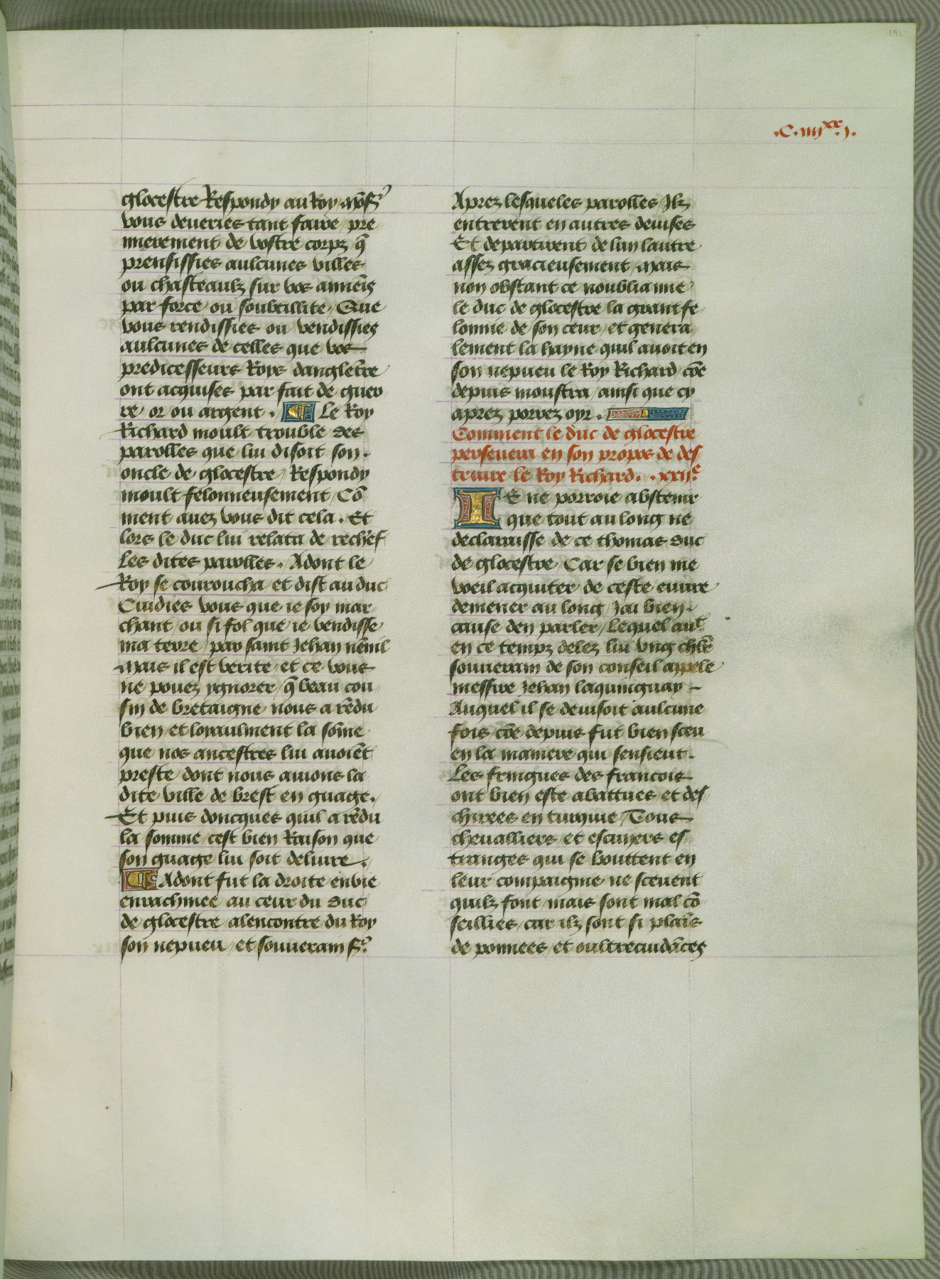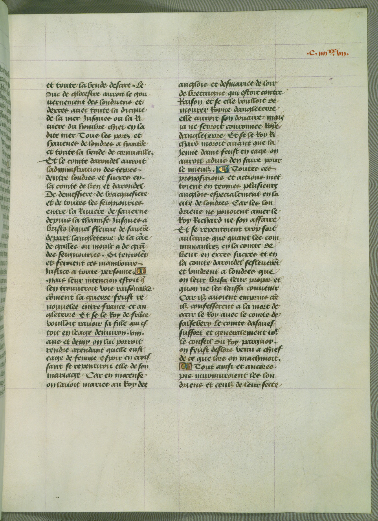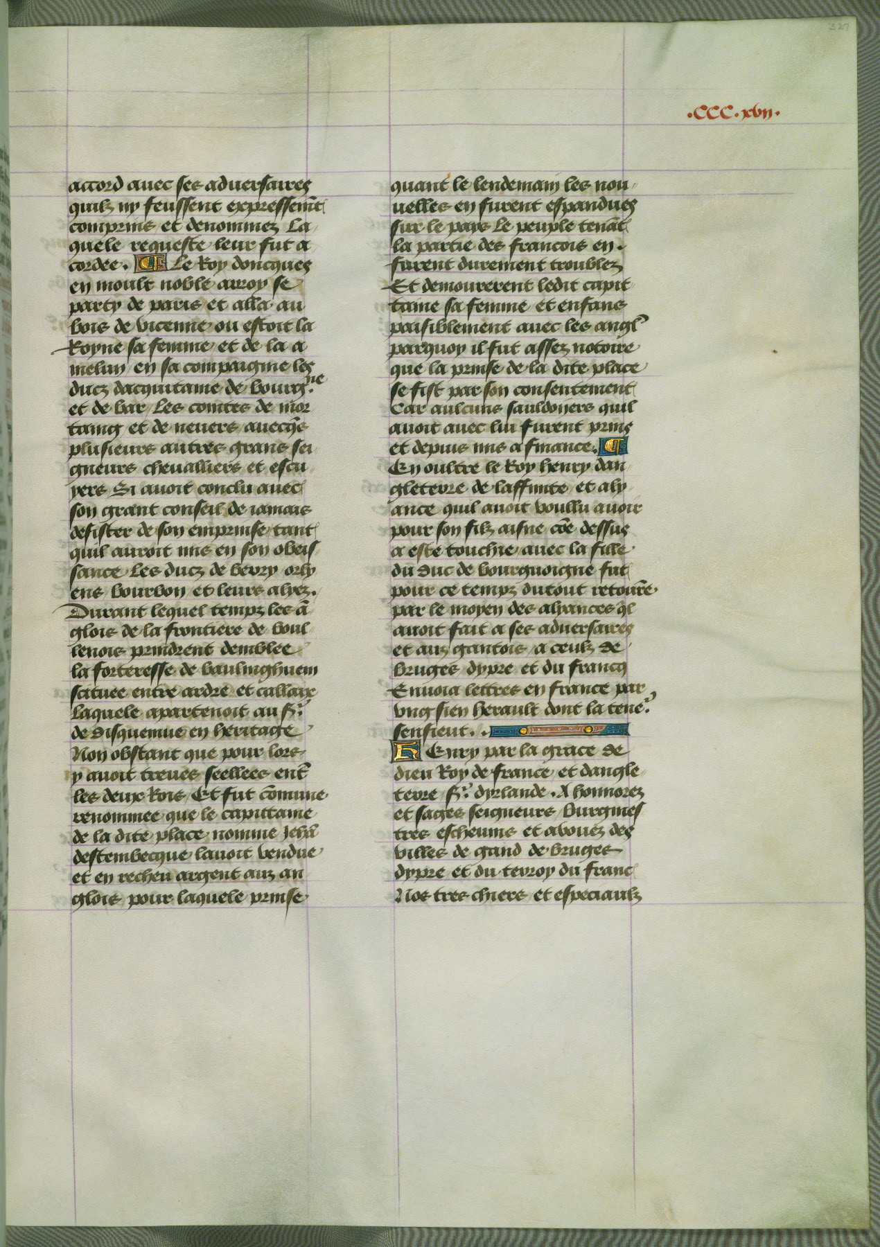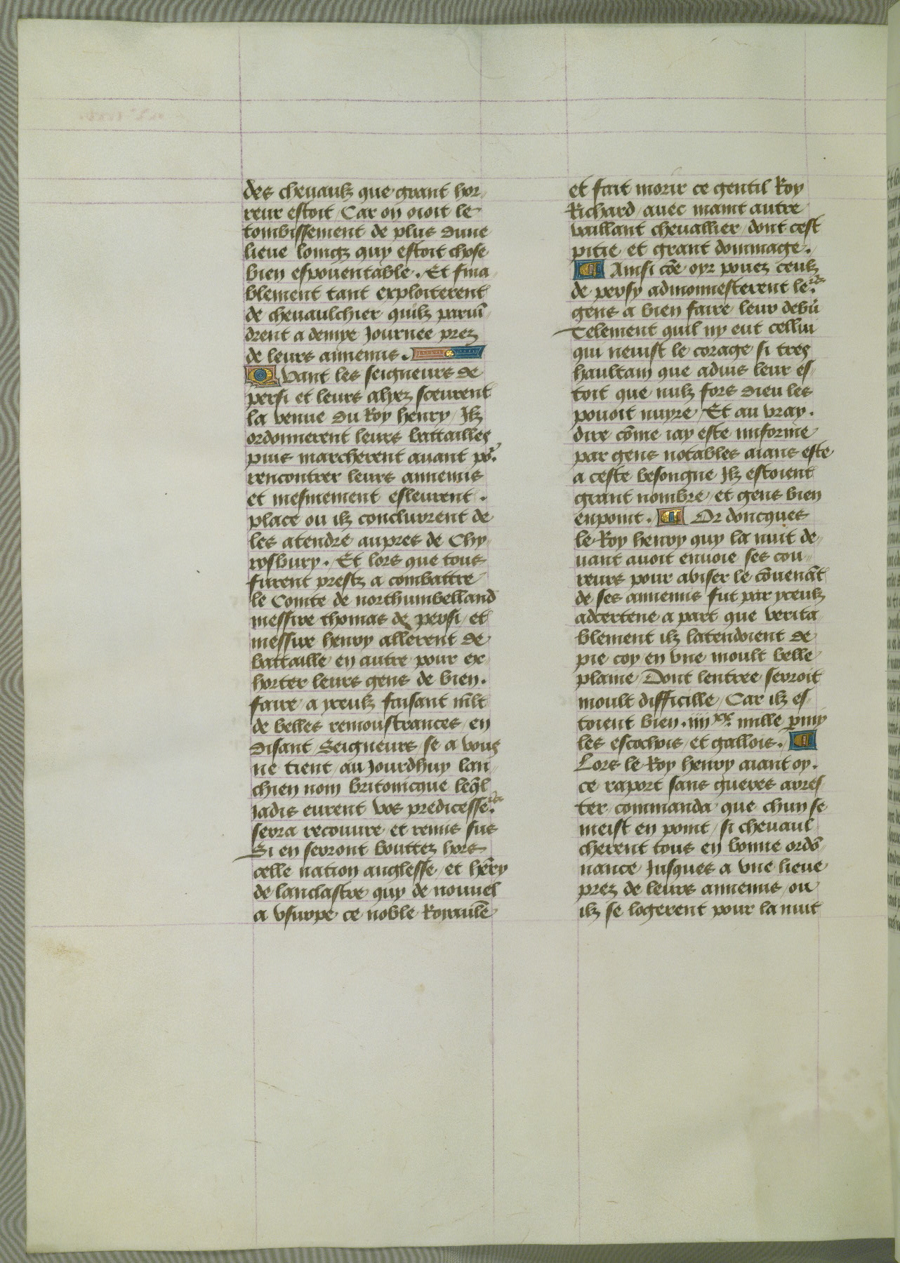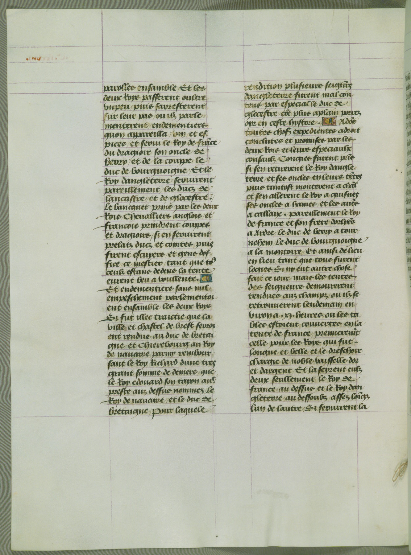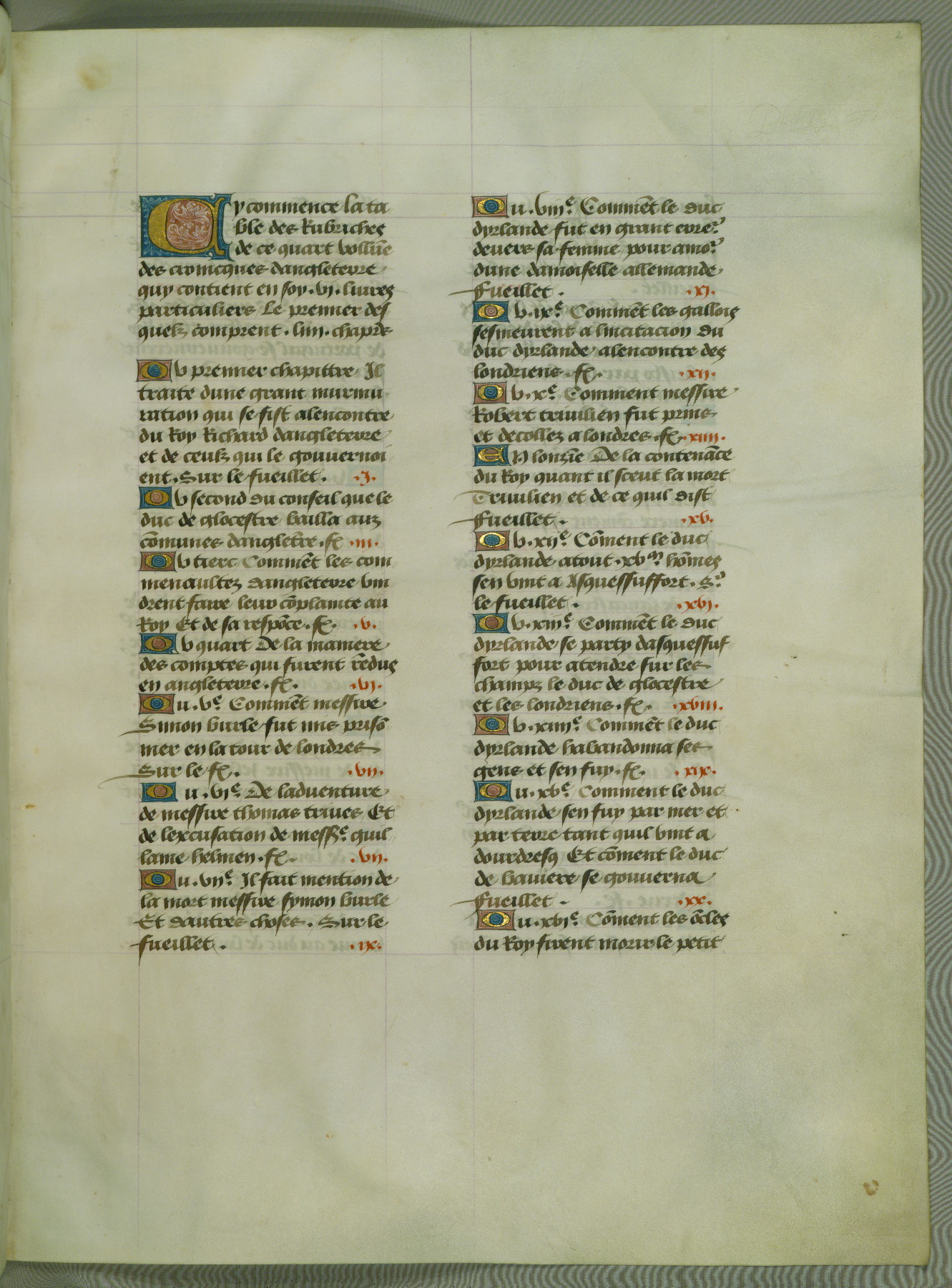 This manuscript is volume IV in a set of five from the collection "Recueil des chroniques et anchiennes istories de la Grant Bretaigne," written by Phillip the Good's counselor and chamberlain Jean de Wavrin. It chronicles the history of England from the early years of the reign of Richard II in 1377 to the demise of Henry IV, his successor, between 1400 and 1413. This volume, produced in Flanders between 1470 and 1480, was part of a set of which volumes II, III and V were recorded in the inventory of the library of William III of Orange in 1686, and was later rebound during the seventeenth or eighteenth century. Six three-quarter-page miniatures open the text of each book and depict events documented therein (with the exception of that of Book 1, portraying Richard II's coronation, which occurs prior to the period detailed in that book). The manuscript's margins are wide and relatively pristine throughout the textblock, but show significant signs of use on illuminated folios, indicating that this manuscript was primarily used for display and not as a historical text. Although few volumes of the Chroniques remain, this manuscript is particularly rare in that it is one of the two surviving exemplars of the text of volume IV, the other being part of the complete set in the Bibliothèque nationale de France (BN fr. 74-85). Volumes II, III, and V of the set to which this volume originally belonged are now in the collection of the Koninklijke Bibliotheek (Den Haag, KB : 133 A 7).