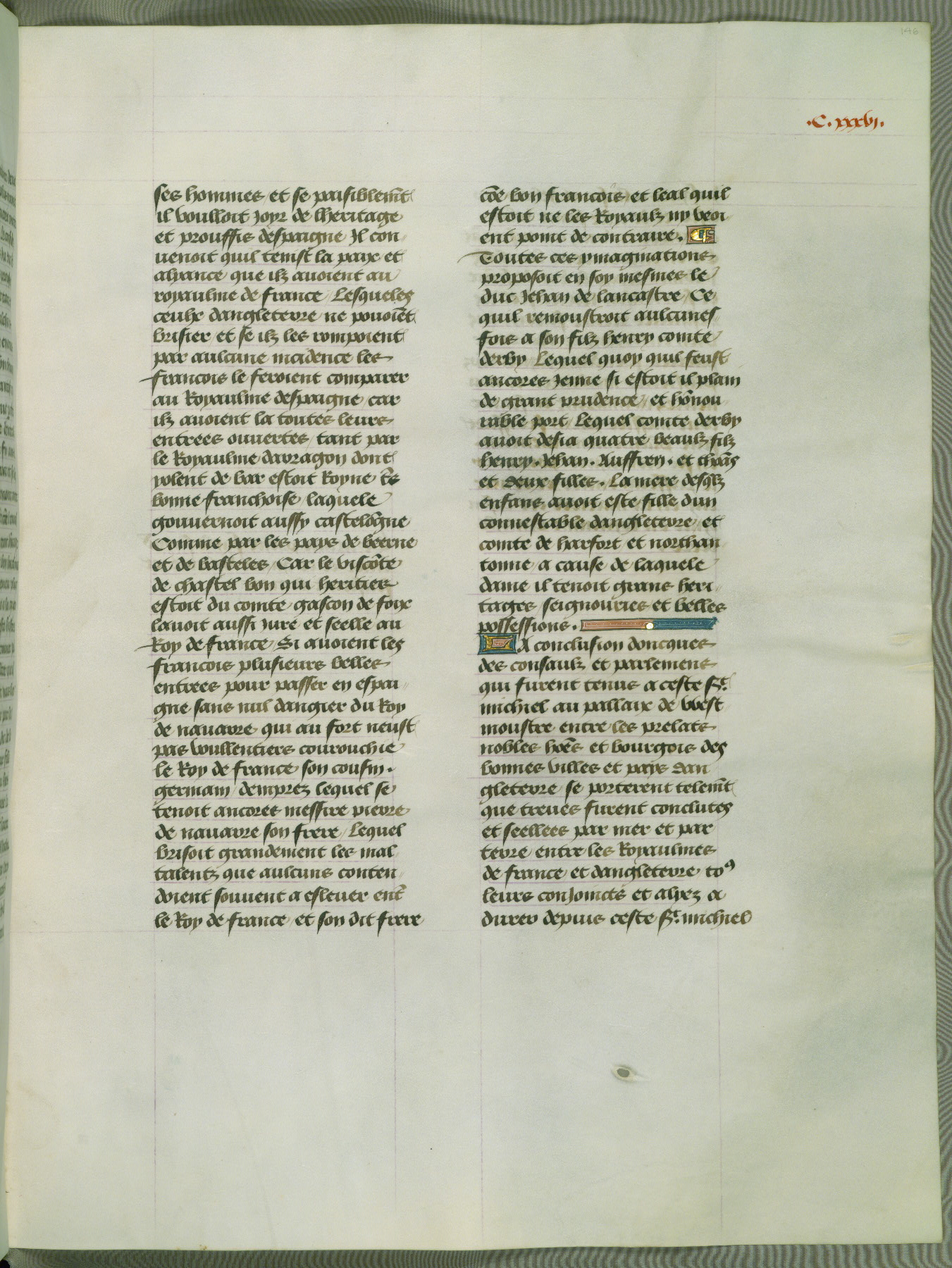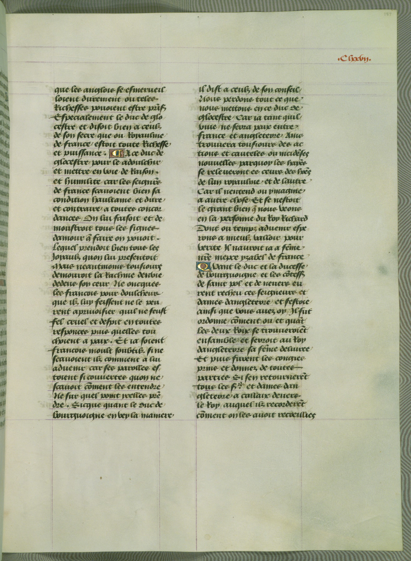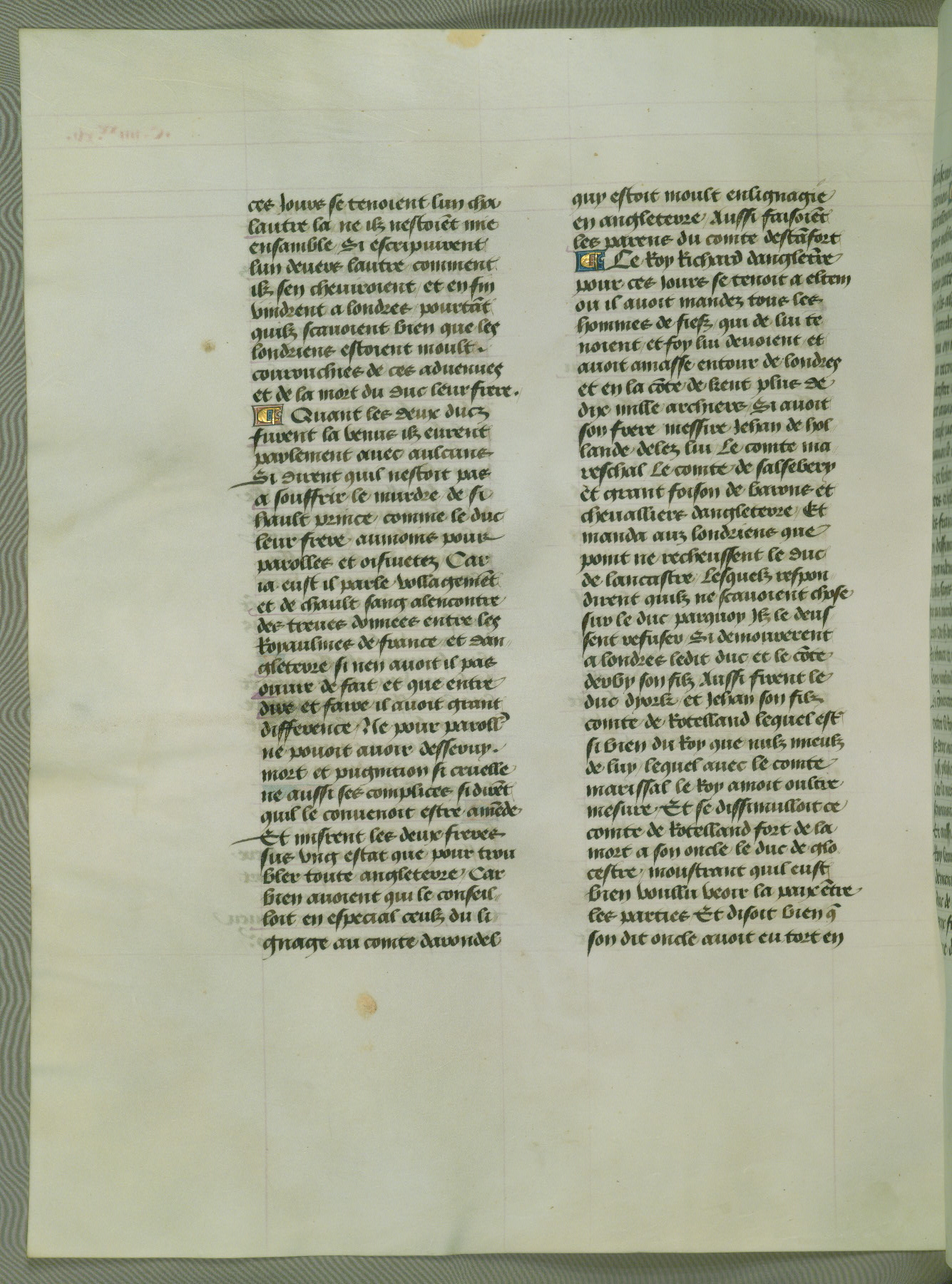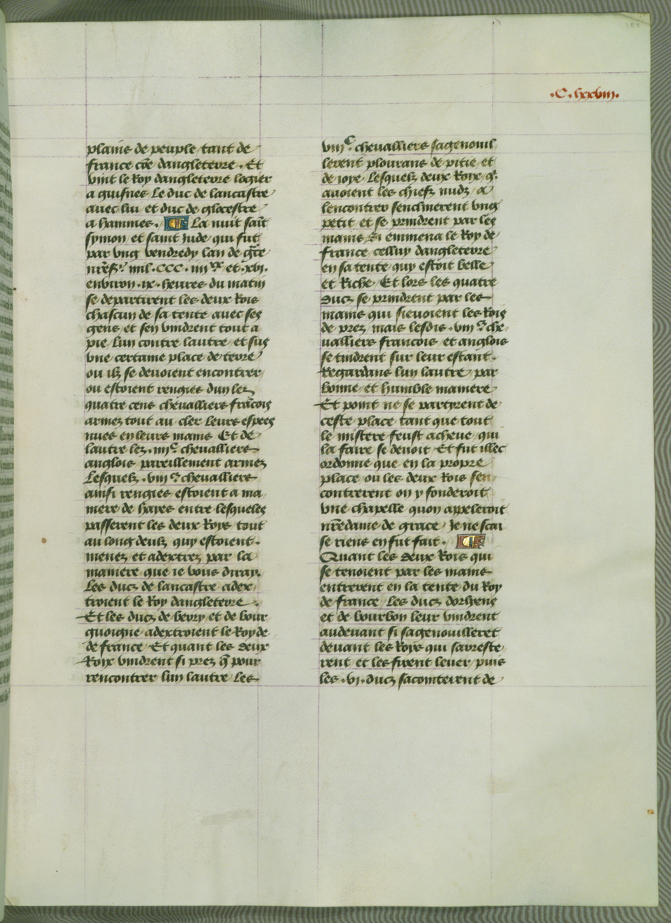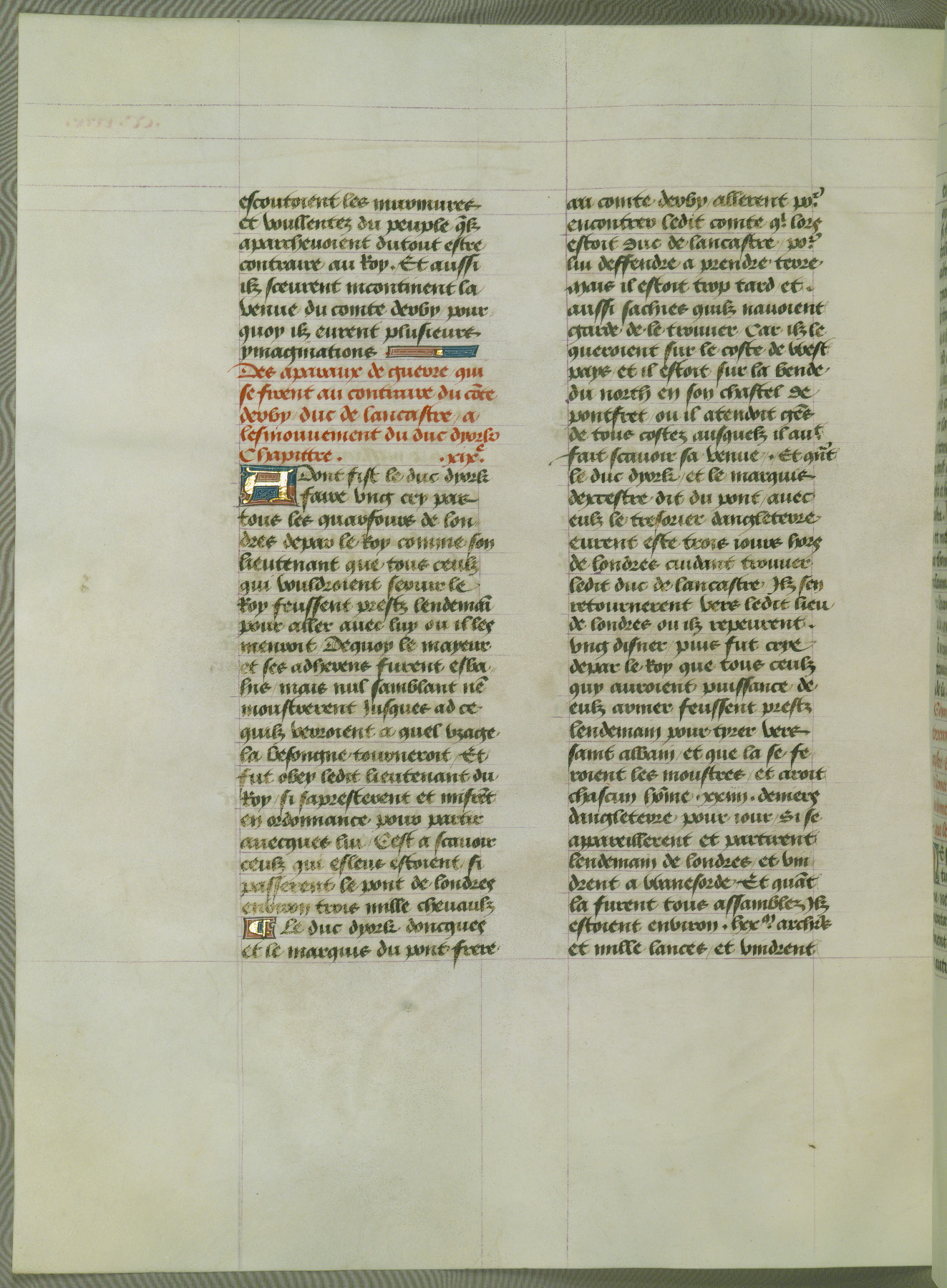 This manuscript is volume IV in a set of five from the collection "Recueil des chroniques et anchiennes istories de la Grant Bretaigne," written by Phillip the Good's counselor and chamberlain Jean de Wavrin. It chronicles the history of England from the early years of the reign of Richard II in 1377 to the demise of Henry IV, his successor, between 1400 and 1413. This volume, produced in Flanders between 1470 and 1480, was part of a set of which volumes II, III and V were recorded in the inventory of the library of William III of Orange in 1686, and was later rebound during the seventeenth or eighteenth century. Six three-quarter-page miniatures open the text of each book and depict events documented therein (with the exception of that of Book 1, portraying Richard II's coronation, which occurs prior to the period detailed in that book). The manuscript's margins are wide and relatively pristine throughout the textblock, but show significant signs of use on illuminated folios, indicating that this manuscript was primarily used for display and not as a historical text. Although few volumes of the Chroniques remain, this manuscript is particularly rare in that it is one of the two surviving exemplars of the text of volume IV, the other being part of the complete set in the Bibliothèque nationale de France (BN fr. 74-85). Volumes II, III, and V of the set to which this volume originally belonged are now in the collection of the Koninklijke Bibliotheek (Den Haag, KB : 133 A 7).