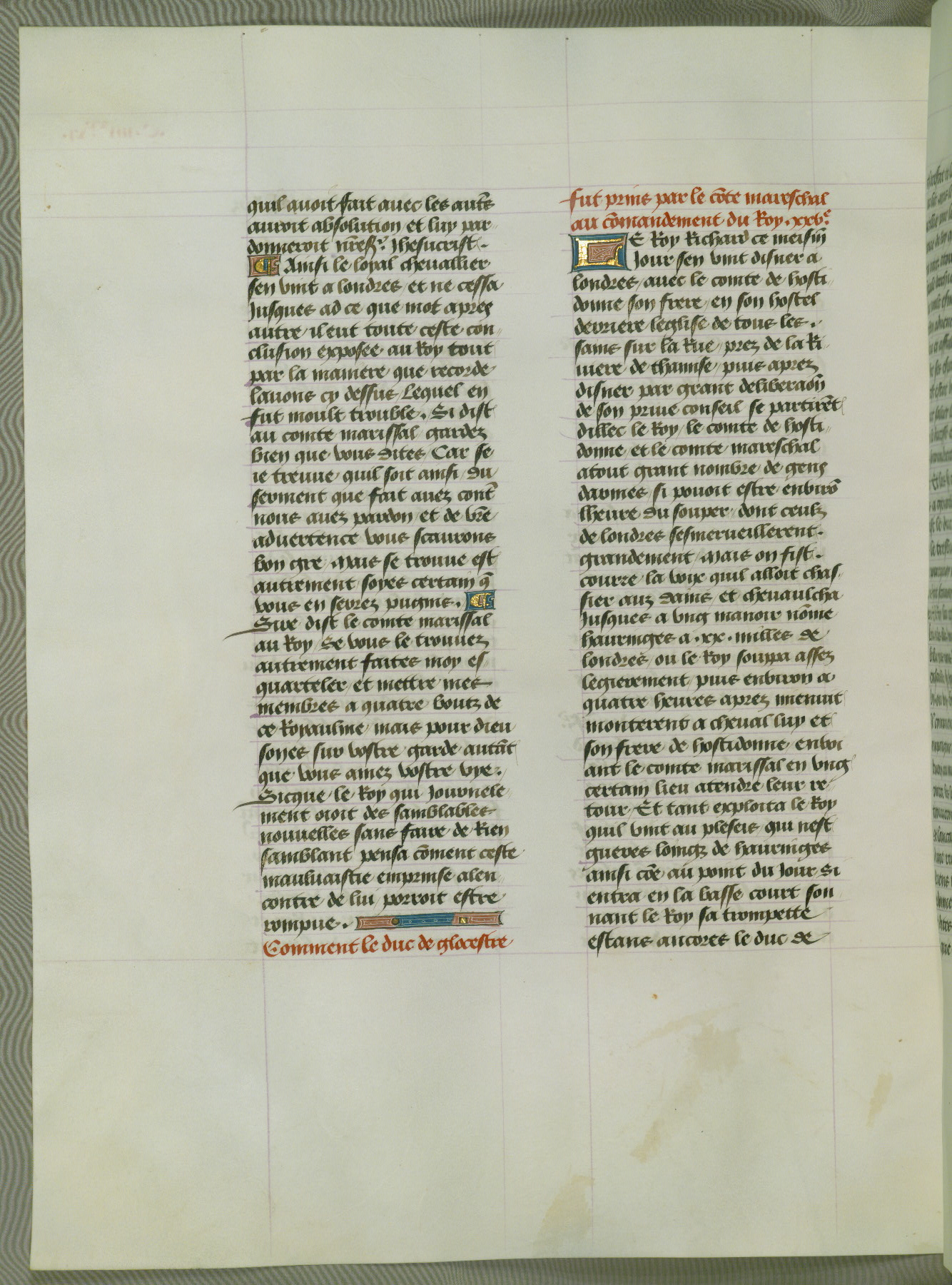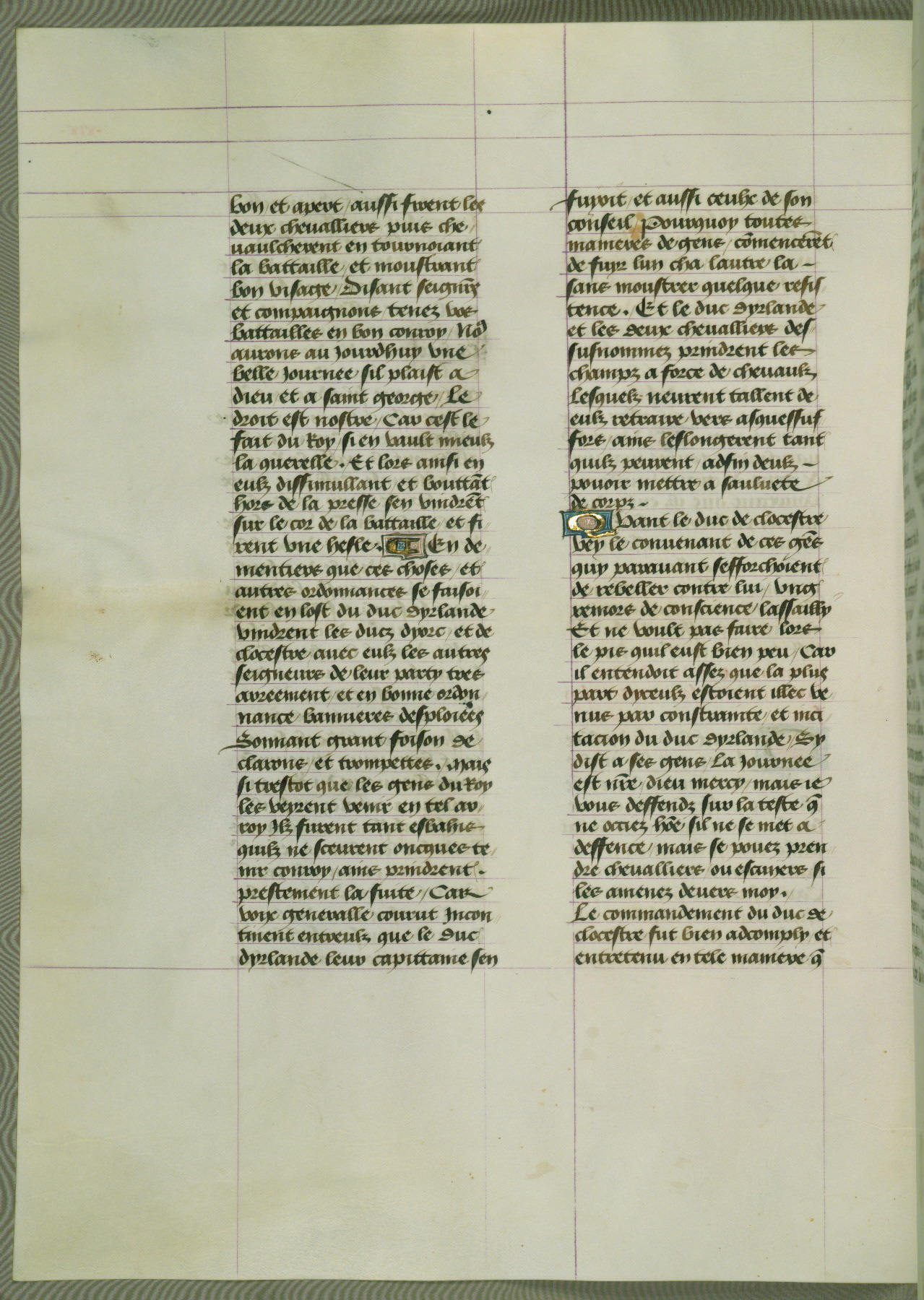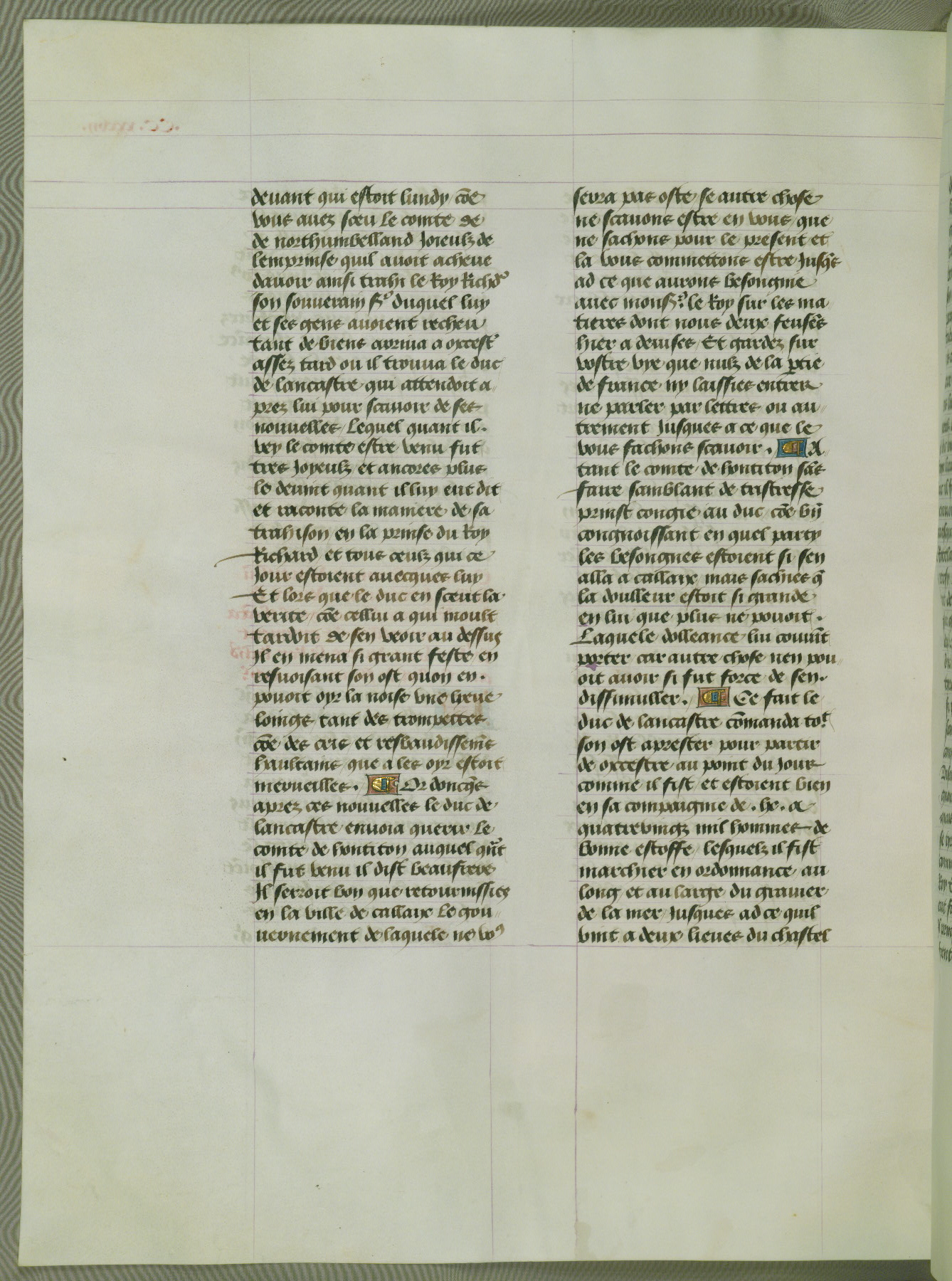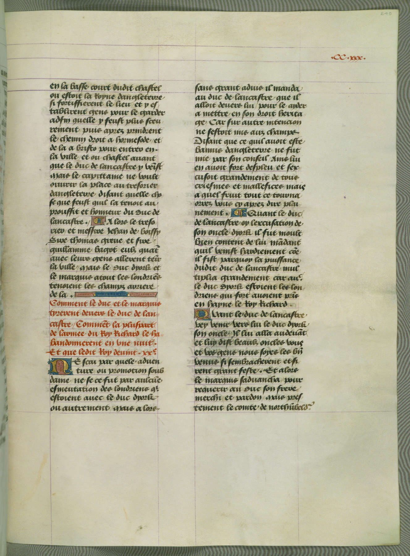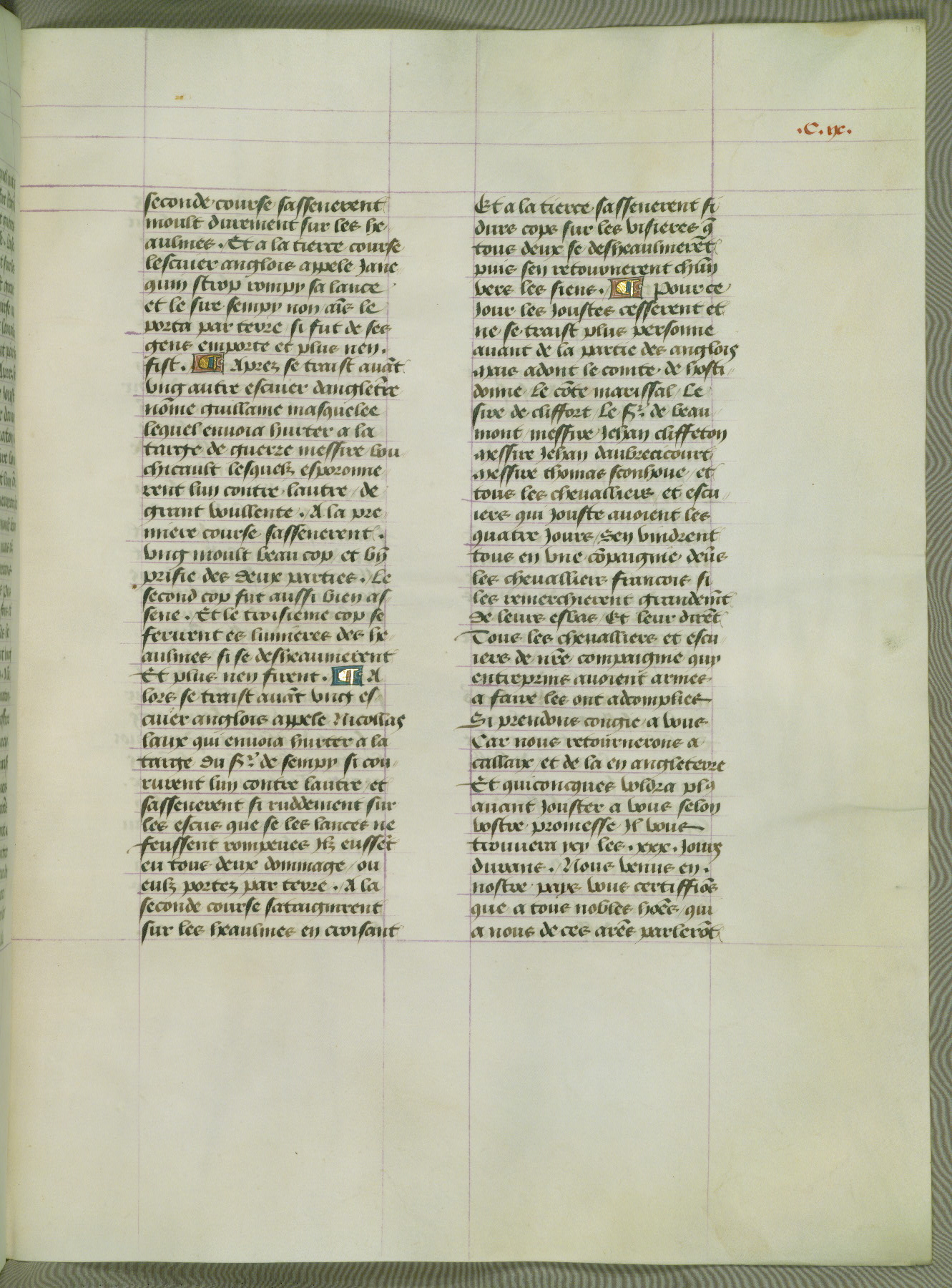 This manuscript is volume IV in a set of five from the collection "Recueil des chroniques et anchiennes istories de la Grant Bretaigne," written by Phillip the Good's counselor and chamberlain Jean de Wavrin. It chronicles the history of England from the early years of the reign of Richard II in 1377 to the demise of Henry IV, his successor, between 1400 and 1413. This volume, produced in Flanders between 1470 and 1480, was part of a set of which volumes II, III and V were recorded in the inventory of the library of William III of Orange in 1686, and was later rebound during the seventeenth or eighteenth century. Six three-quarter-page miniatures open the text of each book and depict events documented therein (with the exception of that of Book 1, portraying Richard II's coronation, which occurs prior to the period detailed in that book). The manuscript's margins are wide and relatively pristine throughout the textblock, but show significant signs of use on illuminated folios, indicating that this manuscript was primarily used for display and not as a historical text. Although few volumes of the Chroniques remain, this manuscript is particularly rare in that it is one of the two surviving exemplars of the text of volume IV, the other being part of the complete set in the Bibliothèque nationale de France (BN fr. 74-85). Volumes II, III, and V of the set to which this volume originally belonged are now in the collection of the Koninklijke Bibliotheek (Den Haag, KB : 133 A 7).