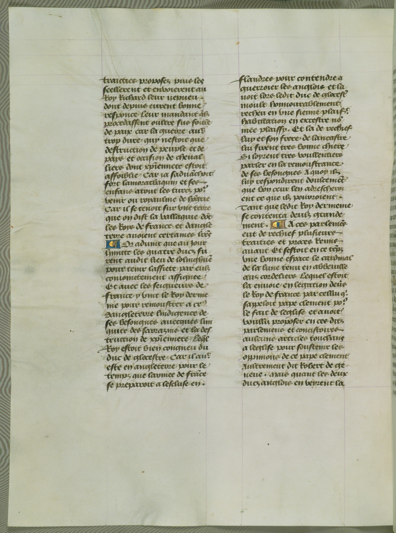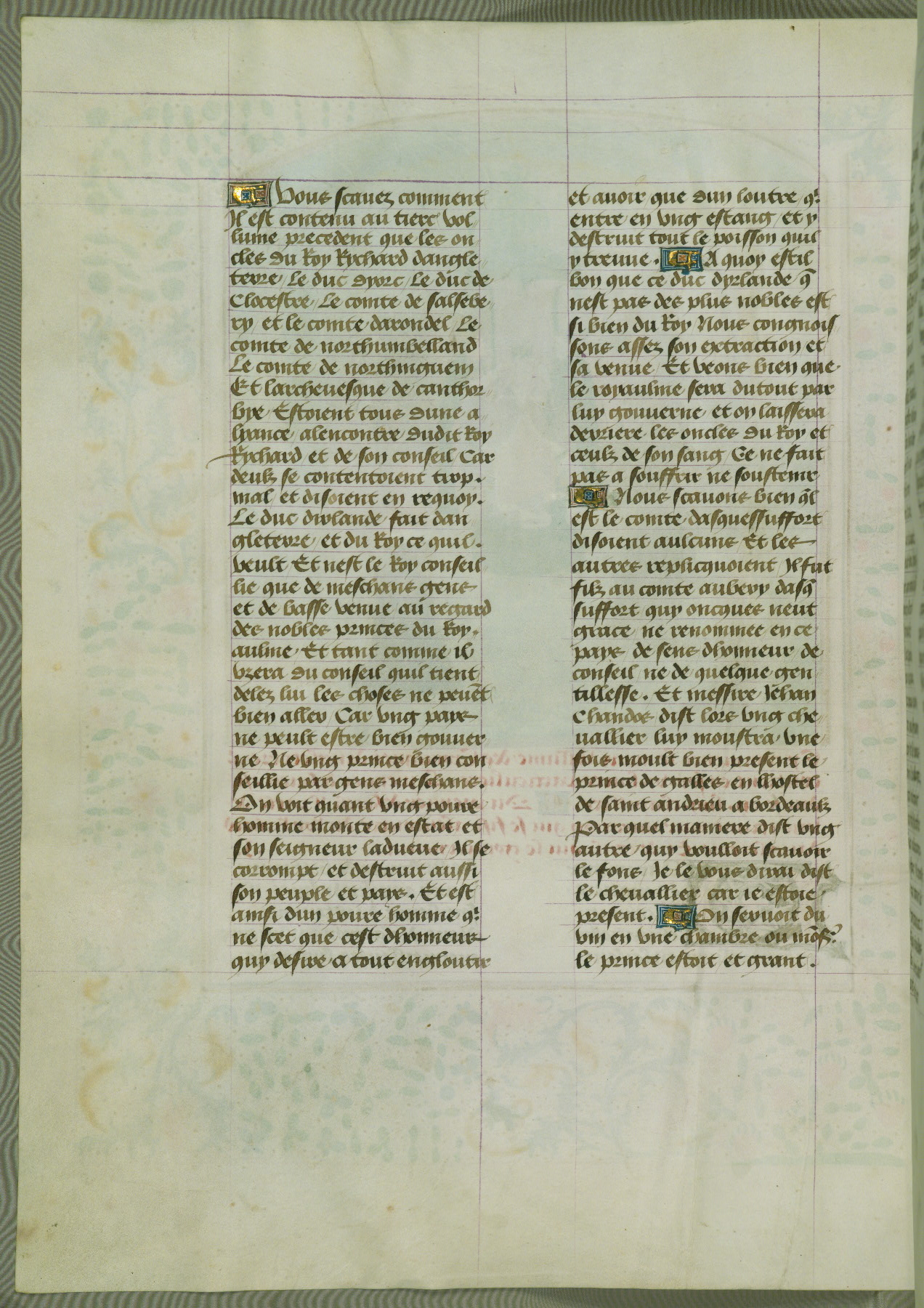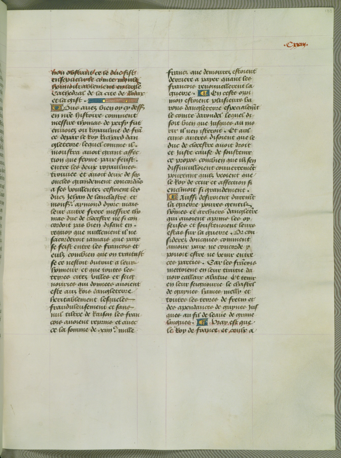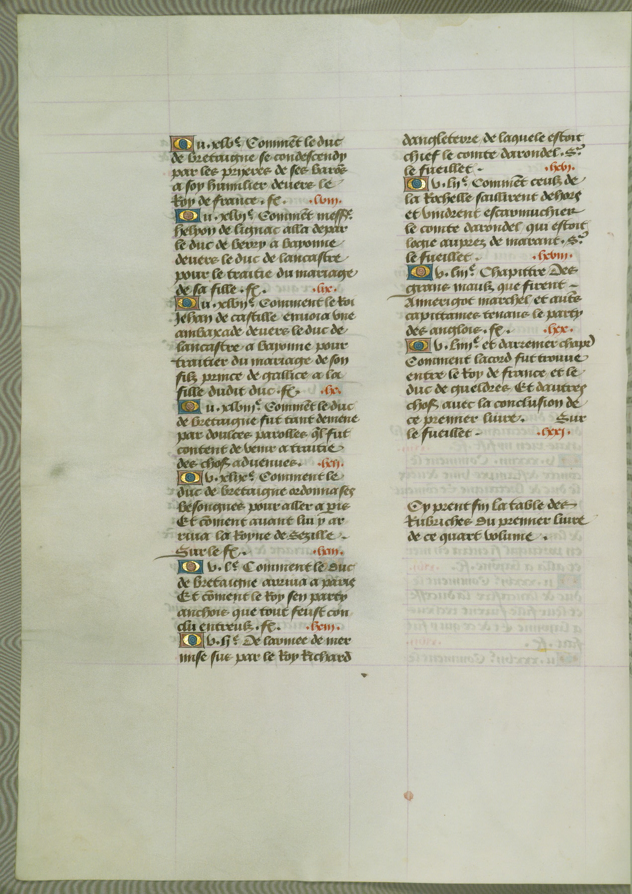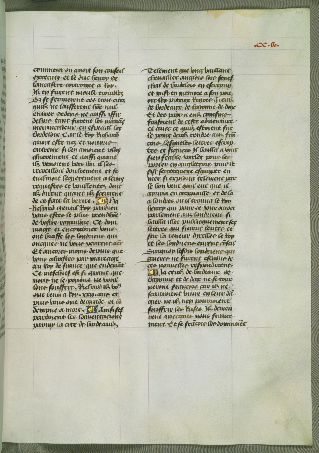 This manuscript is volume IV in a set of five from the collection "Recueil des chroniques et anchiennes istories de la Grant Bretaigne," written by Phillip the Good's counselor and chamberlain Jean de Wavrin. It chronicles the history of England from the early years of the reign of Richard II in 1377 to the demise of Henry IV, his successor, between 1400 and 1413. This volume, produced in Flanders between 1470 and 1480, was part of a set of which volumes II, III and V were recorded in the inventory of the library of William III of Orange in 1686, and was later rebound during the seventeenth or eighteenth century. Six three-quarter-page miniatures open the text of each book and depict events documented therein (with the exception of that of Book 1, portraying Richard II's coronation, which occurs prior to the period detailed in that book). The manuscript's margins are wide and relatively pristine throughout the textblock, but show significant signs of use on illuminated folios, indicating that this manuscript was primarily used for display and not as a historical text. Although few volumes of the Chroniques remain, this manuscript is particularly rare in that it is one of the two surviving exemplars of the text of volume IV, the other being part of the complete set in the Bibliothèque nationale de France (BN fr. 74-85). Volumes II, III, and V of the set to which this volume originally belonged are now in the collection of the Koninklijke Bibliotheek (Den Haag, KB : 133 A 7).