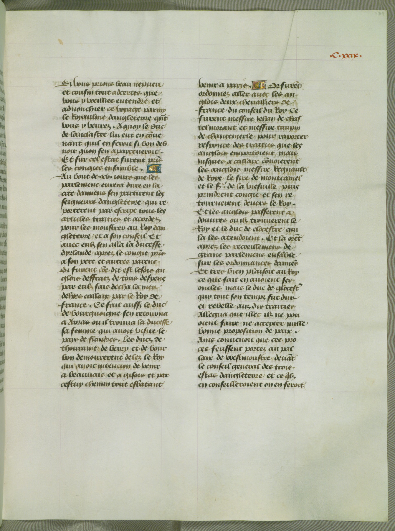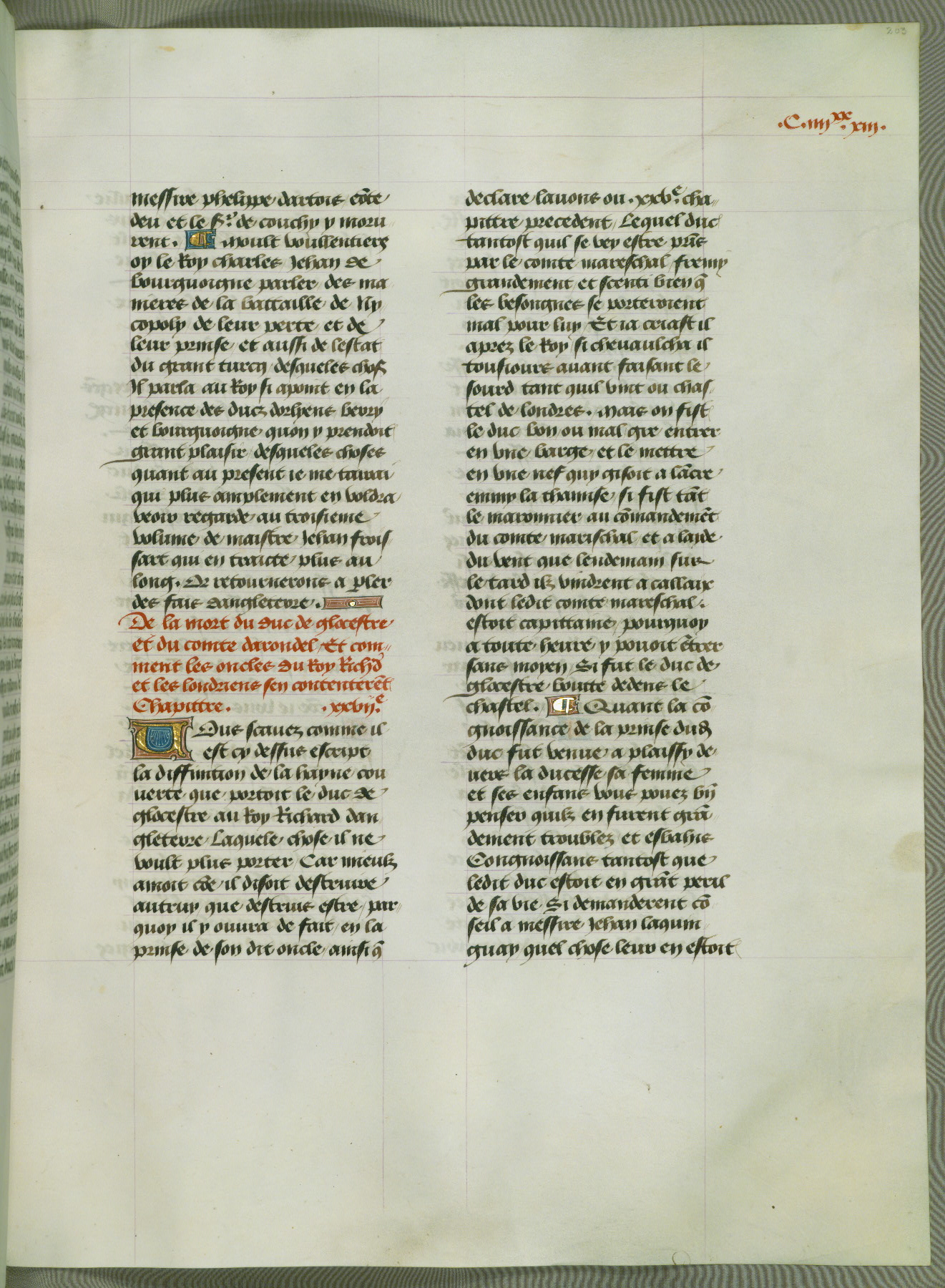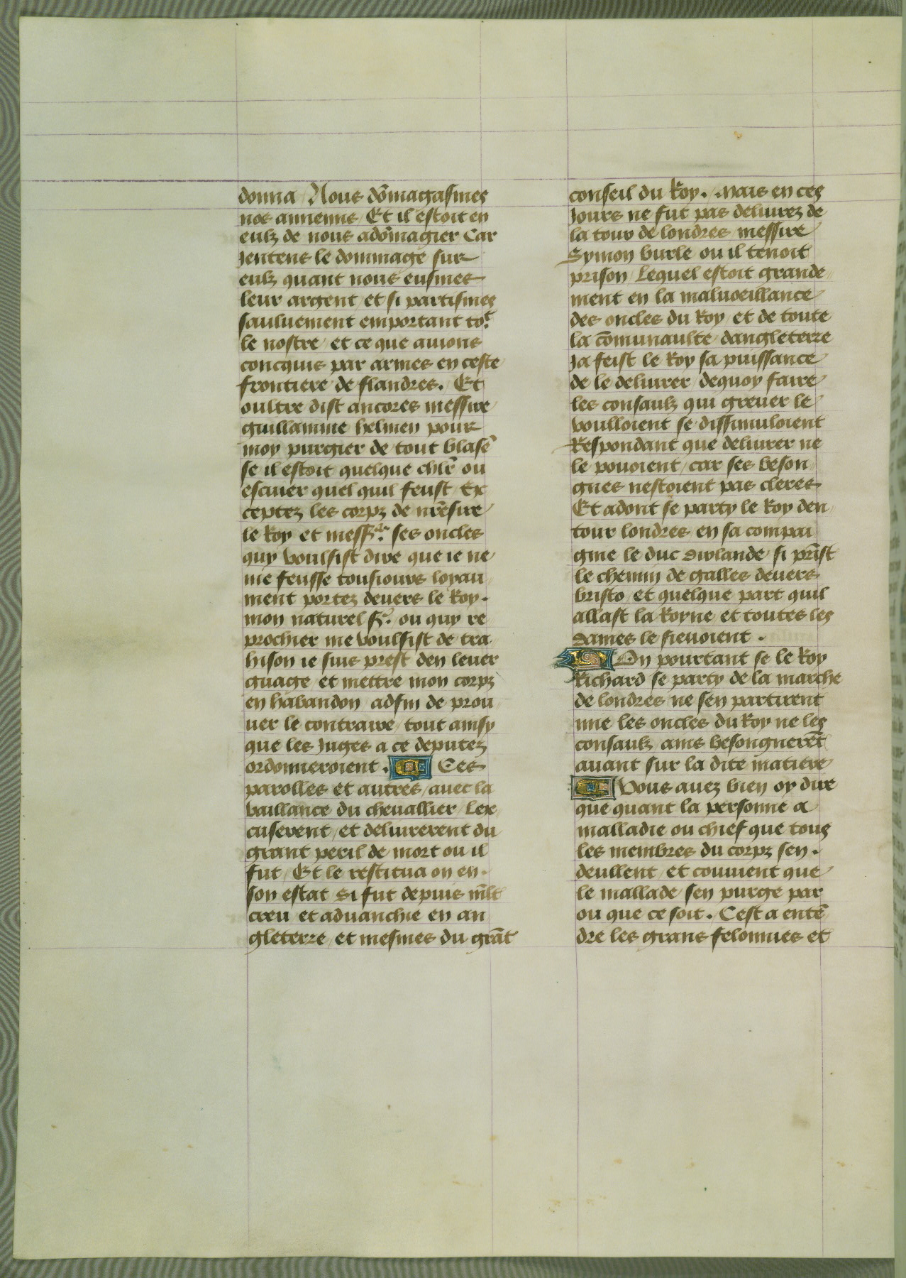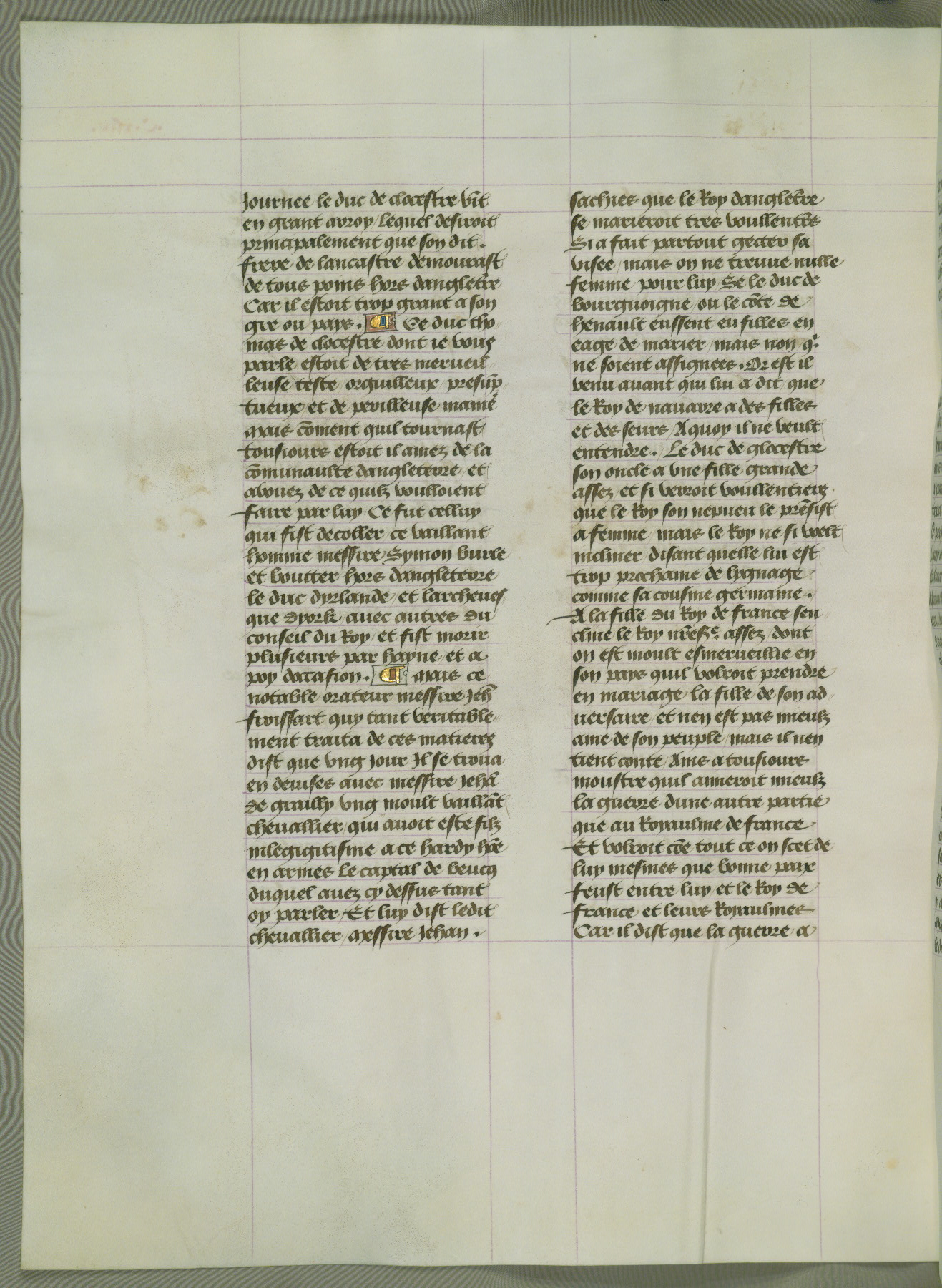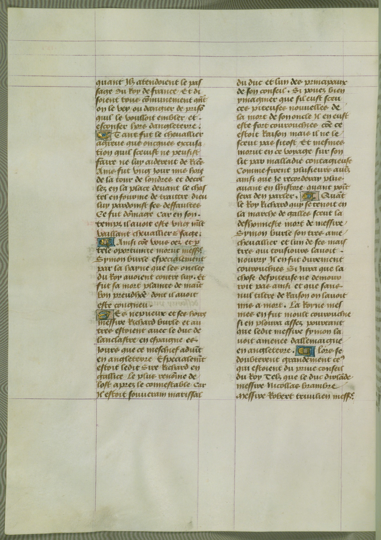 This manuscript is volume IV in a set of five from the collection "Recueil des chroniques et anchiennes istories de la Grant Bretaigne," written by Phillip the Good's counselor and chamberlain Jean de Wavrin. It chronicles the history of England from the early years of the reign of Richard II in 1377 to the demise of Henry IV, his successor, between 1400 and 1413. This volume, produced in Flanders between 1470 and 1480, was part of a set of which volumes II, III and V were recorded in the inventory of the library of William III of Orange in 1686, and was later rebound during the seventeenth or eighteenth century. Six three-quarter-page miniatures open the text of each book and depict events documented therein (with the exception of that of Book 1, portraying Richard II's coronation, which occurs prior to the period detailed in that book). The manuscript's margins are wide and relatively pristine throughout the textblock, but show significant signs of use on illuminated folios, indicating that this manuscript was primarily used for display and not as a historical text. Although few volumes of the Chroniques remain, this manuscript is particularly rare in that it is one of the two surviving exemplars of the text of volume IV, the other being part of the complete set in the Bibliothèque nationale de France (BN fr. 74-85). Volumes II, III, and V of the set to which this volume originally belonged are now in the collection of the Koninklijke Bibliotheek (Den Haag, KB : 133 A 7).