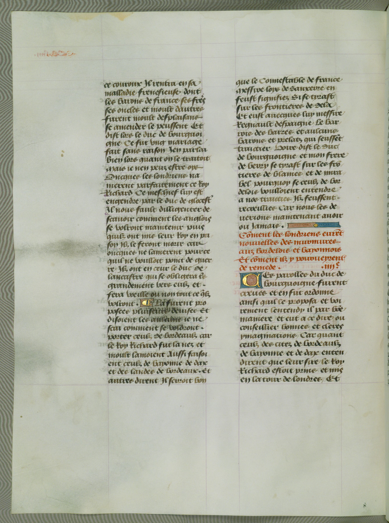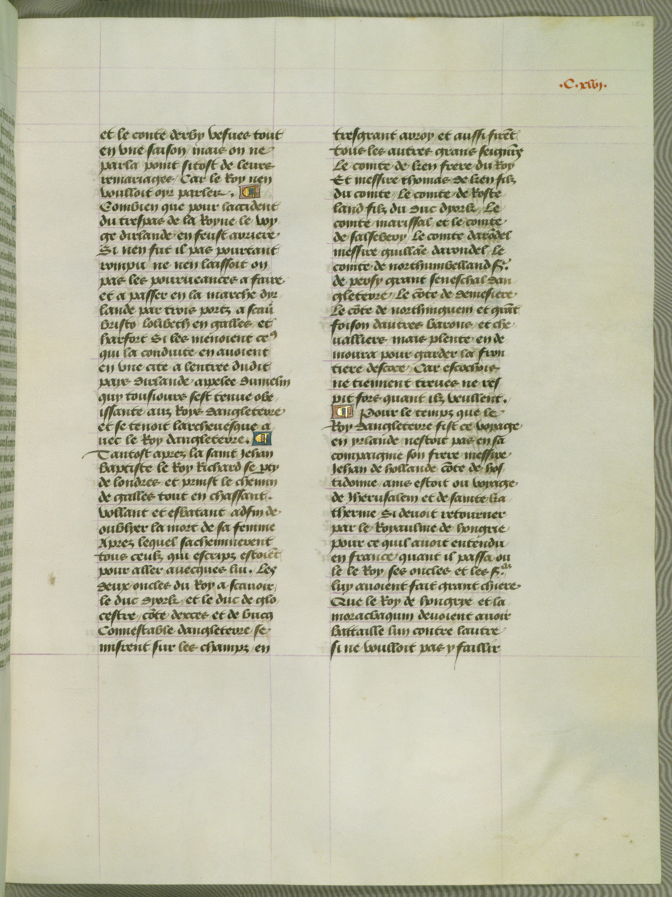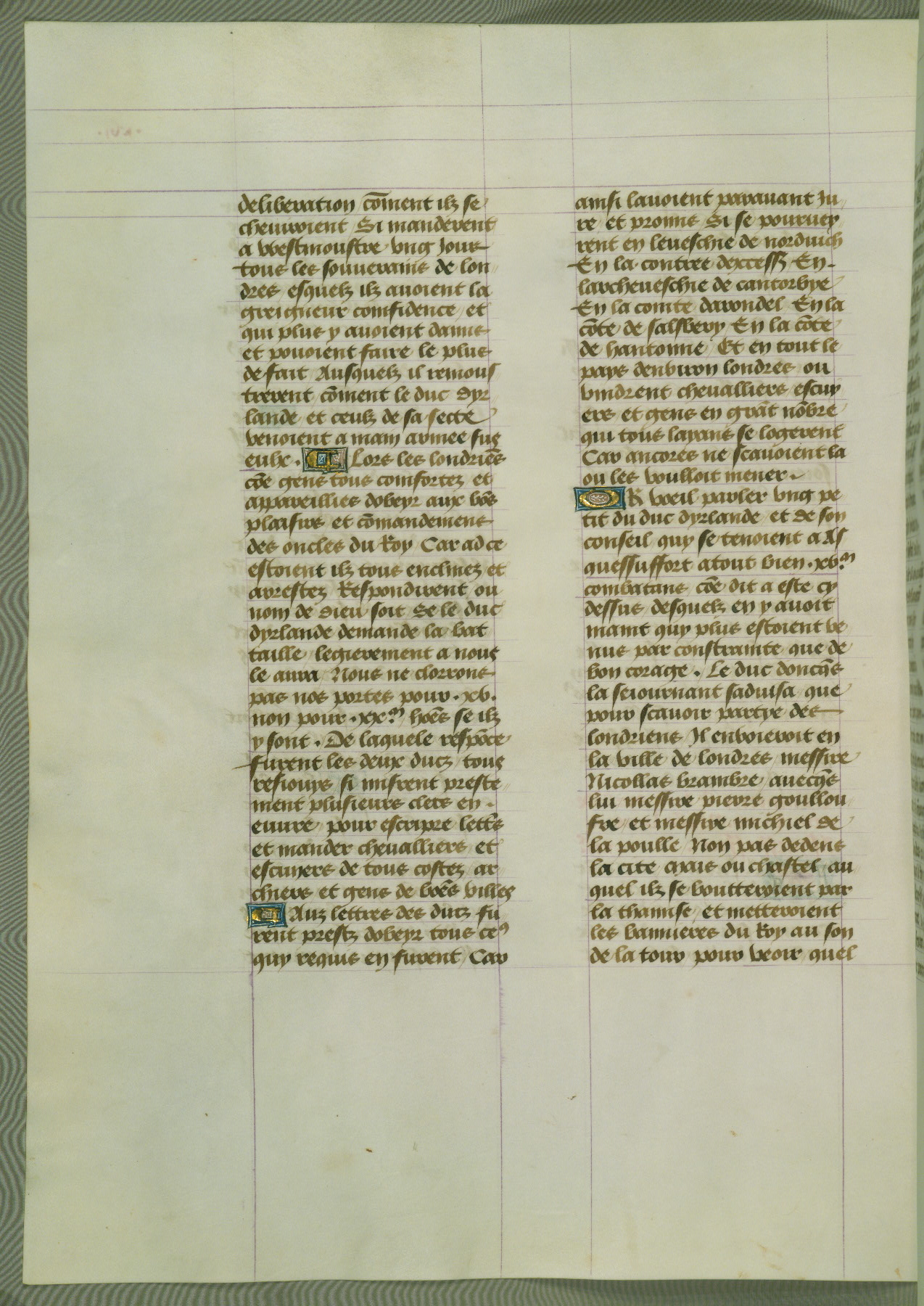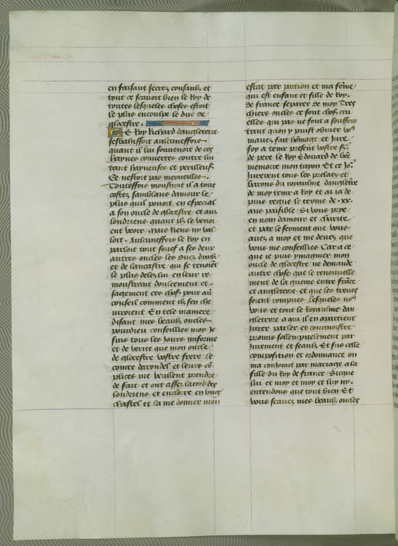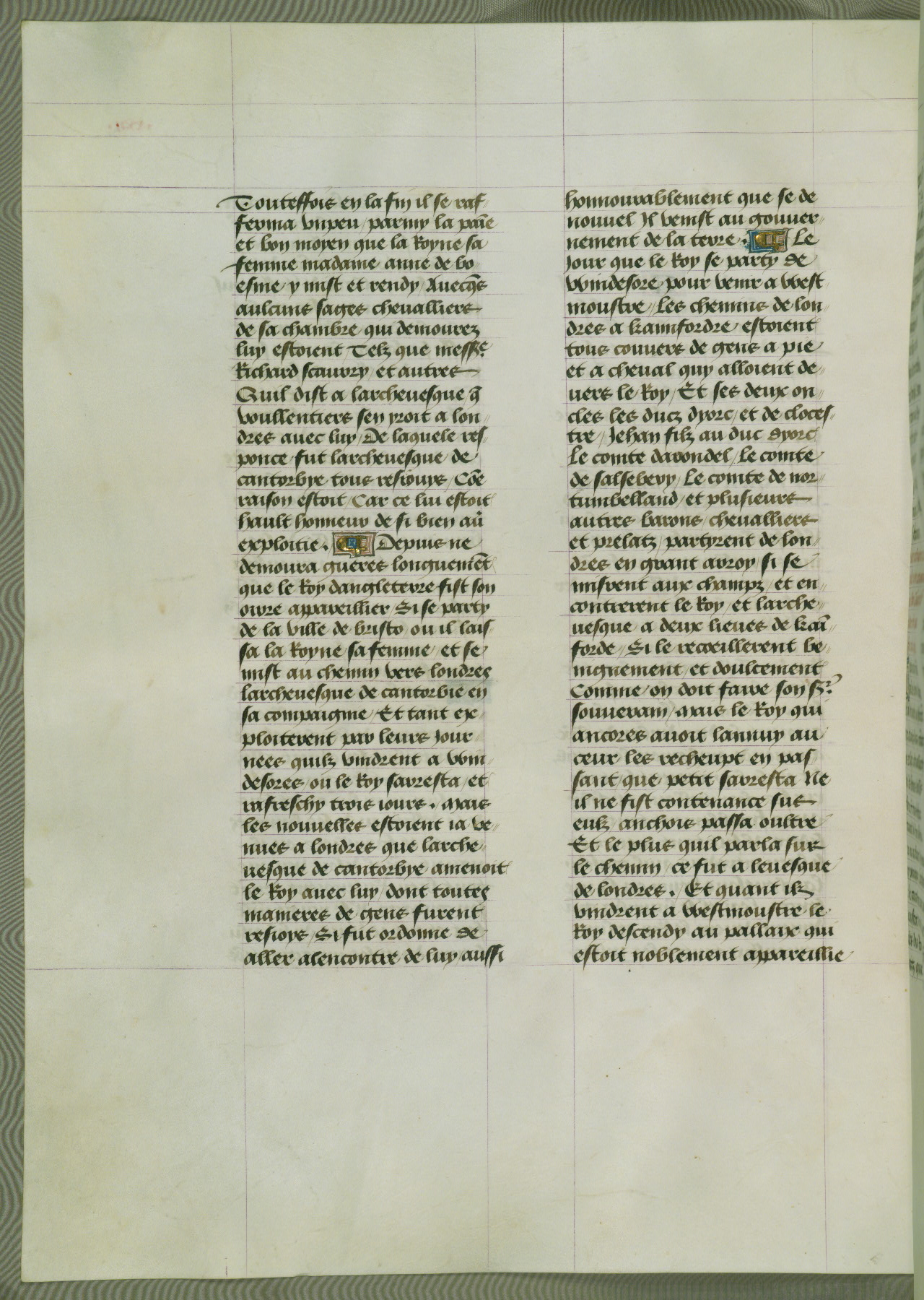 This manuscript is volume IV in a set of five from the collection "Recueil des chroniques et anchiennes istories de la Grant Bretaigne," written by Phillip the Good's counselor and chamberlain Jean de Wavrin. It chronicles the history of England from the early years of the reign of Richard II in 1377 to the demise of Henry IV, his successor, between 1400 and 1413. This volume, produced in Flanders between 1470 and 1480, was part of a set of which volumes II, III and V were recorded in the inventory of the library of William III of Orange in 1686, and was later rebound during the seventeenth or eighteenth century. Six three-quarter-page miniatures open the text of each book and depict events documented therein (with the exception of that of Book 1, portraying Richard II's coronation, which occurs prior to the period detailed in that book). The manuscript's margins are wide and relatively pristine throughout the textblock, but show significant signs of use on illuminated folios, indicating that this manuscript was primarily used for display and not as a historical text. Although few volumes of the Chroniques remain, this manuscript is particularly rare in that it is one of the two surviving exemplars of the text of volume IV, the other being part of the complete set in the Bibliothèque nationale de France (BN fr. 74-85). Volumes II, III, and V of the set to which this volume originally belonged are now in the collection of the Koninklijke Bibliotheek (Den Haag, KB : 133 A 7).