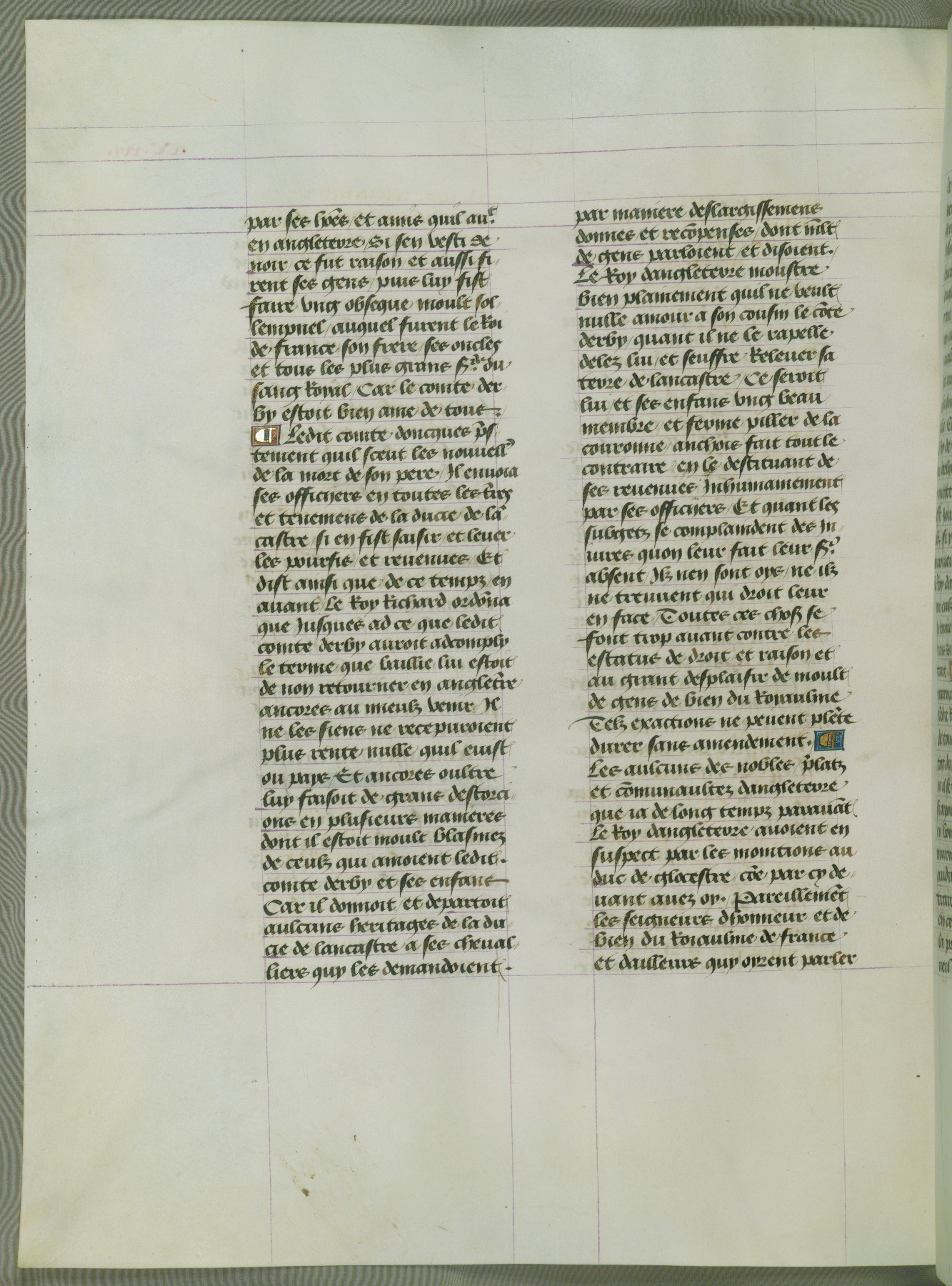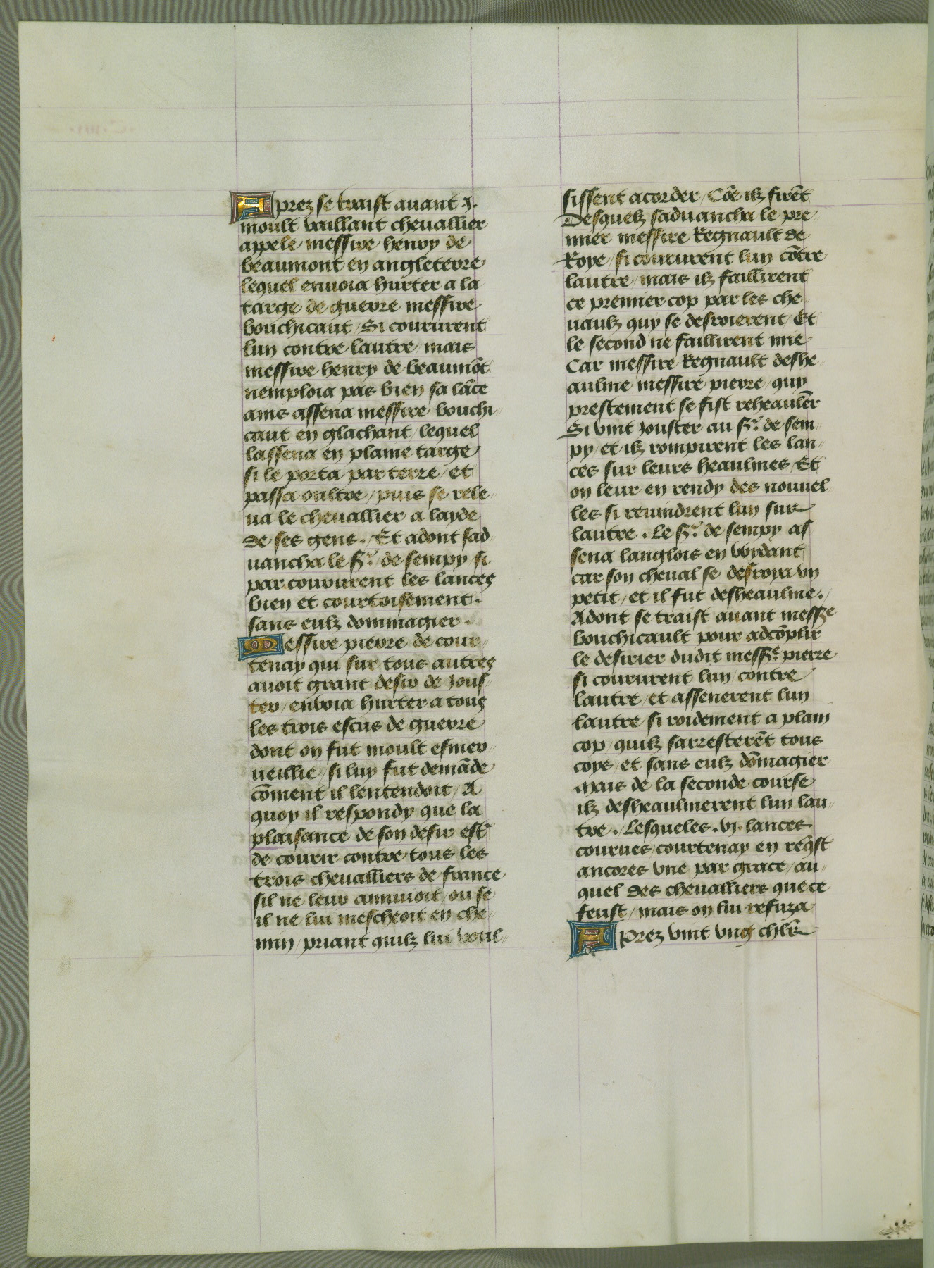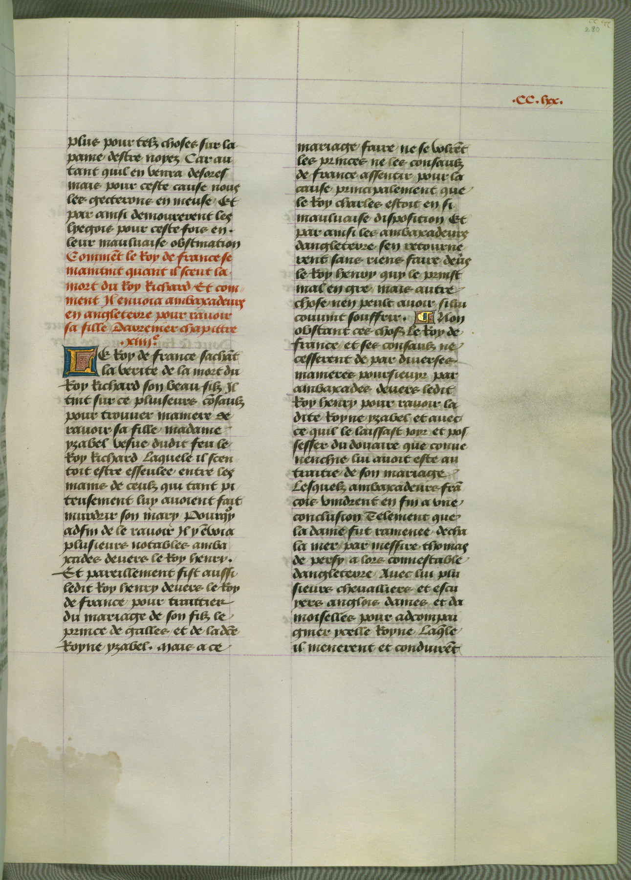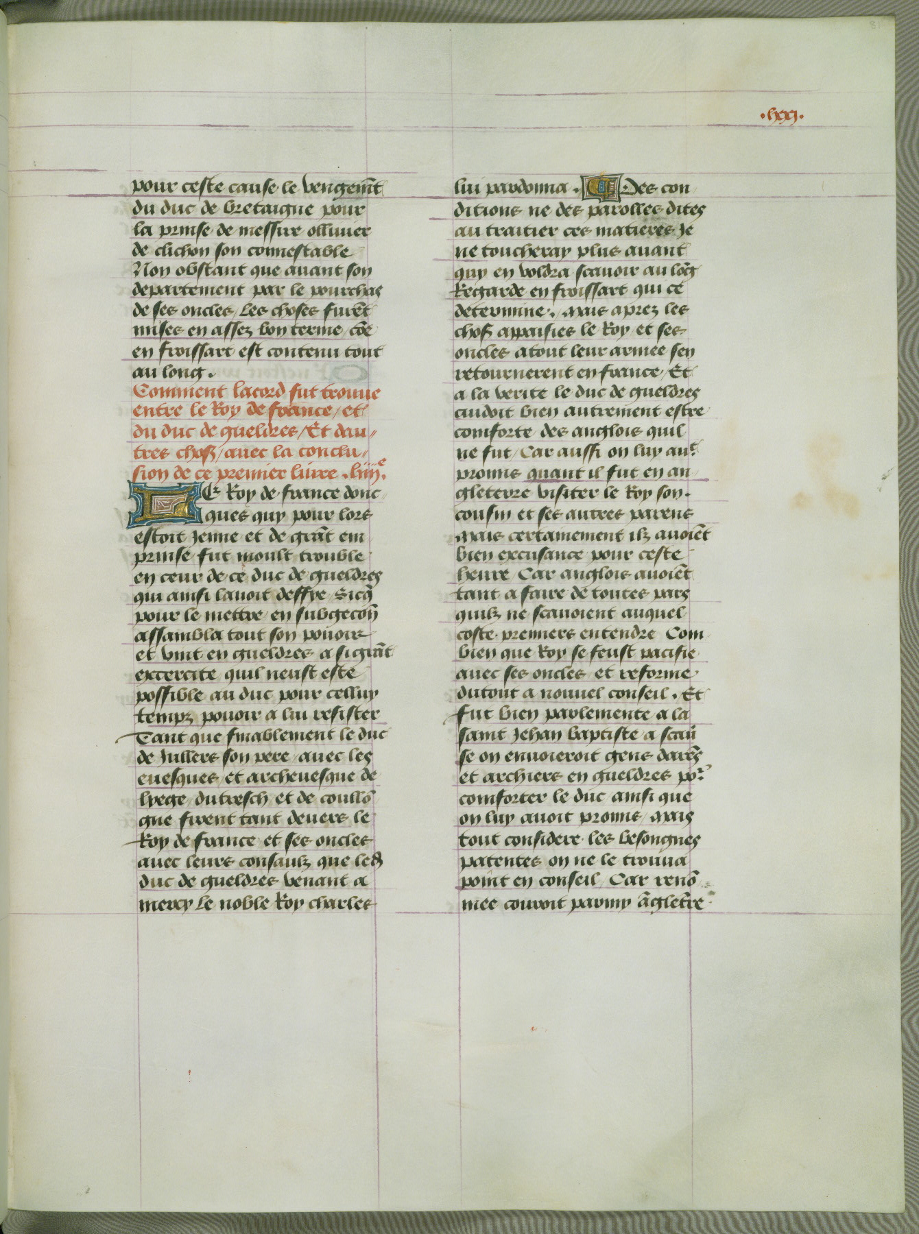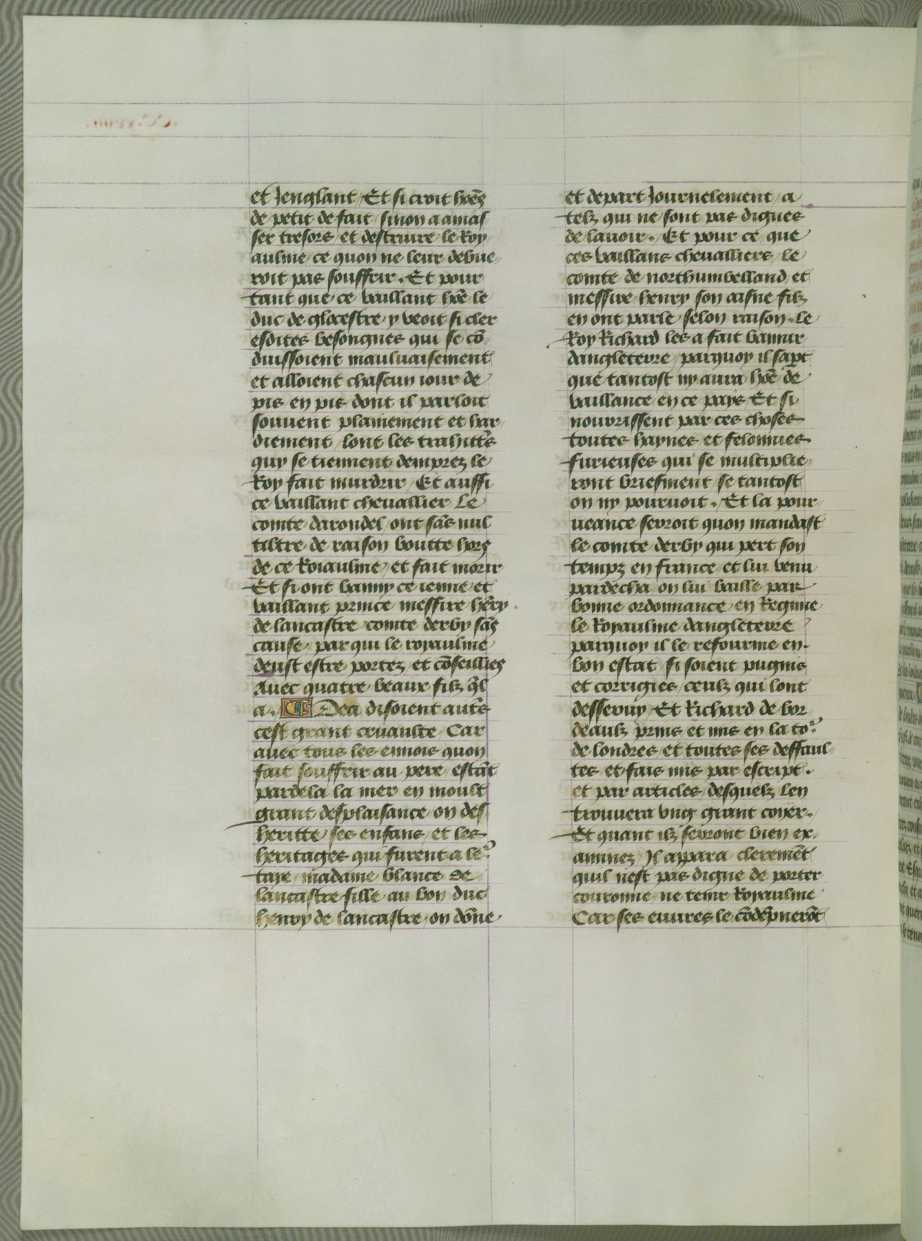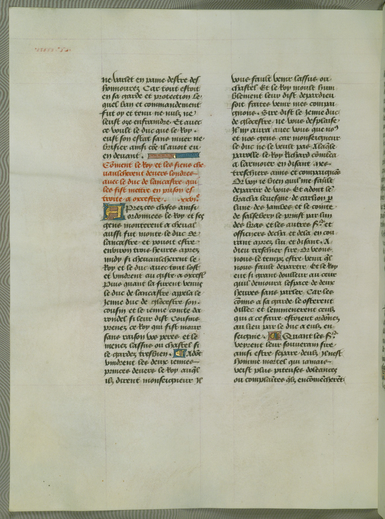 This manuscript is volume IV in a set of five from the collection "Recueil des chroniques et anchiennes istories de la Grant Bretaigne," written by Phillip the Good's counselor and chamberlain Jean de Wavrin. It chronicles the history of England from the early years of the reign of Richard II in 1377 to the demise of Henry IV, his successor, between 1400 and 1413. This volume, produced in Flanders between 1470 and 1480, was part of a set of which volumes II, III and V were recorded in the inventory of the library of William III of Orange in 1686, and was later rebound during the seventeenth or eighteenth century. Six three-quarter-page miniatures open the text of each book and depict events documented therein (with the exception of that of Book 1, portraying Richard II's coronation, which occurs prior to the period detailed in that book). The manuscript's margins are wide and relatively pristine throughout the textblock, but show significant signs of use on illuminated folios, indicating that this manuscript was primarily used for display and not as a historical text. Although few volumes of the Chroniques remain, this manuscript is particularly rare in that it is one of the two surviving exemplars of the text of volume IV, the other being part of the complete set in the Bibliothèque nationale de France (BN fr. 74-85). Volumes II, III, and V of the set to which this volume originally belonged are now in the collection of the Koninklijke Bibliotheek (Den Haag, KB : 133 A 7).