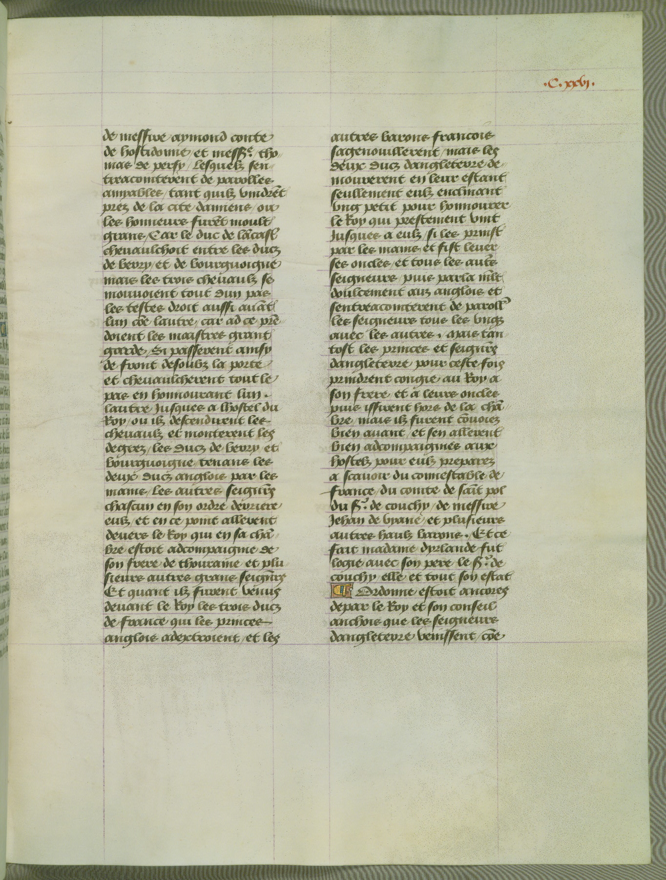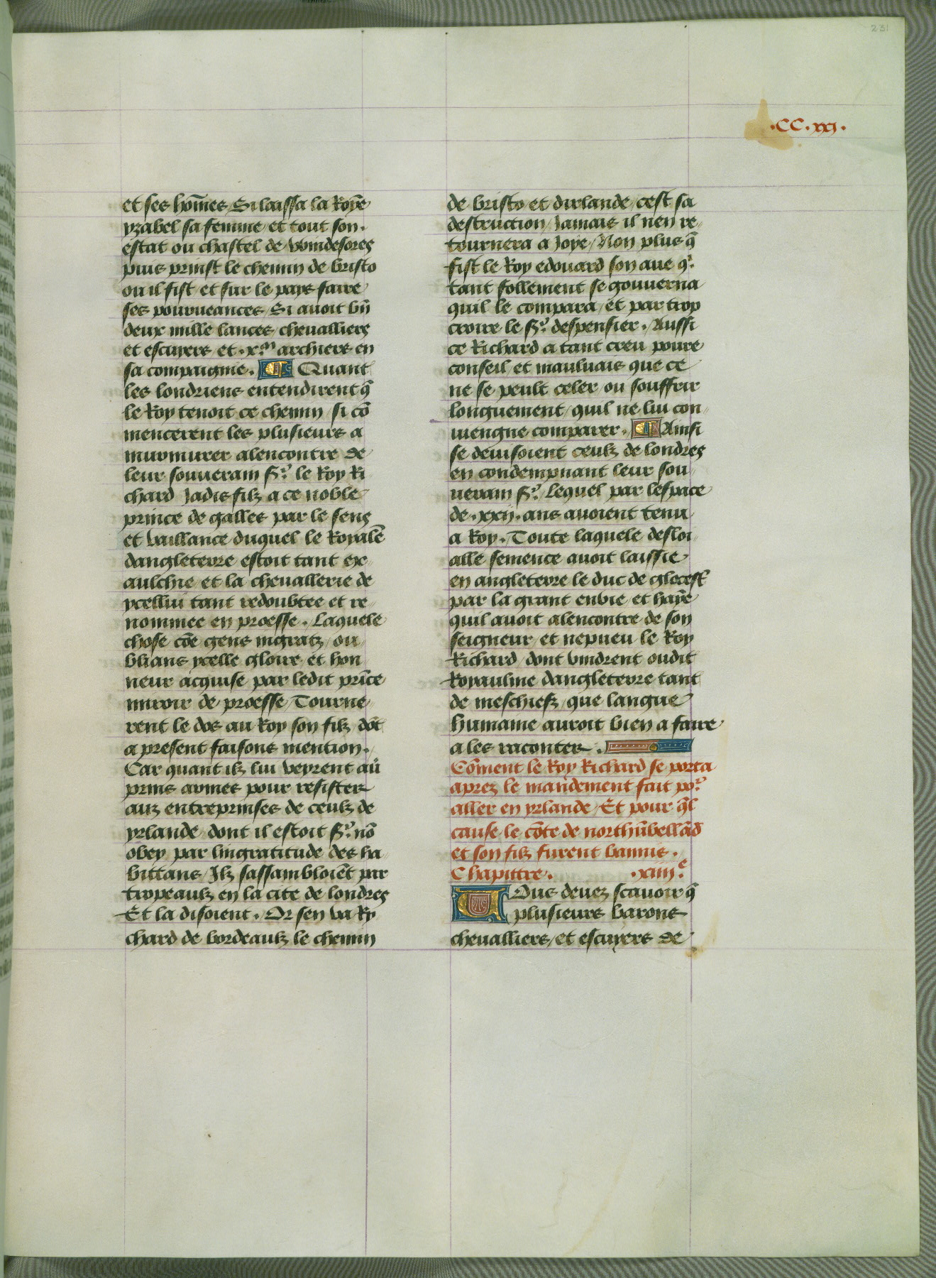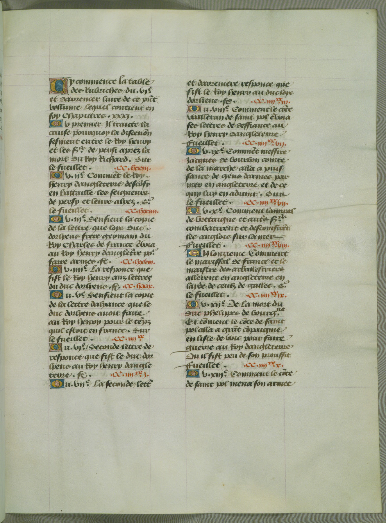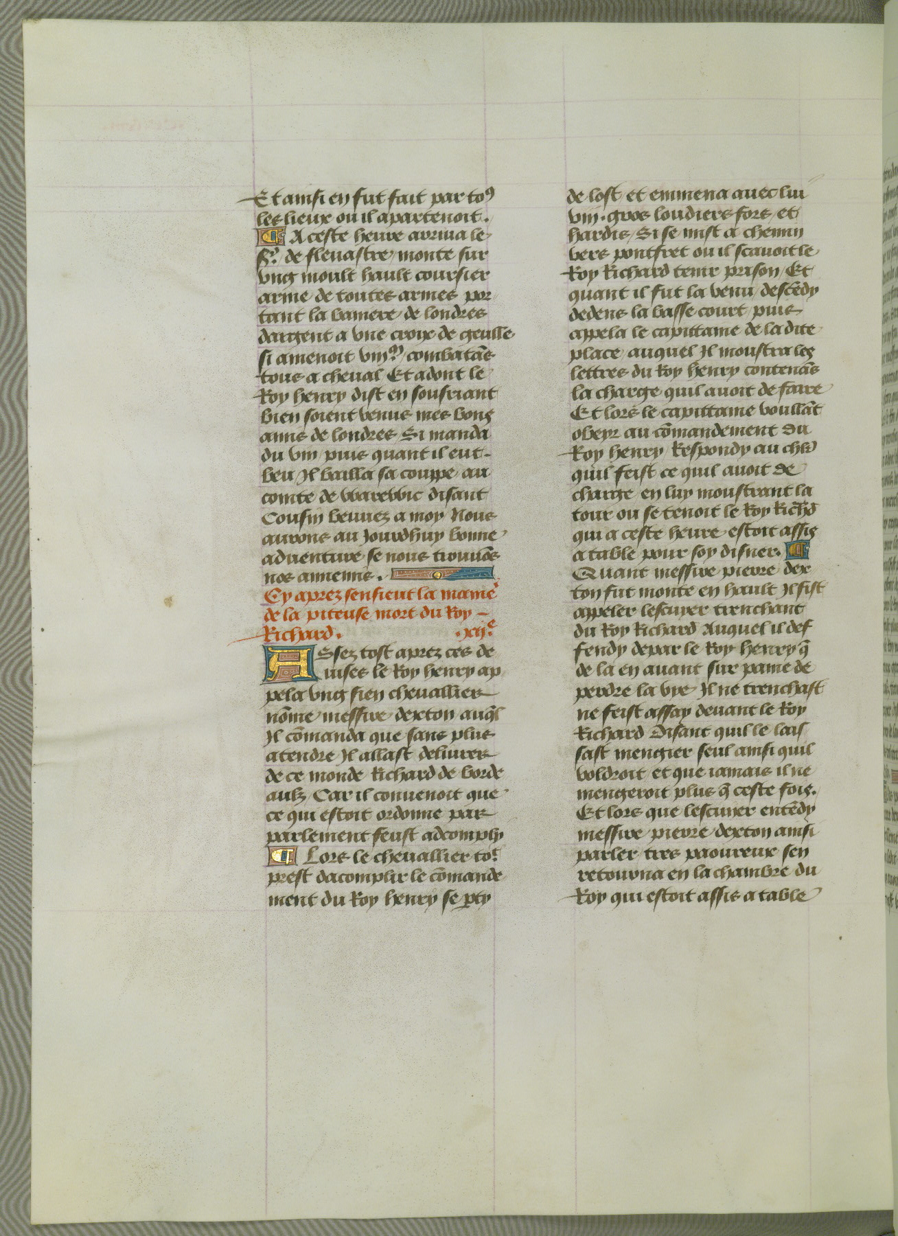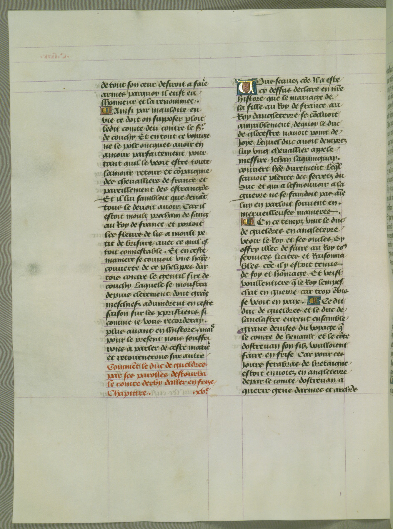 This manuscript is volume IV in a set of five from the collection "Recueil des chroniques et anchiennes istories de la Grant Bretaigne," written by Phillip the Good's counselor and chamberlain Jean de Wavrin. It chronicles the history of England from the early years of the reign of Richard II in 1377 to the demise of Henry IV, his successor, between 1400 and 1413. This volume, produced in Flanders between 1470 and 1480, was part of a set of which volumes II, III and V were recorded in the inventory of the library of William III of Orange in 1686, and was later rebound during the seventeenth or eighteenth century. Six three-quarter-page miniatures open the text of each book and depict events documented therein (with the exception of that of Book 1, portraying Richard II's coronation, which occurs prior to the period detailed in that book). The manuscript's margins are wide and relatively pristine throughout the textblock, but show significant signs of use on illuminated folios, indicating that this manuscript was primarily used for display and not as a historical text. Although few volumes of the Chroniques remain, this manuscript is particularly rare in that it is one of the two surviving exemplars of the text of volume IV, the other being part of the complete set in the Bibliothèque nationale de France (BN fr. 74-85). Volumes II, III, and V of the set to which this volume originally belonged are now in the collection of the Koninklijke Bibliotheek (Den Haag, KB : 133 A 7).