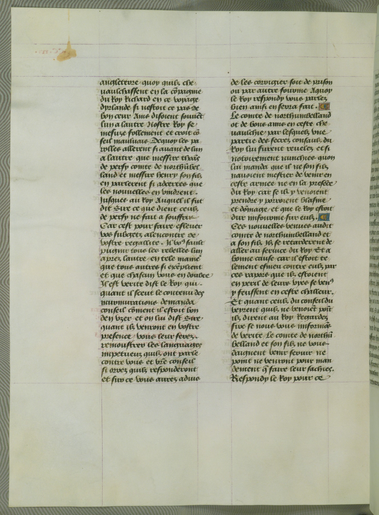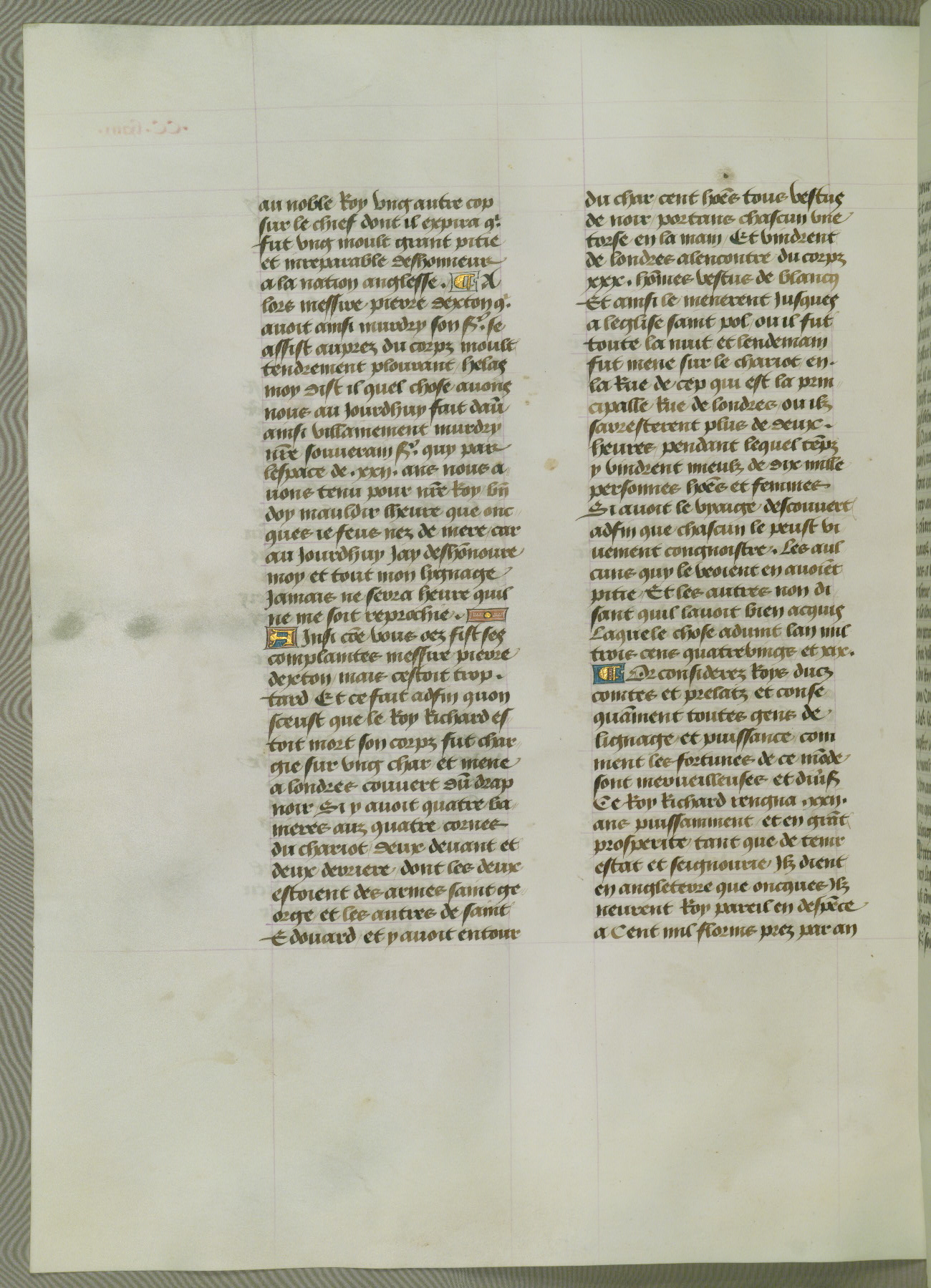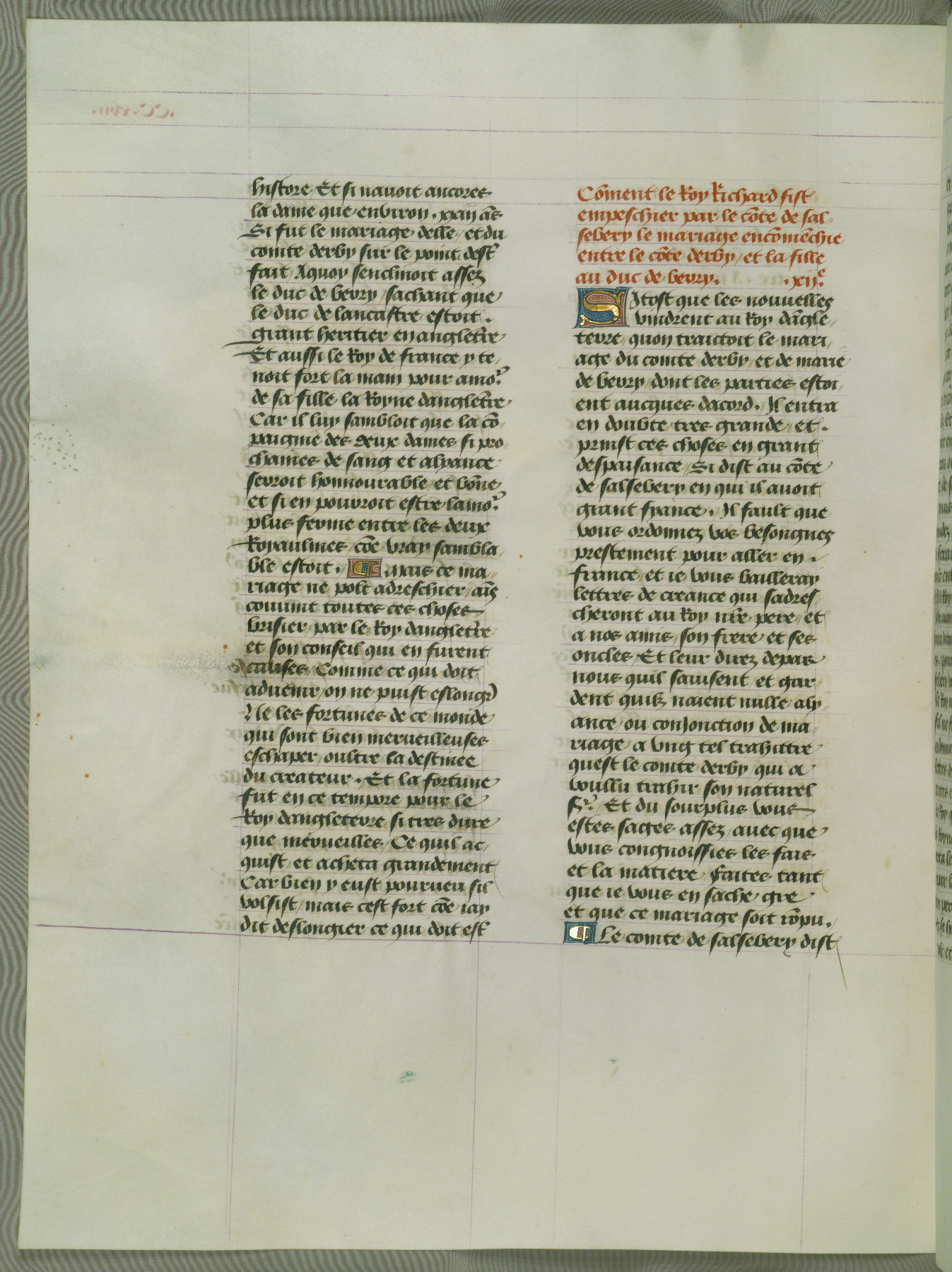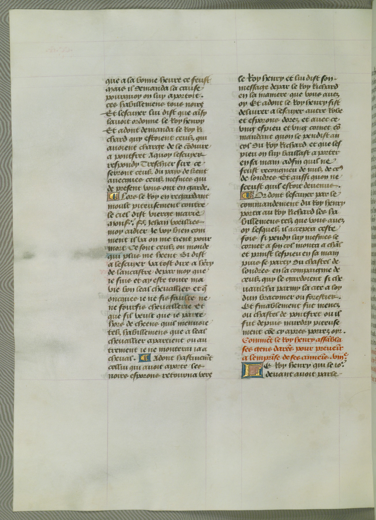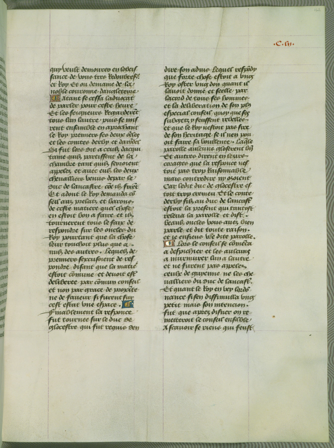 This manuscript is volume IV in a set of five from the collection "Recueil des chroniques et anchiennes istories de la Grant Bretaigne," written by Phillip the Good's counselor and chamberlain Jean de Wavrin. It chronicles the history of England from the early years of the reign of Richard II in 1377 to the demise of Henry IV, his successor, between 1400 and 1413. This volume, produced in Flanders between 1470 and 1480, was part of a set of which volumes II, III and V were recorded in the inventory of the library of William III of Orange in 1686, and was later rebound during the seventeenth or eighteenth century. Six three-quarter-page miniatures open the text of each book and depict events documented therein (with the exception of that of Book 1, portraying Richard II's coronation, which occurs prior to the period detailed in that book). The manuscript's margins are wide and relatively pristine throughout the textblock, but show significant signs of use on illuminated folios, indicating that this manuscript was primarily used for display and not as a historical text. Although few volumes of the Chroniques remain, this manuscript is particularly rare in that it is one of the two surviving exemplars of the text of volume IV, the other being part of the complete set in the Bibliothèque nationale de France (BN fr. 74-85). Volumes II, III, and V of the set to which this volume originally belonged are now in the collection of the Koninklijke Bibliotheek (Den Haag, KB : 133 A 7).