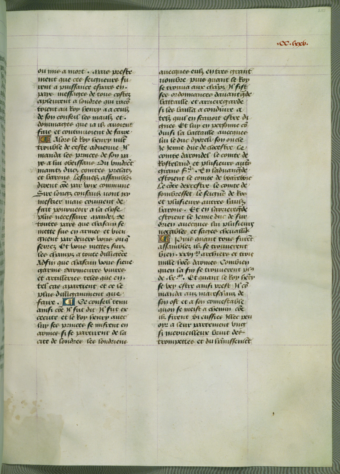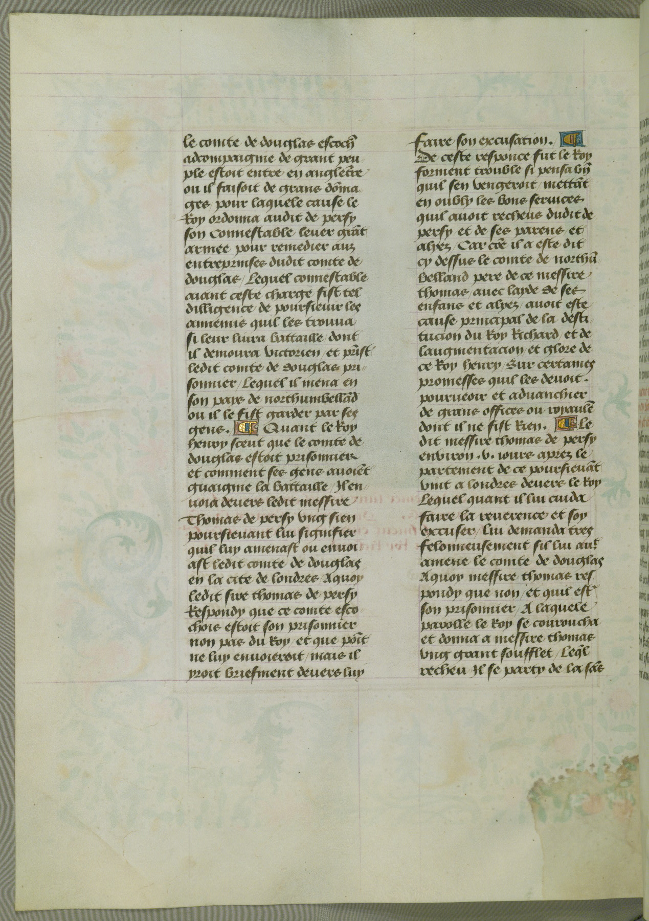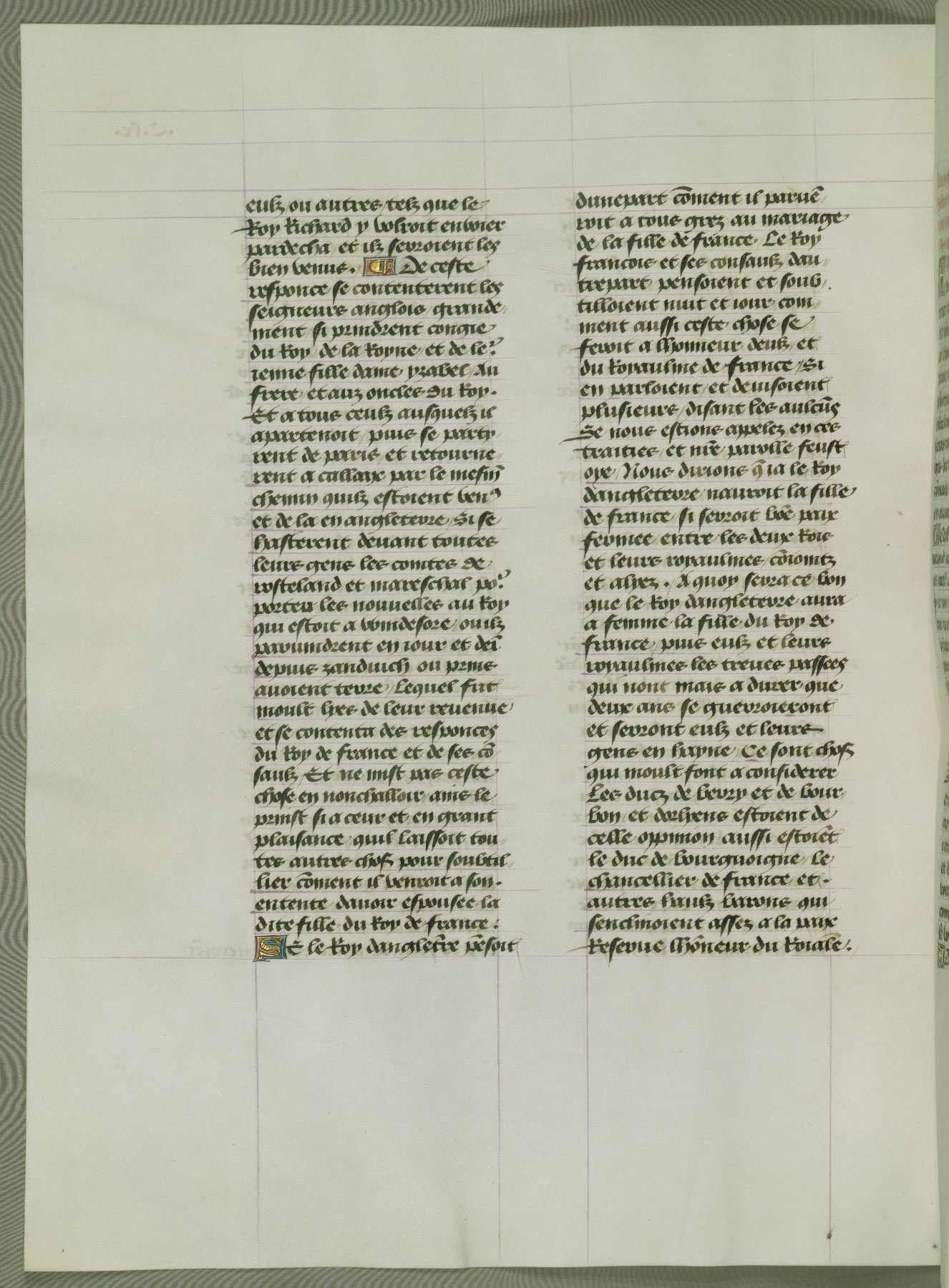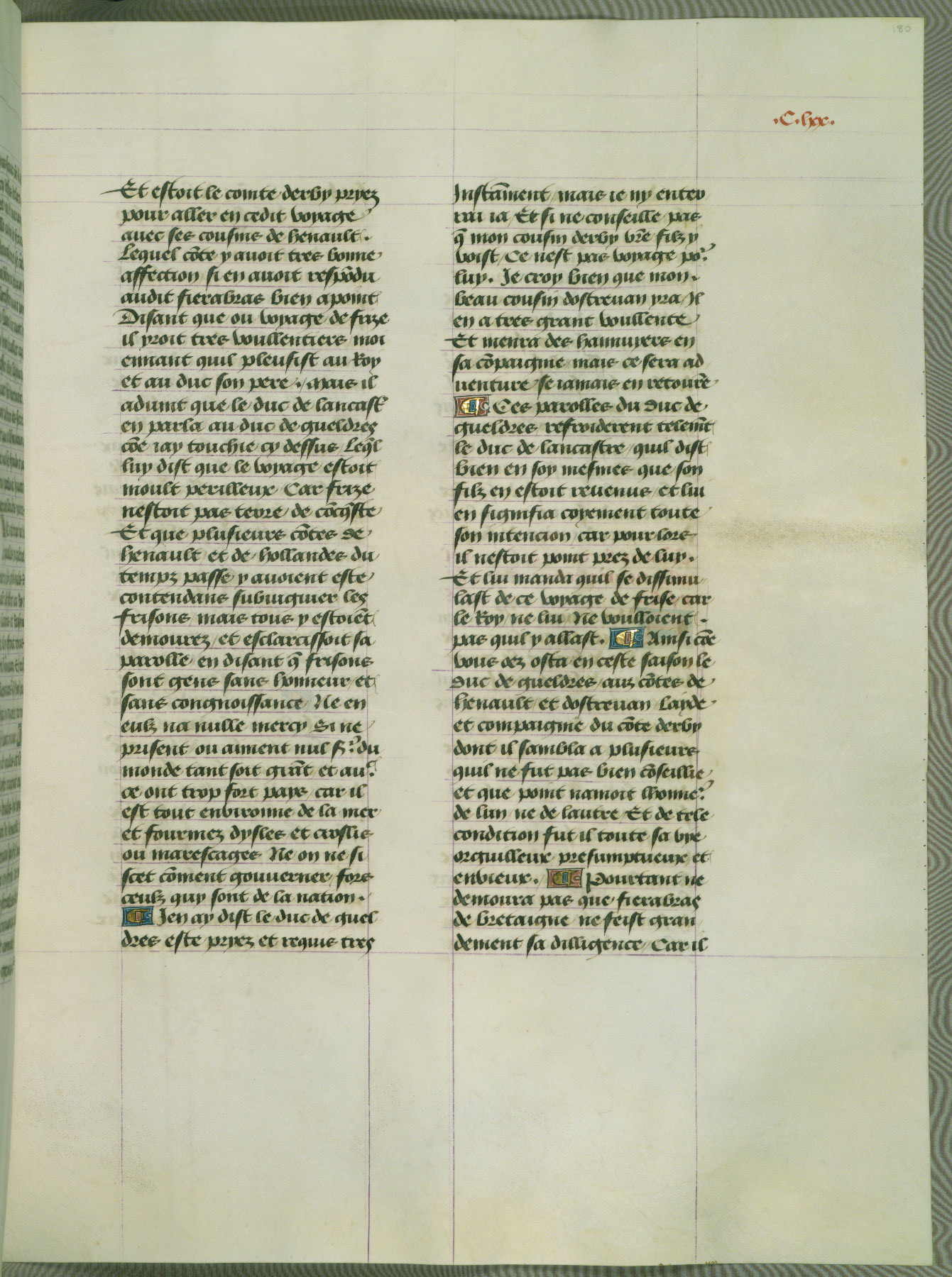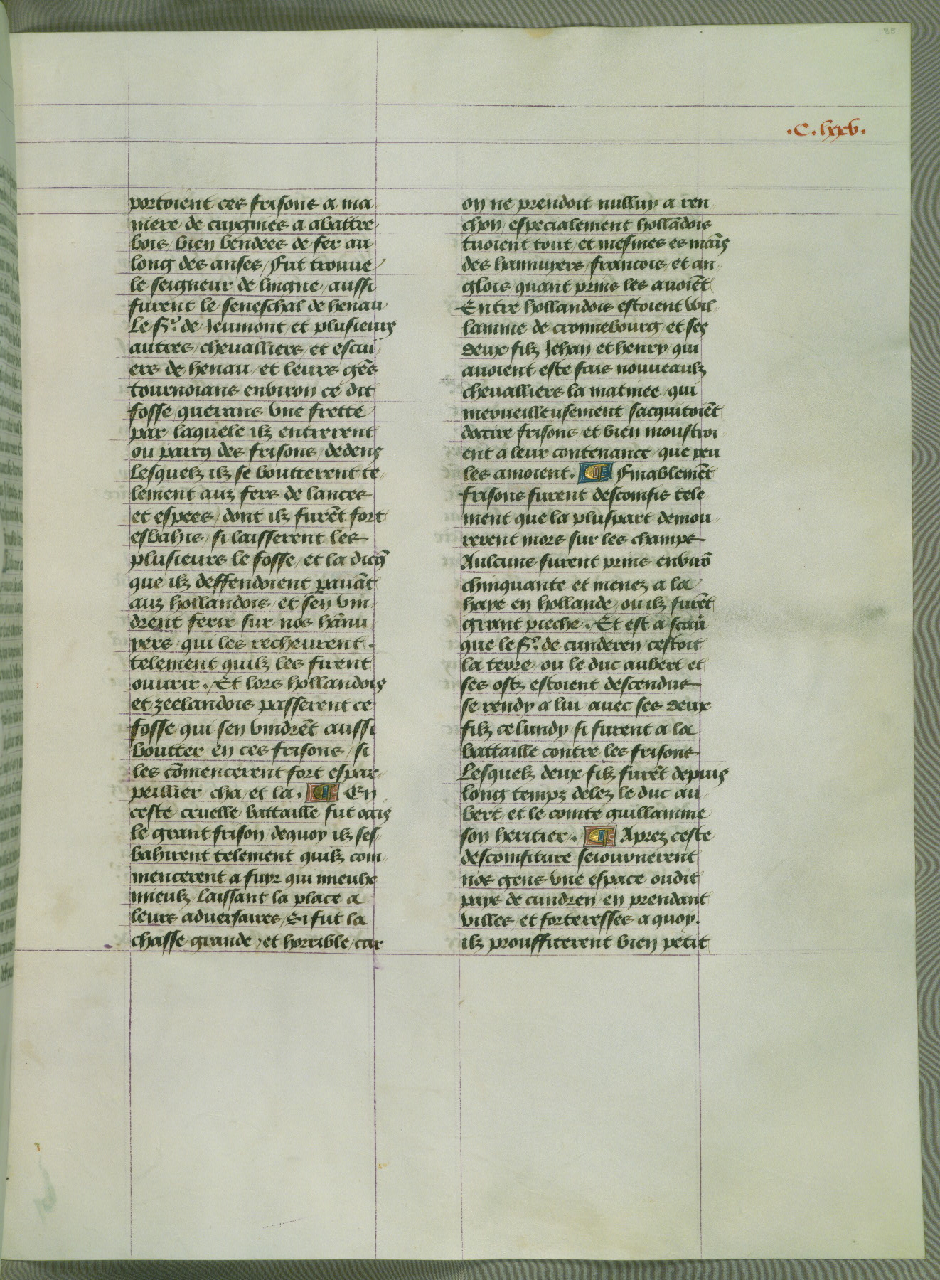 This manuscript is volume IV in a set of five from the collection "Recueil des chroniques et anchiennes istories de la Grant Bretaigne," written by Phillip the Good's counselor and chamberlain Jean de Wavrin. It chronicles the history of England from the early years of the reign of Richard II in 1377 to the demise of Henry IV, his successor, between 1400 and 1413. This volume, produced in Flanders between 1470 and 1480, was part of a set of which volumes II, III and V were recorded in the inventory of the library of William III of Orange in 1686, and was later rebound during the seventeenth or eighteenth century. Six three-quarter-page miniatures open the text of each book and depict events documented therein (with the exception of that of Book 1, portraying Richard II's coronation, which occurs prior to the period detailed in that book). The manuscript's margins are wide and relatively pristine throughout the textblock, but show significant signs of use on illuminated folios, indicating that this manuscript was primarily used for display and not as a historical text. Although few volumes of the Chroniques remain, this manuscript is particularly rare in that it is one of the two surviving exemplars of the text of volume IV, the other being part of the complete set in the Bibliothèque nationale de France (BN fr. 74-85). Volumes II, III, and V of the set to which this volume originally belonged are now in the collection of the Koninklijke Bibliotheek (Den Haag, KB : 133 A 7).
