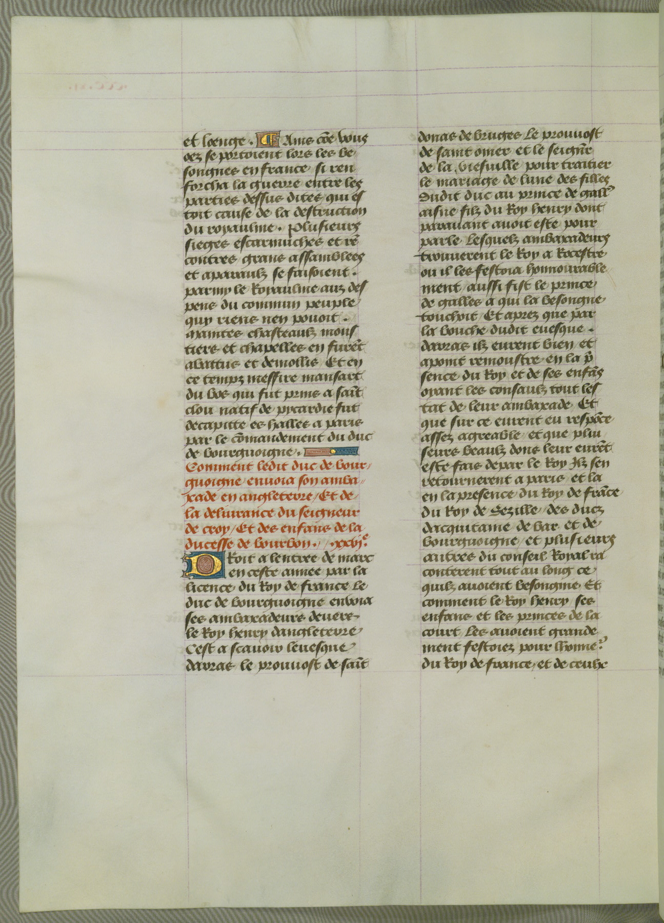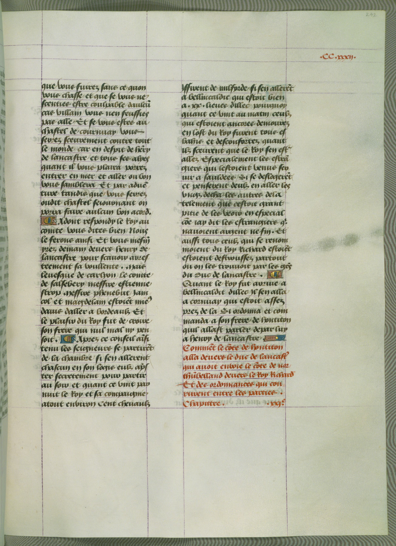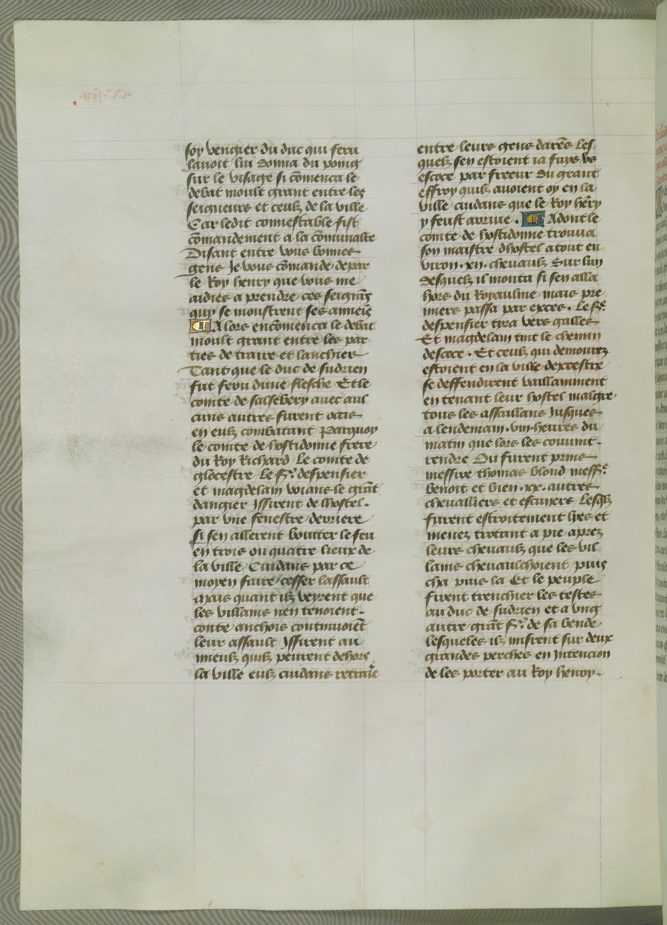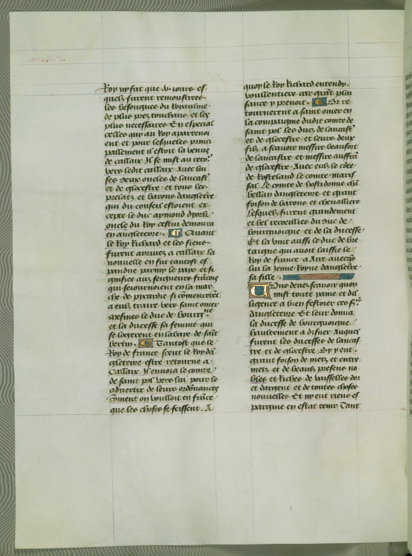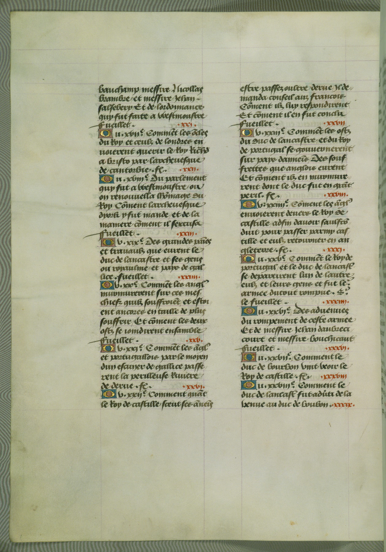 This manuscript is volume IV in a set of five from the collection "Recueil des chroniques et anchiennes istories de la Grant Bretaigne," written by Phillip the Good's counselor and chamberlain Jean de Wavrin. It chronicles the history of England from the early years of the reign of Richard II in 1377 to the demise of Henry IV, his successor, between 1400 and 1413. This volume, produced in Flanders between 1470 and 1480, was part of a set of which volumes II, III and V were recorded in the inventory of the library of William III of Orange in 1686, and was later rebound during the seventeenth or eighteenth century. Six three-quarter-page miniatures open the text of each book and depict events documented therein (with the exception of that of Book 1, portraying Richard II's coronation, which occurs prior to the period detailed in that book). The manuscript's margins are wide and relatively pristine throughout the textblock, but show significant signs of use on illuminated folios, indicating that this manuscript was primarily used for display and not as a historical text. Although few volumes of the Chroniques remain, this manuscript is particularly rare in that it is one of the two surviving exemplars of the text of volume IV, the other being part of the complete set in the Bibliothèque nationale de France (BN fr. 74-85). Volumes II, III, and V of the set to which this volume originally belonged are now in the collection of the Koninklijke Bibliotheek (Den Haag, KB : 133 A 7).