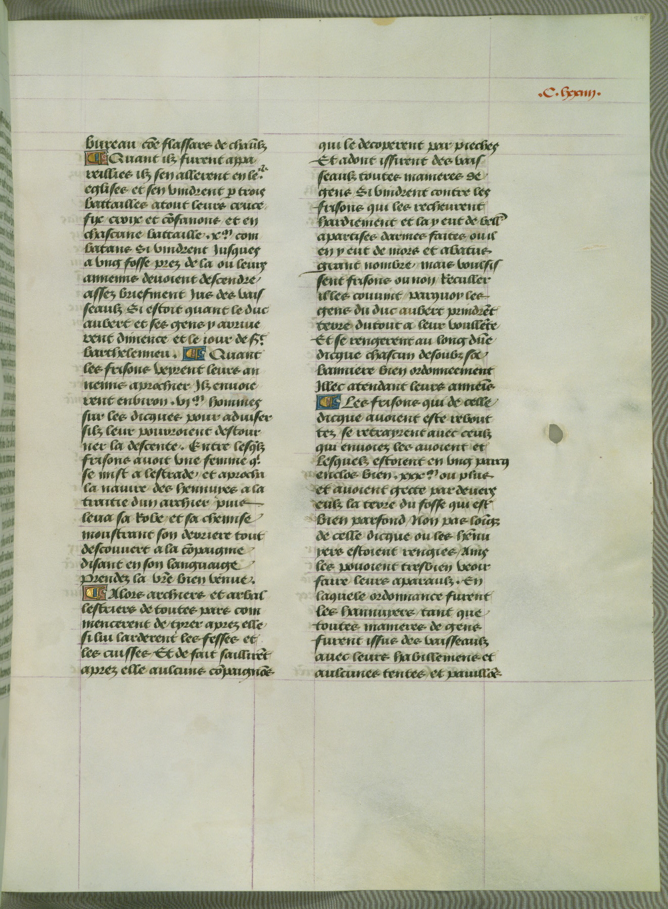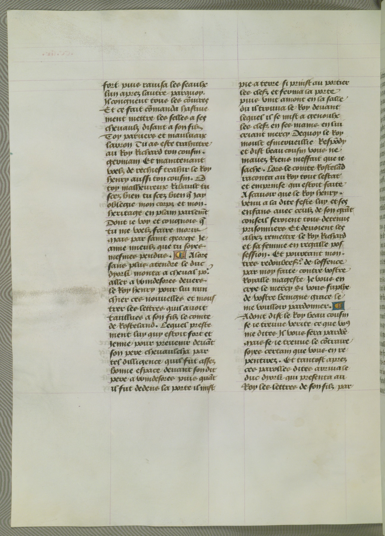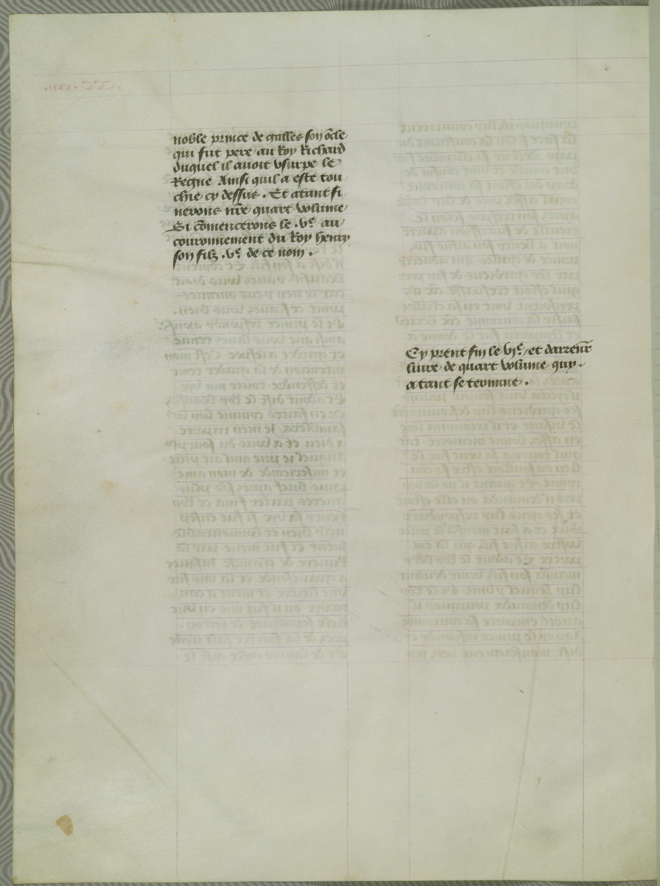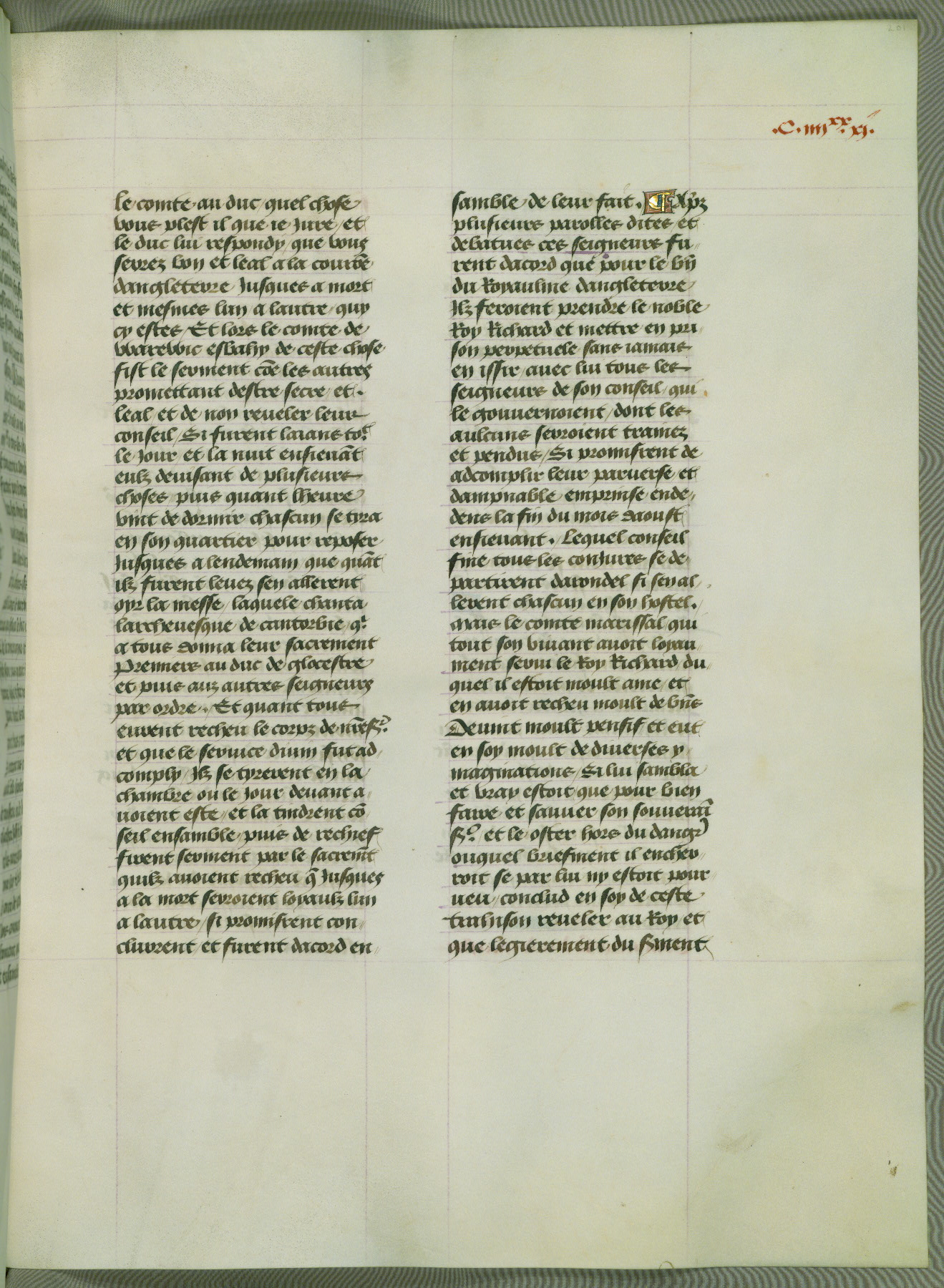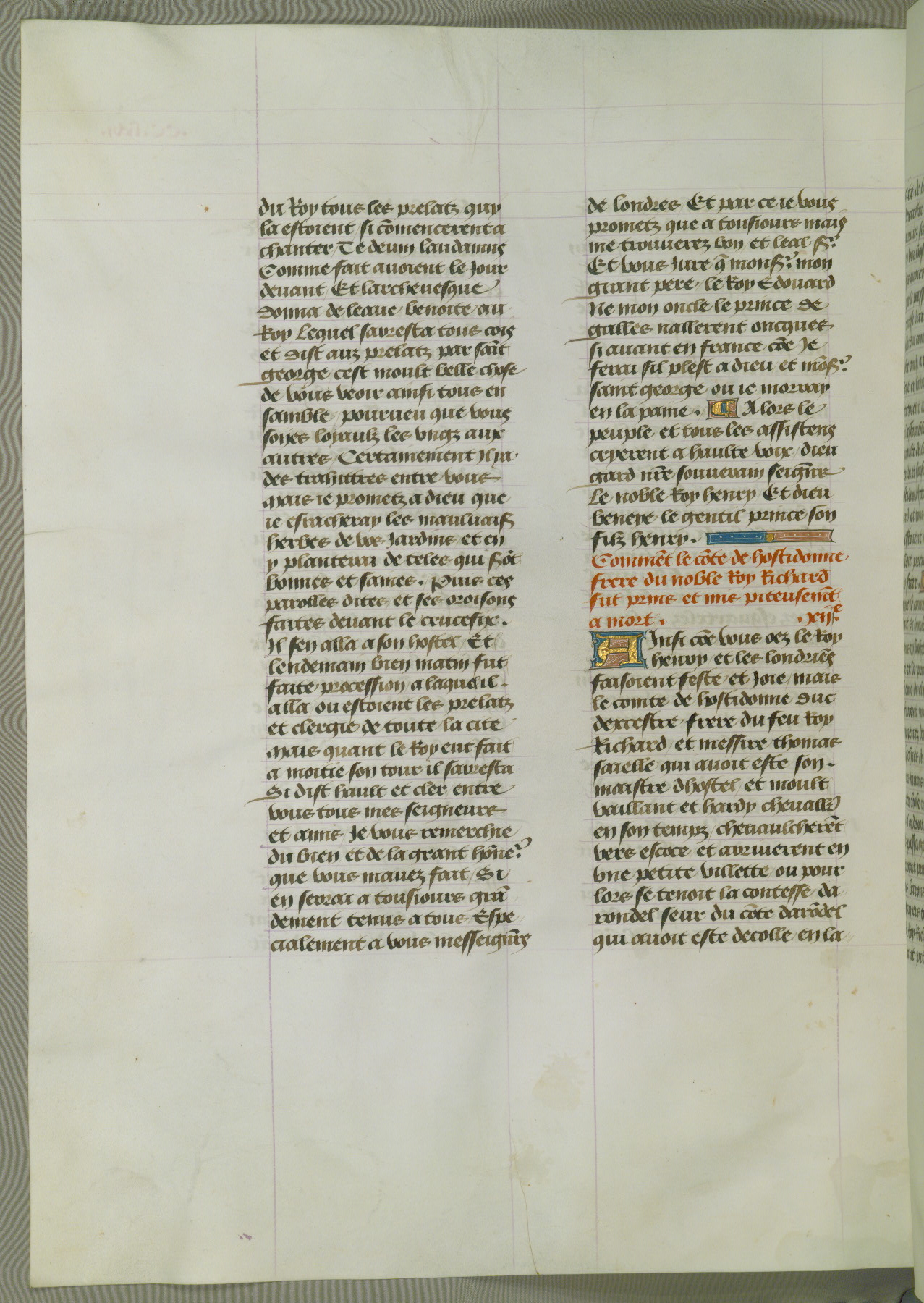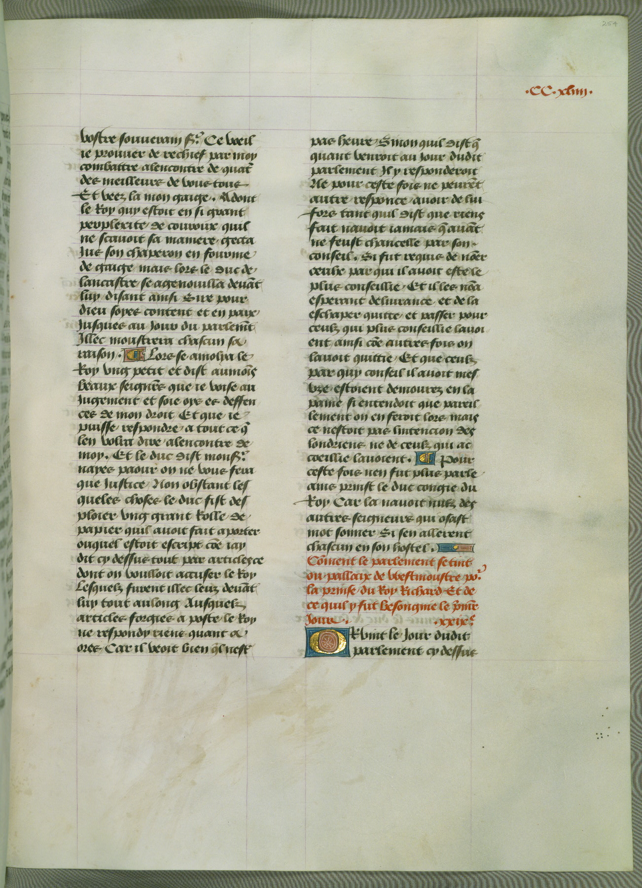 This manuscript is volume IV in a set of five from the collection "Recueil des chroniques et anchiennes istories de la Grant Bretaigne," written by Phillip the Good's counselor and chamberlain Jean de Wavrin. It chronicles the history of England from the early years of the reign of Richard II in 1377 to the demise of Henry IV, his successor, between 1400 and 1413. This volume, produced in Flanders between 1470 and 1480, was part of a set of which volumes II, III and V were recorded in the inventory of the library of William III of Orange in 1686, and was later rebound during the seventeenth or eighteenth century. Six three-quarter-page miniatures open the text of each book and depict events documented therein (with the exception of that of Book 1, portraying Richard II's coronation, which occurs prior to the period detailed in that book). The manuscript's margins are wide and relatively pristine throughout the textblock, but show significant signs of use on illuminated folios, indicating that this manuscript was primarily used for display and not as a historical text. Although few volumes of the Chroniques remain, this manuscript is particularly rare in that it is one of the two surviving exemplars of the text of volume IV, the other being part of the complete set in the Bibliothèque nationale de France (BN fr. 74-85). Volumes II, III, and V of the set to which this volume originally belonged are now in the collection of the Koninklijke Bibliotheek (Den Haag, KB : 133 A 7).