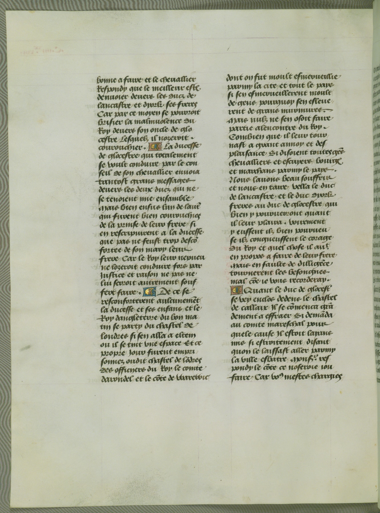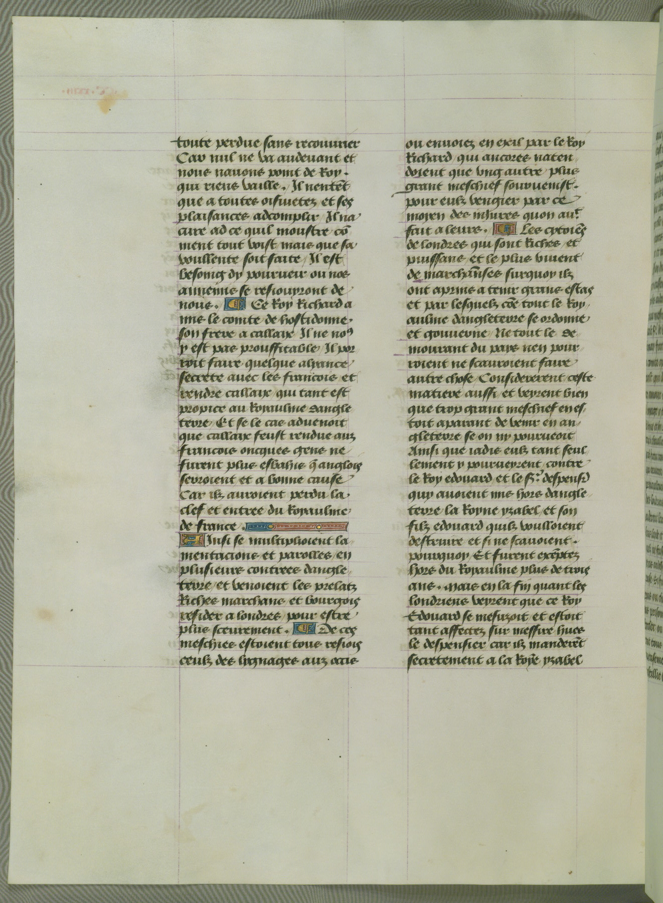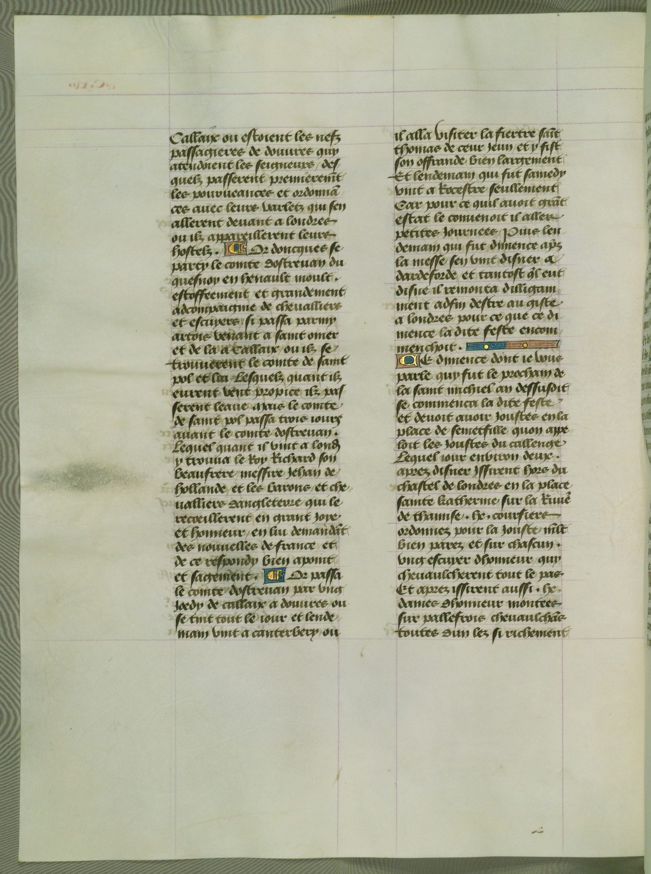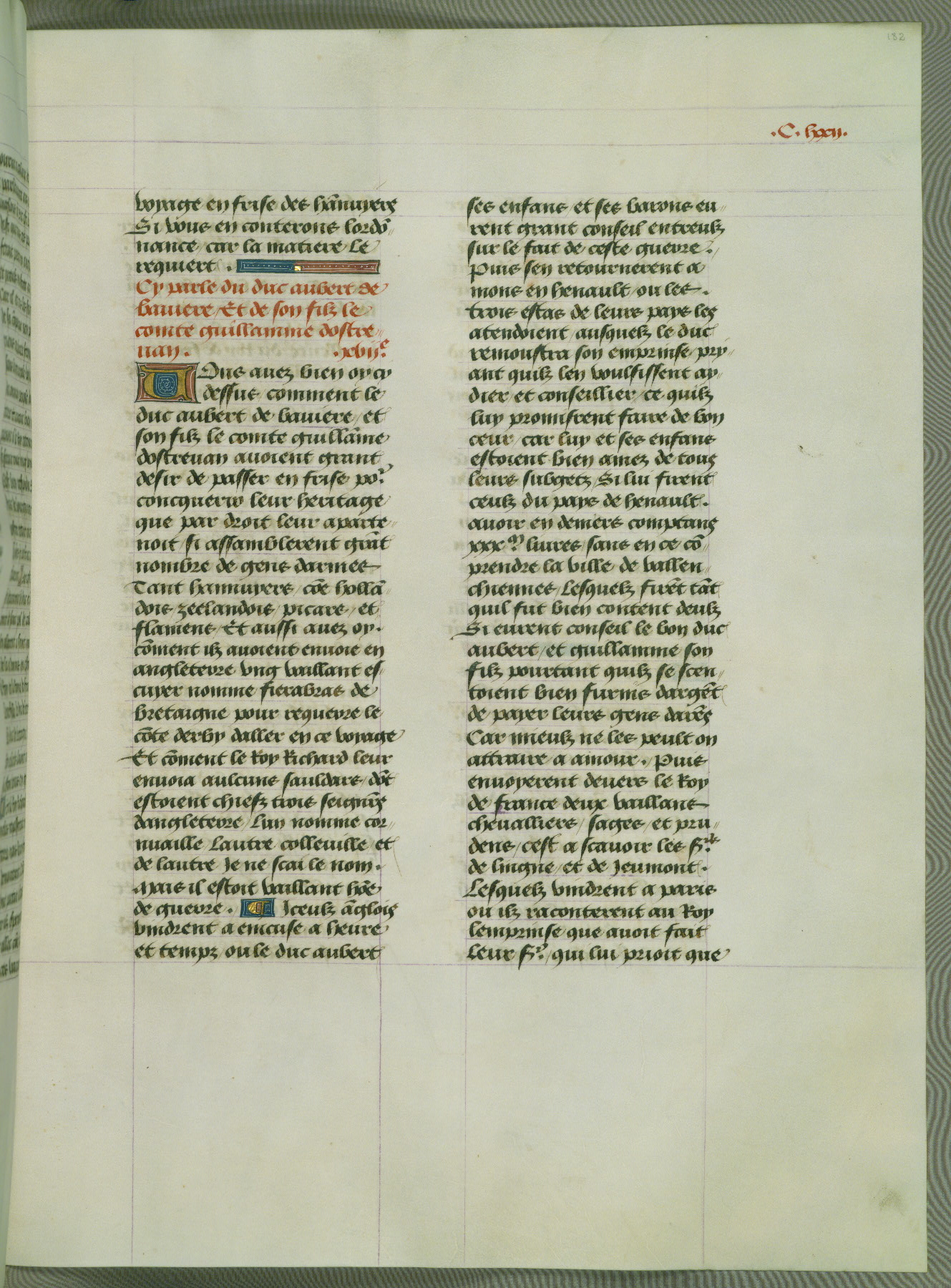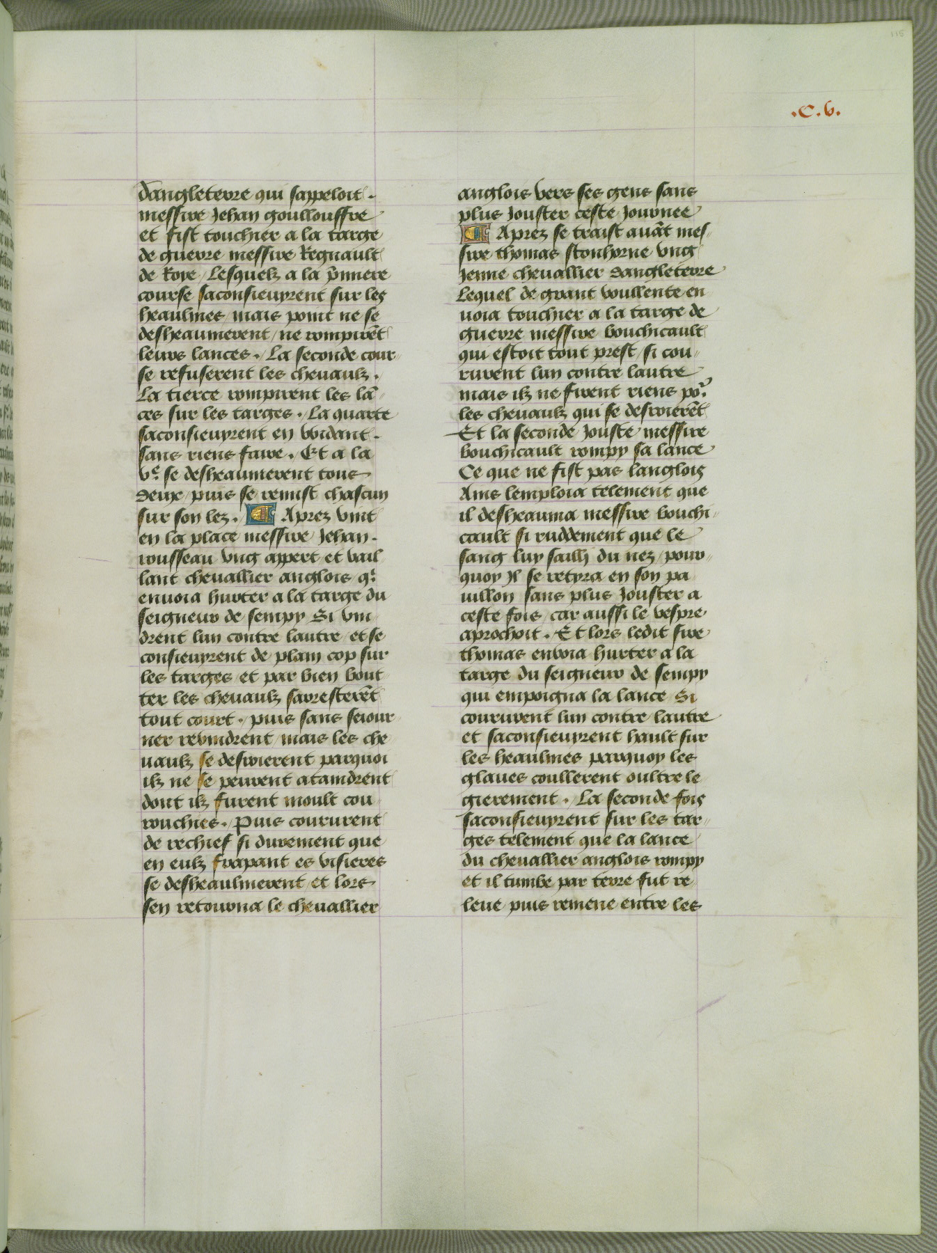 This manuscript is volume IV in a set of five from the collection "Recueil des chroniques et anchiennes istories de la Grant Bretaigne," written by Phillip the Good's counselor and chamberlain Jean de Wavrin. It chronicles the history of England from the early years of the reign of Richard II in 1377 to the demise of Henry IV, his successor, between 1400 and 1413. This volume, produced in Flanders between 1470 and 1480, was part of a set of which volumes II, III and V were recorded in the inventory of the library of William III of Orange in 1686, and was later rebound during the seventeenth or eighteenth century. Six three-quarter-page miniatures open the text of each book and depict events documented therein (with the exception of that of Book 1, portraying Richard II's coronation, which occurs prior to the period detailed in that book). The manuscript's margins are wide and relatively pristine throughout the textblock, but show significant signs of use on illuminated folios, indicating that this manuscript was primarily used for display and not as a historical text. Although few volumes of the Chroniques remain, this manuscript is particularly rare in that it is one of the two surviving exemplars of the text of volume IV, the other being part of the complete set in the Bibliothèque nationale de France (BN fr. 74-85). Volumes II, III, and V of the set to which this volume originally belonged are now in the collection of the Koninklijke Bibliotheek (Den Haag, KB : 133 A 7).