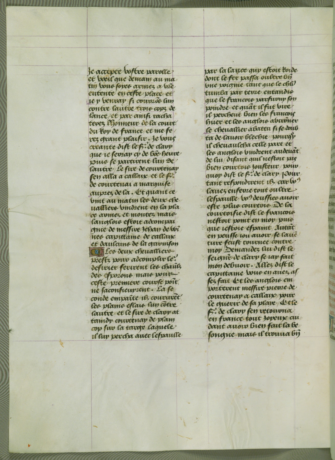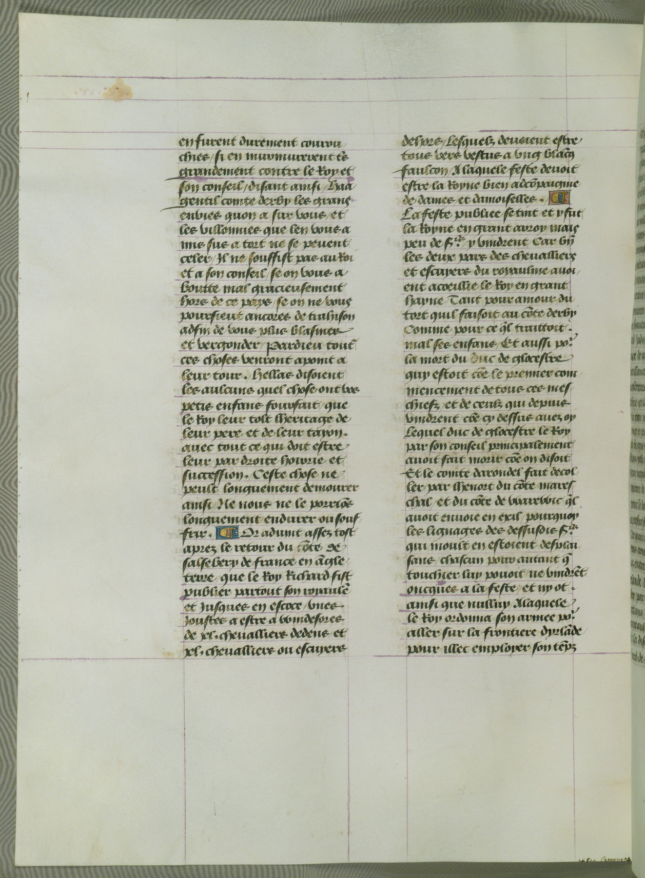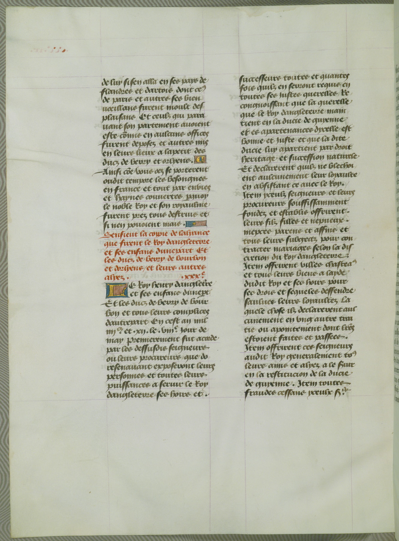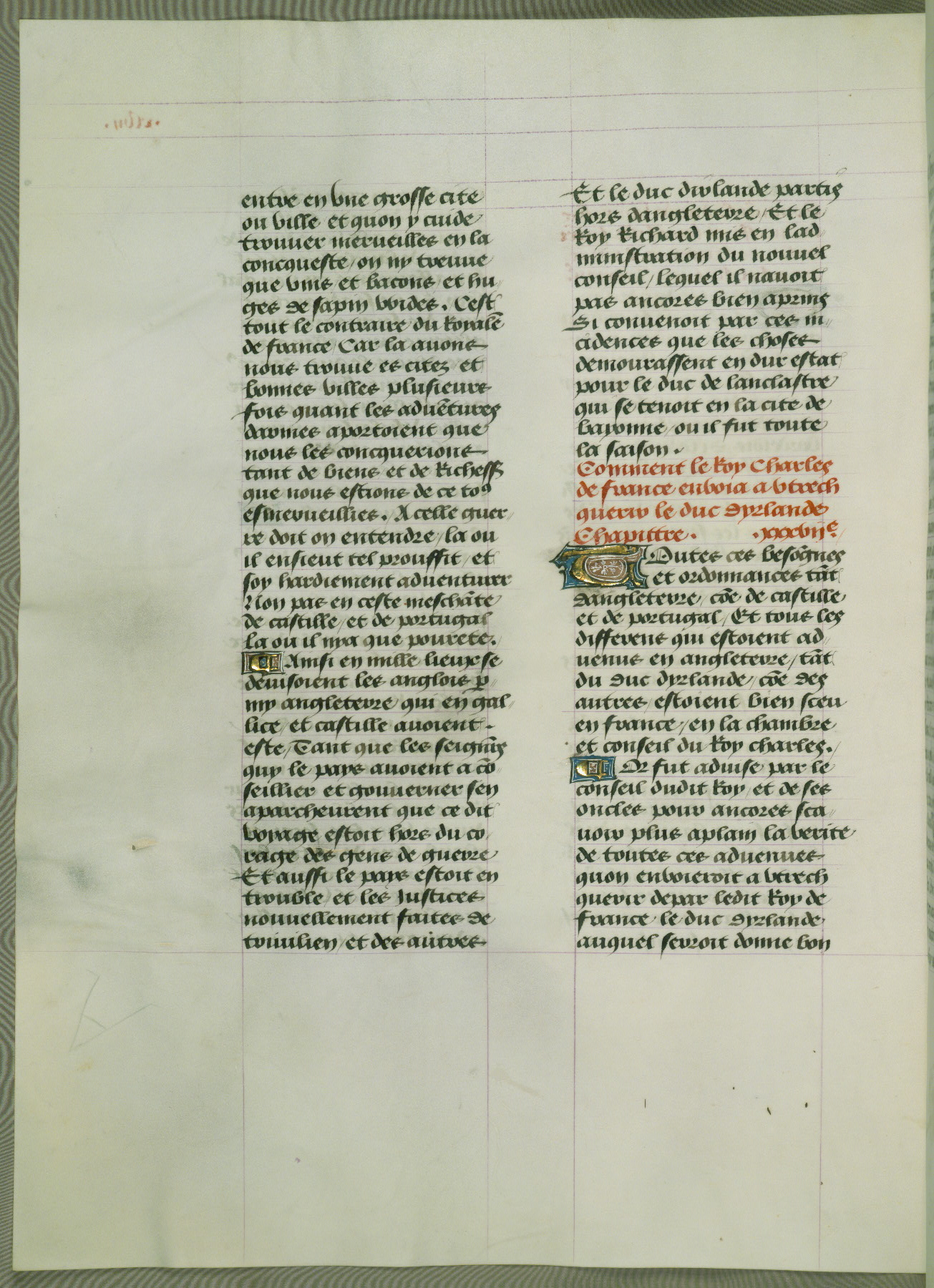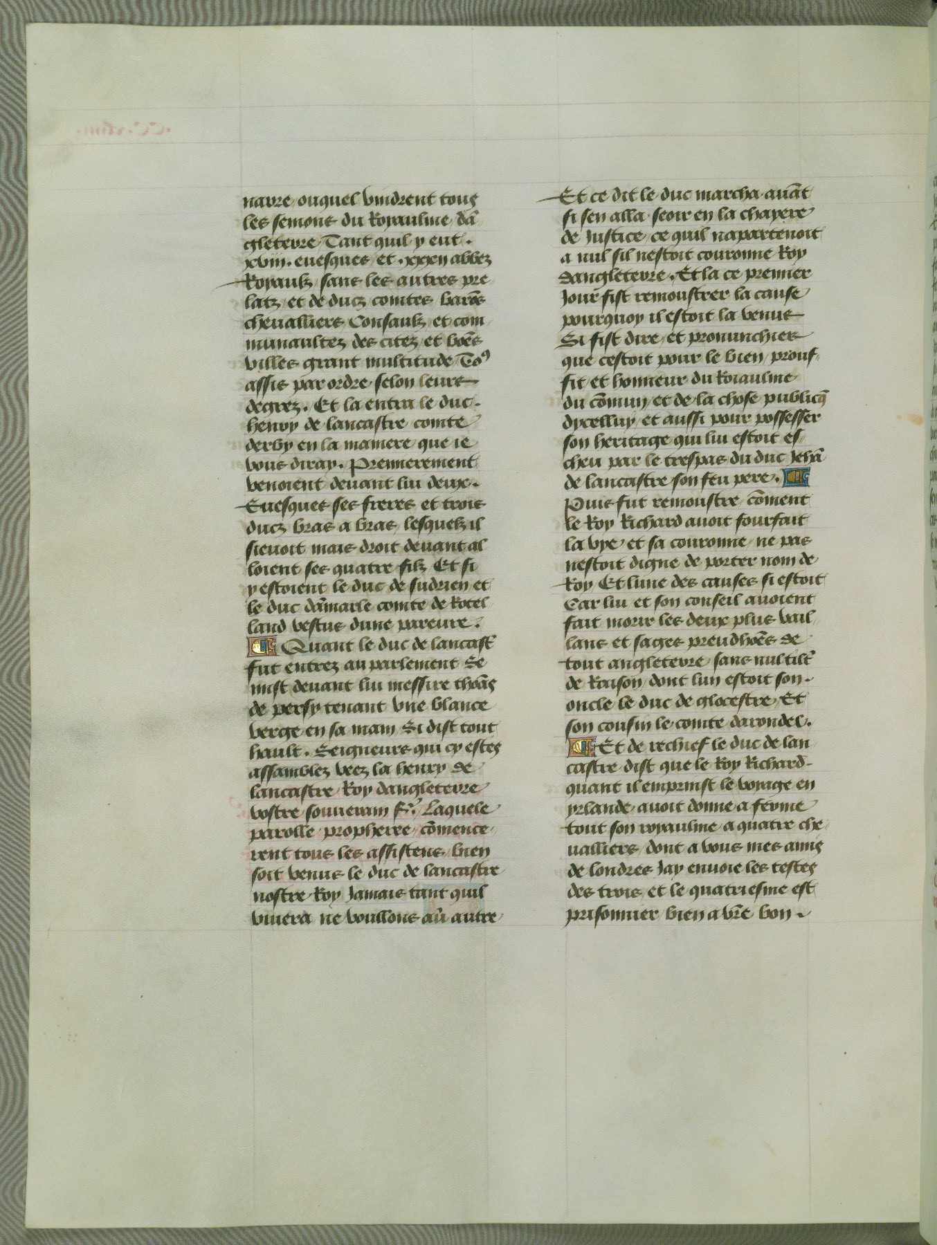 This manuscript is volume IV in a set of five from the collection "Recueil des chroniques et anchiennes istories de la Grant Bretaigne," written by Phillip the Good's counselor and chamberlain Jean de Wavrin. It chronicles the history of England from the early years of the reign of Richard II in 1377 to the demise of Henry IV, his successor, between 1400 and 1413. This volume, produced in Flanders between 1470 and 1480, was part of a set of which volumes II, III and V were recorded in the inventory of the library of William III of Orange in 1686, and was later rebound during the seventeenth or eighteenth century. Six three-quarter-page miniatures open the text of each book and depict events documented therein (with the exception of that of Book 1, portraying Richard II's coronation, which occurs prior to the period detailed in that book). The manuscript's margins are wide and relatively pristine throughout the textblock, but show significant signs of use on illuminated folios, indicating that this manuscript was primarily used for display and not as a historical text. Although few volumes of the Chroniques remain, this manuscript is particularly rare in that it is one of the two surviving exemplars of the text of volume IV, the other being part of the complete set in the Bibliothèque nationale de France (BN fr. 74-85). Volumes II, III, and V of the set to which this volume originally belonged are now in the collection of the Koninklijke Bibliotheek (Den Haag, KB : 133 A 7).