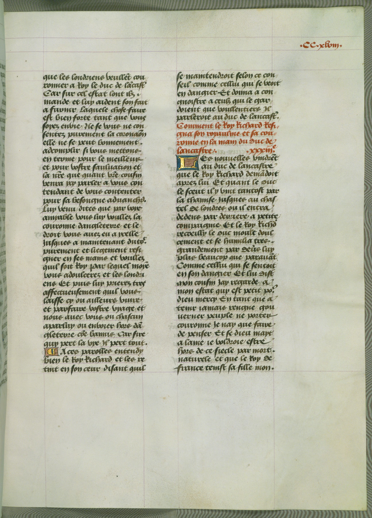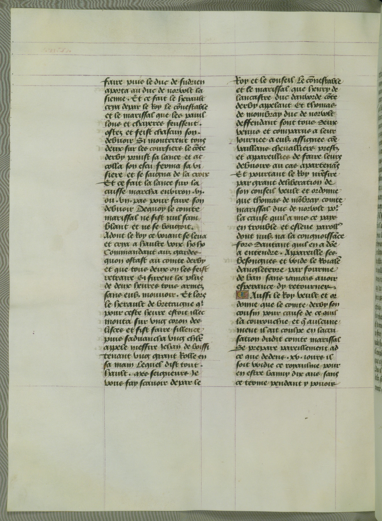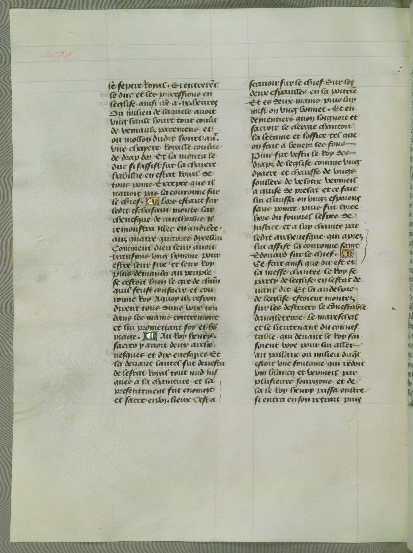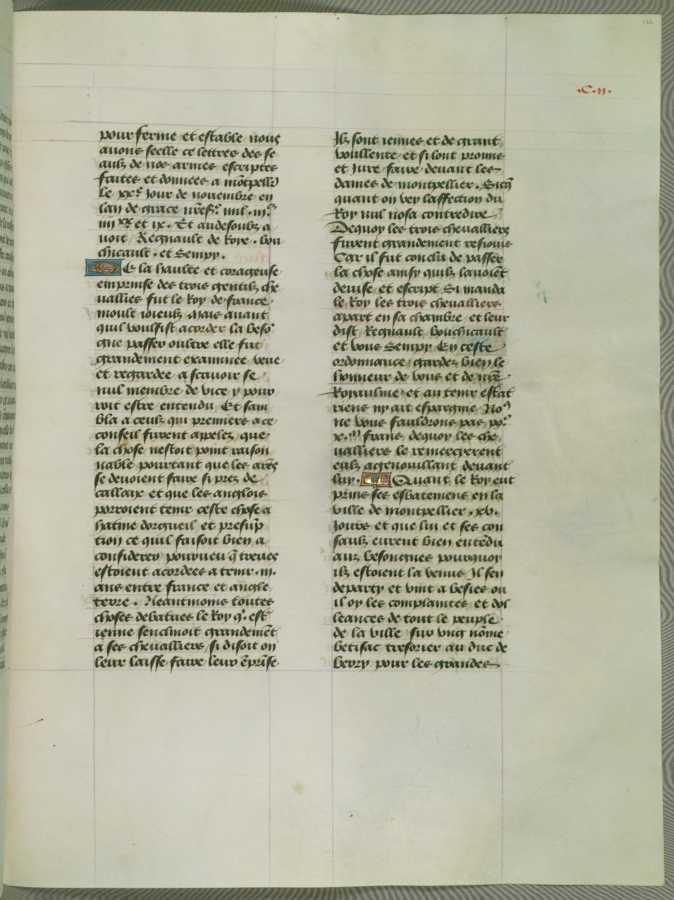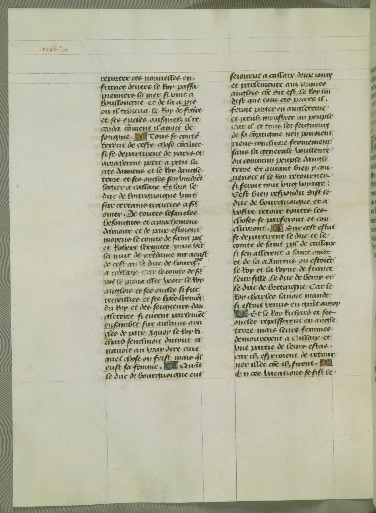 This manuscript is volume IV in a set of five from the collection "Recueil des chroniques et anchiennes istories de la Grant Bretaigne," written by Phillip the Good's counselor and chamberlain Jean de Wavrin. It chronicles the history of England from the early years of the reign of Richard II in 1377 to the demise of Henry IV, his successor, between 1400 and 1413. This volume, produced in Flanders between 1470 and 1480, was part of a set of which volumes II, III and V were recorded in the inventory of the library of William III of Orange in 1686, and was later rebound during the seventeenth or eighteenth century. Six three-quarter-page miniatures open the text of each book and depict events documented therein (with the exception of that of Book 1, portraying Richard II's coronation, which occurs prior to the period detailed in that book). The manuscript's margins are wide and relatively pristine throughout the textblock, but show significant signs of use on illuminated folios, indicating that this manuscript was primarily used for display and not as a historical text. Although few volumes of the Chroniques remain, this manuscript is particularly rare in that it is one of the two surviving exemplars of the text of volume IV, the other being part of the complete set in the Bibliothèque nationale de France (BN fr. 74-85). Volumes II, III, and V of the set to which this volume originally belonged are now in the collection of the Koninklijke Bibliotheek (Den Haag, KB : 133 A 7).