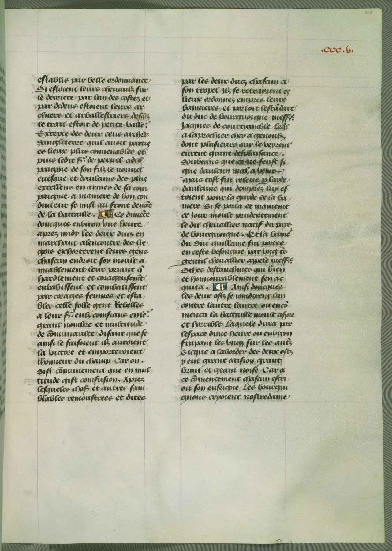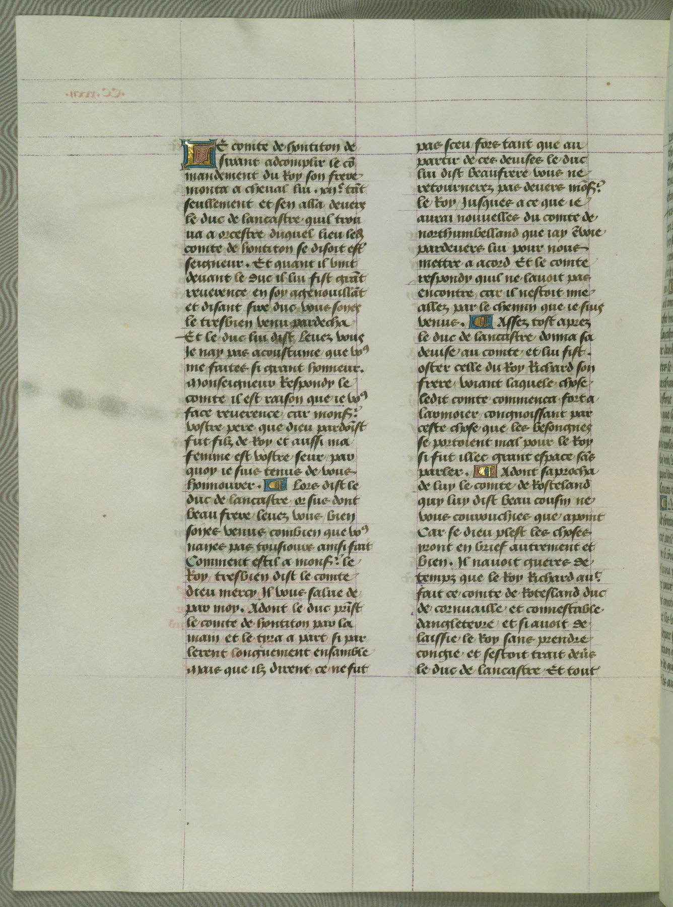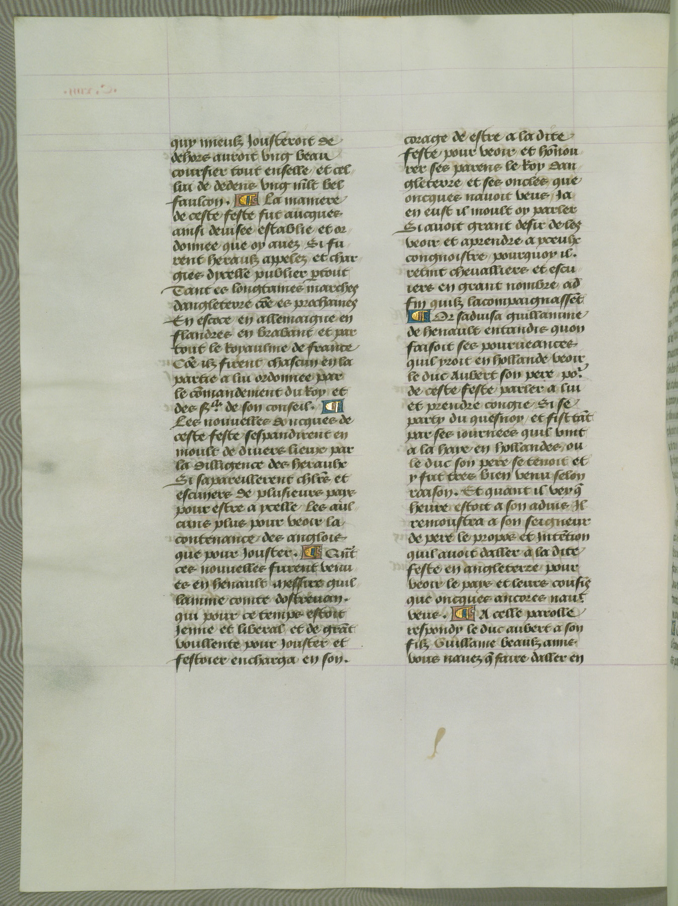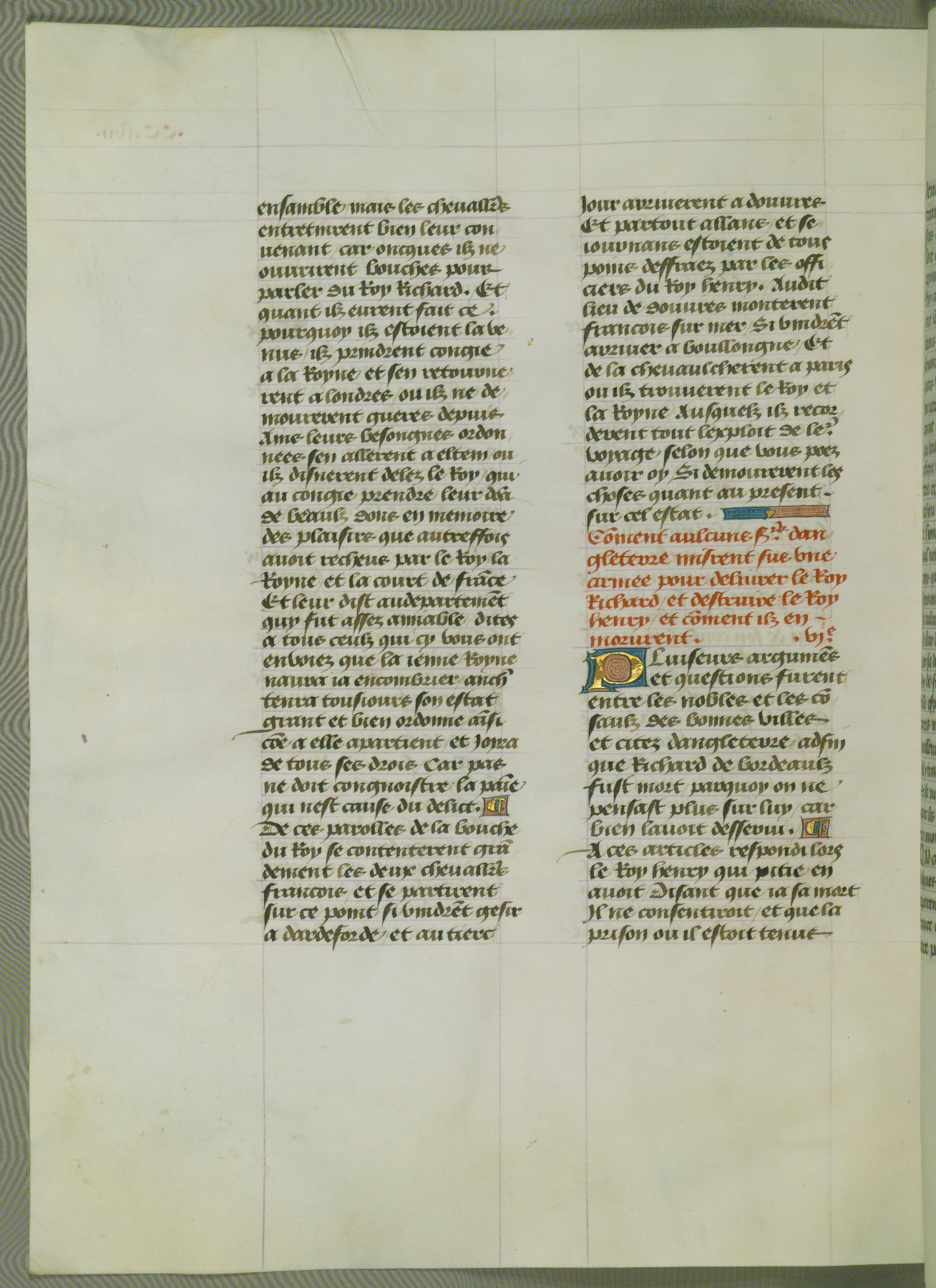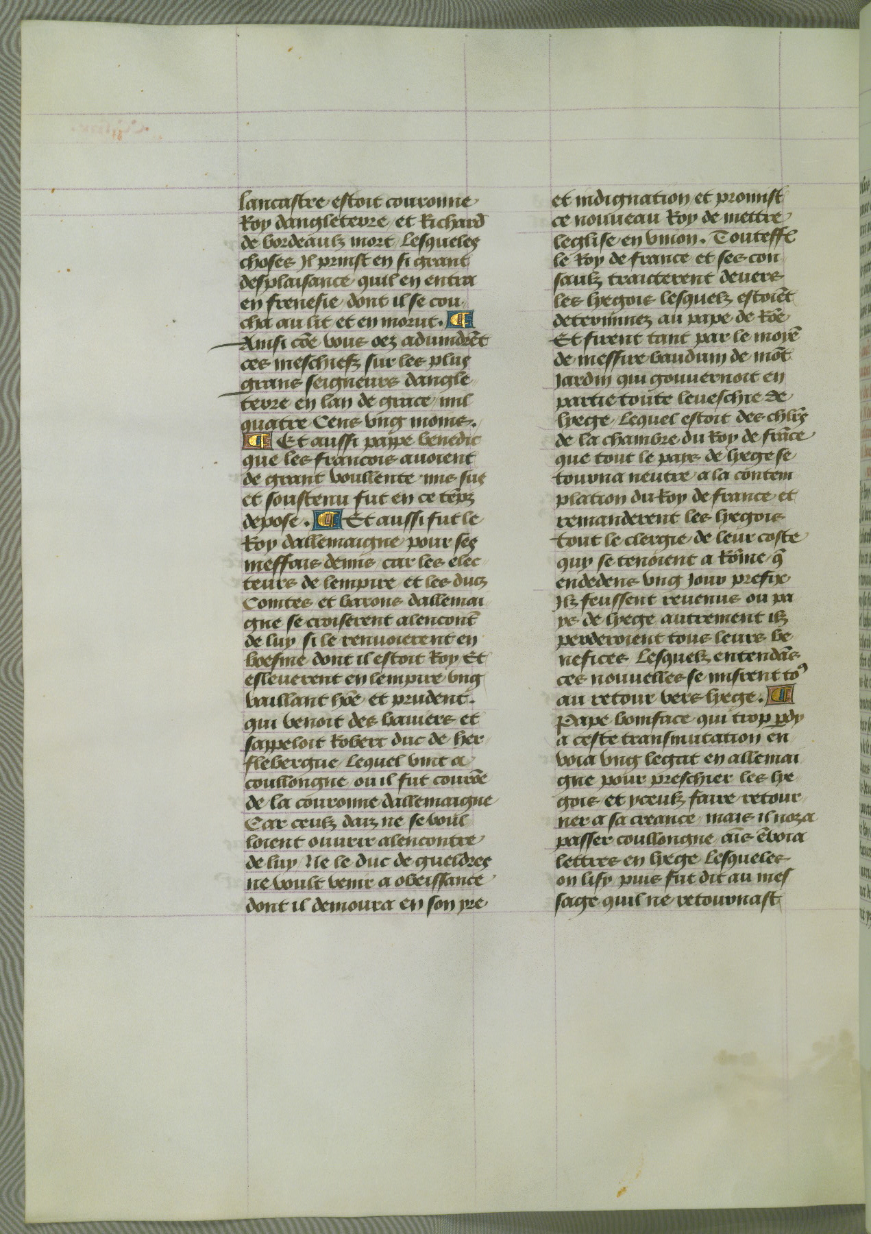 This manuscript is volume IV in a set of five from the collection "Recueil des chroniques et anchiennes istories de la Grant Bretaigne," written by Phillip the Good's counselor and chamberlain Jean de Wavrin. It chronicles the history of England from the early years of the reign of Richard II in 1377 to the demise of Henry IV, his successor, between 1400 and 1413. This volume, produced in Flanders between 1470 and 1480, was part of a set of which volumes II, III and V were recorded in the inventory of the library of William III of Orange in 1686, and was later rebound during the seventeenth or eighteenth century. Six three-quarter-page miniatures open the text of each book and depict events documented therein (with the exception of that of Book 1, portraying Richard II's coronation, which occurs prior to the period detailed in that book). The manuscript's margins are wide and relatively pristine throughout the textblock, but show significant signs of use on illuminated folios, indicating that this manuscript was primarily used for display and not as a historical text. Although few volumes of the Chroniques remain, this manuscript is particularly rare in that it is one of the two surviving exemplars of the text of volume IV, the other being part of the complete set in the Bibliothèque nationale de France (BN fr. 74-85). Volumes II, III, and V of the set to which this volume originally belonged are now in the collection of the Koninklijke Bibliotheek (Den Haag, KB : 133 A 7).