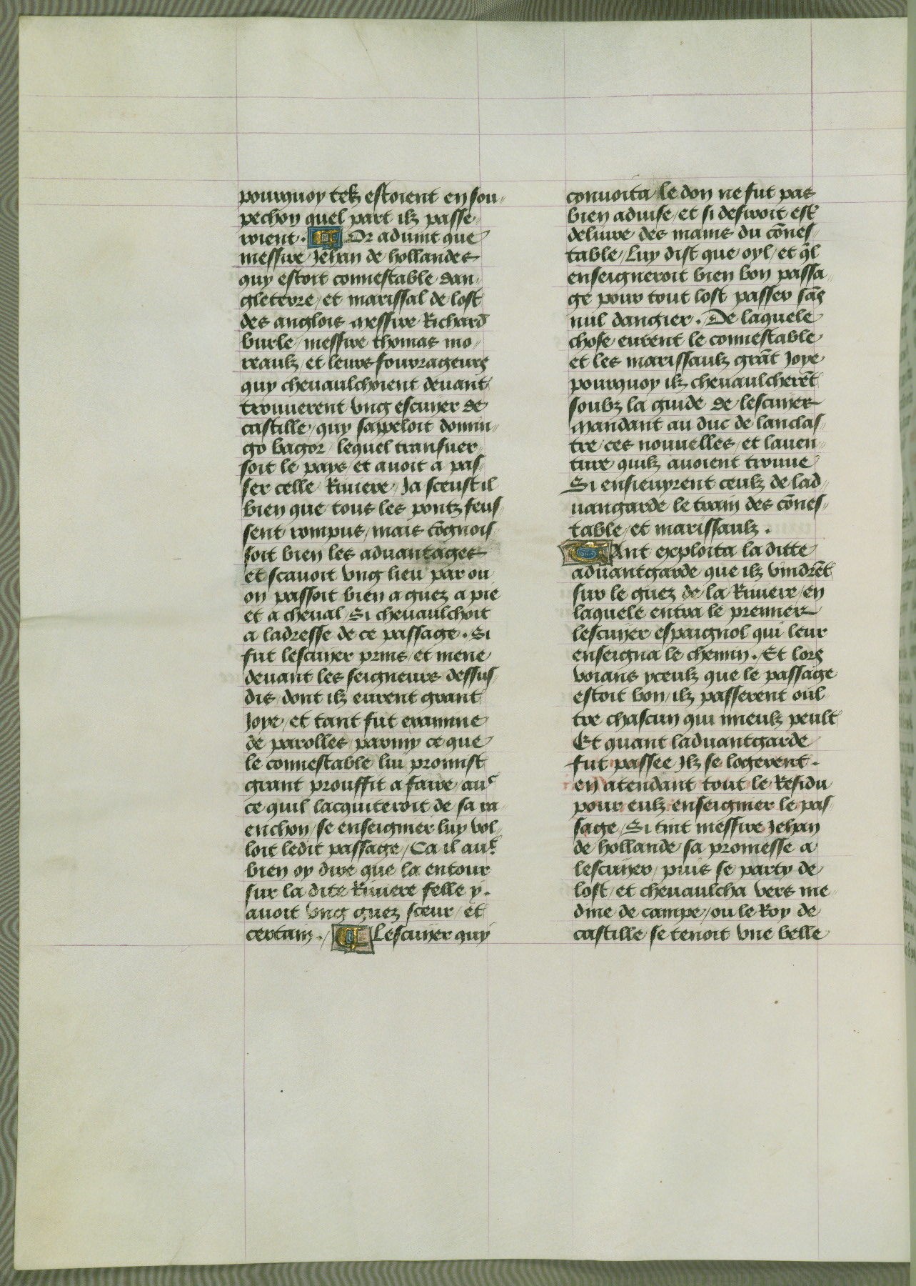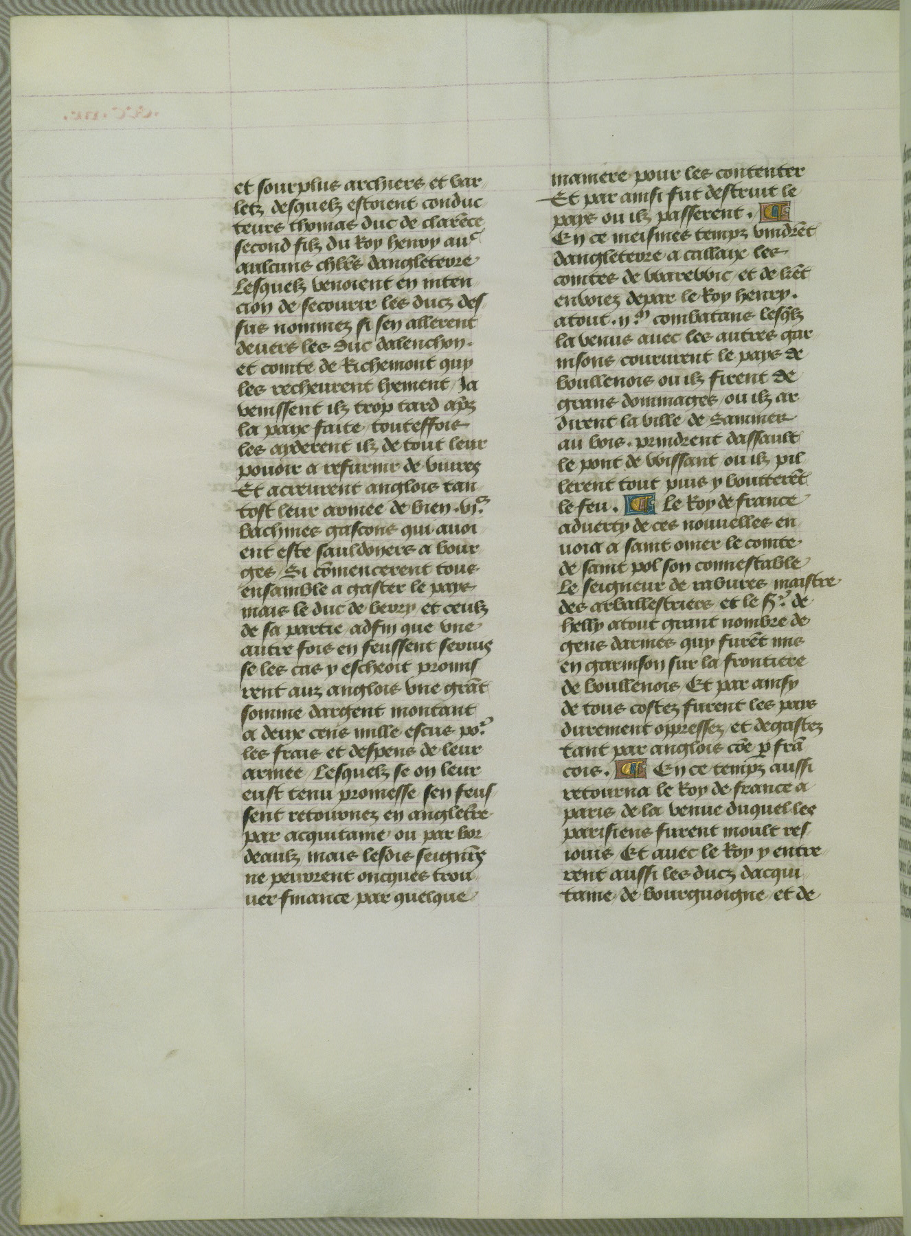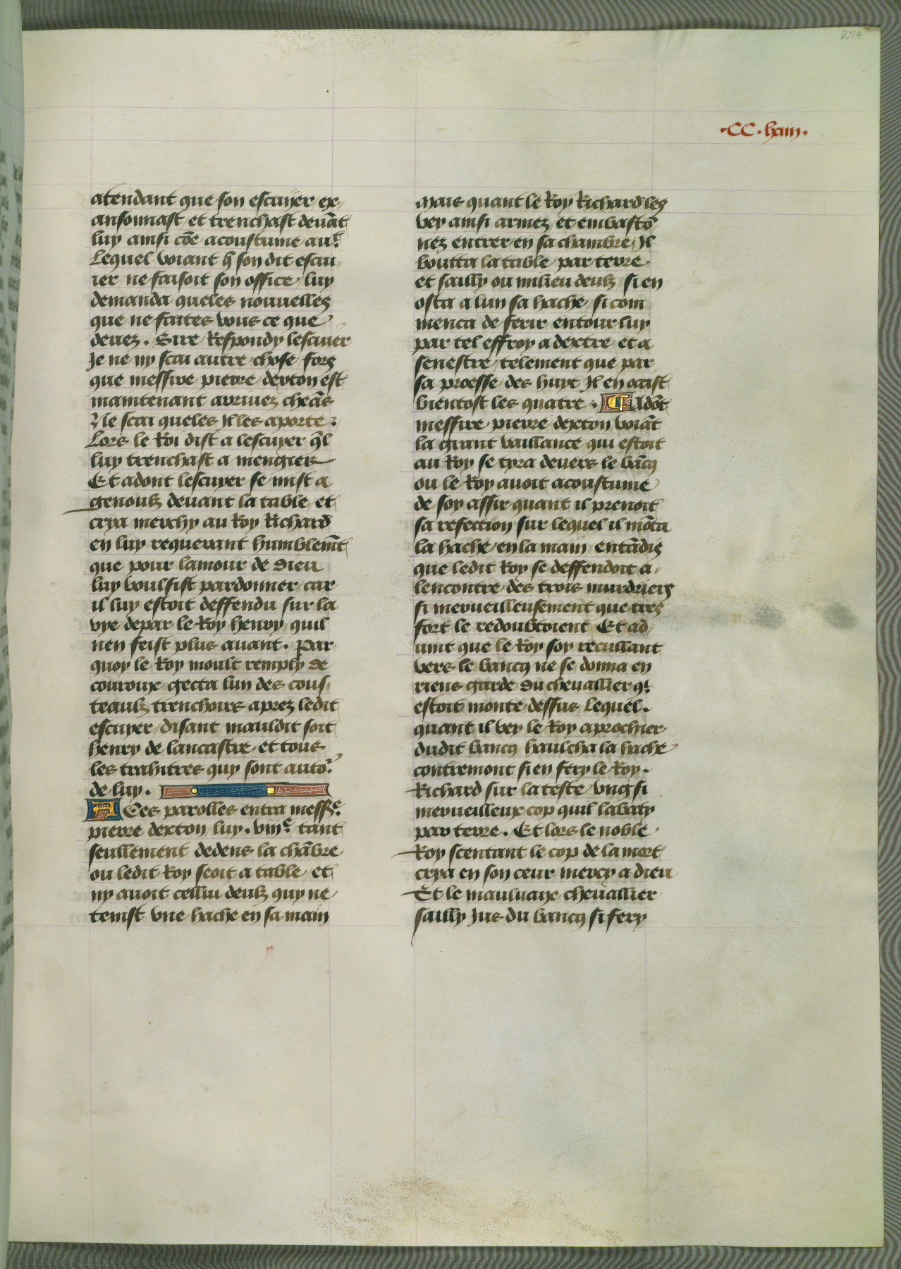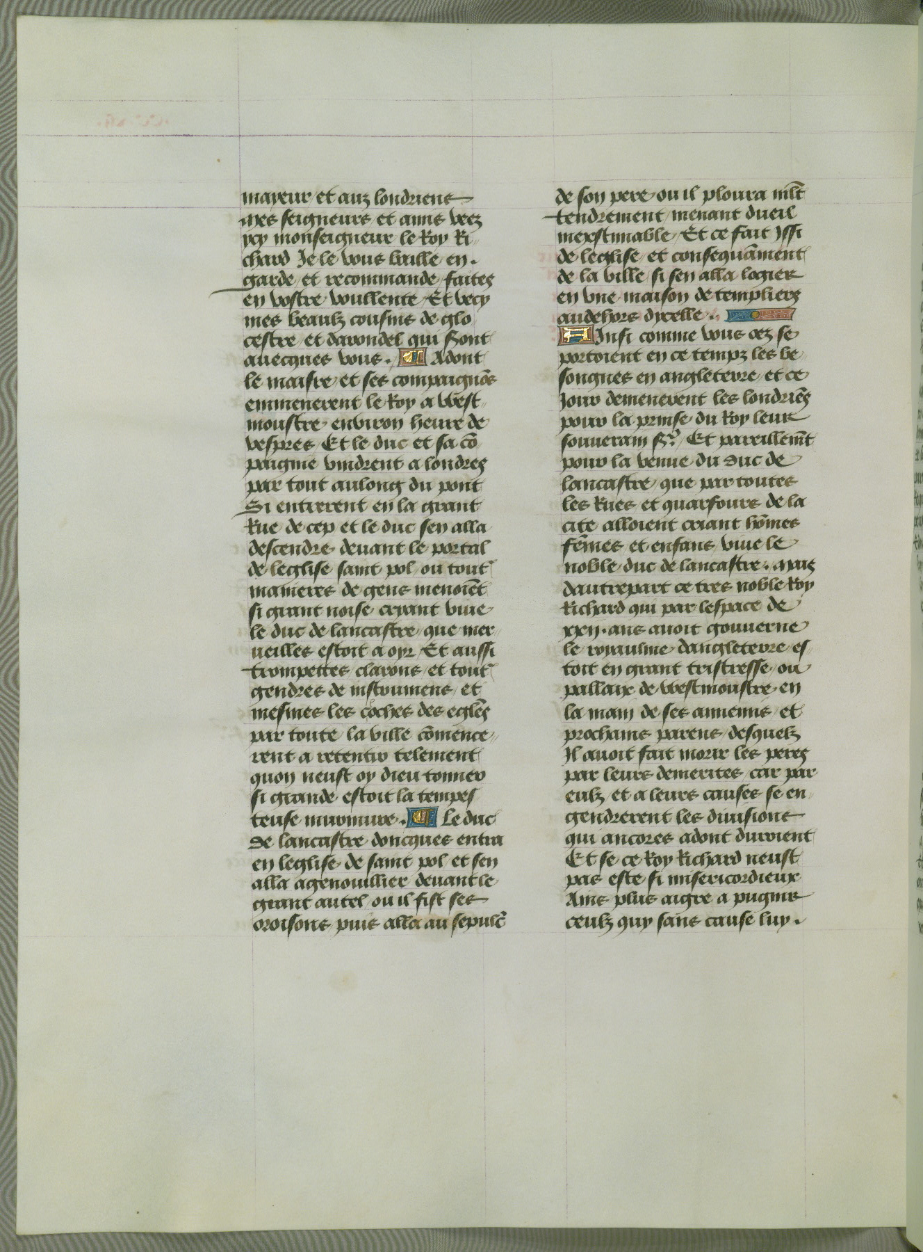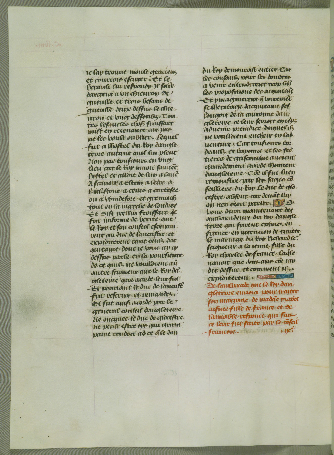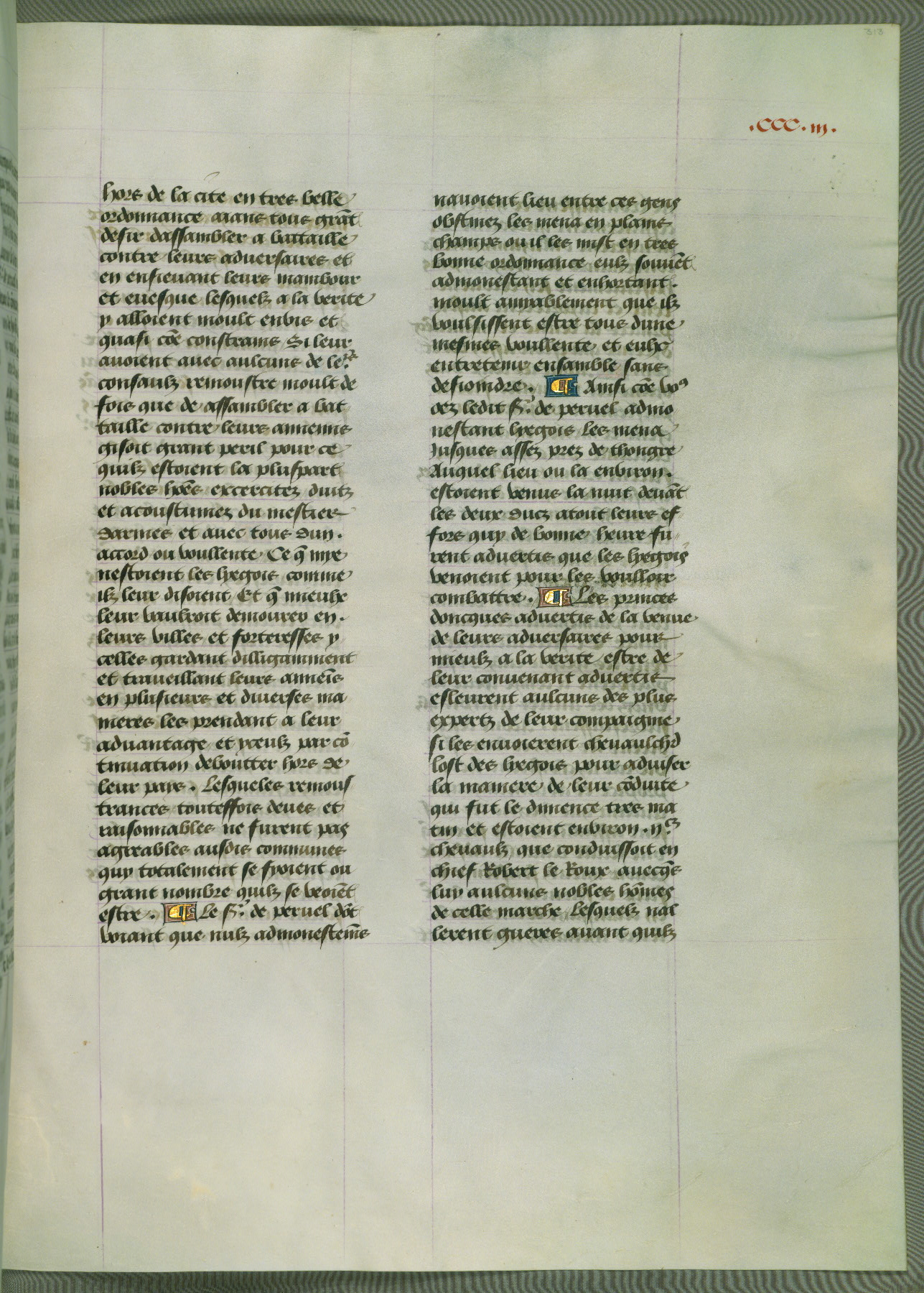 This manuscript is volume IV in a set of five from the collection "Recueil des chroniques et anchiennes istories de la Grant Bretaigne," written by Phillip the Good's counselor and chamberlain Jean de Wavrin. It chronicles the history of England from the early years of the reign of Richard II in 1377 to the demise of Henry IV, his successor, between 1400 and 1413. This volume, produced in Flanders between 1470 and 1480, was part of a set of which volumes II, III and V were recorded in the inventory of the library of William III of Orange in 1686, and was later rebound during the seventeenth or eighteenth century. Six three-quarter-page miniatures open the text of each book and depict events documented therein (with the exception of that of Book 1, portraying Richard II's coronation, which occurs prior to the period detailed in that book). The manuscript's margins are wide and relatively pristine throughout the textblock, but show significant signs of use on illuminated folios, indicating that this manuscript was primarily used for display and not as a historical text. Although few volumes of the Chroniques remain, this manuscript is particularly rare in that it is one of the two surviving exemplars of the text of volume IV, the other being part of the complete set in the Bibliothèque nationale de France (BN fr. 74-85). Volumes II, III, and V of the set to which this volume originally belonged are now in the collection of the Koninklijke Bibliotheek (Den Haag, KB : 133 A 7).