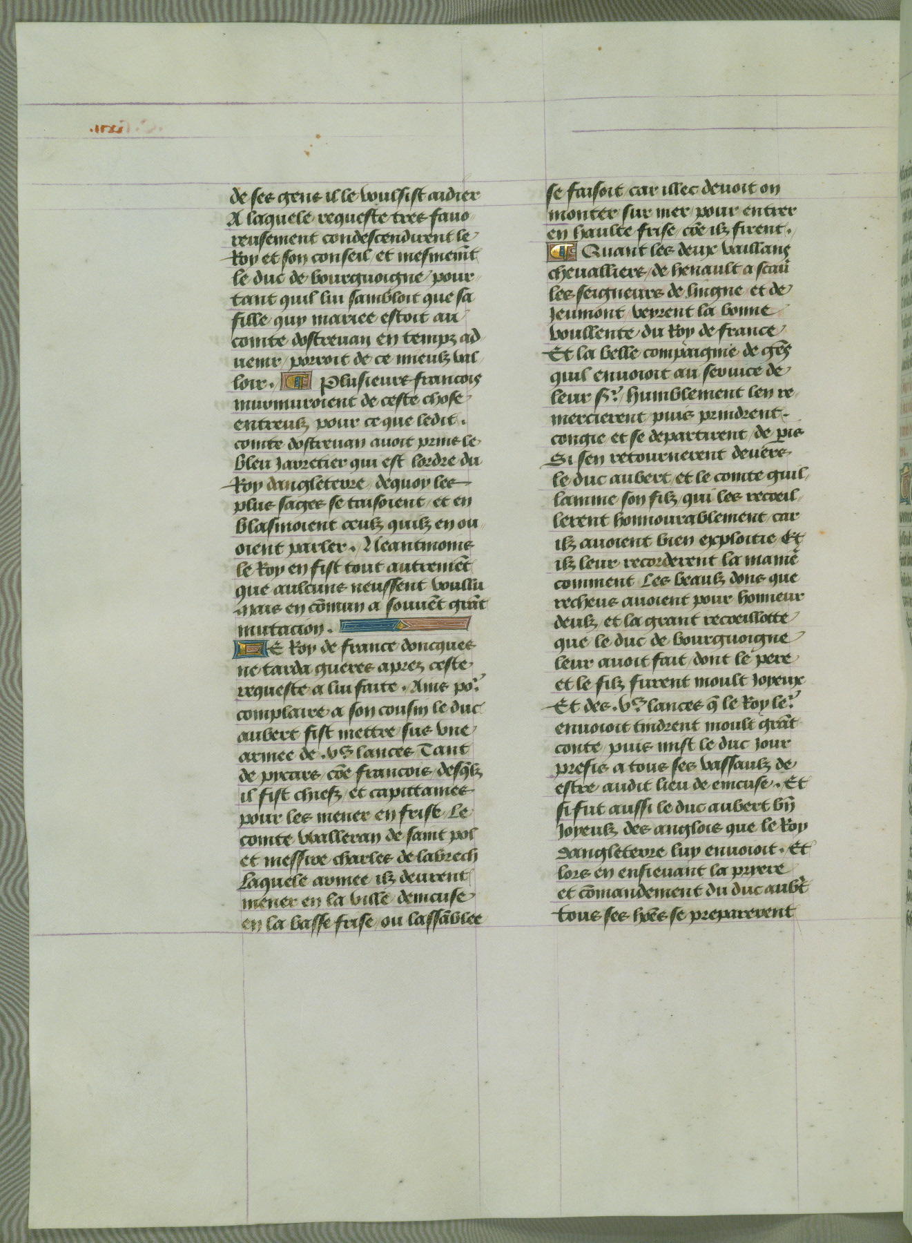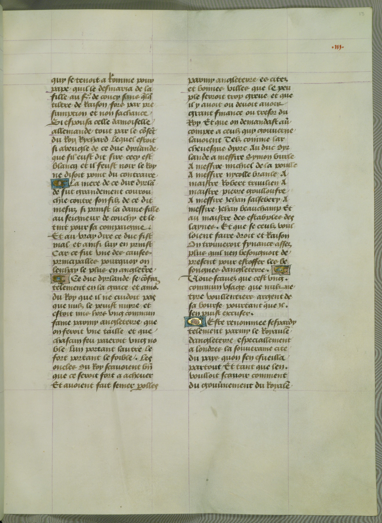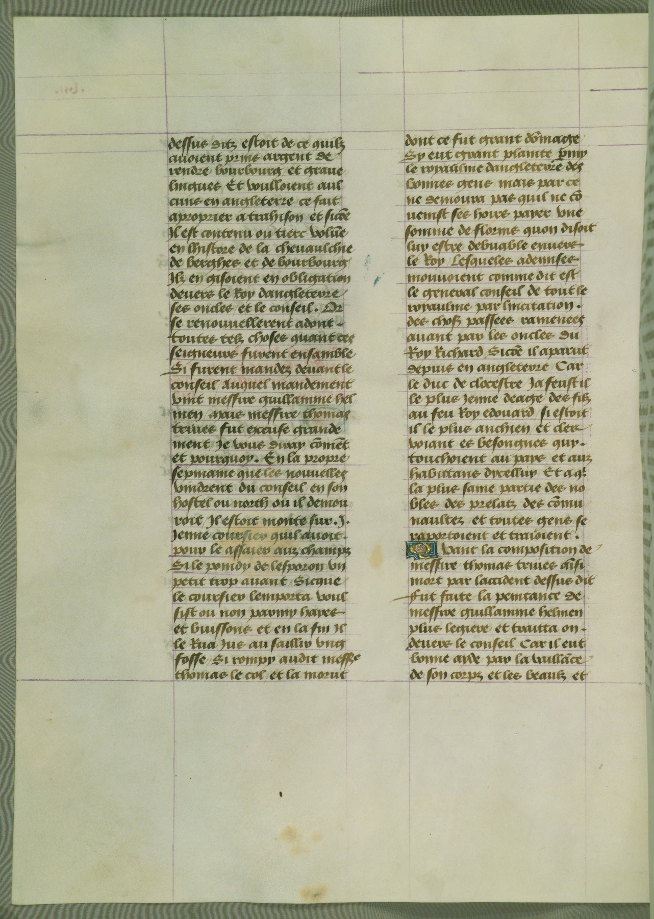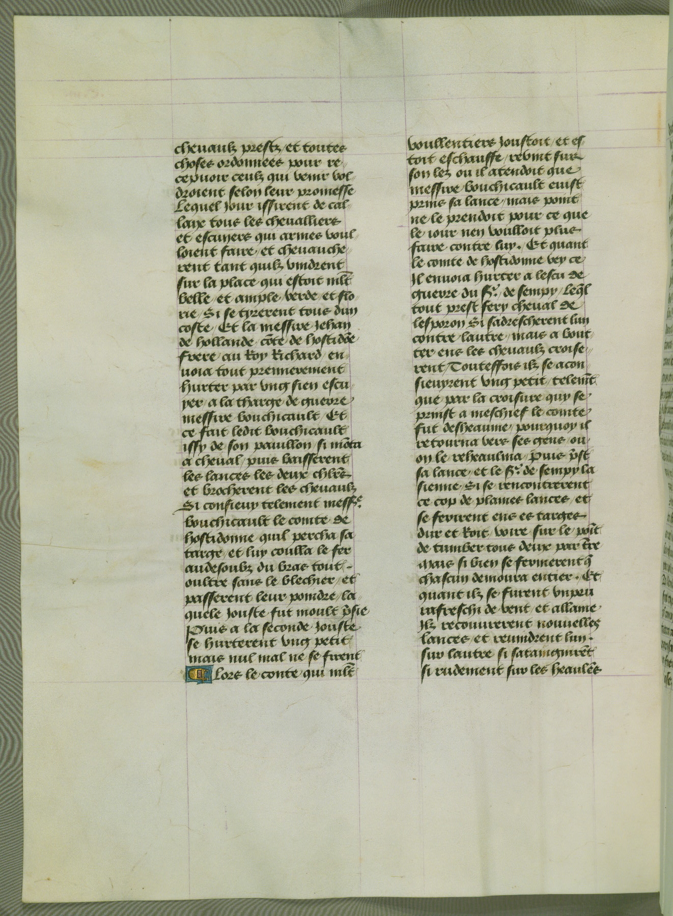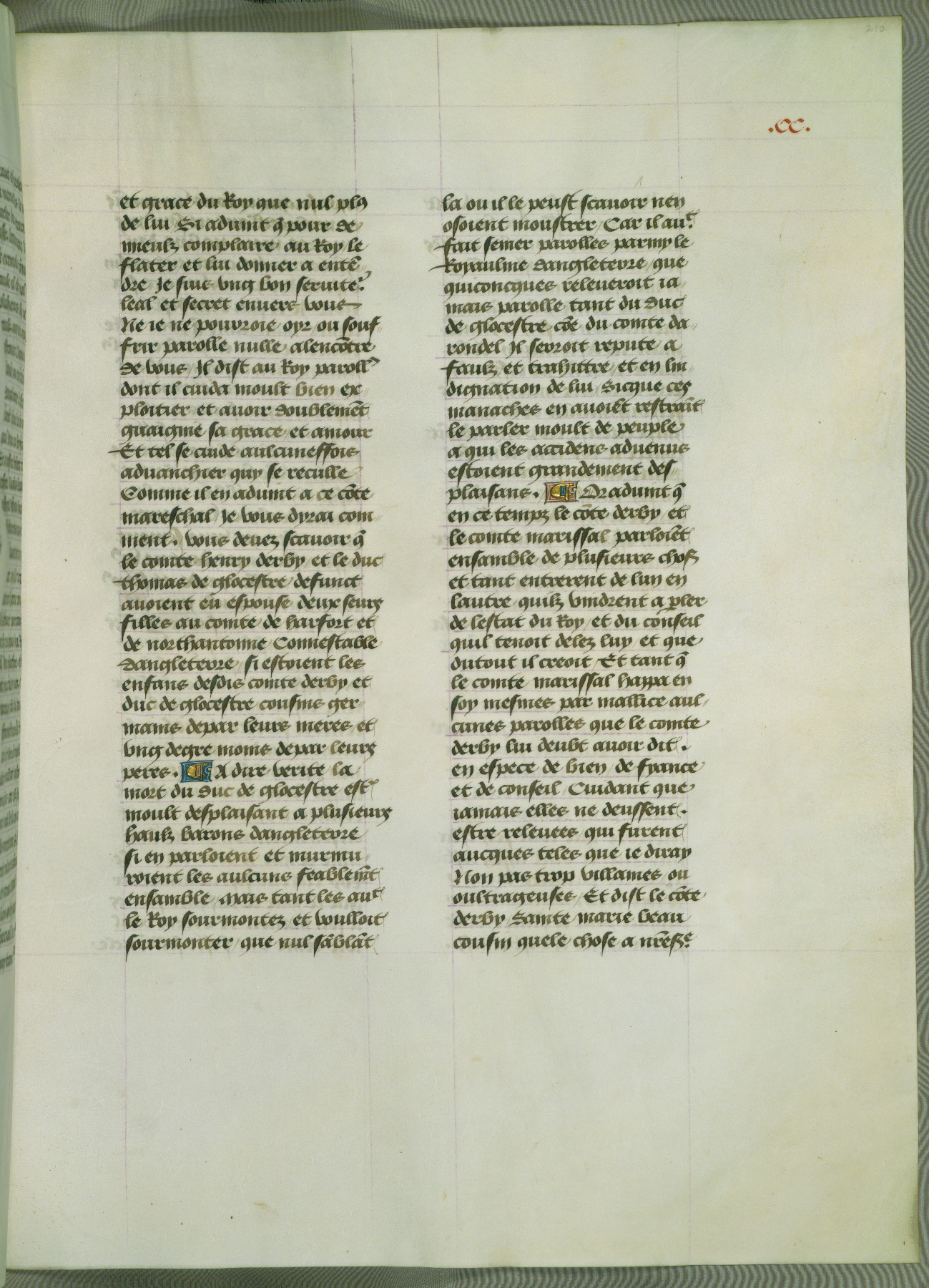This manuscript is volume IV in a set of five from the collection "Recueil des chroniques et anchiennes istories de la Grant Bretaigne," written by Phillip the Good's counselor and chamberlain Jean de Wavrin. It chronicles the history of England from the early years of the reign of Richard II in 1377 to the demise of Henry IV, his successor, between 1400 and 1413. This volume, produced in Flanders between 1470 and 1480, was part of a set of which volumes II, III and V were recorded in the inventory of the library of William III of Orange in 1686, and was later rebound during the seventeenth or eighteenth century. Six three-quarter-page miniatures open the text of each book and depict events documented therein (with the exception of that of Book 1, portraying Richard II's coronation, which occurs prior to the period detailed in that book). The manuscript's margins are wide and relatively pristine throughout the textblock, but show significant signs of use on illuminated folios, indicating that this manuscript was primarily used for display and not as a historical text. Although few volumes of the Chroniques remain, this manuscript is particularly rare in that it is one of the two surviving exemplars of the text of volume IV, the other being part of the complete set in the Bibliothèque nationale de France (BN fr. 74-85). Volumes II, III, and V of the set to which this volume originally belonged are now in the collection of the Koninklijke Bibliotheek (Den Haag, KB : 133 A 7).