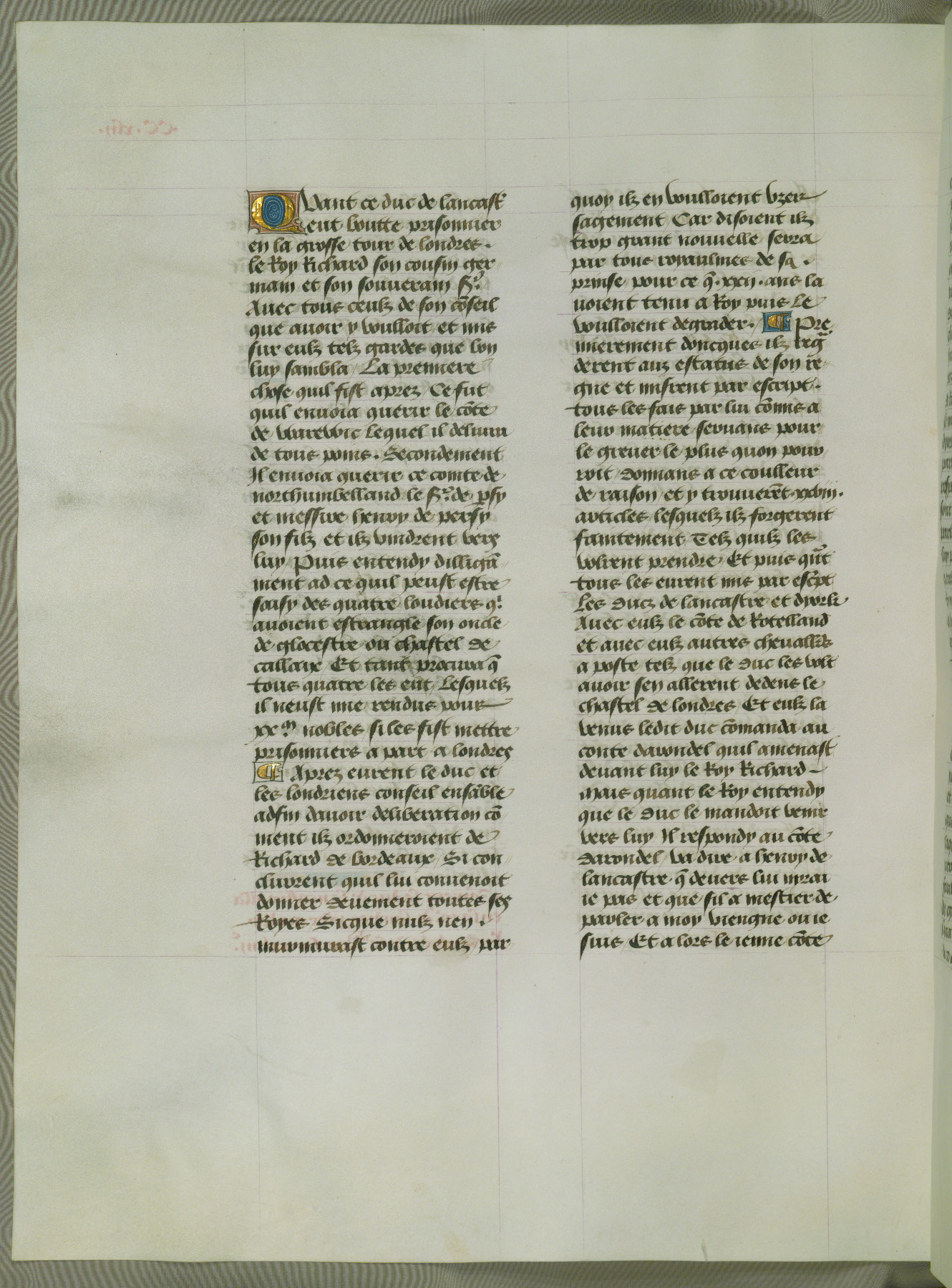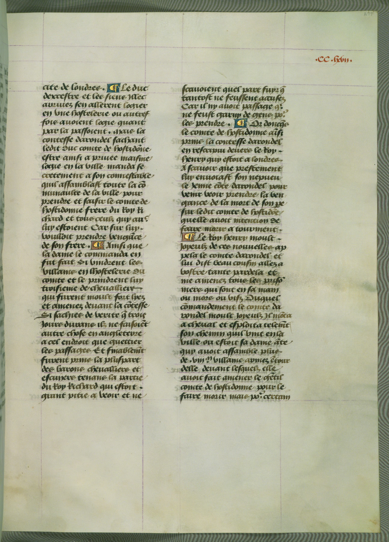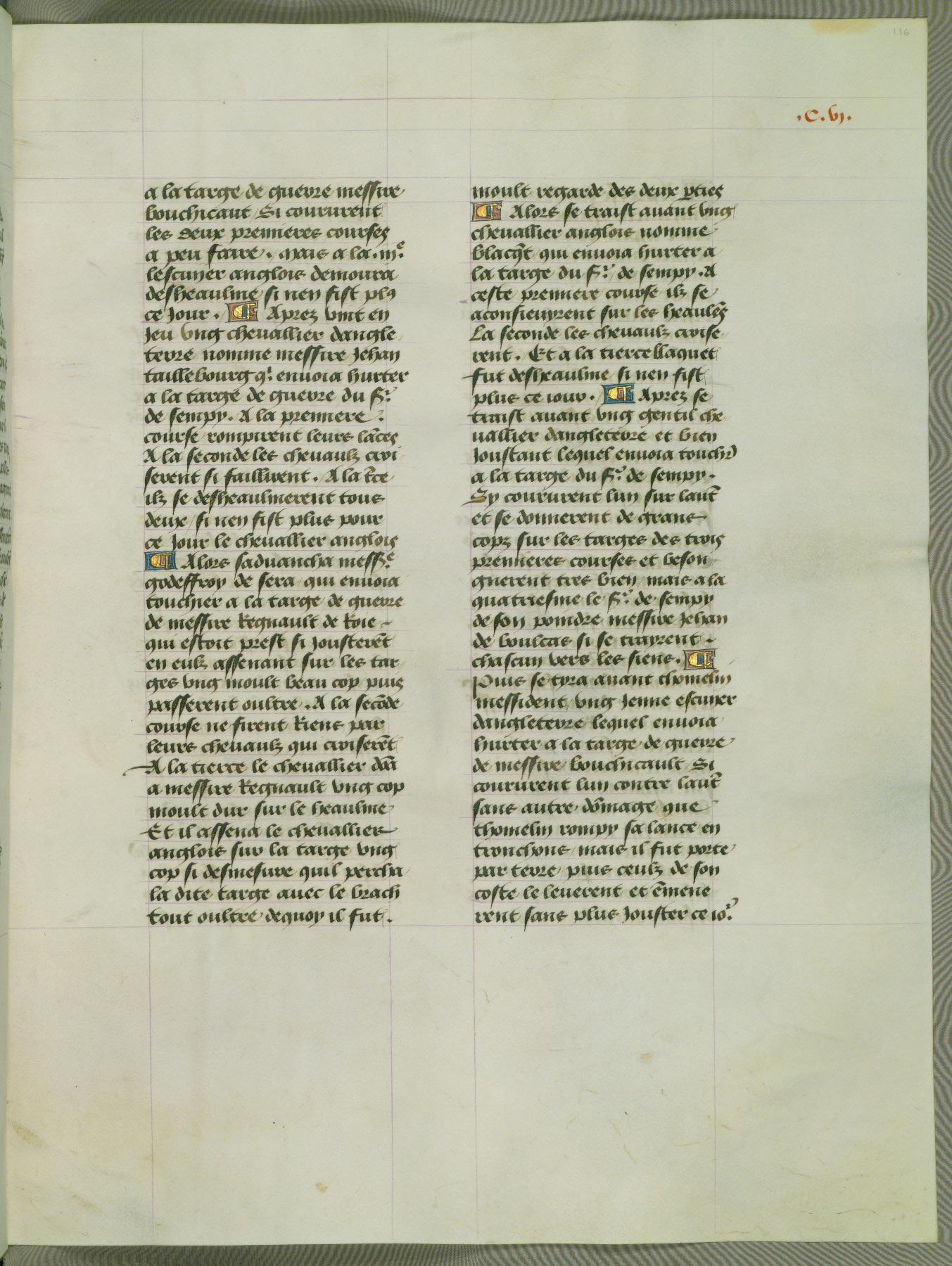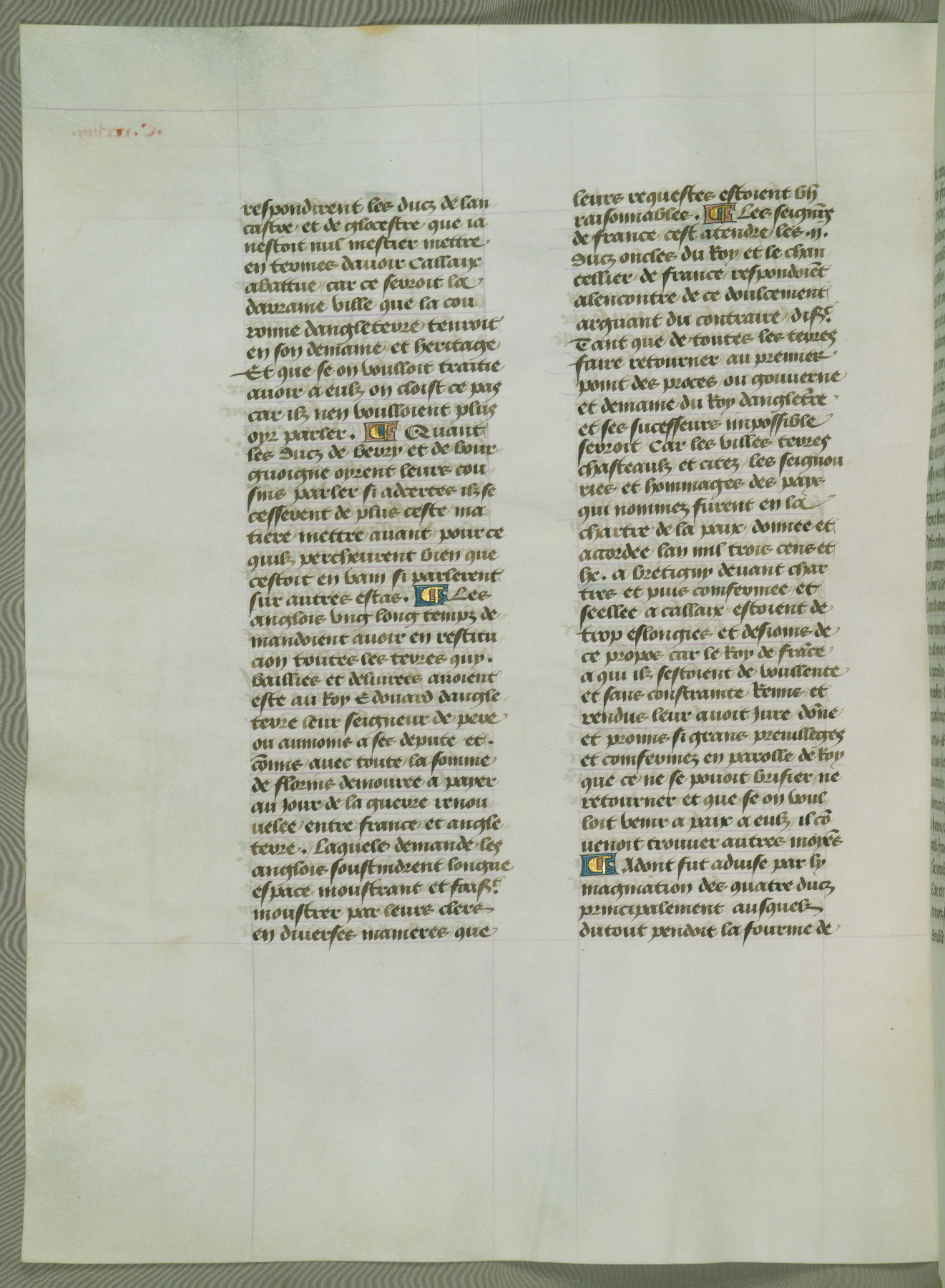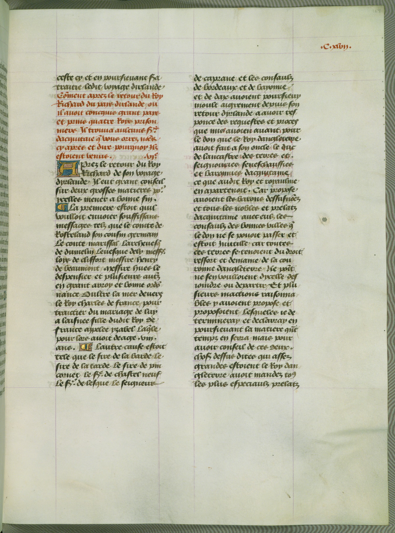 This manuscript is volume IV in a set of five from the collection "Recueil des chroniques et anchiennes istories de la Grant Bretaigne," written by Phillip the Good's counselor and chamberlain Jean de Wavrin. It chronicles the history of England from the early years of the reign of Richard II in 1377 to the demise of Henry IV, his successor, between 1400 and 1413. This volume, produced in Flanders between 1470 and 1480, was part of a set of which volumes II, III and V were recorded in the inventory of the library of William III of Orange in 1686, and was later rebound during the seventeenth or eighteenth century. Six three-quarter-page miniatures open the text of each book and depict events documented therein (with the exception of that of Book 1, portraying Richard II's coronation, which occurs prior to the period detailed in that book). The manuscript's margins are wide and relatively pristine throughout the textblock, but show significant signs of use on illuminated folios, indicating that this manuscript was primarily used for display and not as a historical text. Although few volumes of the Chroniques remain, this manuscript is particularly rare in that it is one of the two surviving exemplars of the text of volume IV, the other being part of the complete set in the Bibliothèque nationale de France (BN fr. 74-85). Volumes II, III, and V of the set to which this volume originally belonged are now in the collection of the Koninklijke Bibliotheek (Den Haag, KB : 133 A 7).