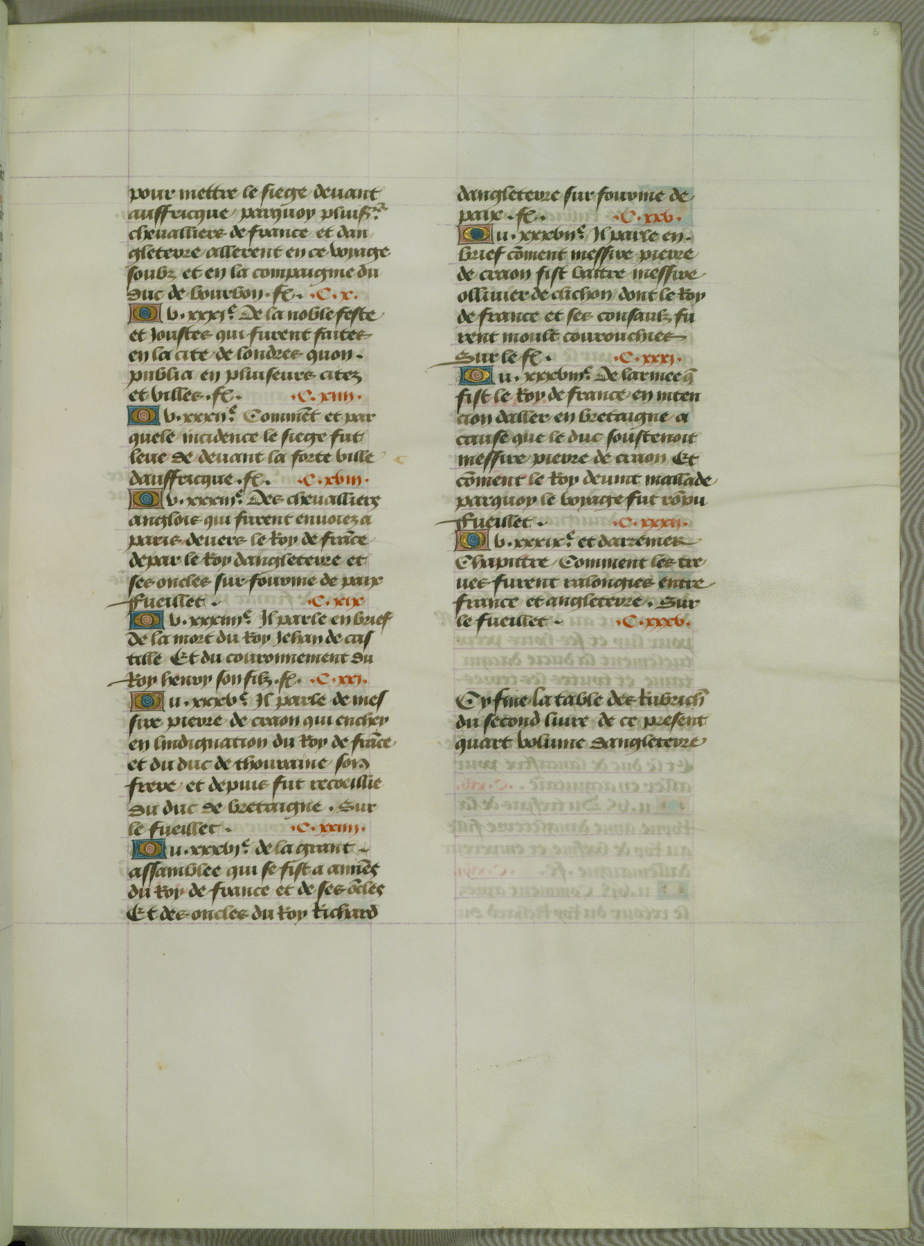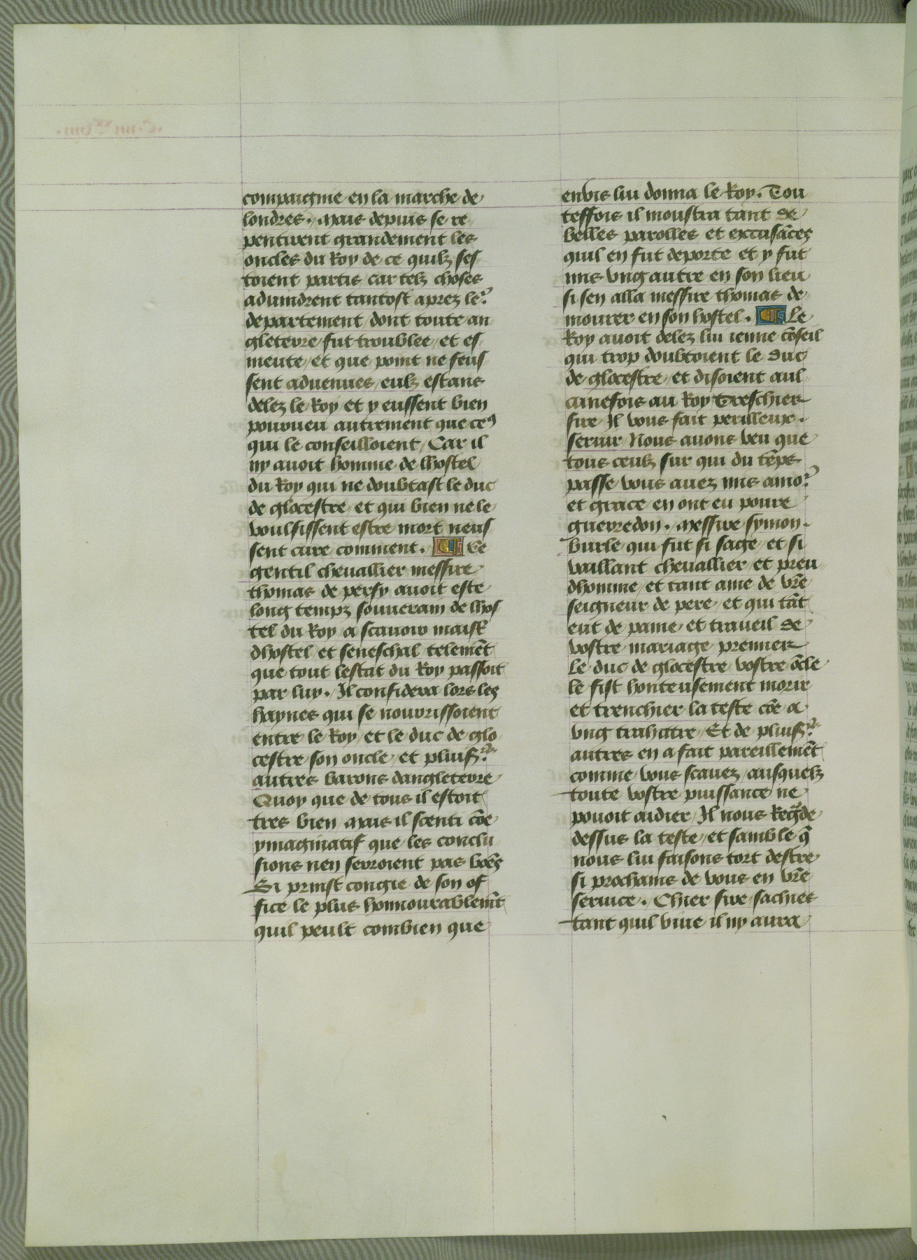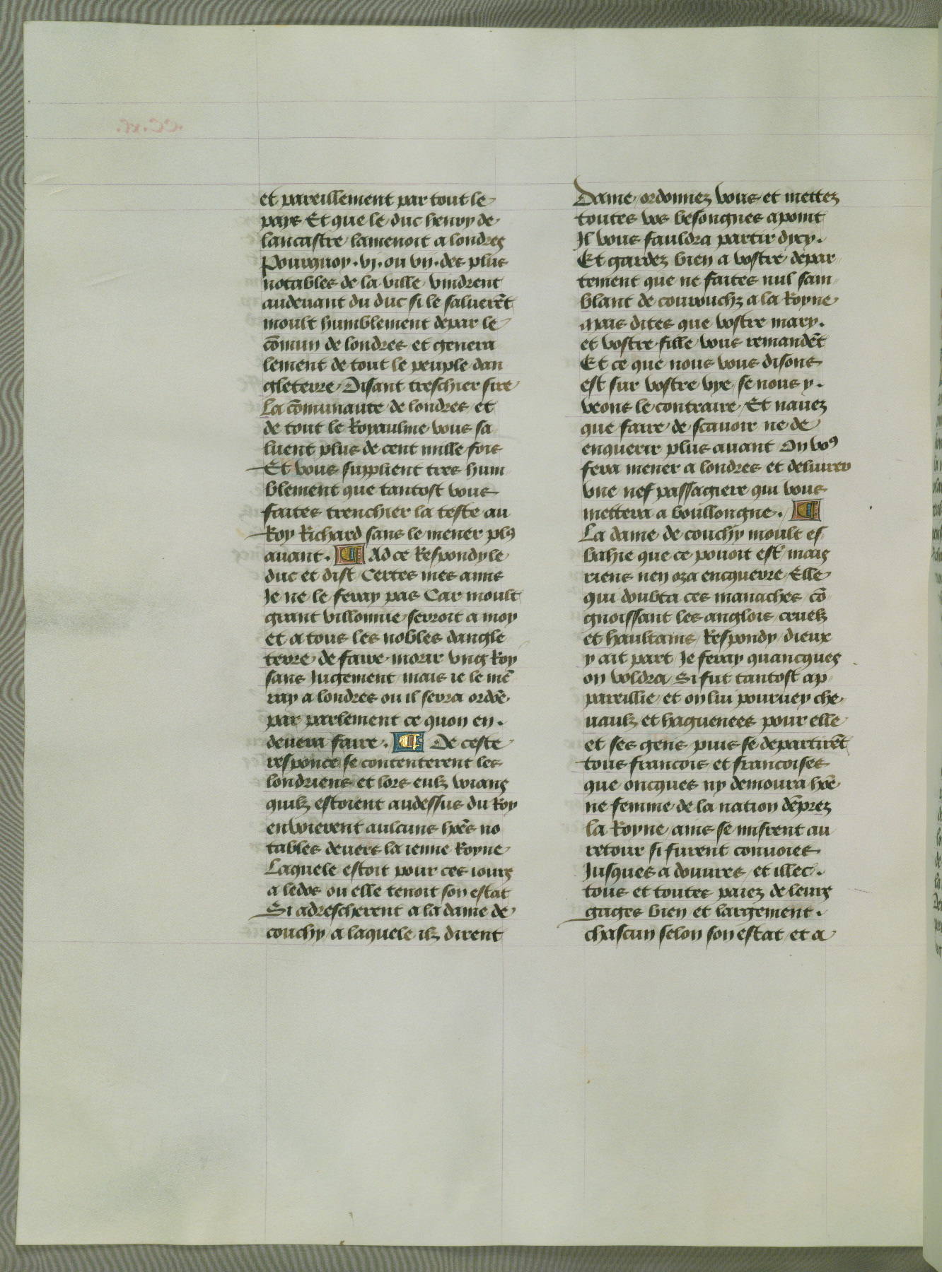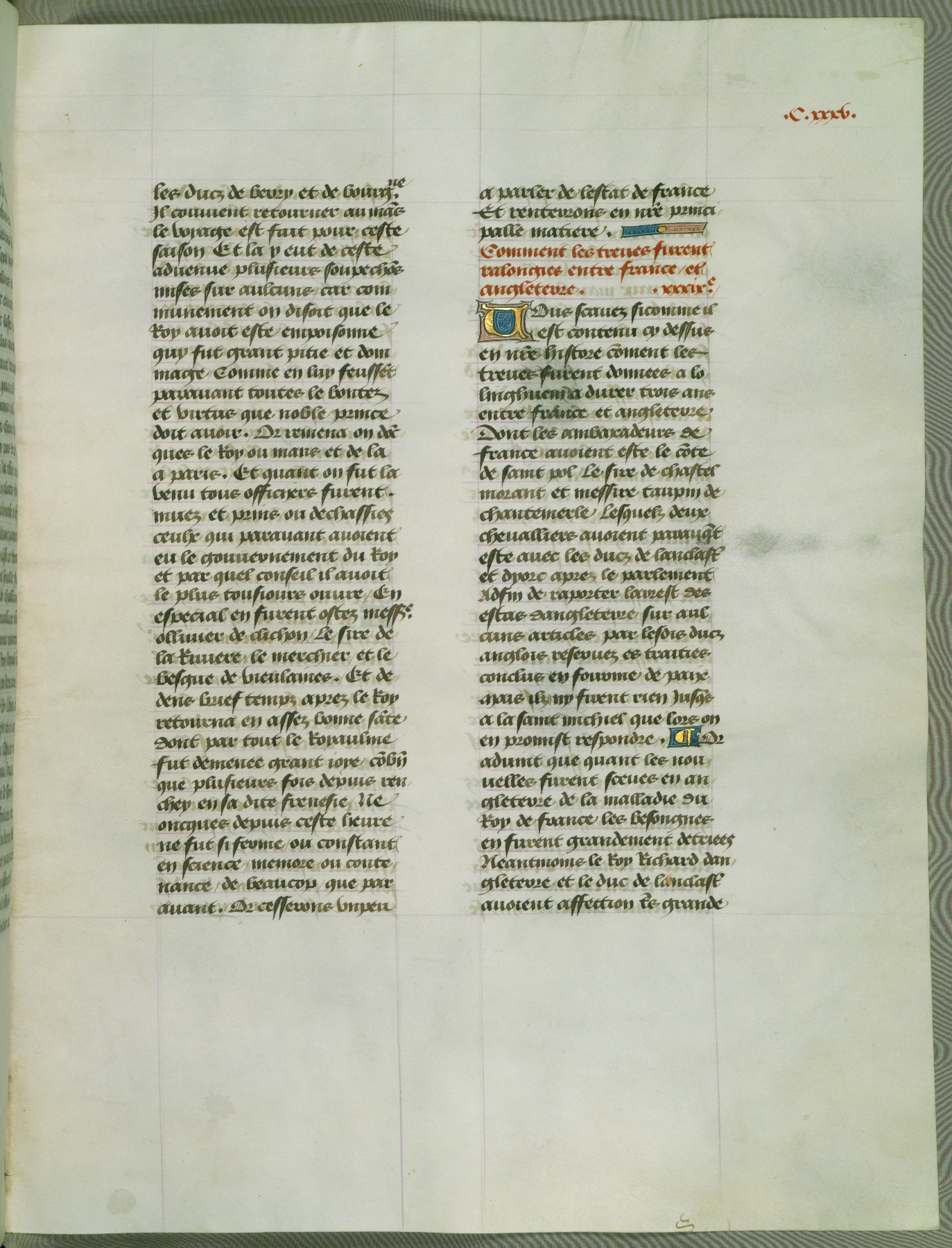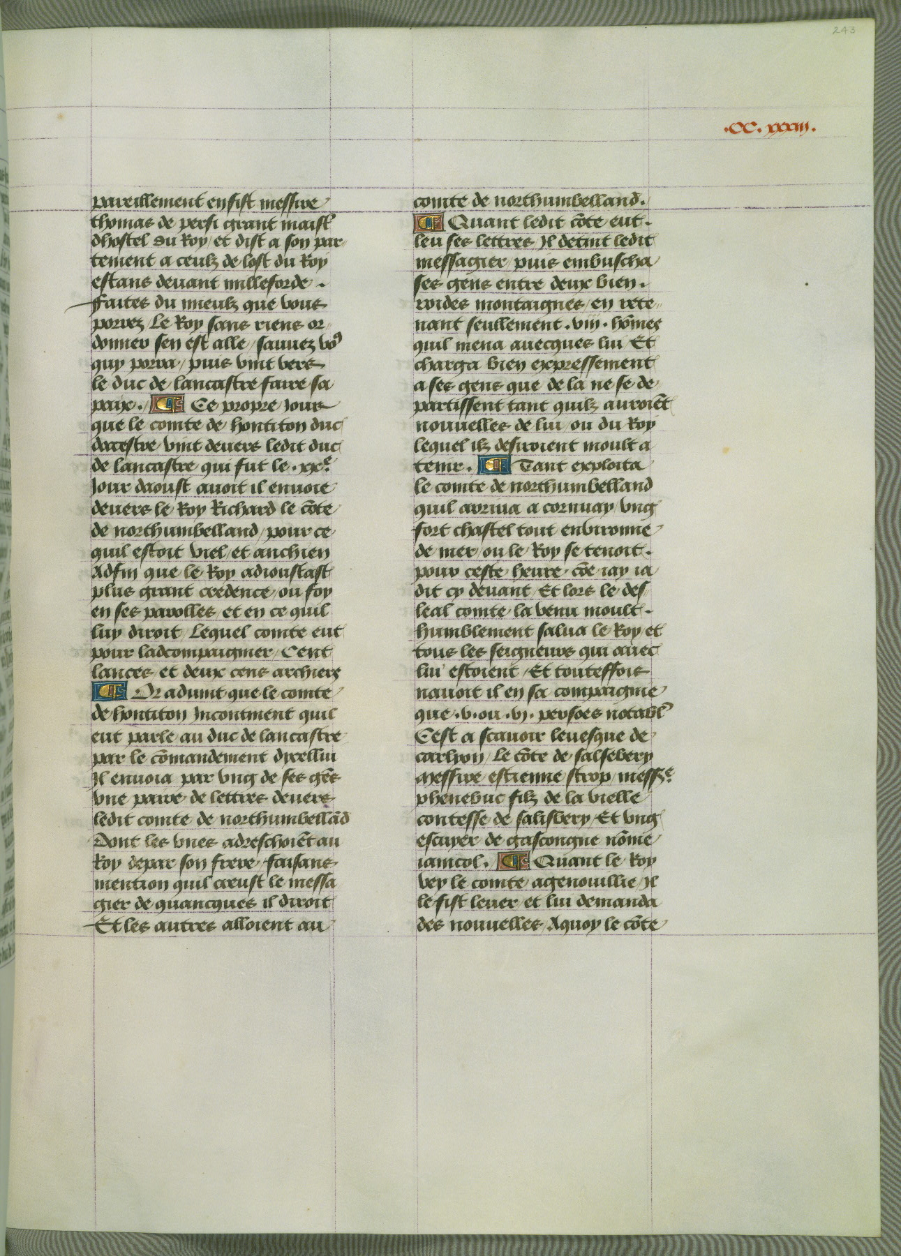 This manuscript is volume IV in a set of five from the collection "Recueil des chroniques et anchiennes istories de la Grant Bretaigne," written by Phillip the Good's counselor and chamberlain Jean de Wavrin. It chronicles the history of England from the early years of the reign of Richard II in 1377 to the demise of Henry IV, his successor, between 1400 and 1413. This volume, produced in Flanders between 1470 and 1480, was part of a set of which volumes II, III and V were recorded in the inventory of the library of William III of Orange in 1686, and was later rebound during the seventeenth or eighteenth century. Six three-quarter-page miniatures open the text of each book and depict events documented therein (with the exception of that of Book 1, portraying Richard II's coronation, which occurs prior to the period detailed in that book). The manuscript's margins are wide and relatively pristine throughout the textblock, but show significant signs of use on illuminated folios, indicating that this manuscript was primarily used for display and not as a historical text. Although few volumes of the Chroniques remain, this manuscript is particularly rare in that it is one of the two surviving exemplars of the text of volume IV, the other being part of the complete set in the Bibliothèque nationale de France (BN fr. 74-85). Volumes II, III, and V of the set to which this volume originally belonged are now in the collection of the Koninklijke Bibliotheek (Den Haag, KB : 133 A 7).