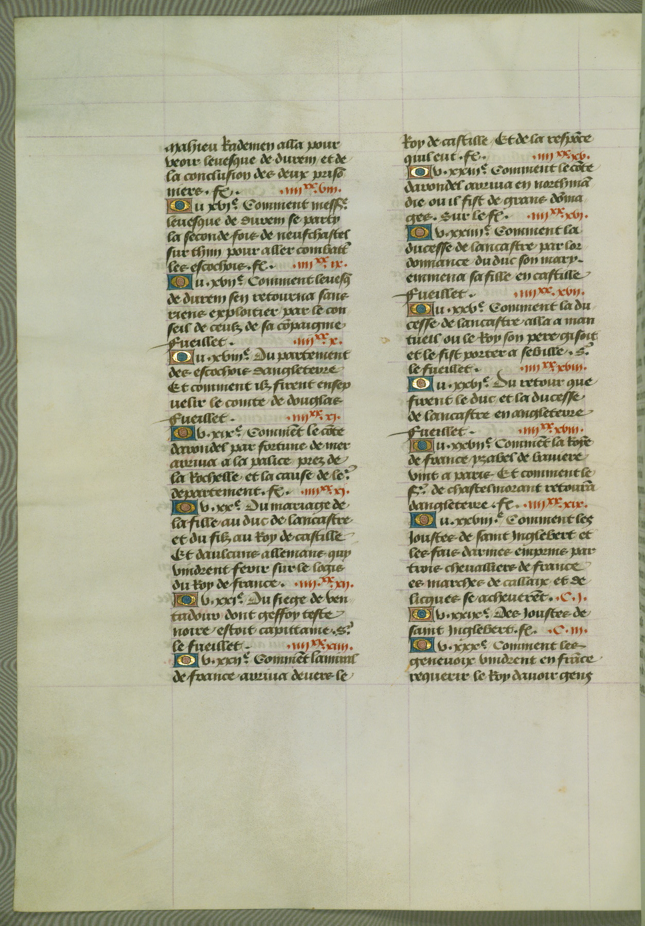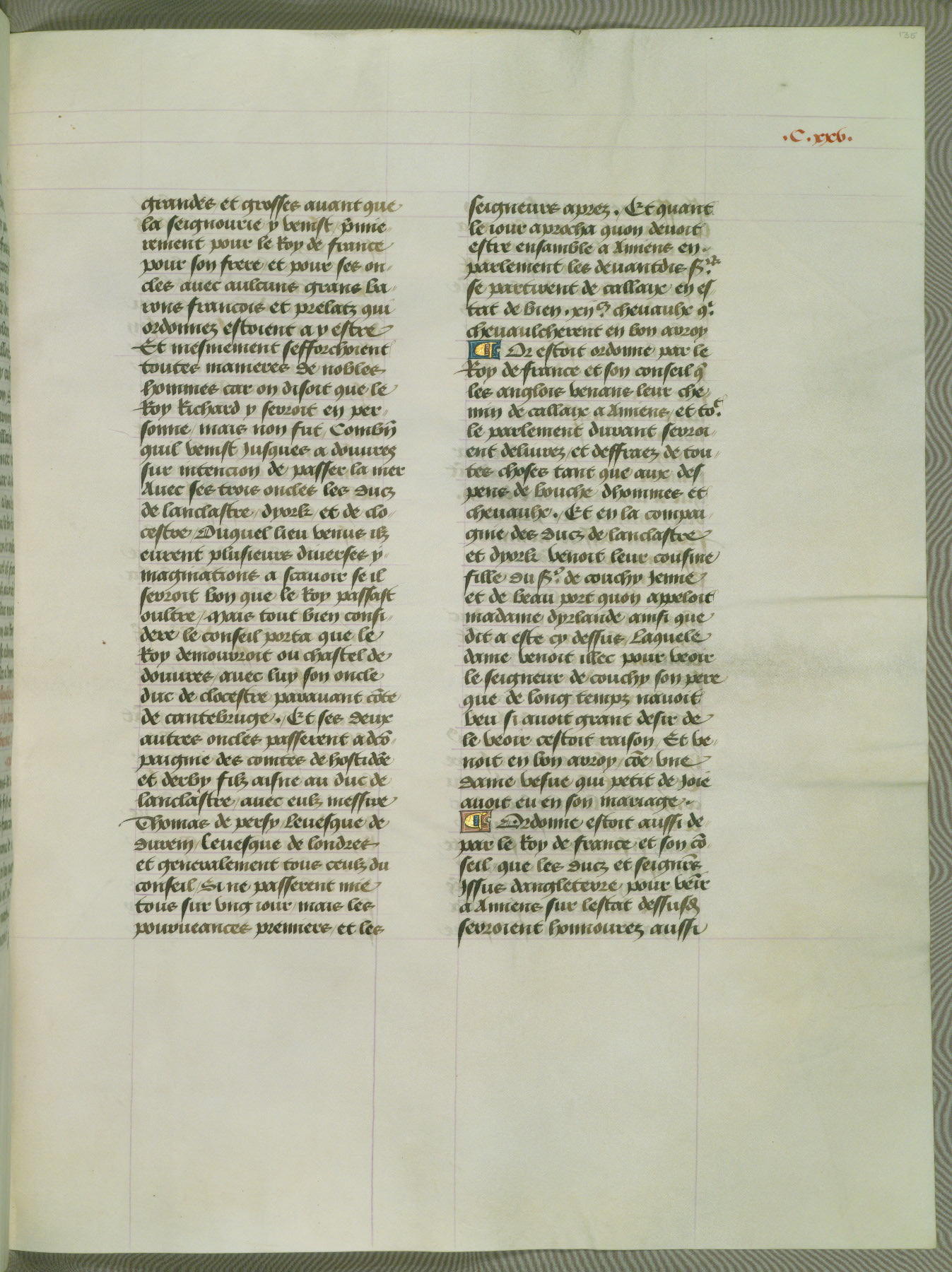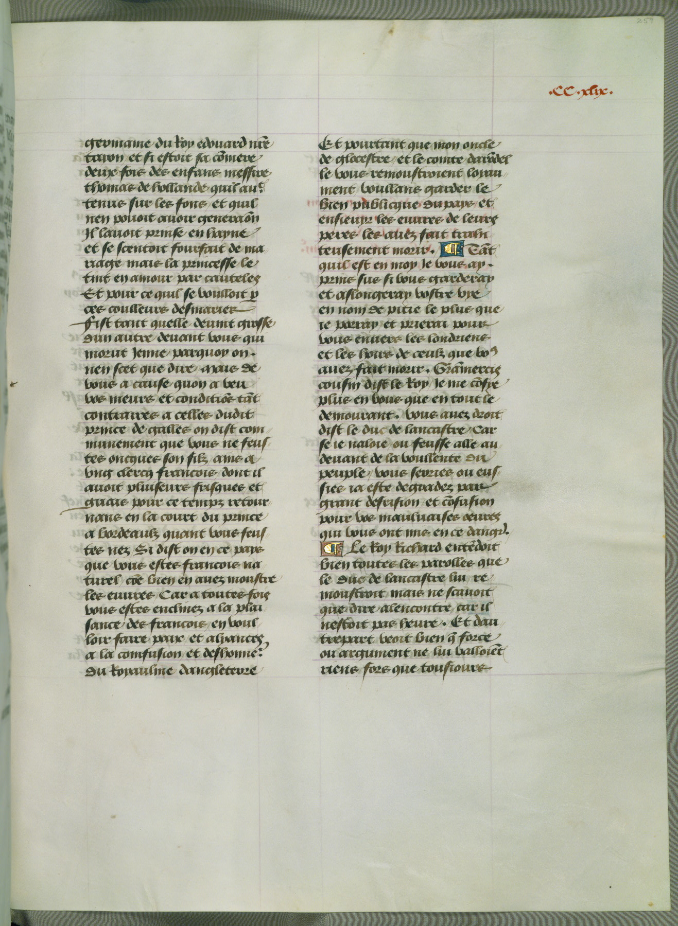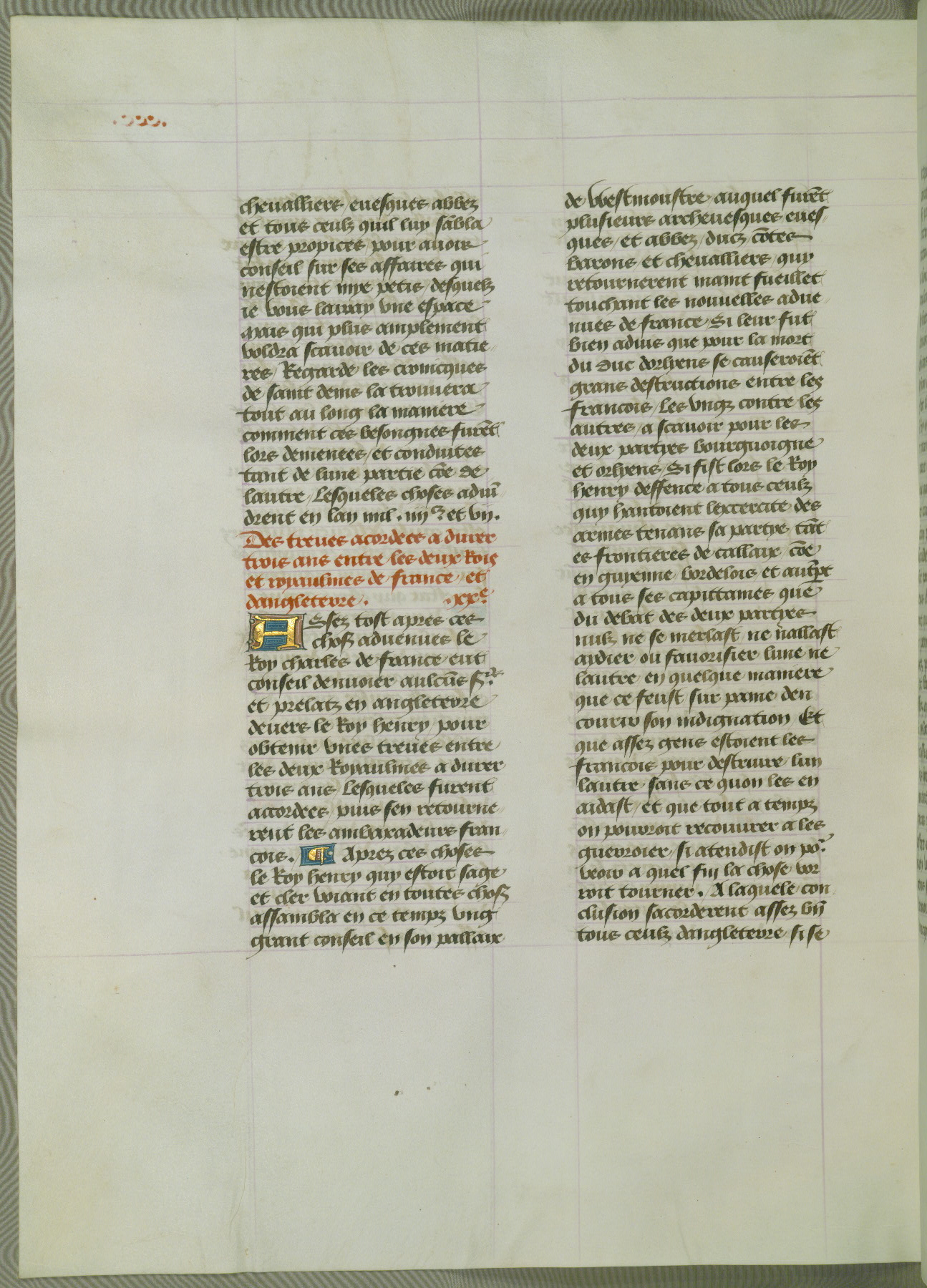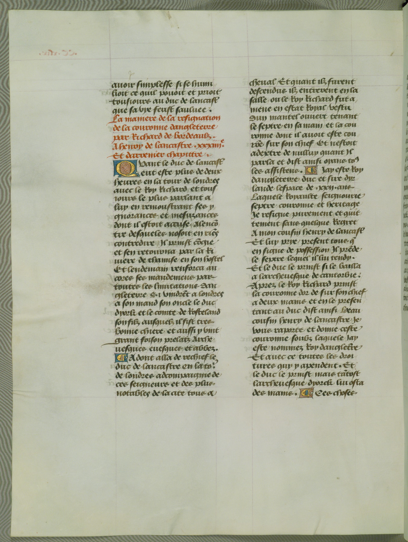 This manuscript is volume IV in a set of five from the collection "Recueil des chroniques et anchiennes istories de la Grant Bretaigne," written by Phillip the Good's counselor and chamberlain Jean de Wavrin. It chronicles the history of England from the early years of the reign of Richard II in 1377 to the demise of Henry IV, his successor, between 1400 and 1413. This volume, produced in Flanders between 1470 and 1480, was part of a set of which volumes II, III and V were recorded in the inventory of the library of William III of Orange in 1686, and was later rebound during the seventeenth or eighteenth century. Six three-quarter-page miniatures open the text of each book and depict events documented therein (with the exception of that of Book 1, portraying Richard II's coronation, which occurs prior to the period detailed in that book). The manuscript's margins are wide and relatively pristine throughout the textblock, but show significant signs of use on illuminated folios, indicating that this manuscript was primarily used for display and not as a historical text. Although few volumes of the Chroniques remain, this manuscript is particularly rare in that it is one of the two surviving exemplars of the text of volume IV, the other being part of the complete set in the Bibliothèque nationale de France (BN fr. 74-85). Volumes II, III, and V of the set to which this volume originally belonged are now in the collection of the Koninklijke Bibliotheek (Den Haag, KB : 133 A 7).