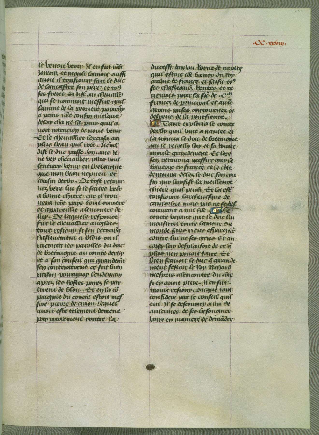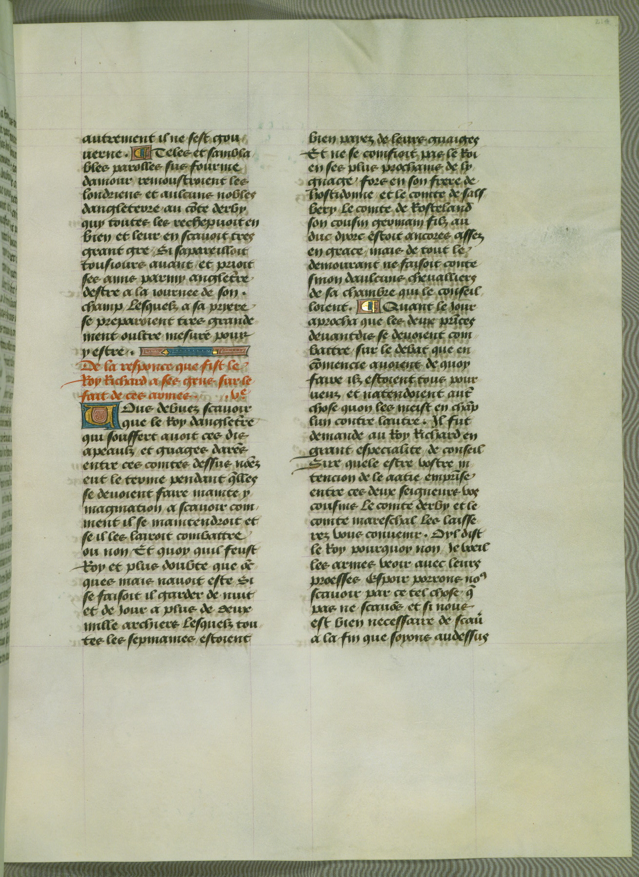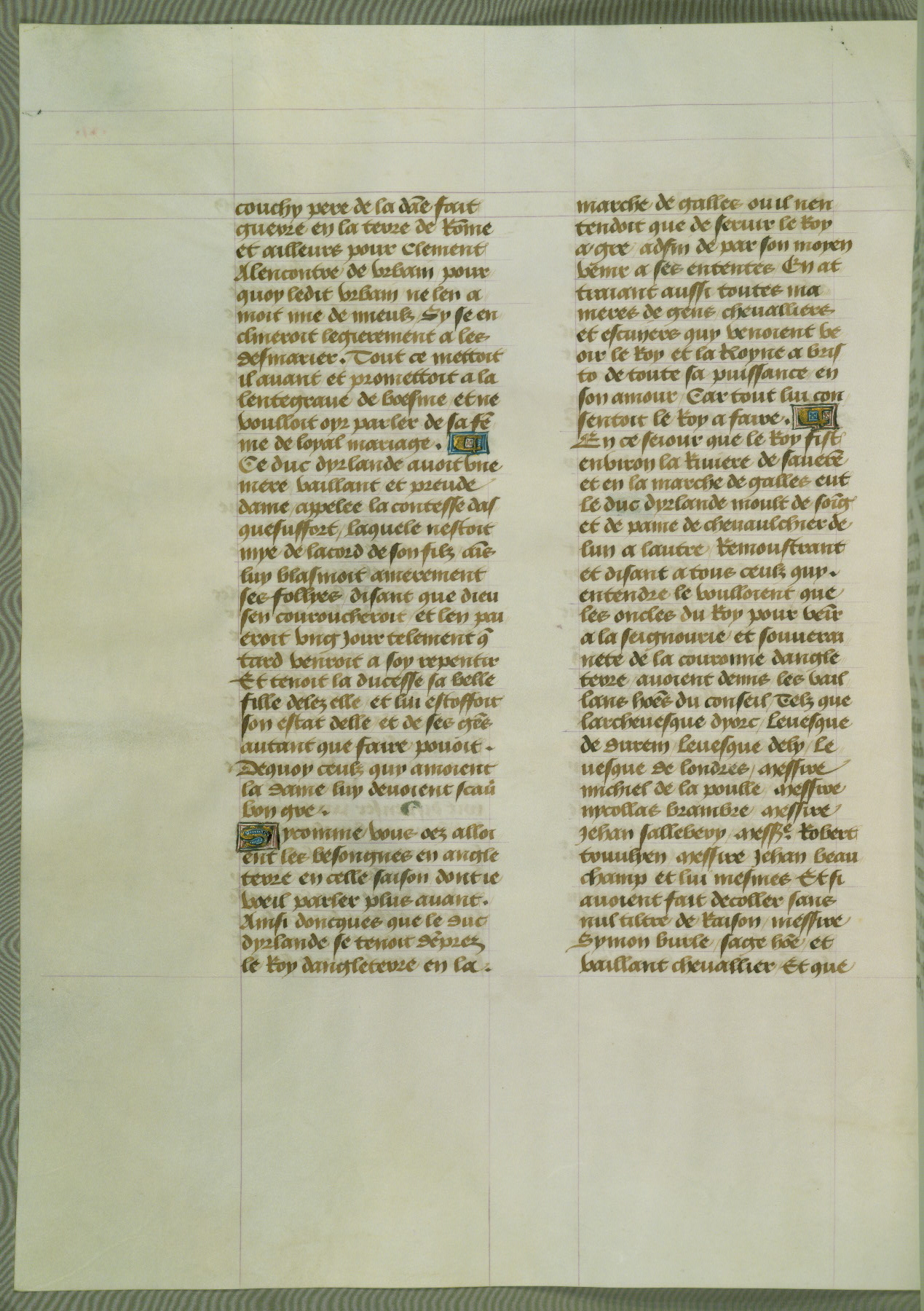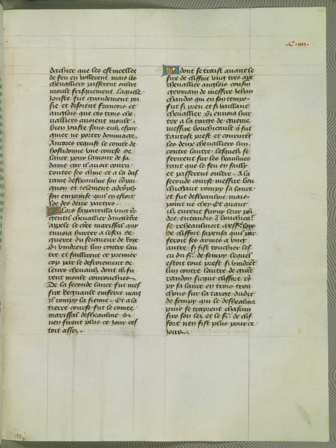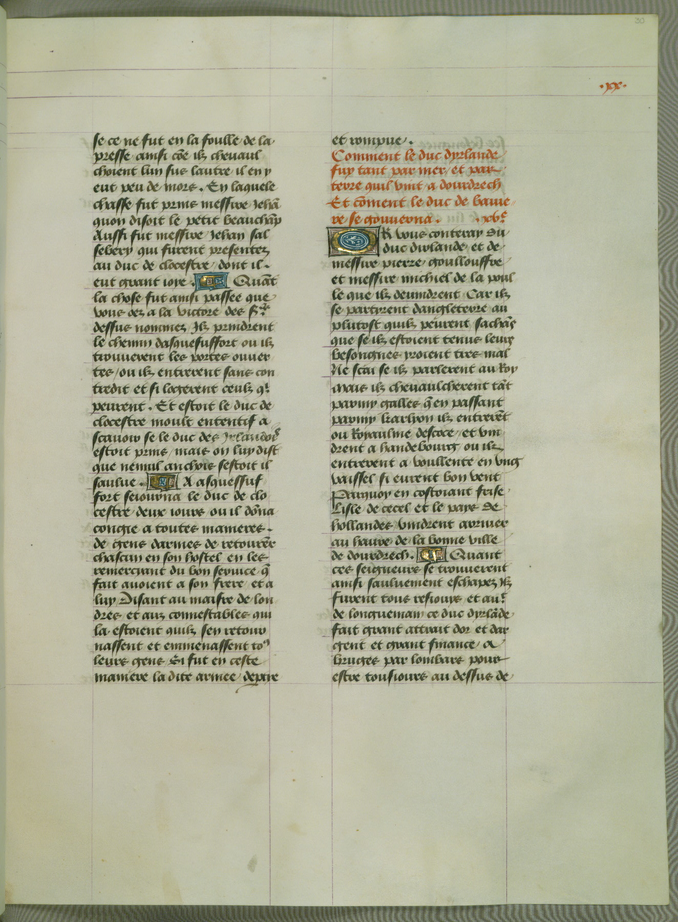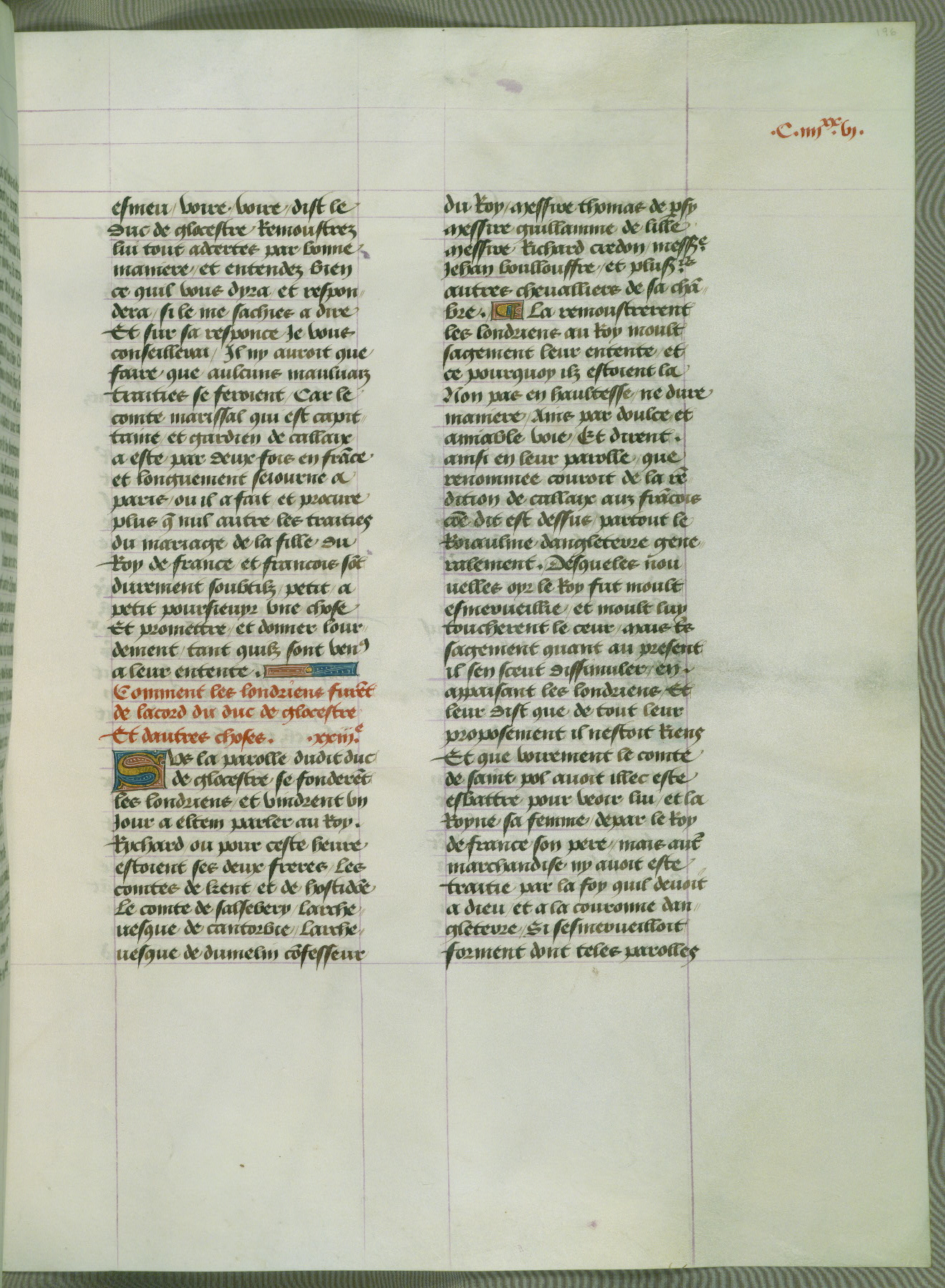 This manuscript is volume IV in a set of five from the collection "Recueil des chroniques et anchiennes istories de la Grant Bretaigne," written by Phillip the Good's counselor and chamberlain Jean de Wavrin. It chronicles the history of England from the early years of the reign of Richard II in 1377 to the demise of Henry IV, his successor, between 1400 and 1413. This volume, produced in Flanders between 1470 and 1480, was part of a set of which volumes II, III and V were recorded in the inventory of the library of William III of Orange in 1686, and was later rebound during the seventeenth or eighteenth century. Six three-quarter-page miniatures open the text of each book and depict events documented therein (with the exception of that of Book 1, portraying Richard II's coronation, which occurs prior to the period detailed in that book). The manuscript's margins are wide and relatively pristine throughout the textblock, but show significant signs of use on illuminated folios, indicating that this manuscript was primarily used for display and not as a historical text. Although few volumes of the Chroniques remain, this manuscript is particularly rare in that it is one of the two surviving exemplars of the text of volume IV, the other being part of the complete set in the Bibliothèque nationale de France (BN fr. 74-85). Volumes II, III, and V of the set to which this volume originally belonged are now in the collection of the Koninklijke Bibliotheek (Den Haag, KB : 133 A 7).