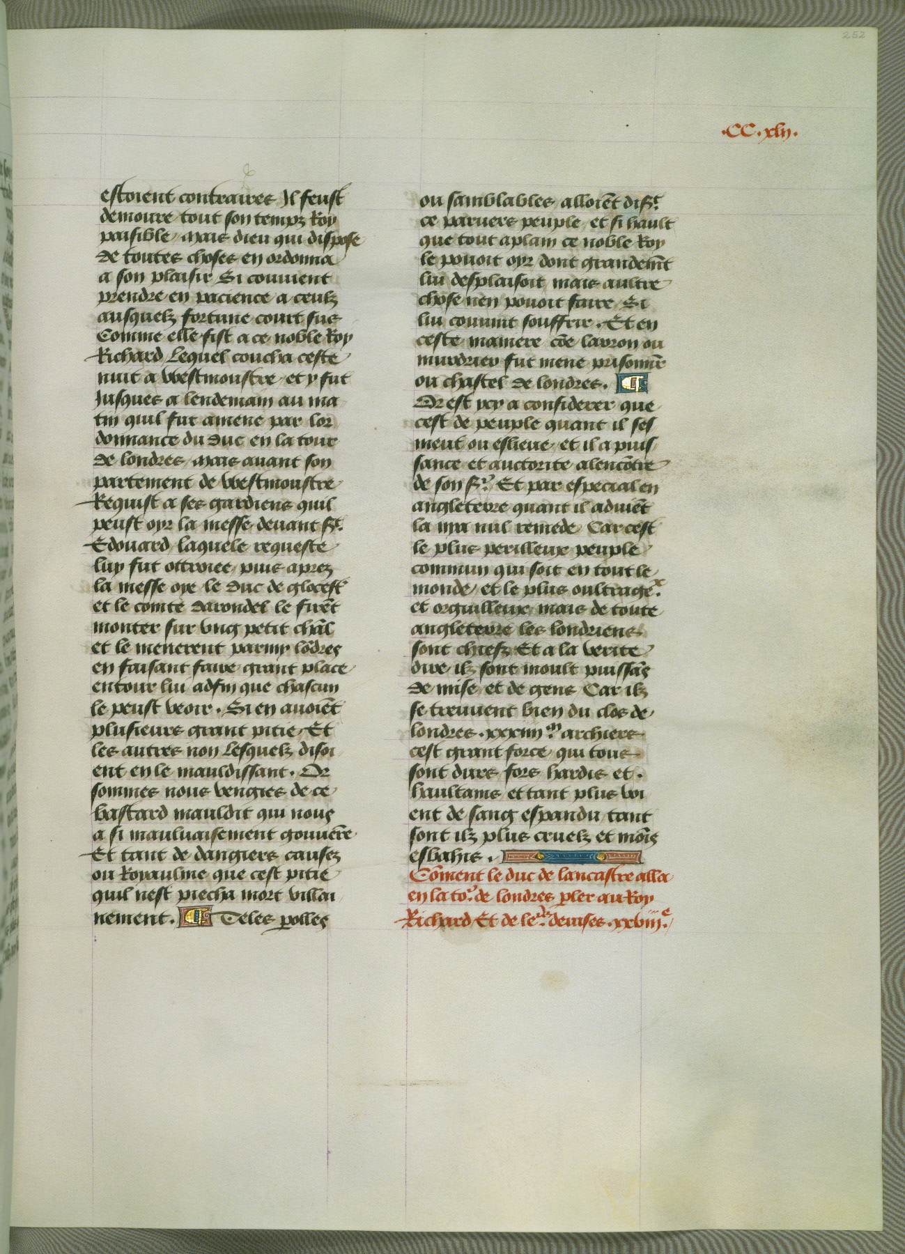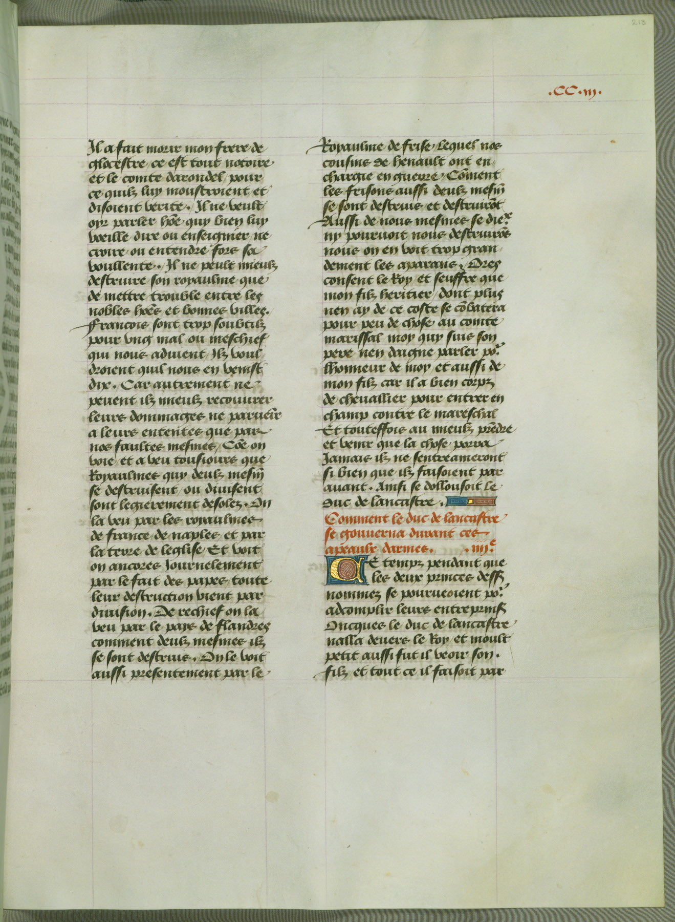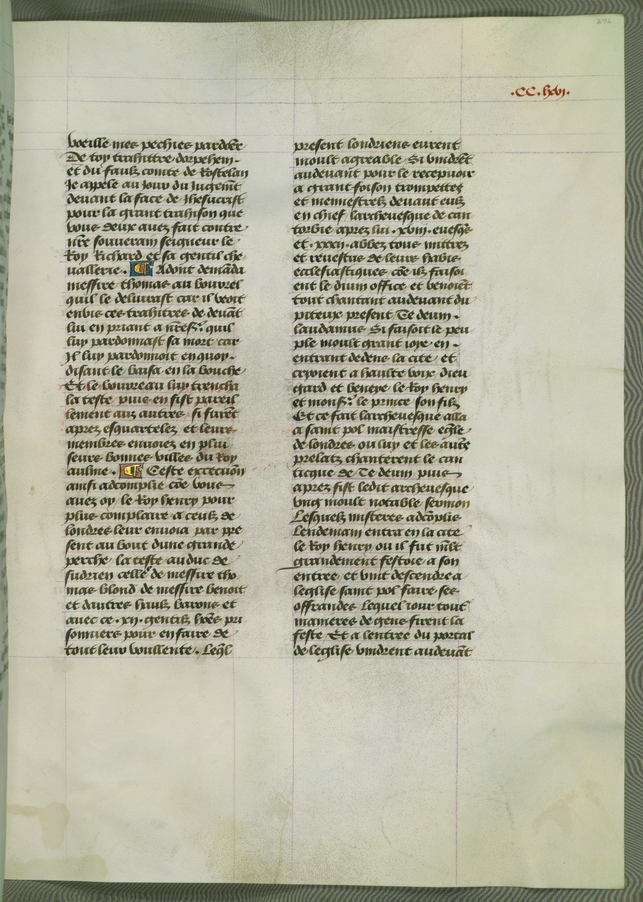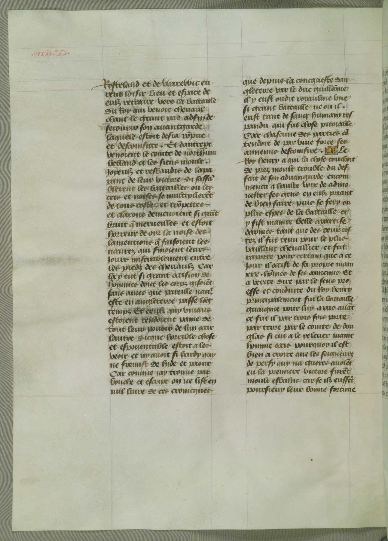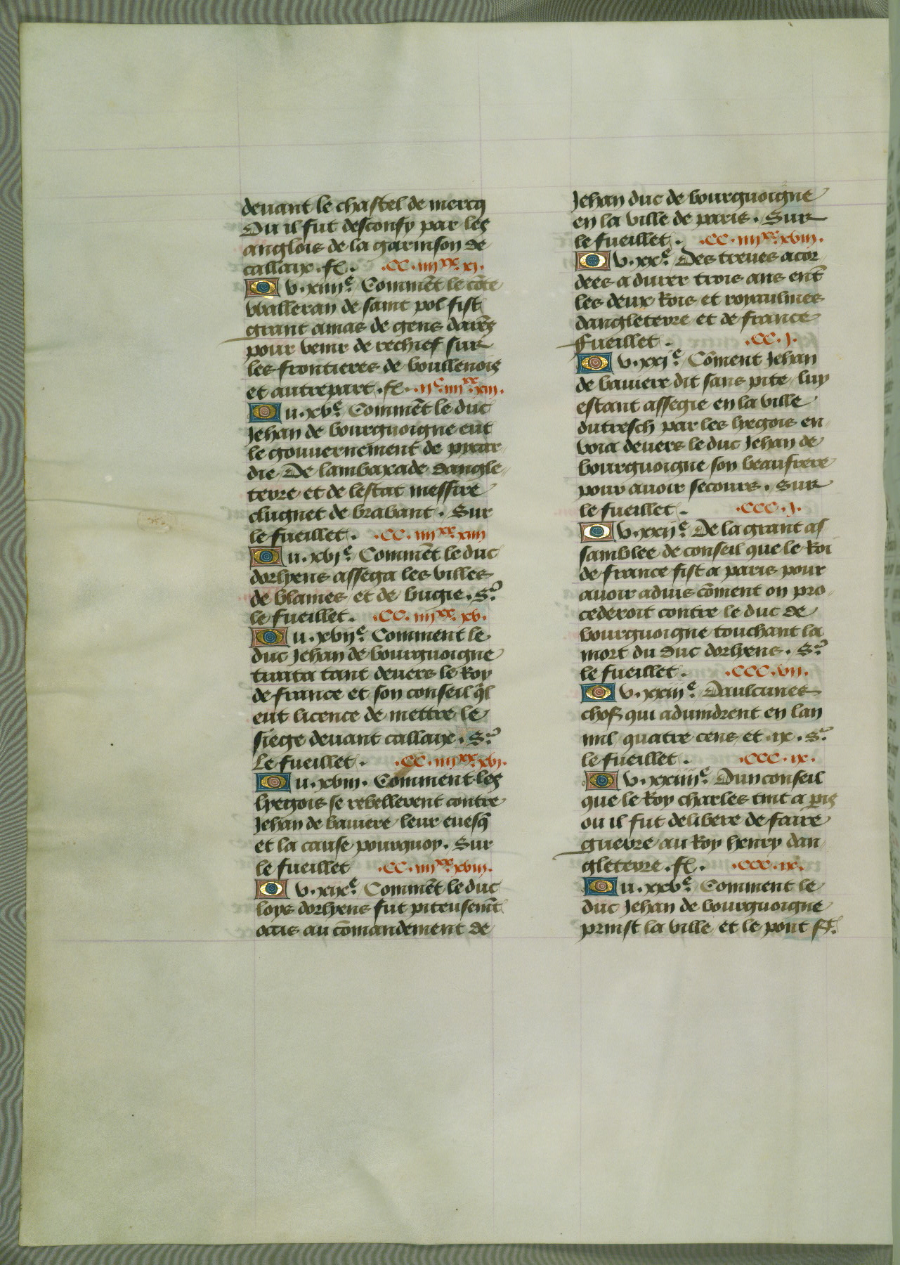 This manuscript is volume IV in a set of five from the collection "Recueil des chroniques et anchiennes istories de la Grant Bretaigne," written by Phillip the Good's counselor and chamberlain Jean de Wavrin. It chronicles the history of England from the early years of the reign of Richard II in 1377 to the demise of Henry IV, his successor, between 1400 and 1413. This volume, produced in Flanders between 1470 and 1480, was part of a set of which volumes II, III and V were recorded in the inventory of the library of William III of Orange in 1686, and was later rebound during the seventeenth or eighteenth century. Six three-quarter-page miniatures open the text of each book and depict events documented therein (with the exception of that of Book 1, portraying Richard II's coronation, which occurs prior to the period detailed in that book). The manuscript's margins are wide and relatively pristine throughout the textblock, but show significant signs of use on illuminated folios, indicating that this manuscript was primarily used for display and not as a historical text. Although few volumes of the Chroniques remain, this manuscript is particularly rare in that it is one of the two surviving exemplars of the text of volume IV, the other being part of the complete set in the Bibliothèque nationale de France (BN fr. 74-85). Volumes II, III, and V of the set to which this volume originally belonged are now in the collection of the Koninklijke Bibliotheek (Den Haag, KB : 133 A 7).