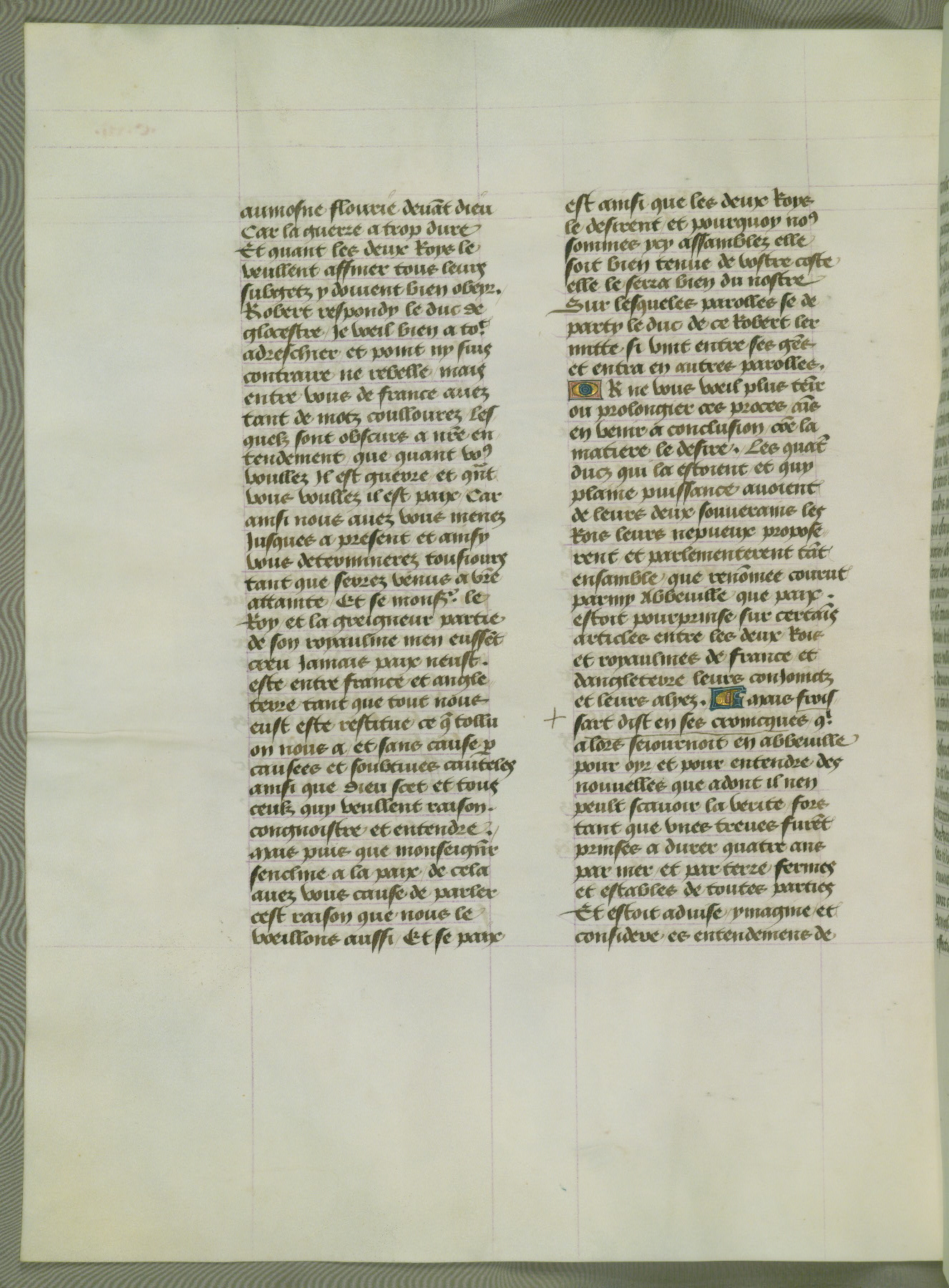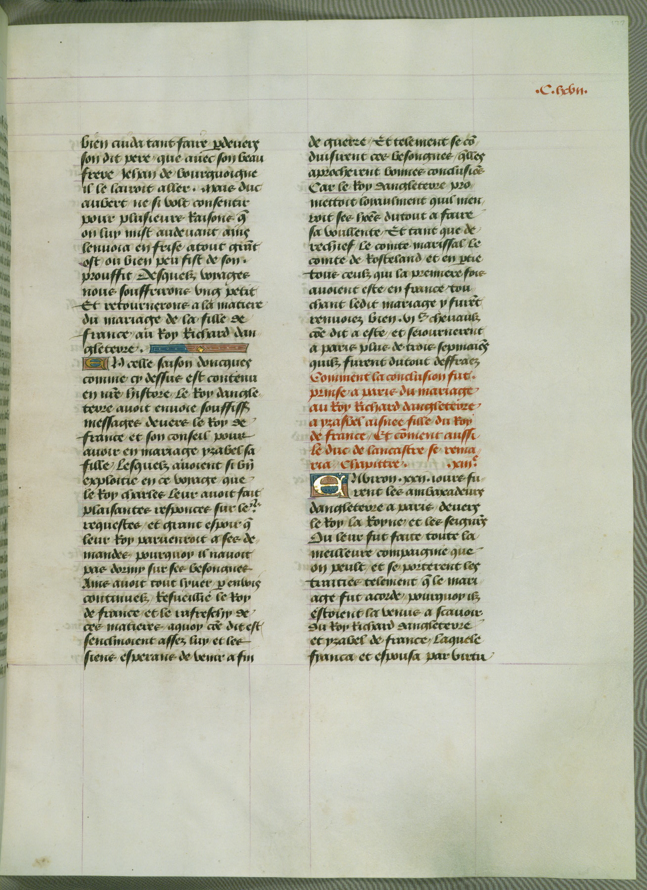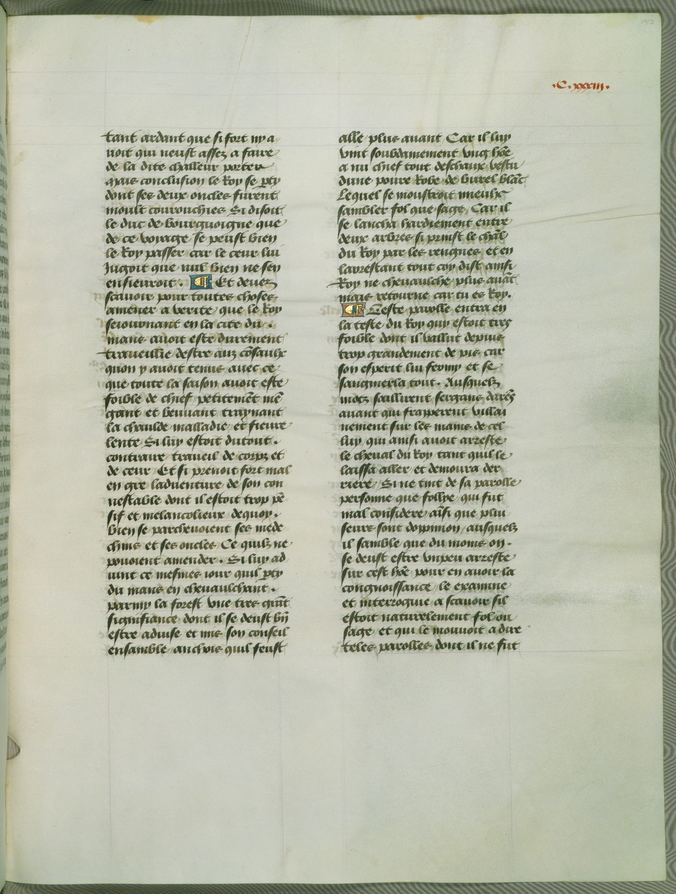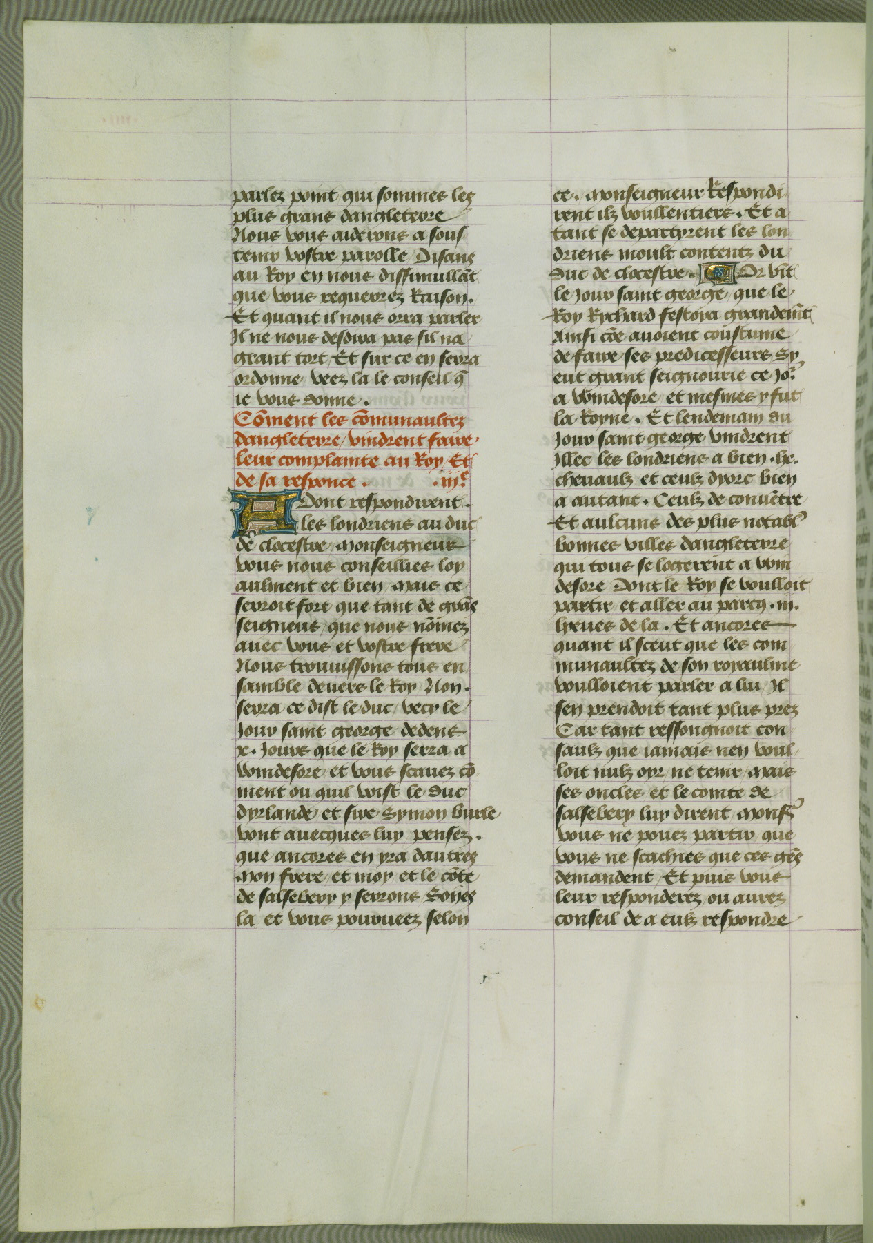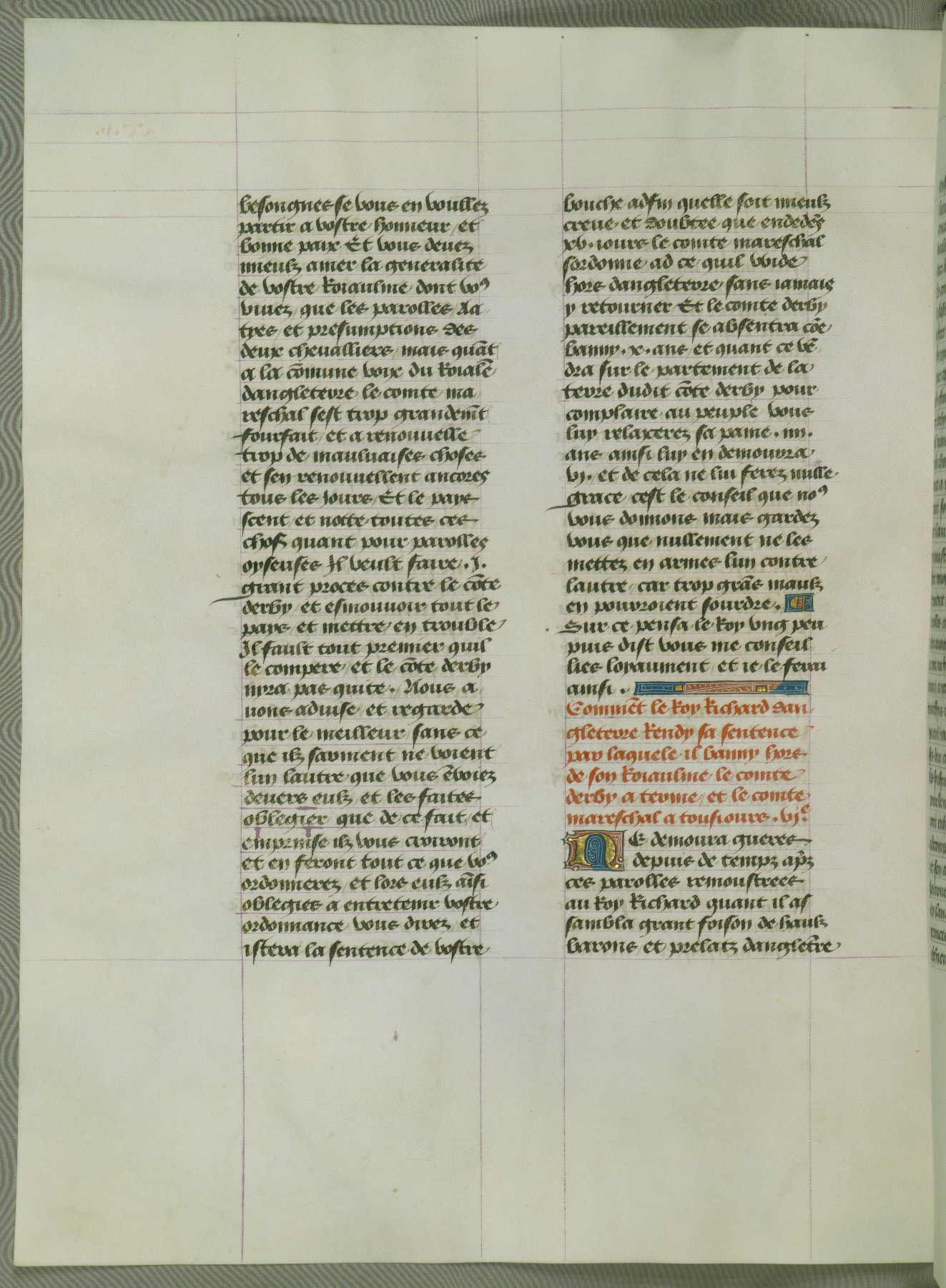 This manuscript is volume IV in a set of five from the collection "Recueil des chroniques et anchiennes istories de la Grant Bretaigne," written by Phillip the Good's counselor and chamberlain Jean de Wavrin. It chronicles the history of England from the early years of the reign of Richard II in 1377 to the demise of Henry IV, his successor, between 1400 and 1413. This volume, produced in Flanders between 1470 and 1480, was part of a set of which volumes II, III and V were recorded in the inventory of the library of William III of Orange in 1686, and was later rebound during the seventeenth or eighteenth century. Six three-quarter-page miniatures open the text of each book and depict events documented therein (with the exception of that of Book 1, portraying Richard II's coronation, which occurs prior to the period detailed in that book). The manuscript's margins are wide and relatively pristine throughout the textblock, but show significant signs of use on illuminated folios, indicating that this manuscript was primarily used for display and not as a historical text. Although few volumes of the Chroniques remain, this manuscript is particularly rare in that it is one of the two surviving exemplars of the text of volume IV, the other being part of the complete set in the Bibliothèque nationale de France (BN fr. 74-85). Volumes II, III, and V of the set to which this volume originally belonged are now in the collection of the Koninklijke Bibliotheek (Den Haag, KB : 133 A 7).