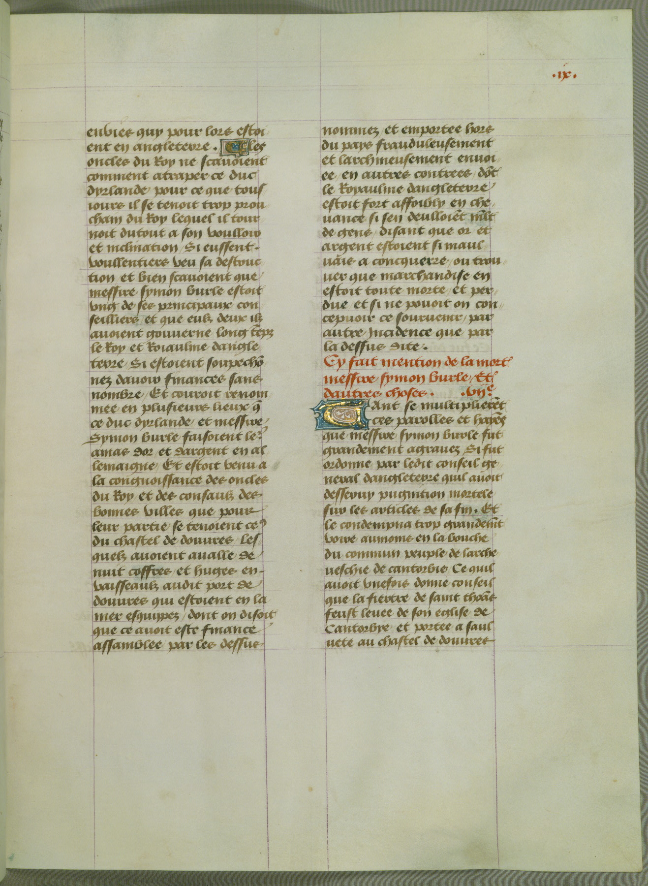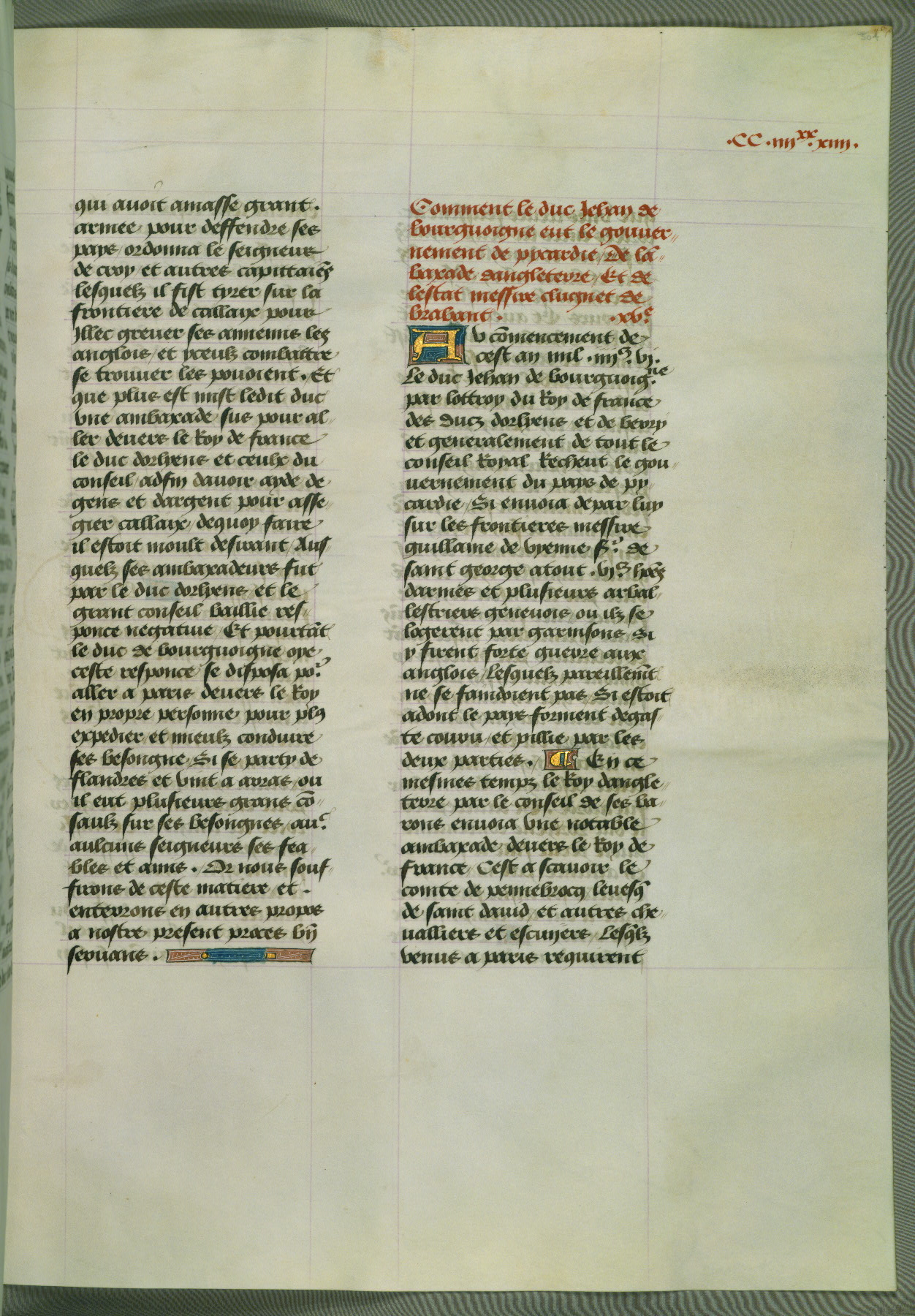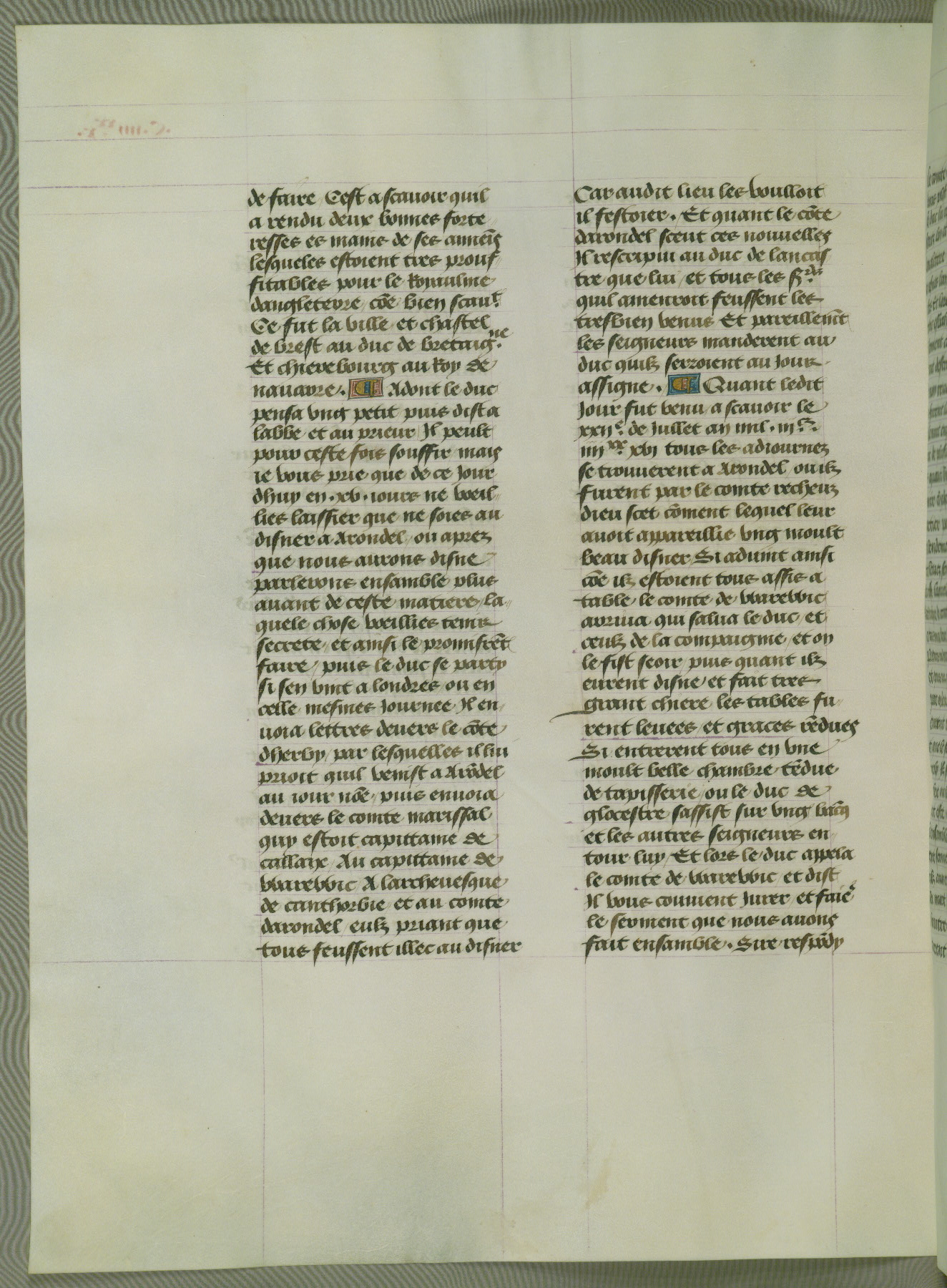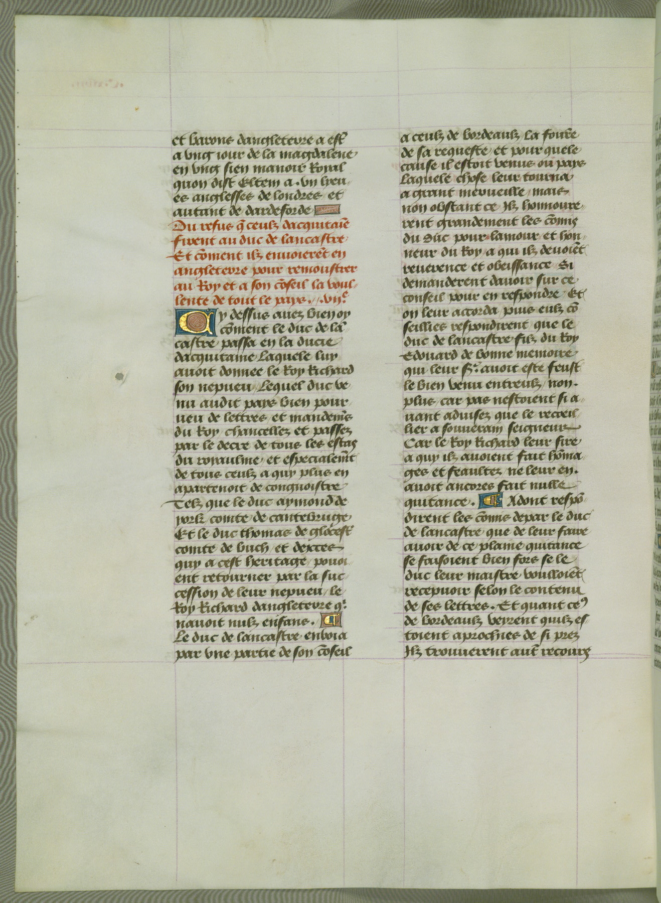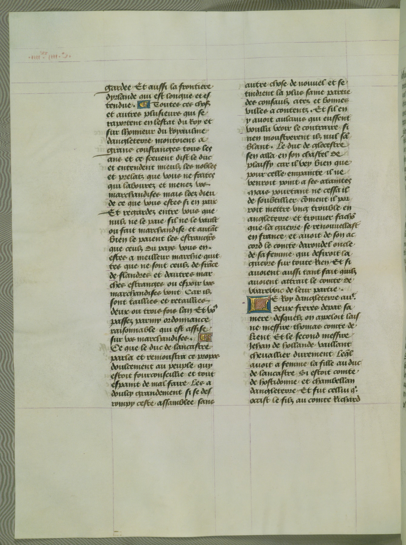 This manuscript is volume IV in a set of five from the collection "Recueil des chroniques et anchiennes istories de la Grant Bretaigne," written by Phillip the Good's counselor and chamberlain Jean de Wavrin. It chronicles the history of England from the early years of the reign of Richard II in 1377 to the demise of Henry IV, his successor, between 1400 and 1413. This volume, produced in Flanders between 1470 and 1480, was part of a set of which volumes II, III and V were recorded in the inventory of the library of William III of Orange in 1686, and was later rebound during the seventeenth or eighteenth century. Six three-quarter-page miniatures open the text of each book and depict events documented therein (with the exception of that of Book 1, portraying Richard II's coronation, which occurs prior to the period detailed in that book). The manuscript's margins are wide and relatively pristine throughout the textblock, but show significant signs of use on illuminated folios, indicating that this manuscript was primarily used for display and not as a historical text. Although few volumes of the Chroniques remain, this manuscript is particularly rare in that it is one of the two surviving exemplars of the text of volume IV, the other being part of the complete set in the Bibliothèque nationale de France (BN fr. 74-85). Volumes II, III, and V of the set to which this volume originally belonged are now in the collection of the Koninklijke Bibliotheek (Den Haag, KB : 133 A 7).