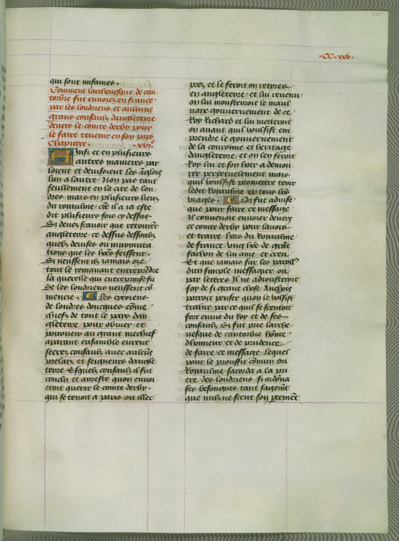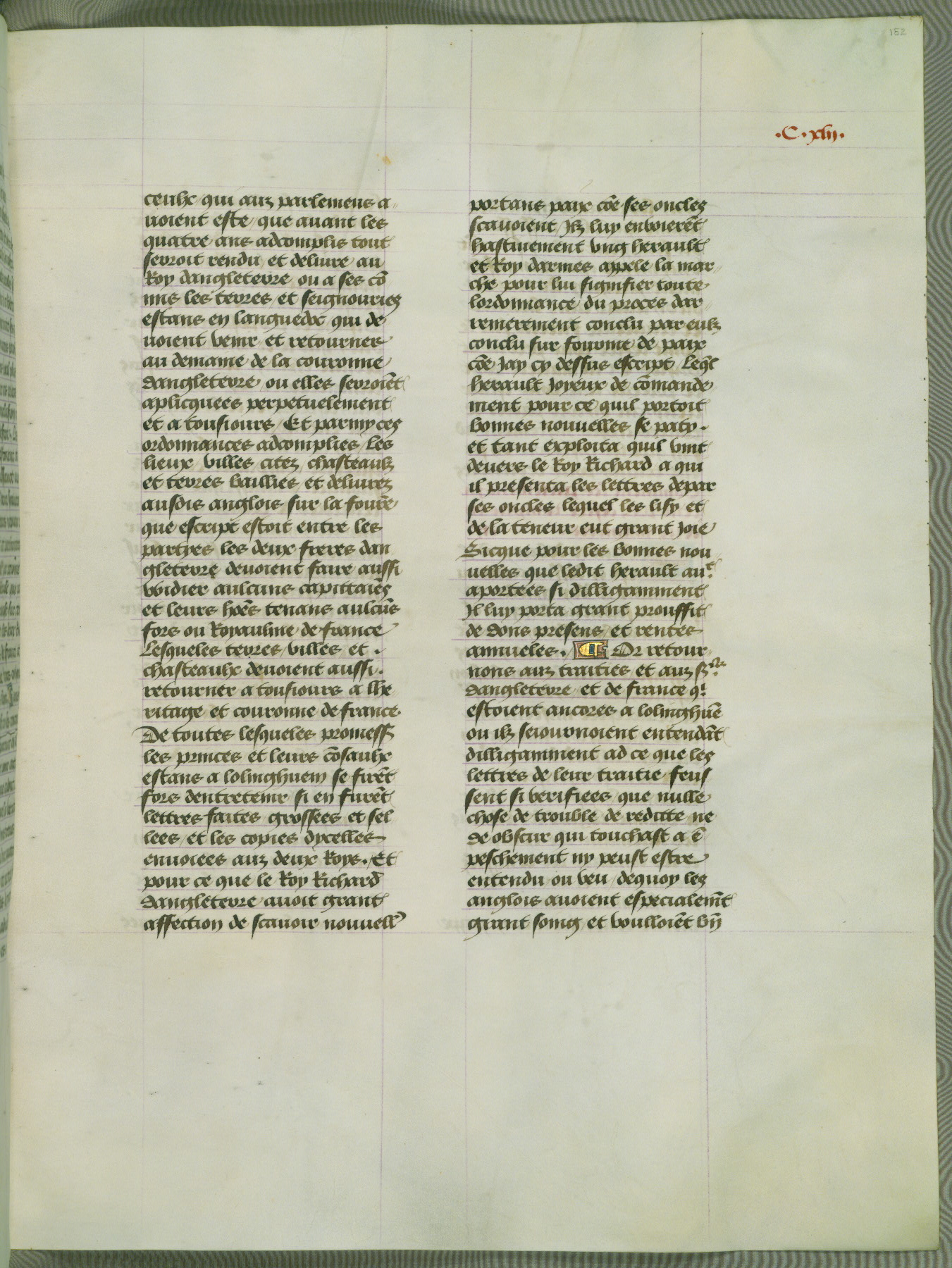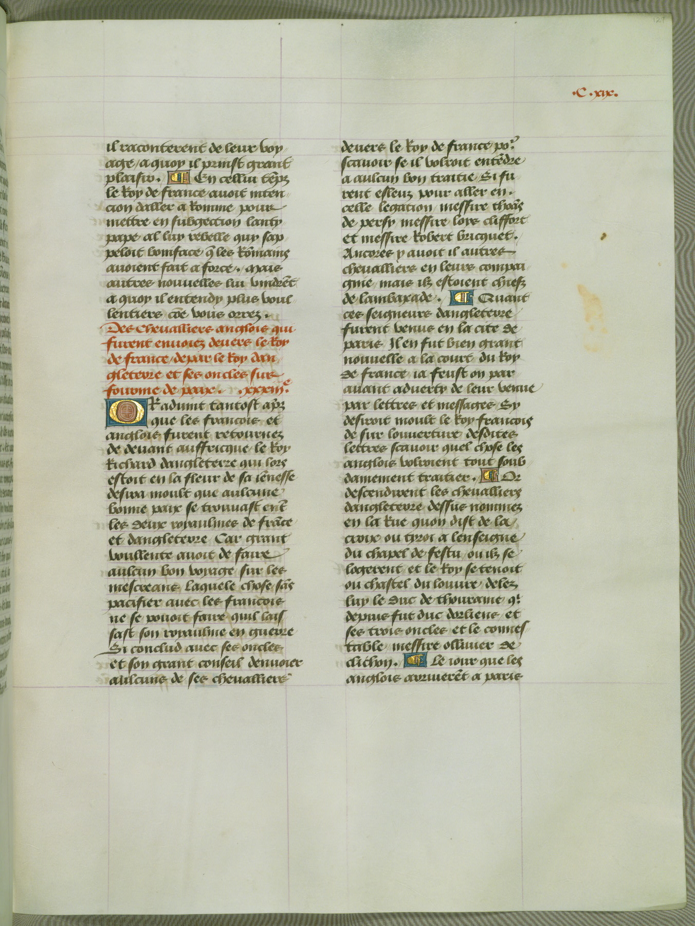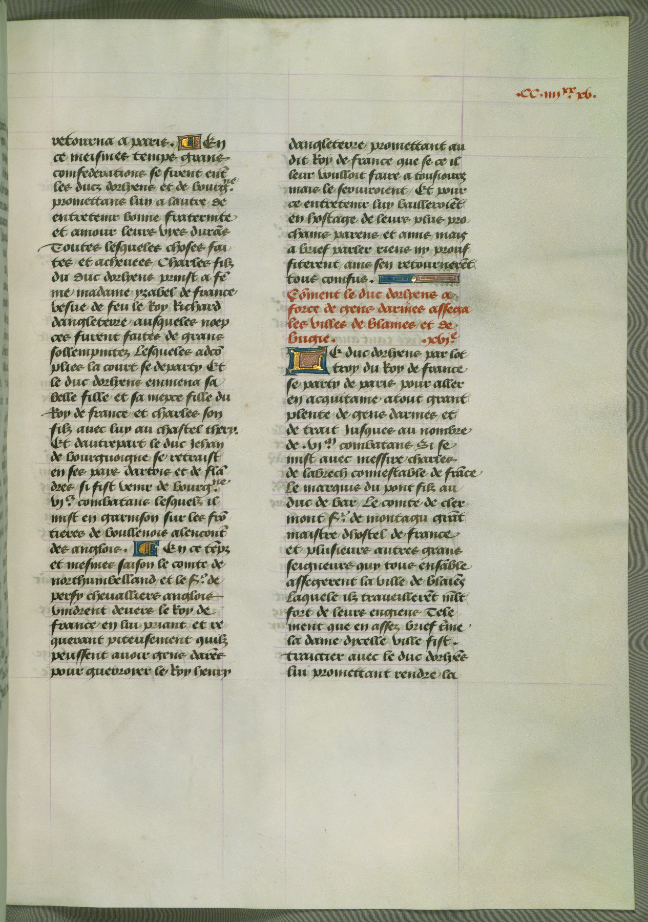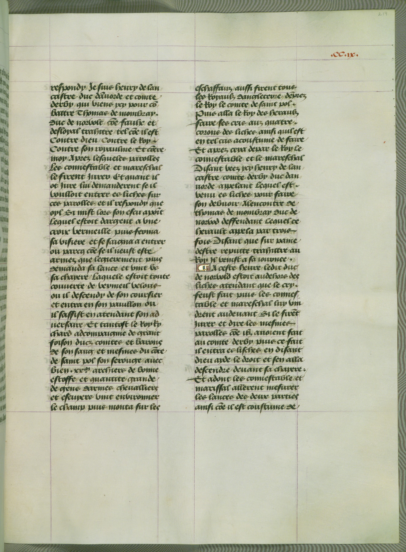 This manuscript is volume IV in a set of five from the collection "Recueil des chroniques et anchiennes istories de la Grant Bretaigne," written by Phillip the Good's counselor and chamberlain Jean de Wavrin. It chronicles the history of England from the early years of the reign of Richard II in 1377 to the demise of Henry IV, his successor, between 1400 and 1413. This volume, produced in Flanders between 1470 and 1480, was part of a set of which volumes II, III and V were recorded in the inventory of the library of William III of Orange in 1686, and was later rebound during the seventeenth or eighteenth century. Six three-quarter-page miniatures open the text of each book and depict events documented therein (with the exception of that of Book 1, portraying Richard II's coronation, which occurs prior to the period detailed in that book). The manuscript's margins are wide and relatively pristine throughout the textblock, but show significant signs of use on illuminated folios, indicating that this manuscript was primarily used for display and not as a historical text. Although few volumes of the Chroniques remain, this manuscript is particularly rare in that it is one of the two surviving exemplars of the text of volume IV, the other being part of the complete set in the Bibliothèque nationale de France (BN fr. 74-85). Volumes II, III, and V of the set to which this volume originally belonged are now in the collection of the Koninklijke Bibliotheek (Den Haag, KB : 133 A 7).