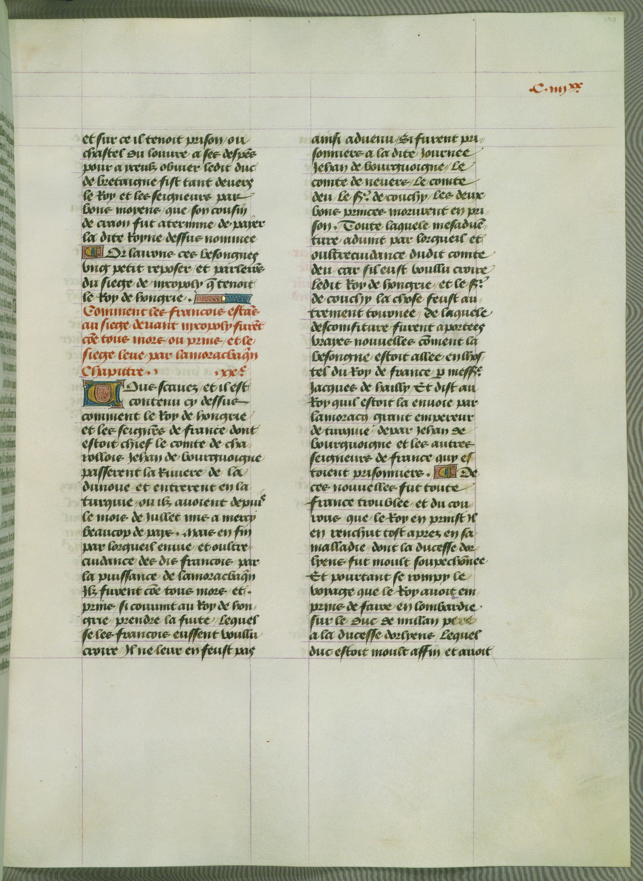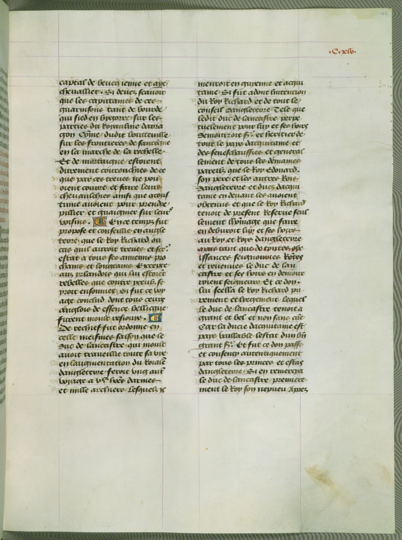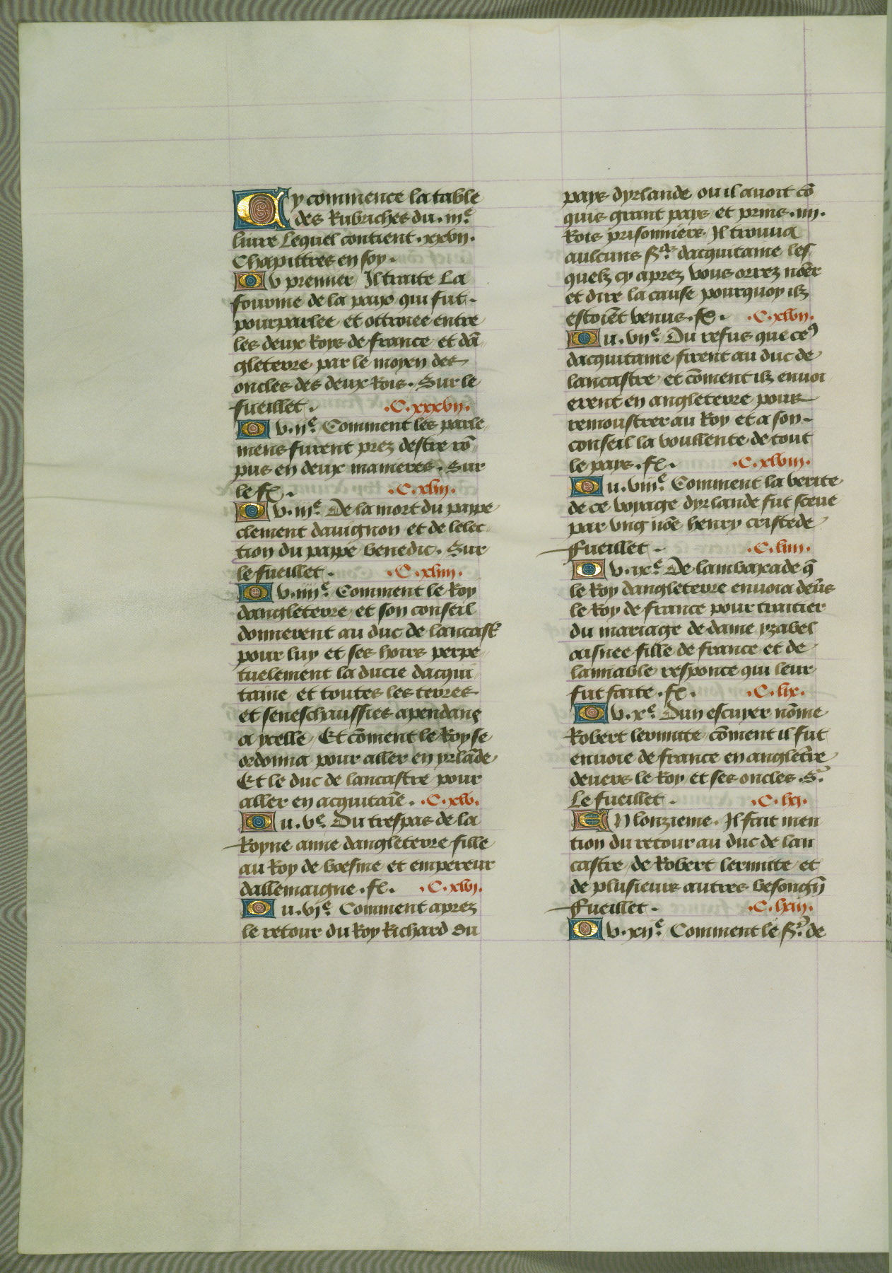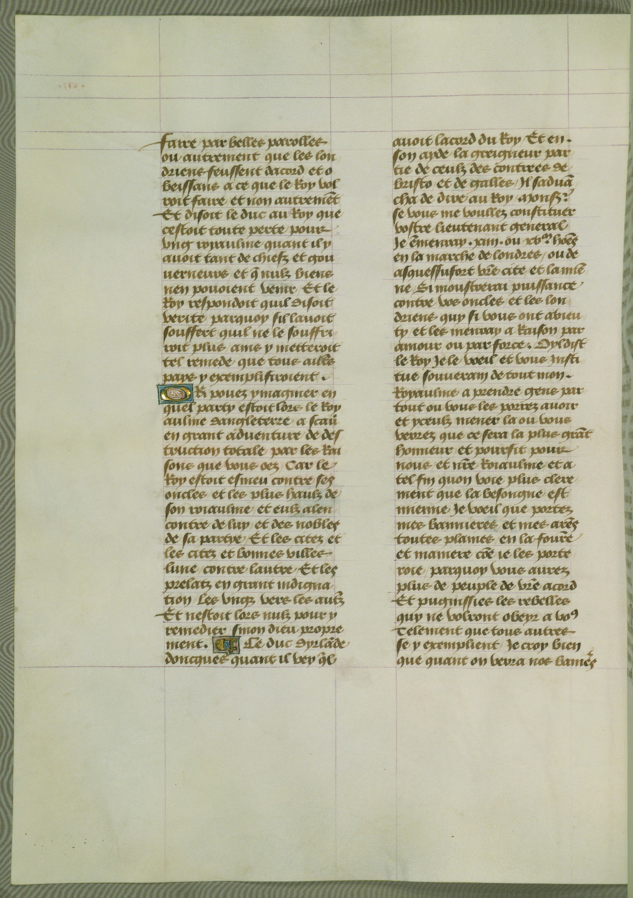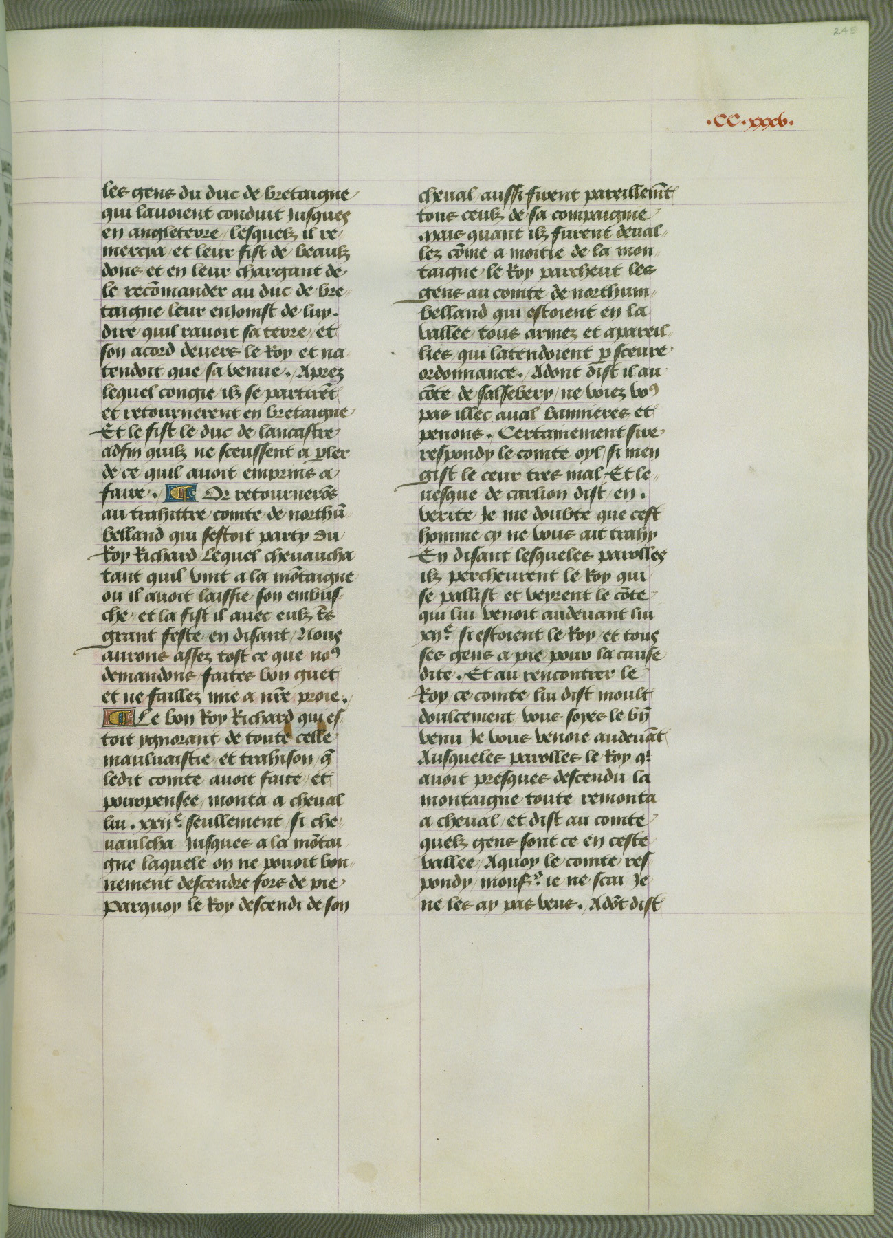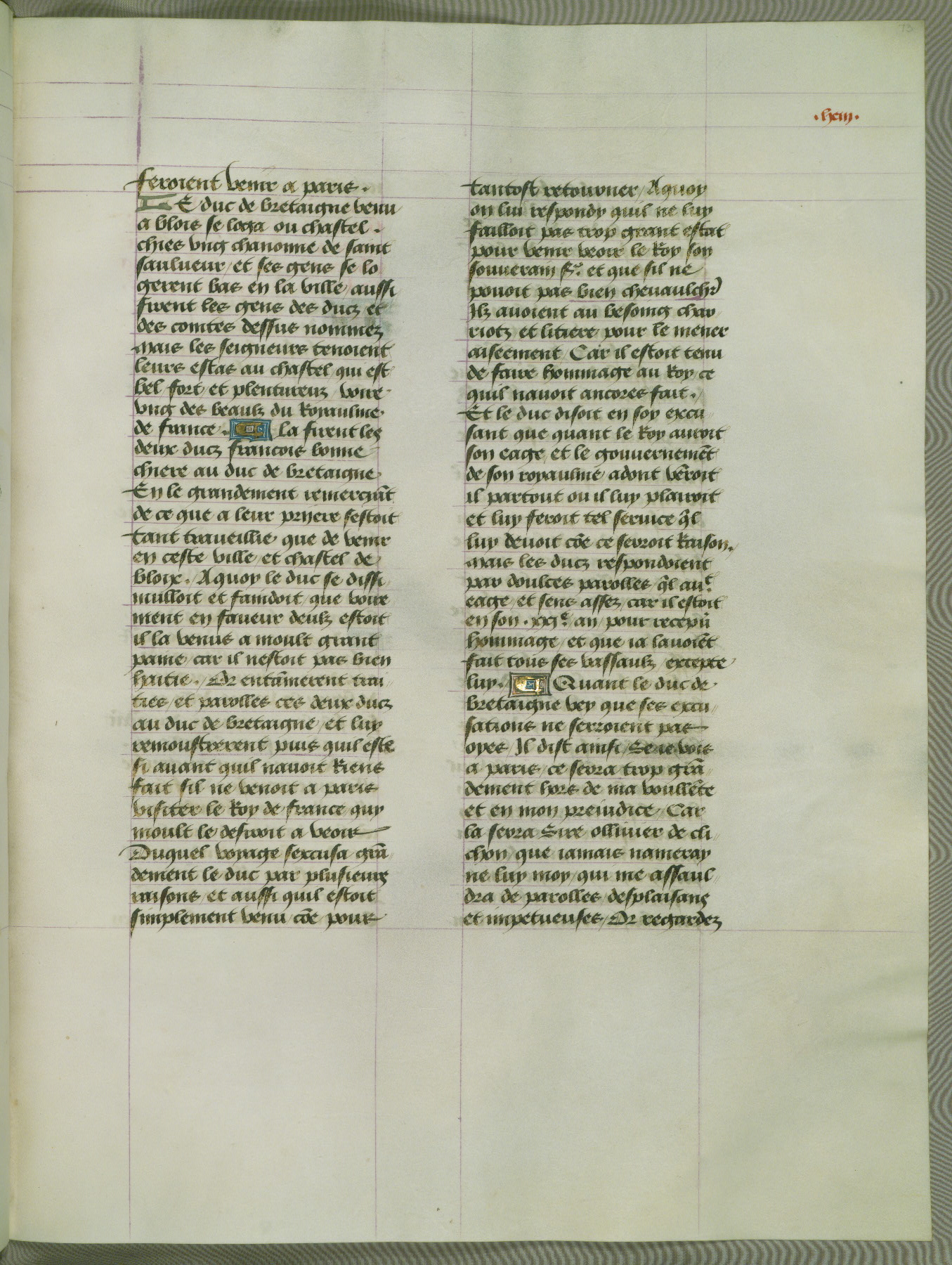 This manuscript is volume IV in a set of five from the collection "Recueil des chroniques et anchiennes istories de la Grant Bretaigne," written by Phillip the Good's counselor and chamberlain Jean de Wavrin. It chronicles the history of England from the early years of the reign of Richard II in 1377 to the demise of Henry IV, his successor, between 1400 and 1413. This volume, produced in Flanders between 1470 and 1480, was part of a set of which volumes II, III and V were recorded in the inventory of the library of William III of Orange in 1686, and was later rebound during the seventeenth or eighteenth century. Six three-quarter-page miniatures open the text of each book and depict events documented therein (with the exception of that of Book 1, portraying Richard II's coronation, which occurs prior to the period detailed in that book). The manuscript's margins are wide and relatively pristine throughout the textblock, but show significant signs of use on illuminated folios, indicating that this manuscript was primarily used for display and not as a historical text. Although few volumes of the Chroniques remain, this manuscript is particularly rare in that it is one of the two surviving exemplars of the text of volume IV, the other being part of the complete set in the Bibliothèque nationale de France (BN fr. 74-85). Volumes II, III, and V of the set to which this volume originally belonged are now in the collection of the Koninklijke Bibliotheek (Den Haag, KB : 133 A 7).