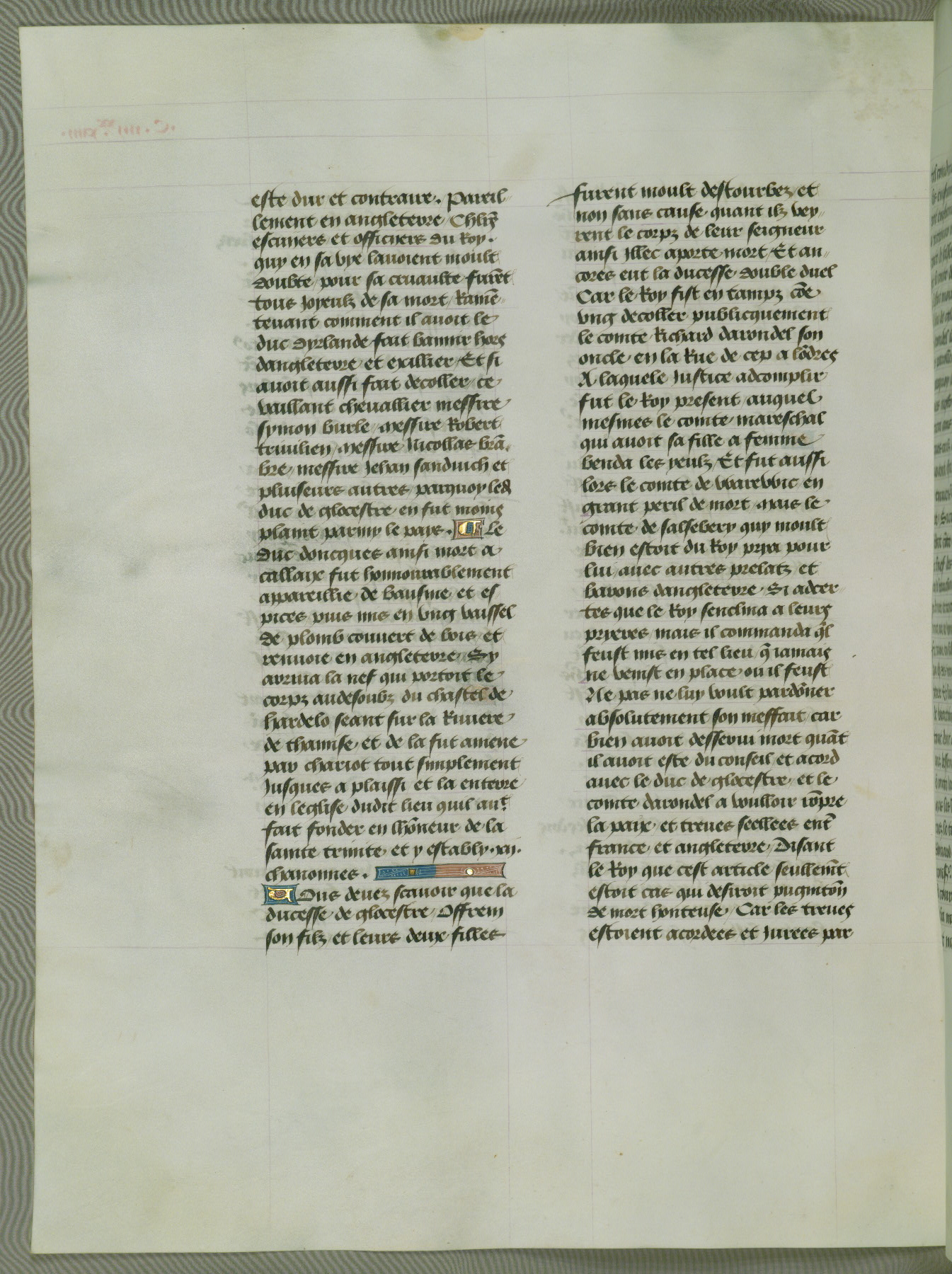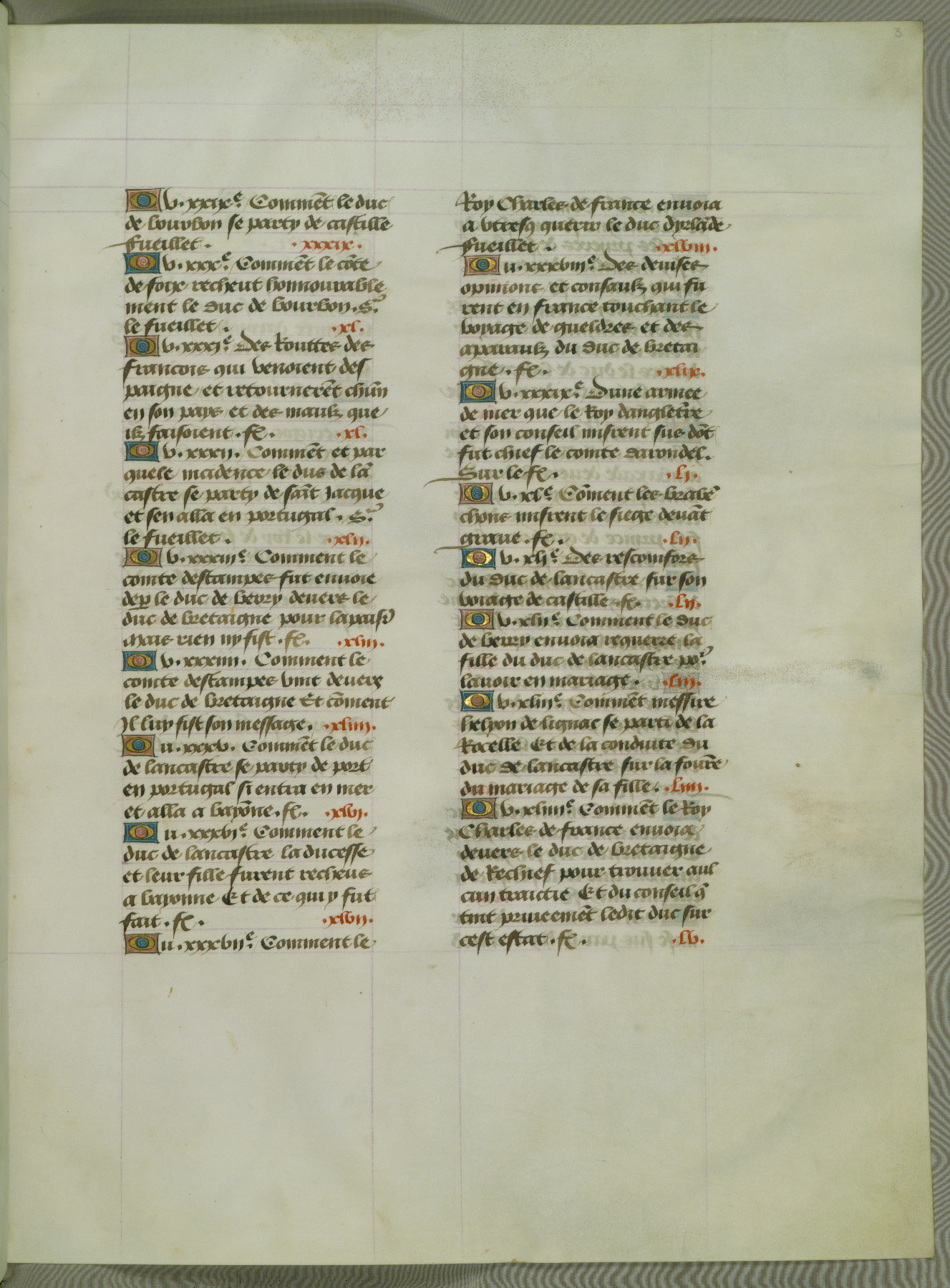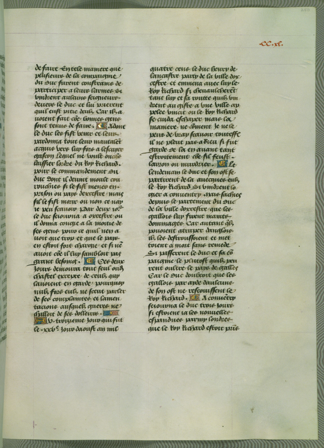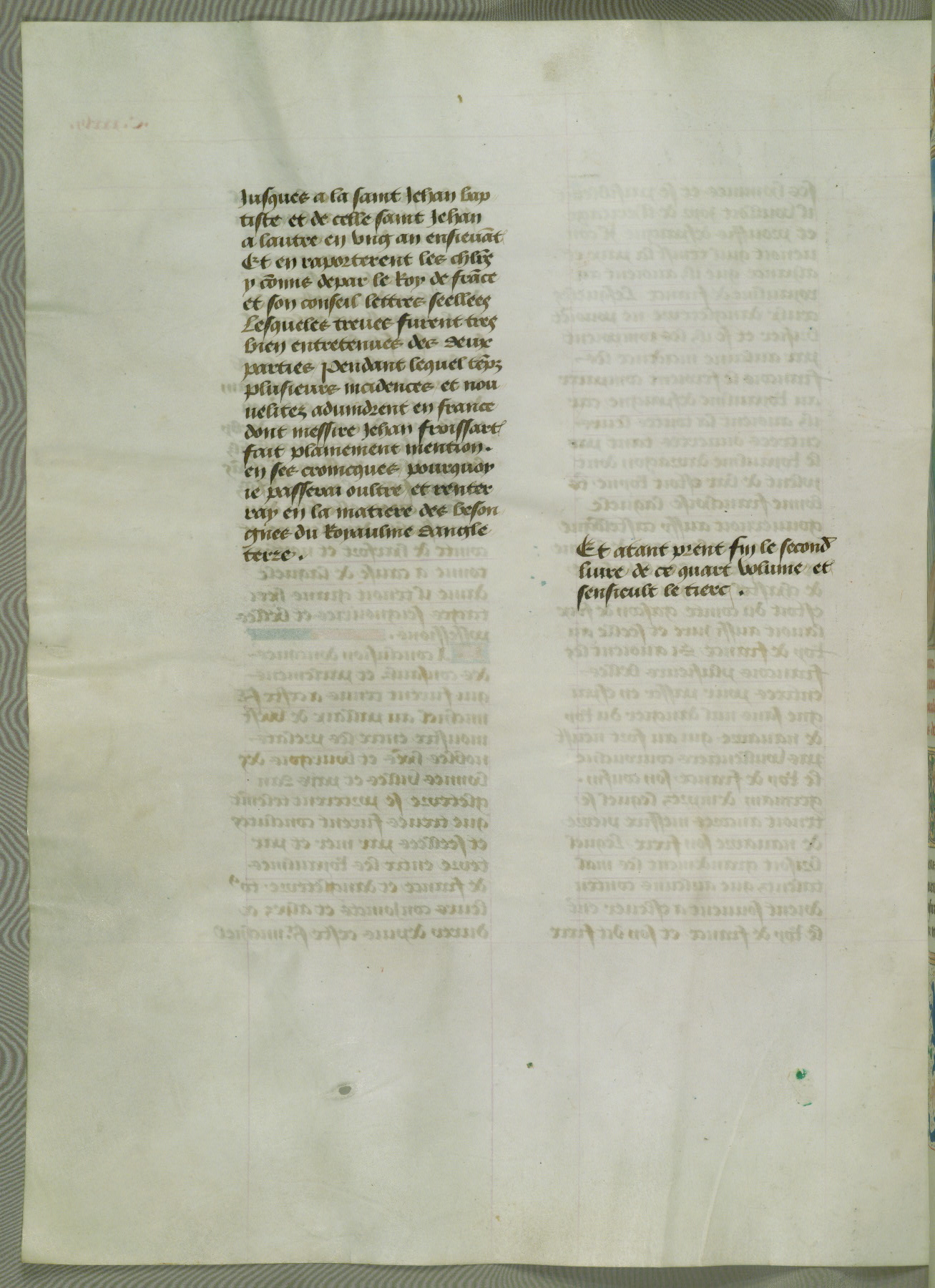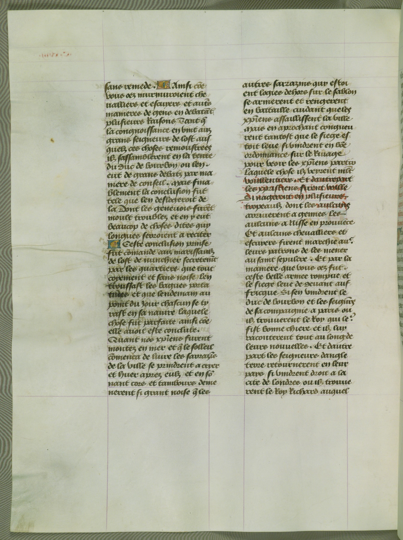 This manuscript is volume IV in a set of five from the collection "Recueil des chroniques et anchiennes istories de la Grant Bretaigne," written by Phillip the Good's counselor and chamberlain Jean de Wavrin. It chronicles the history of England from the early years of the reign of Richard II in 1377 to the demise of Henry IV, his successor, between 1400 and 1413. This volume, produced in Flanders between 1470 and 1480, was part of a set of which volumes II, III and V were recorded in the inventory of the library of William III of Orange in 1686, and was later rebound during the seventeenth or eighteenth century. Six three-quarter-page miniatures open the text of each book and depict events documented therein (with the exception of that of Book 1, portraying Richard II's coronation, which occurs prior to the period detailed in that book). The manuscript's margins are wide and relatively pristine throughout the textblock, but show significant signs of use on illuminated folios, indicating that this manuscript was primarily used for display and not as a historical text. Although few volumes of the Chroniques remain, this manuscript is particularly rare in that it is one of the two surviving exemplars of the text of volume IV, the other being part of the complete set in the Bibliothèque nationale de France (BN fr. 74-85). Volumes II, III, and V of the set to which this volume originally belonged are now in the collection of the Koninklijke Bibliotheek (Den Haag, KB : 133 A 7).