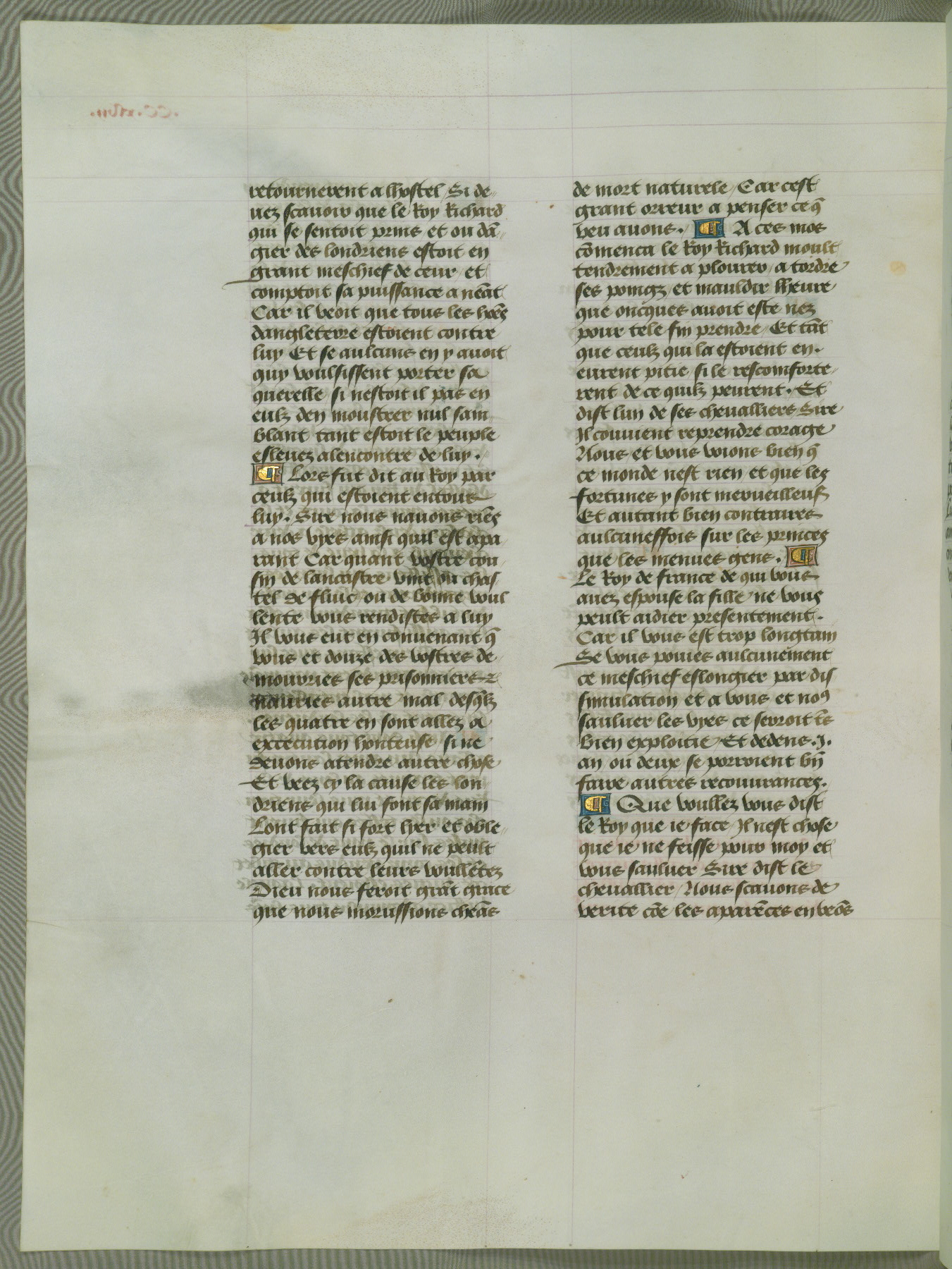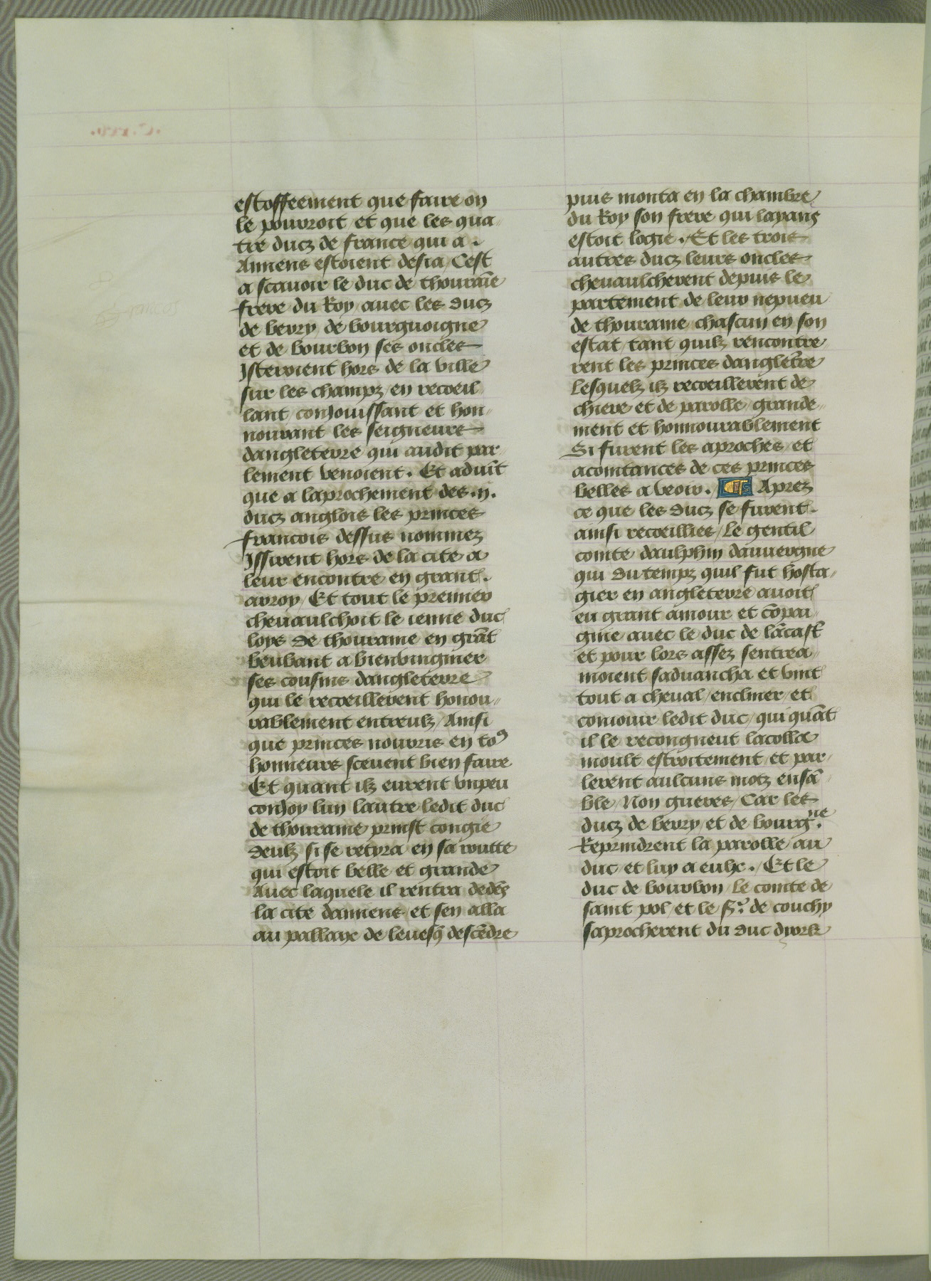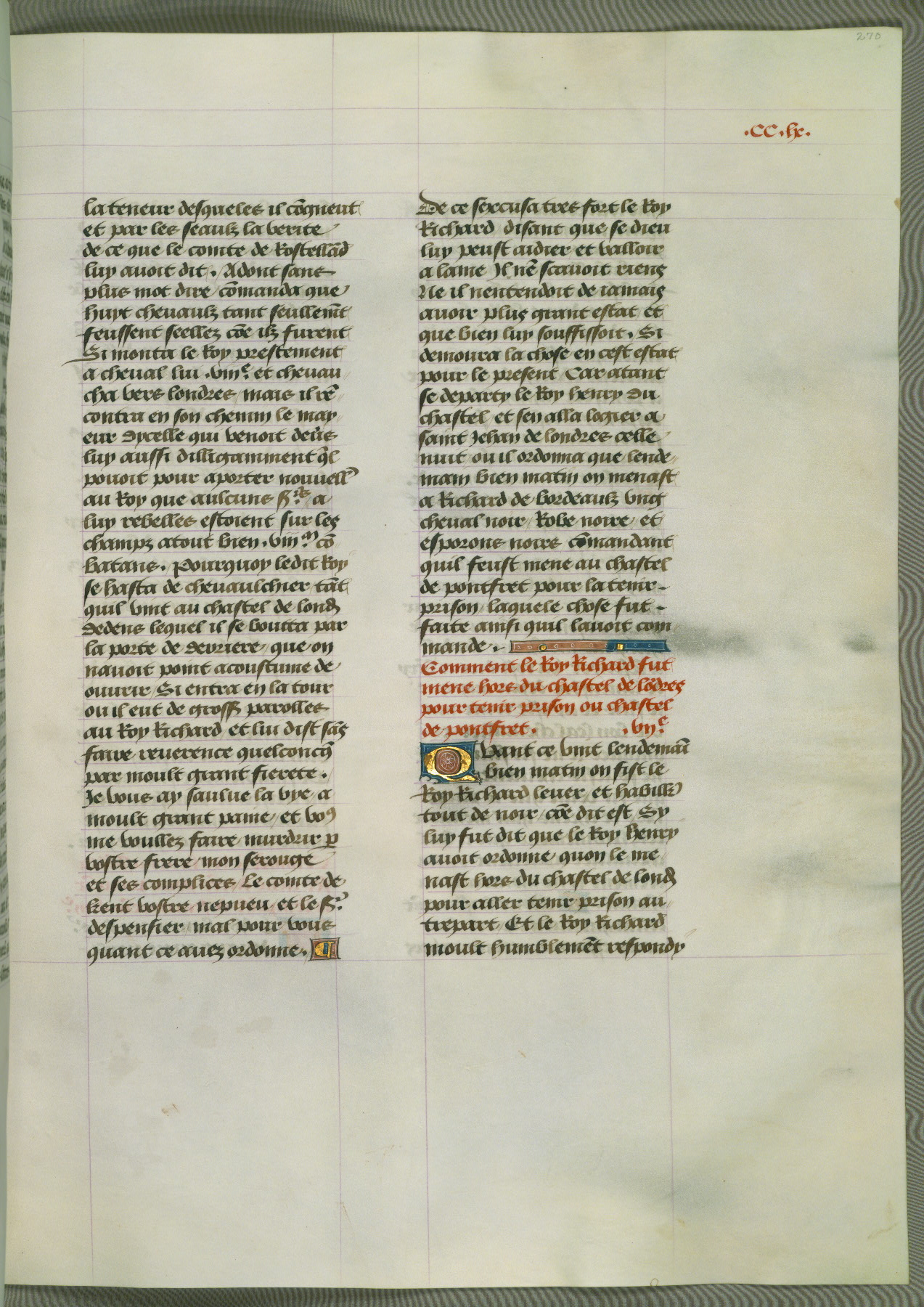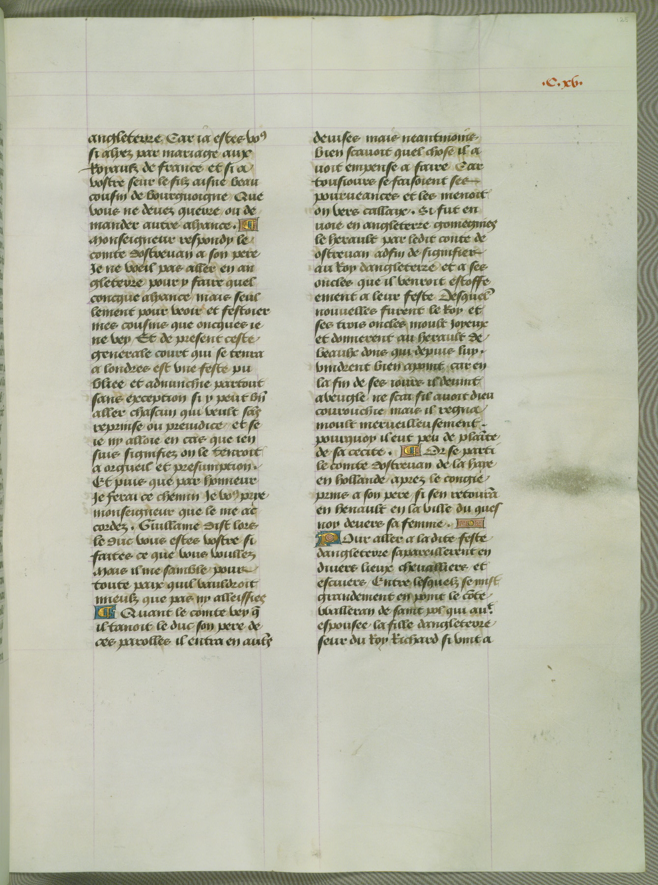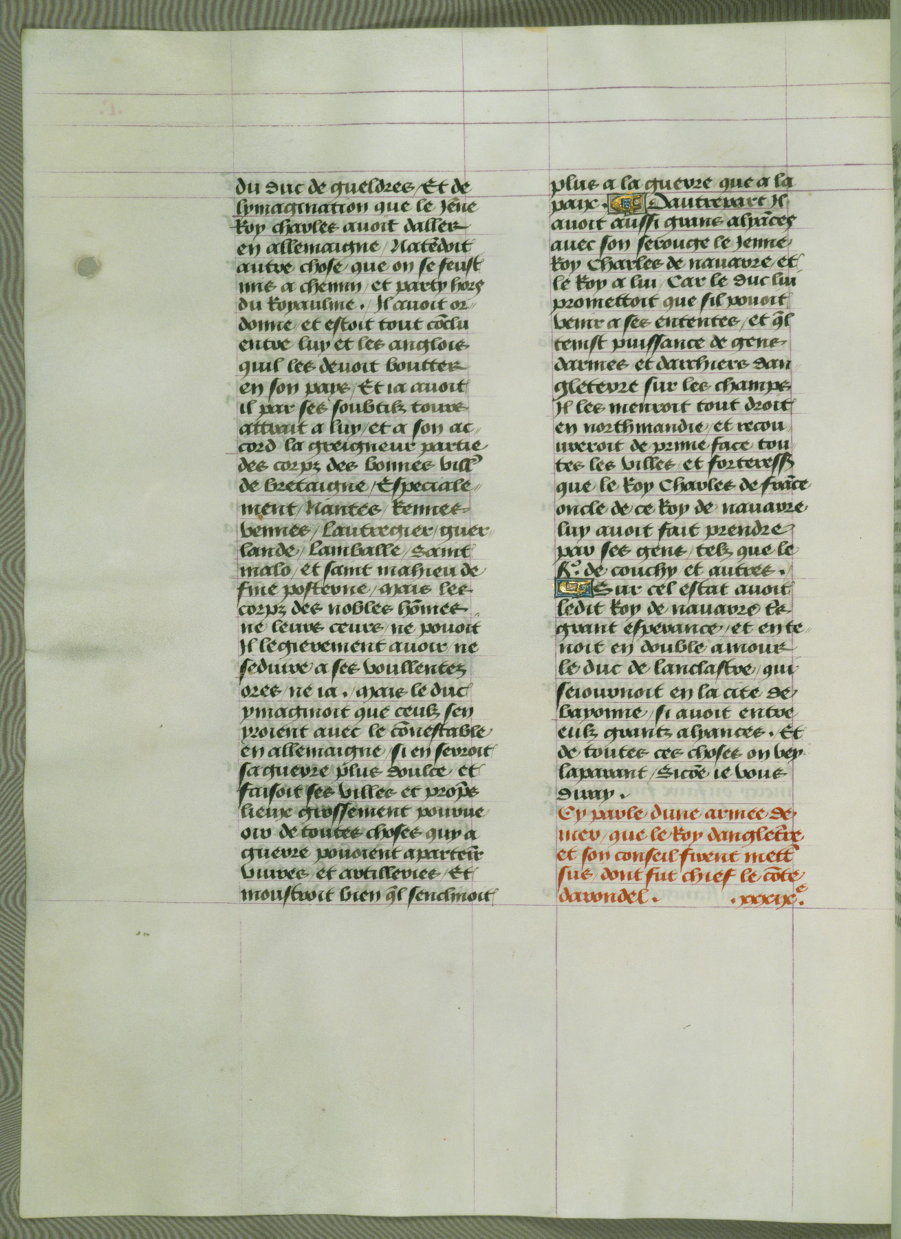 This manuscript is volume IV in a set of five from the collection "Recueil des chroniques et anchiennes istories de la Grant Bretaigne," written by Phillip the Good's counselor and chamberlain Jean de Wavrin. It chronicles the history of England from the early years of the reign of Richard II in 1377 to the demise of Henry IV, his successor, between 1400 and 1413. This volume, produced in Flanders between 1470 and 1480, was part of a set of which volumes II, III and V were recorded in the inventory of the library of William III of Orange in 1686, and was later rebound during the seventeenth or eighteenth century. Six three-quarter-page miniatures open the text of each book and depict events documented therein (with the exception of that of Book 1, portraying Richard II's coronation, which occurs prior to the period detailed in that book). The manuscript's margins are wide and relatively pristine throughout the textblock, but show significant signs of use on illuminated folios, indicating that this manuscript was primarily used for display and not as a historical text. Although few volumes of the Chroniques remain, this manuscript is particularly rare in that it is one of the two surviving exemplars of the text of volume IV, the other being part of the complete set in the Bibliothèque nationale de France (BN fr. 74-85). Volumes II, III, and V of the set to which this volume originally belonged are now in the collection of the Koninklijke Bibliotheek (Den Haag, KB : 133 A 7).