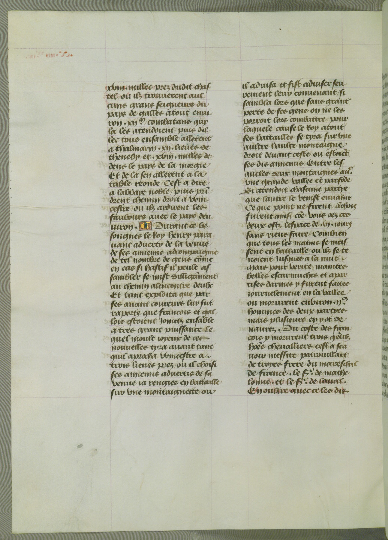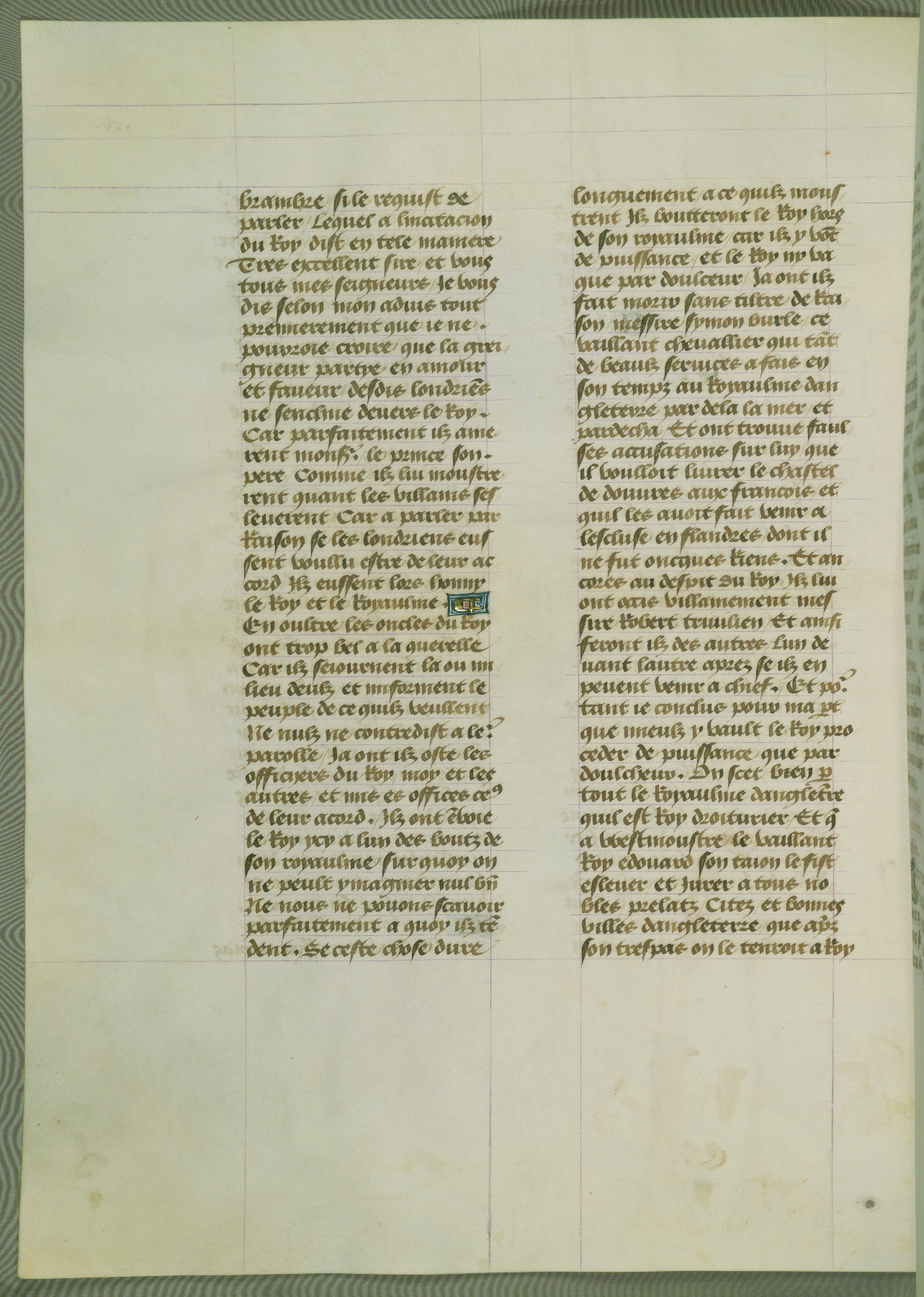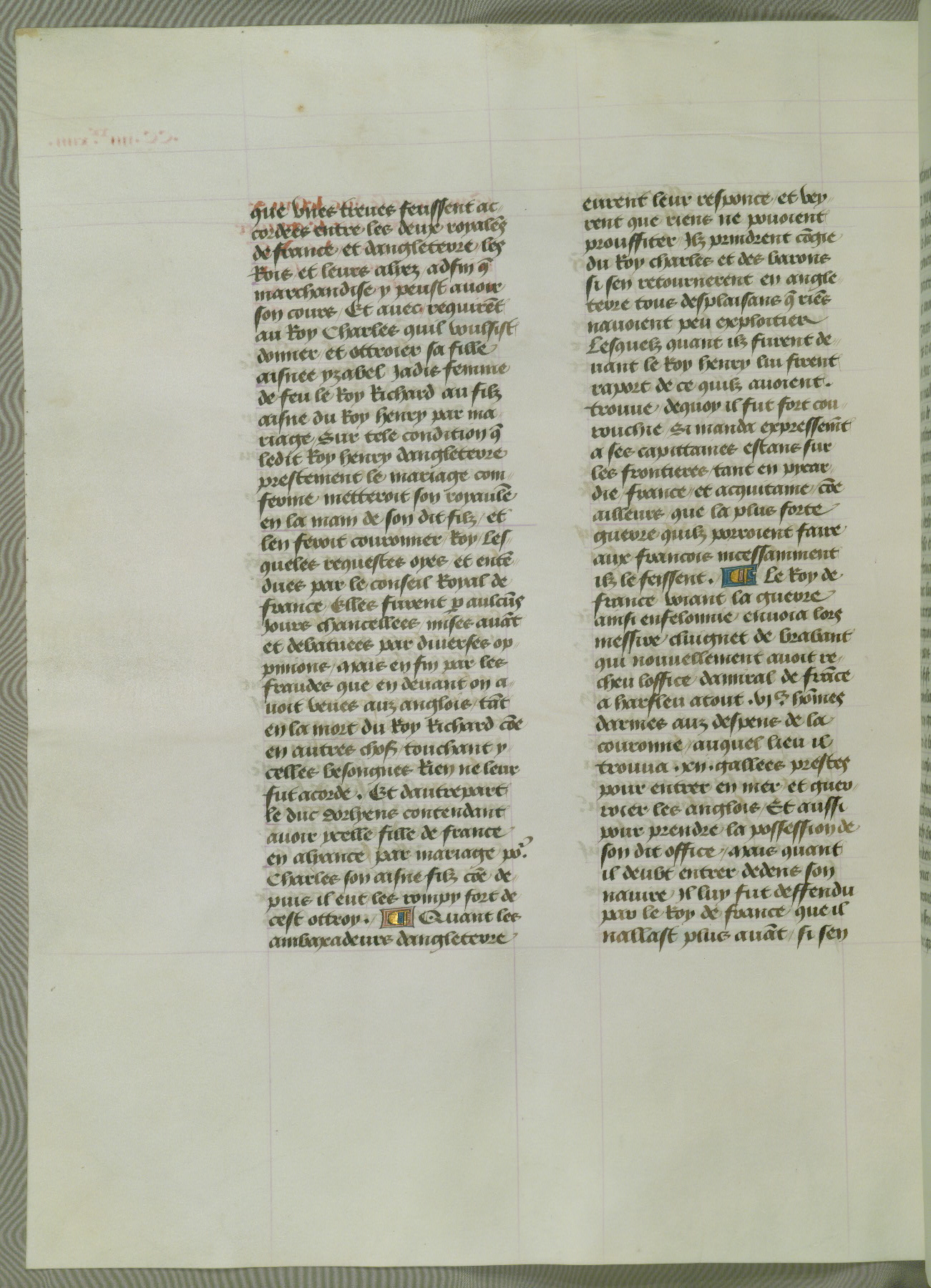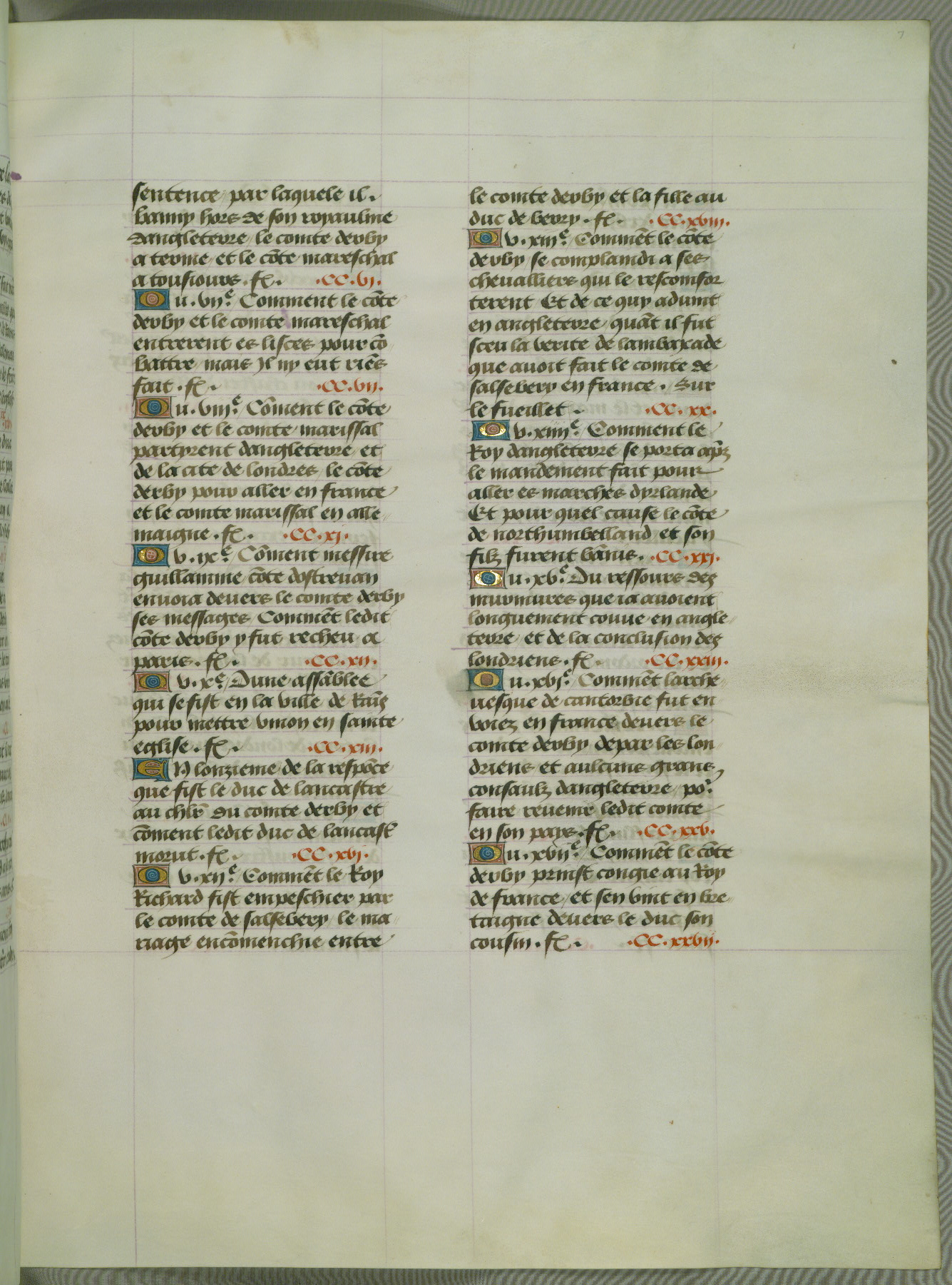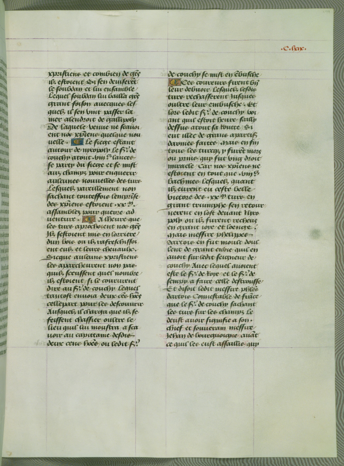 This manuscript is volume IV in a set of five from the collection "Recueil des chroniques et anchiennes istories de la Grant Bretaigne," written by Phillip the Good's counselor and chamberlain Jean de Wavrin. It chronicles the history of England from the early years of the reign of Richard II in 1377 to the demise of Henry IV, his successor, between 1400 and 1413. This volume, produced in Flanders between 1470 and 1480, was part of a set of which volumes II, III and V were recorded in the inventory of the library of William III of Orange in 1686, and was later rebound during the seventeenth or eighteenth century. Six three-quarter-page miniatures open the text of each book and depict events documented therein (with the exception of that of Book 1, portraying Richard II's coronation, which occurs prior to the period detailed in that book). The manuscript's margins are wide and relatively pristine throughout the textblock, but show significant signs of use on illuminated folios, indicating that this manuscript was primarily used for display and not as a historical text. Although few volumes of the Chroniques remain, this manuscript is particularly rare in that it is one of the two surviving exemplars of the text of volume IV, the other being part of the complete set in the Bibliothèque nationale de France (BN fr. 74-85). Volumes II, III, and V of the set to which this volume originally belonged are now in the collection of the Koninklijke Bibliotheek (Den Haag, KB : 133 A 7).