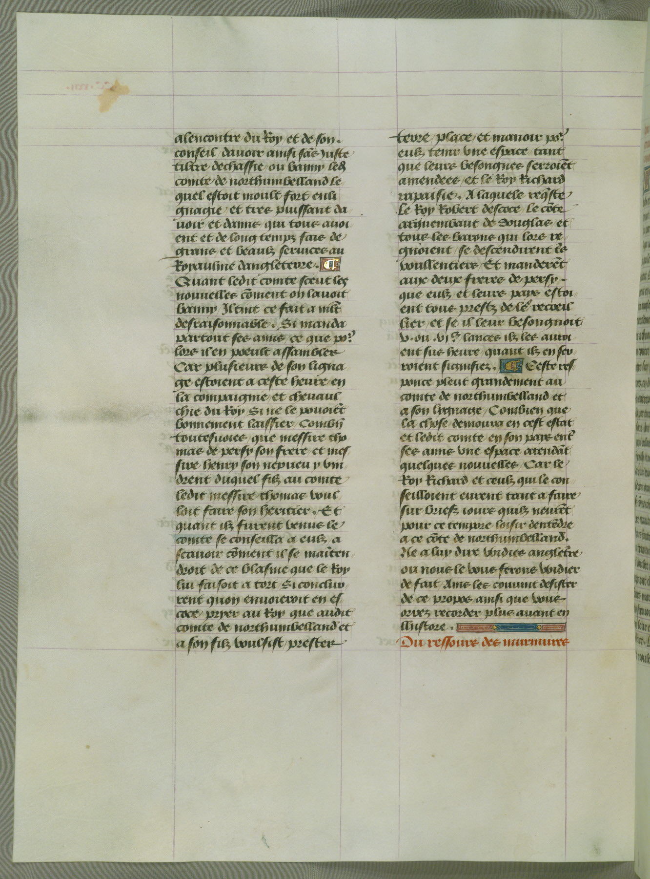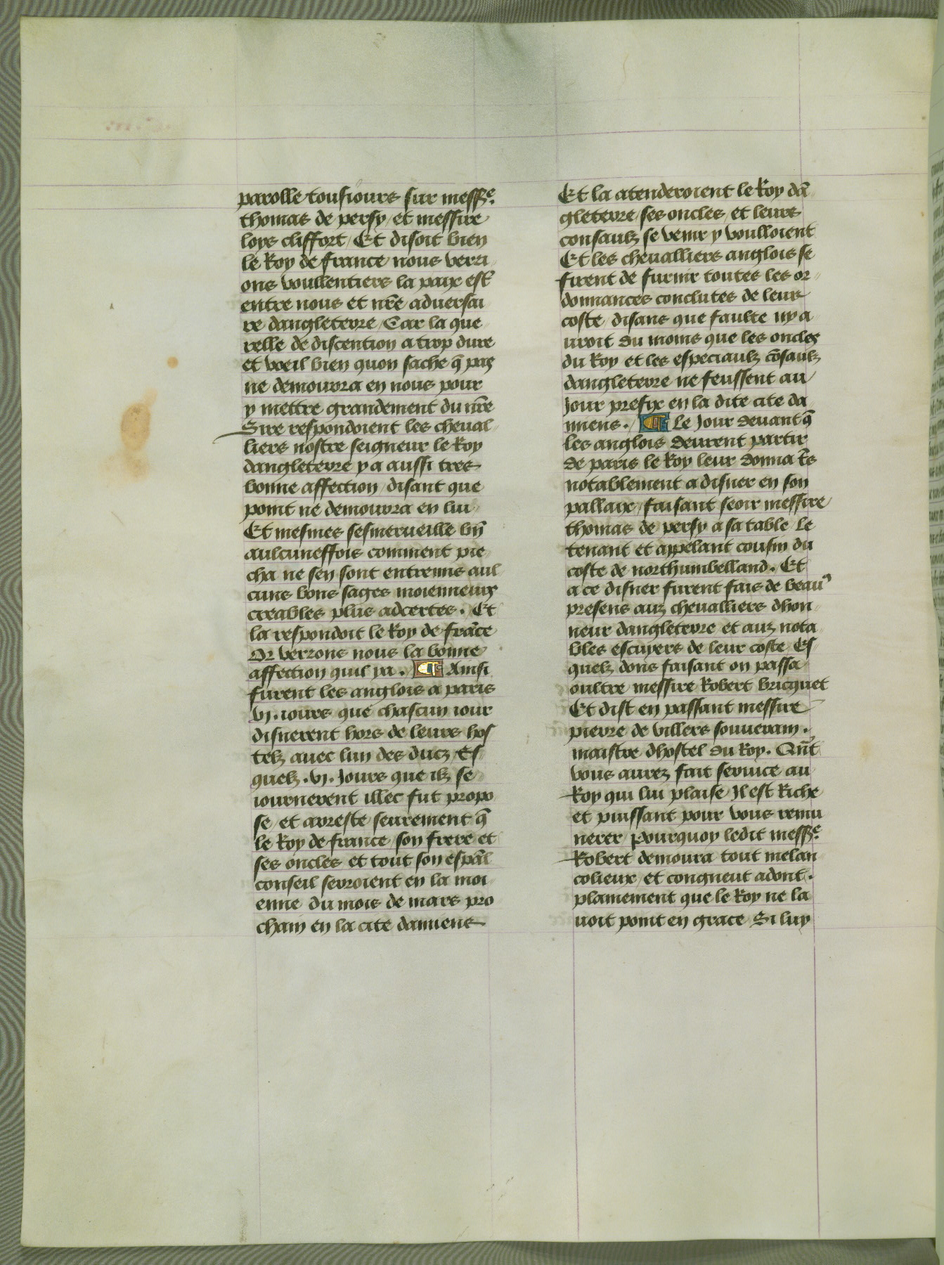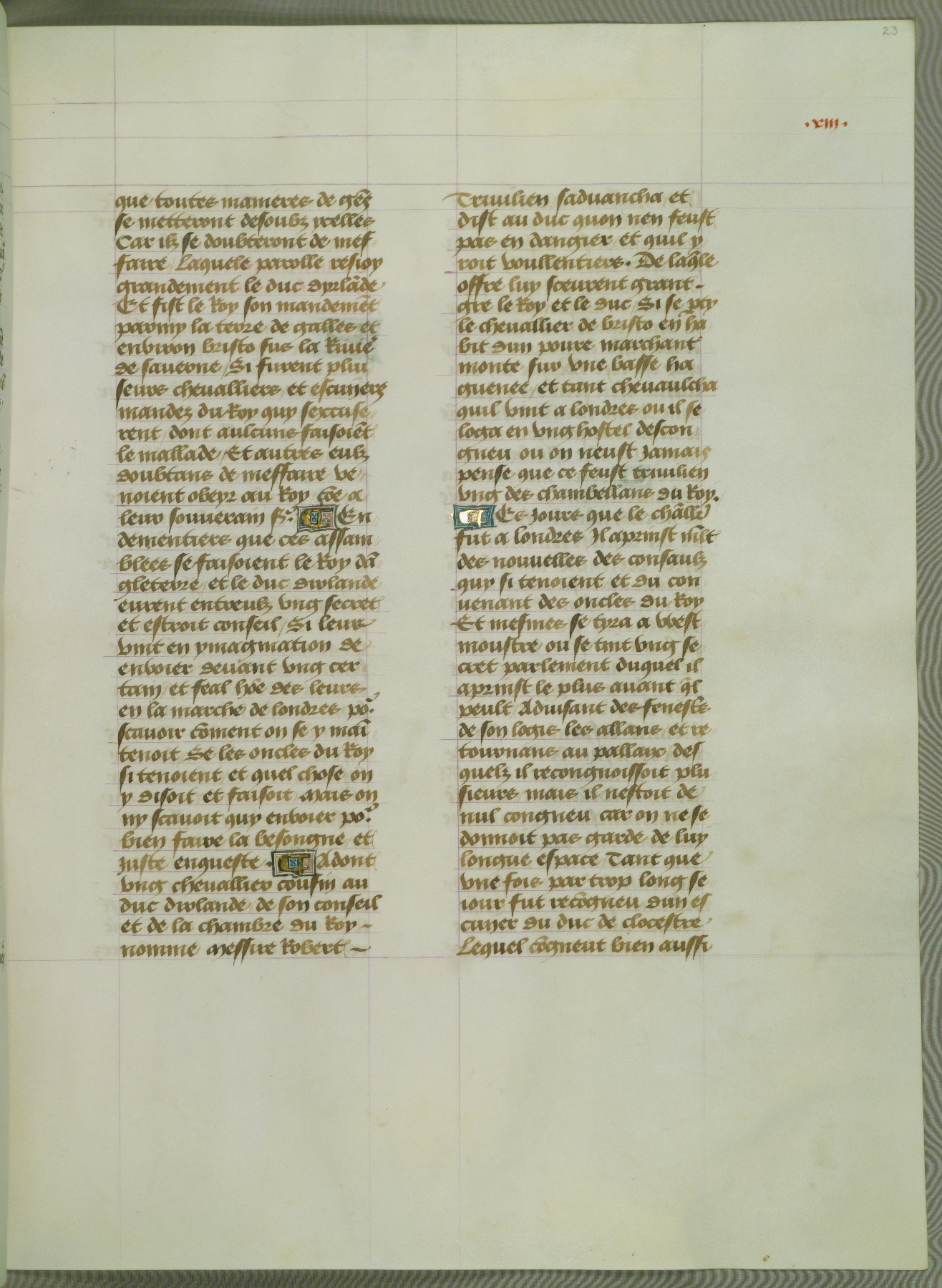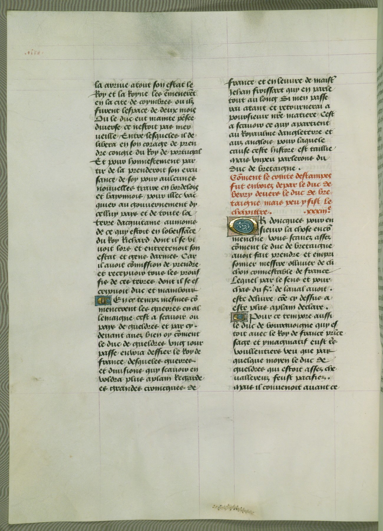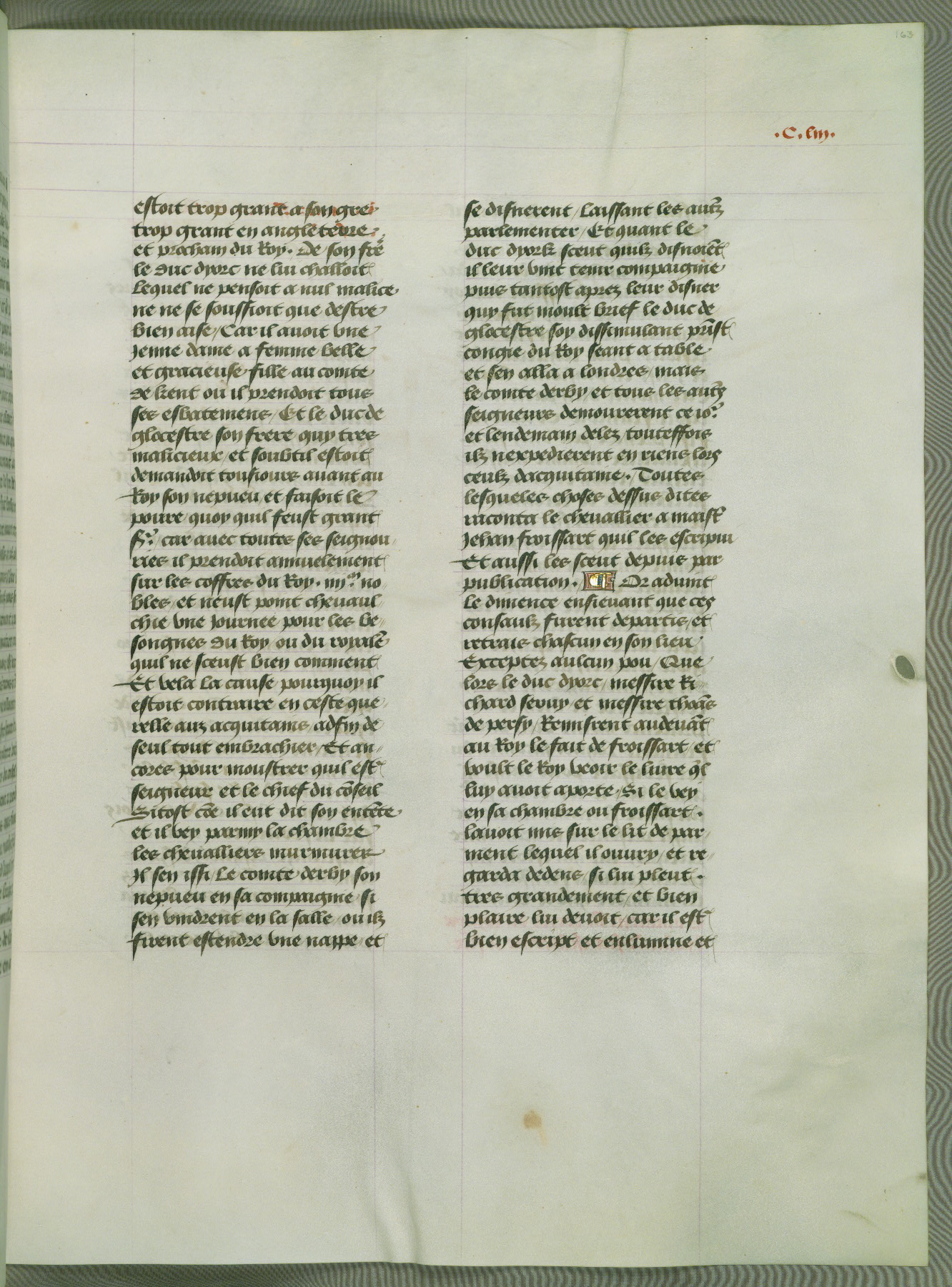 This manuscript is volume IV in a set of five from the collection "Recueil des chroniques et anchiennes istories de la Grant Bretaigne," written by Phillip the Good's counselor and chamberlain Jean de Wavrin. It chronicles the history of England from the early years of the reign of Richard II in 1377 to the demise of Henry IV, his successor, between 1400 and 1413. This volume, produced in Flanders between 1470 and 1480, was part of a set of which volumes II, III and V were recorded in the inventory of the library of William III of Orange in 1686, and was later rebound during the seventeenth or eighteenth century. Six three-quarter-page miniatures open the text of each book and depict events documented therein (with the exception of that of Book 1, portraying Richard II's coronation, which occurs prior to the period detailed in that book). The manuscript's margins are wide and relatively pristine throughout the textblock, but show significant signs of use on illuminated folios, indicating that this manuscript was primarily used for display and not as a historical text. Although few volumes of the Chroniques remain, this manuscript is particularly rare in that it is one of the two surviving exemplars of the text of volume IV, the other being part of the complete set in the Bibliothèque nationale de France (BN fr. 74-85). Volumes II, III, and V of the set to which this volume originally belonged are now in the collection of the Koninklijke Bibliotheek (Den Haag, KB : 133 A 7).