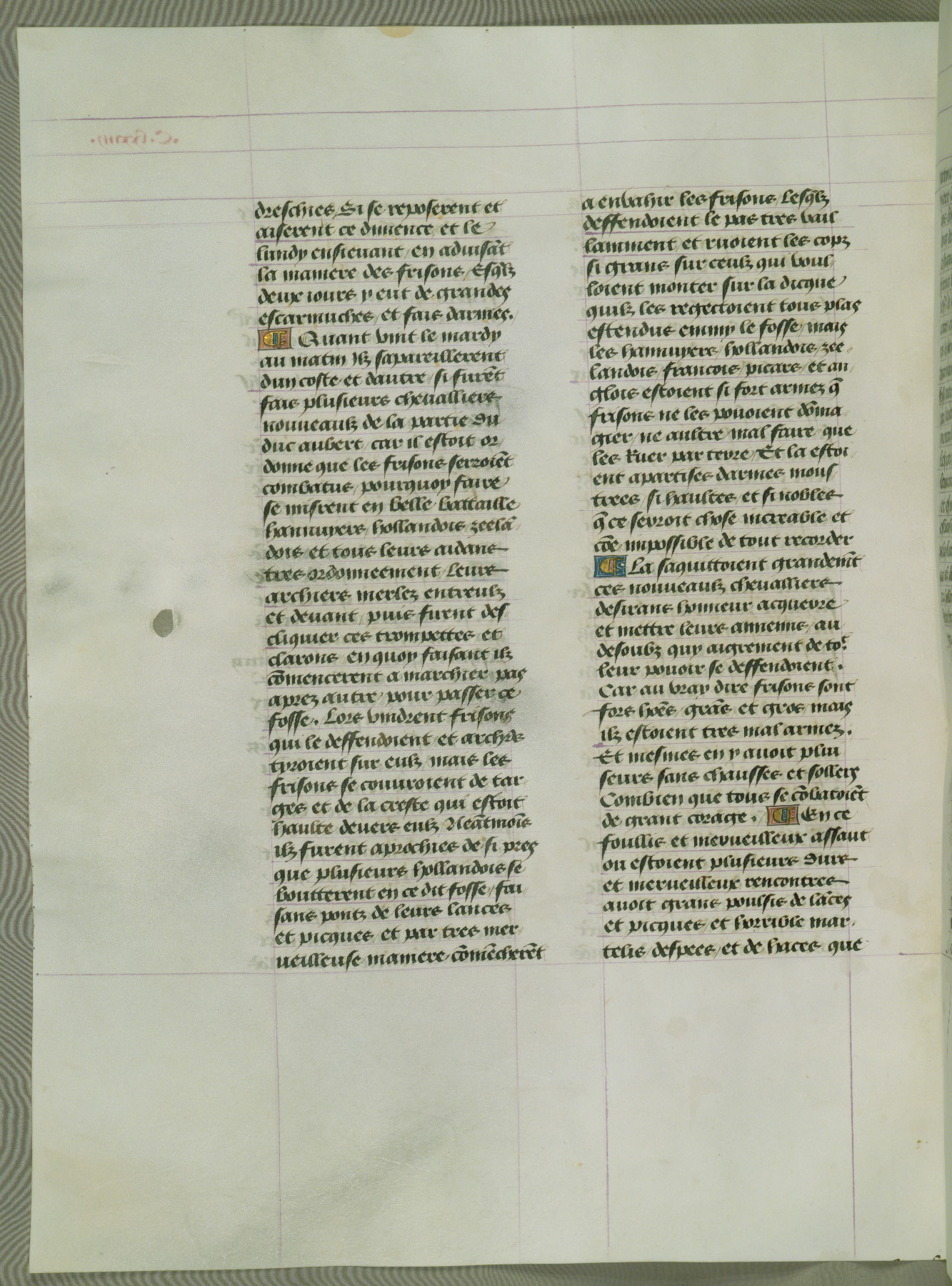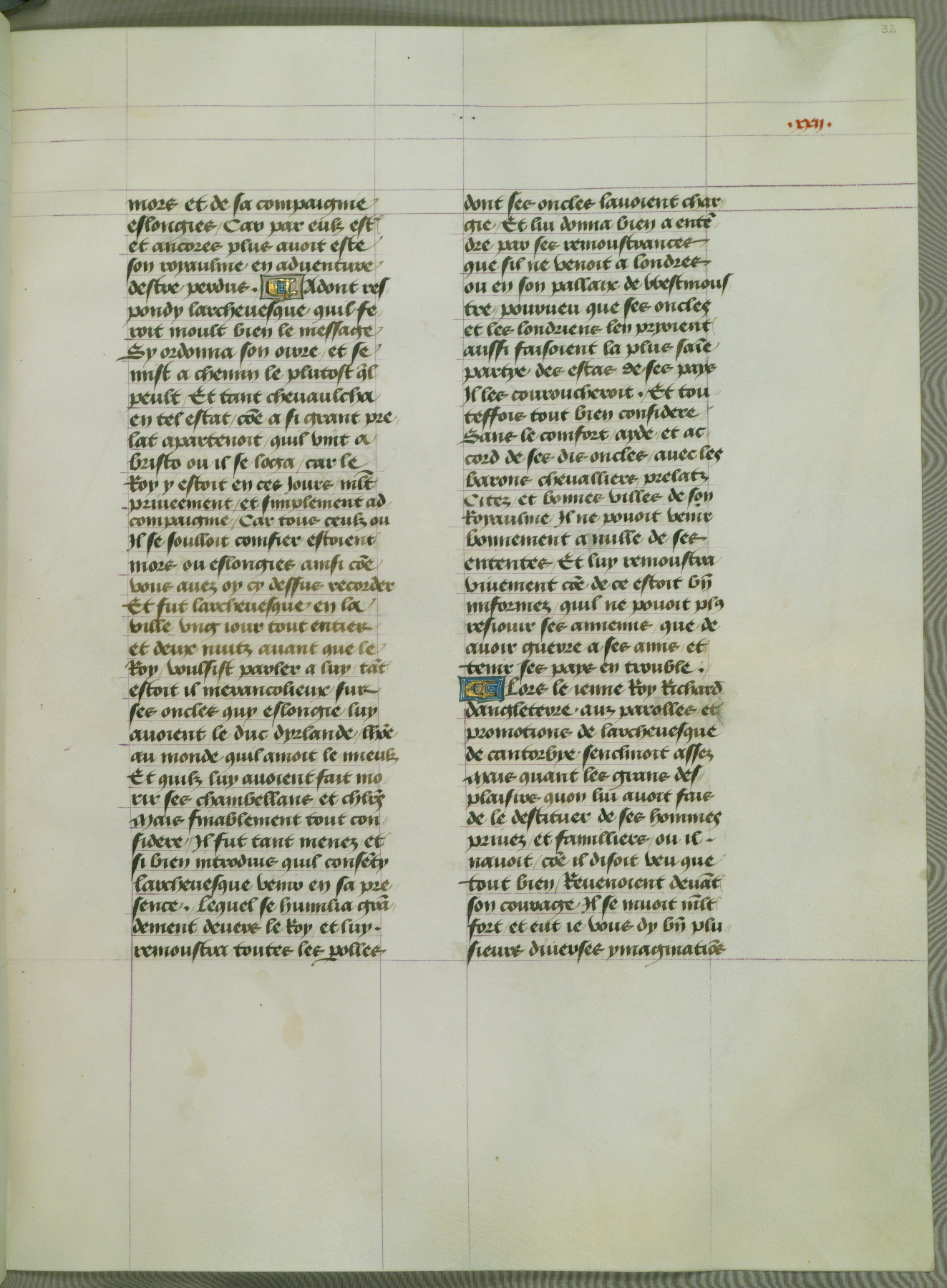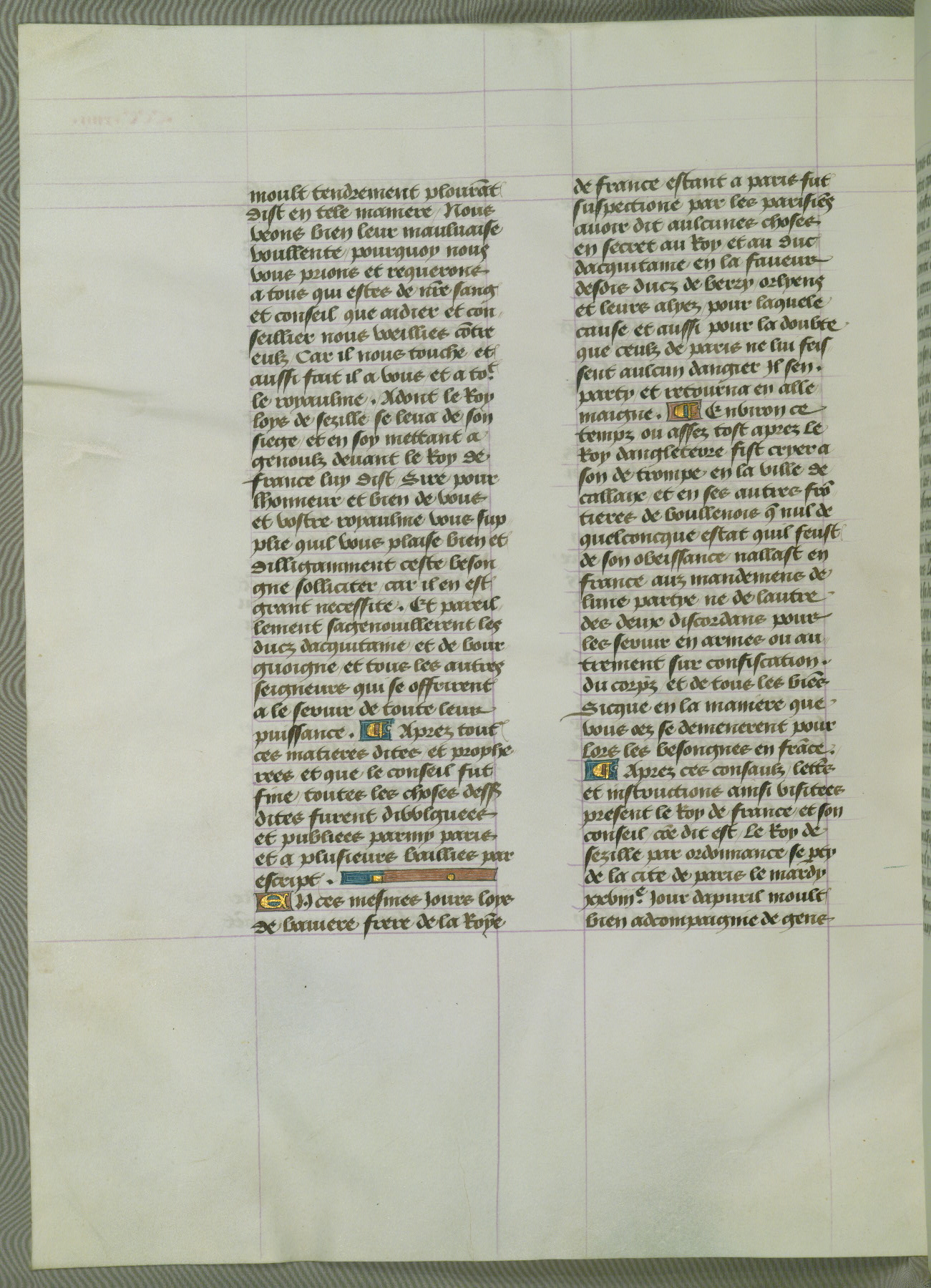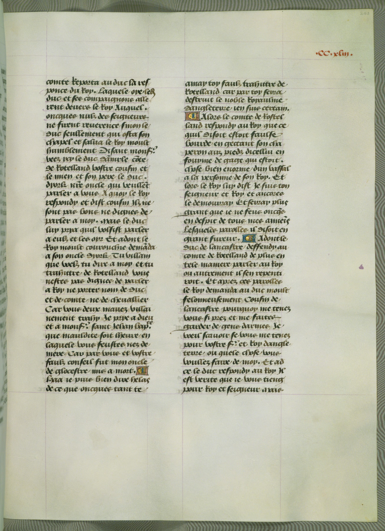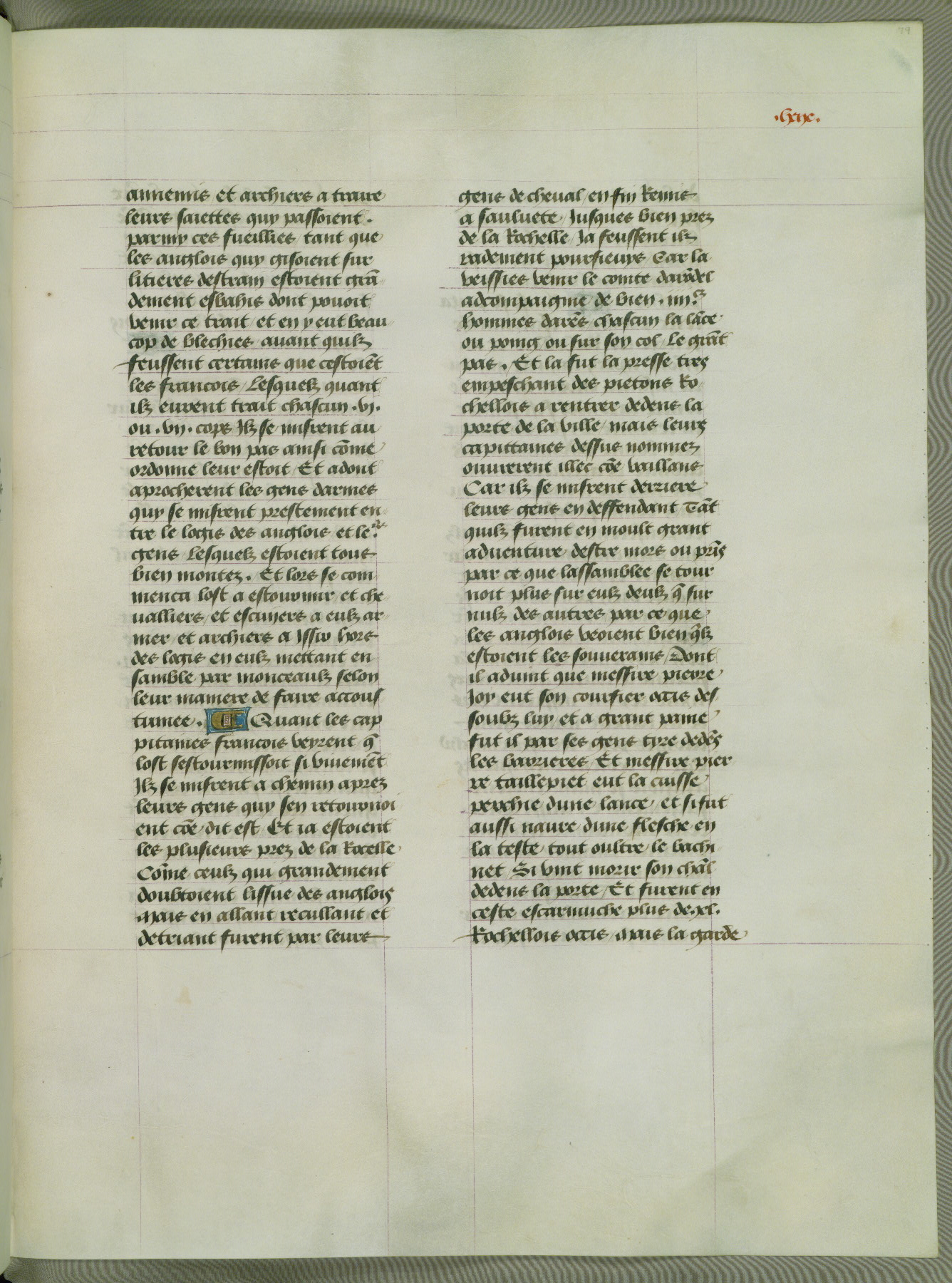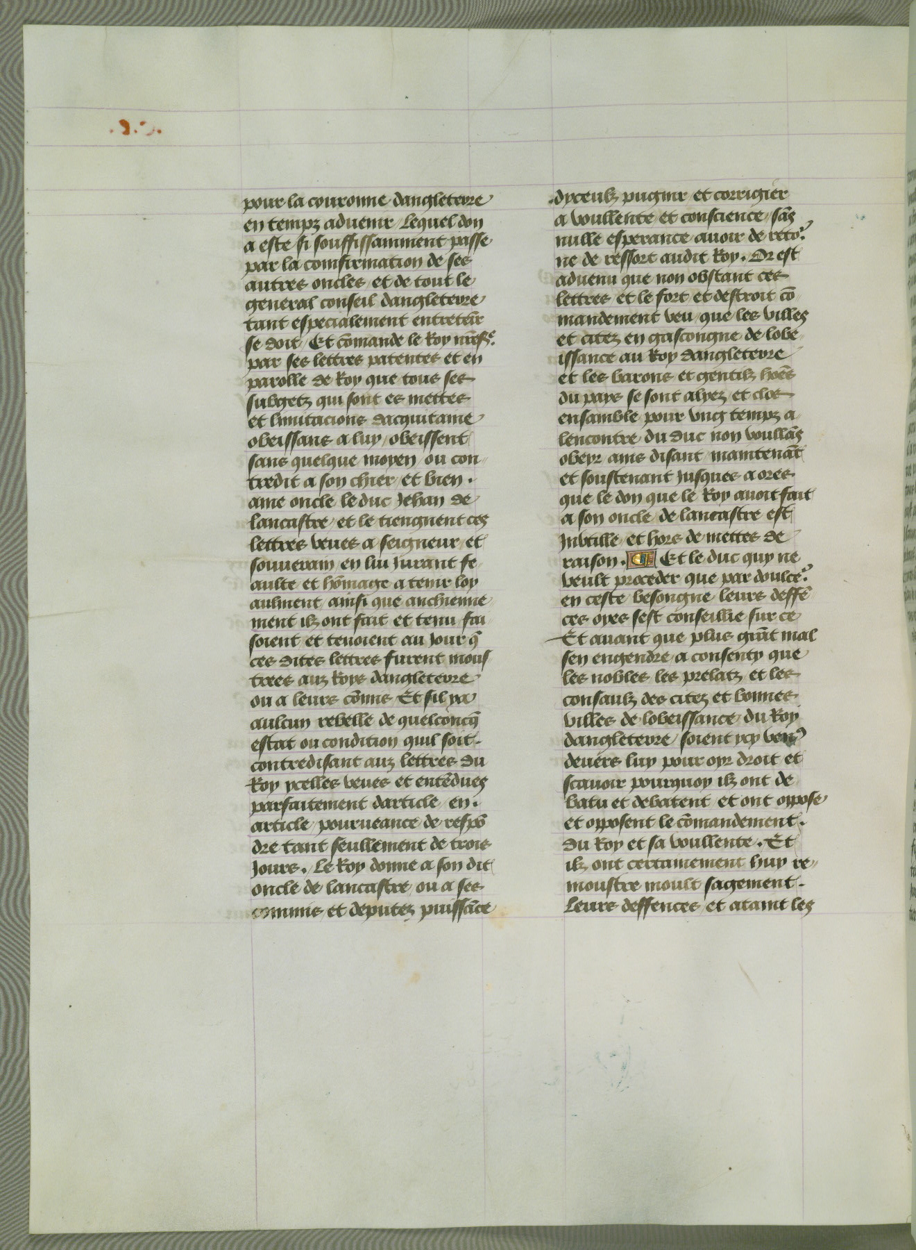 This manuscript is volume IV in a set of five from the collection "Recueil des chroniques et anchiennes istories de la Grant Bretaigne," written by Phillip the Good's counselor and chamberlain Jean de Wavrin. It chronicles the history of England from the early years of the reign of Richard II in 1377 to the demise of Henry IV, his successor, between 1400 and 1413. This volume, produced in Flanders between 1470 and 1480, was part of a set of which volumes II, III and V were recorded in the inventory of the library of William III of Orange in 1686, and was later rebound during the seventeenth or eighteenth century. Six three-quarter-page miniatures open the text of each book and depict events documented therein (with the exception of that of Book 1, portraying Richard II's coronation, which occurs prior to the period detailed in that book). The manuscript's margins are wide and relatively pristine throughout the textblock, but show significant signs of use on illuminated folios, indicating that this manuscript was primarily used for display and not as a historical text. Although few volumes of the Chroniques remain, this manuscript is particularly rare in that it is one of the two surviving exemplars of the text of volume IV, the other being part of the complete set in the Bibliothèque nationale de France (BN fr. 74-85). Volumes II, III, and V of the set to which this volume originally belonged are now in the collection of the Koninklijke Bibliotheek (Den Haag, KB : 133 A 7).