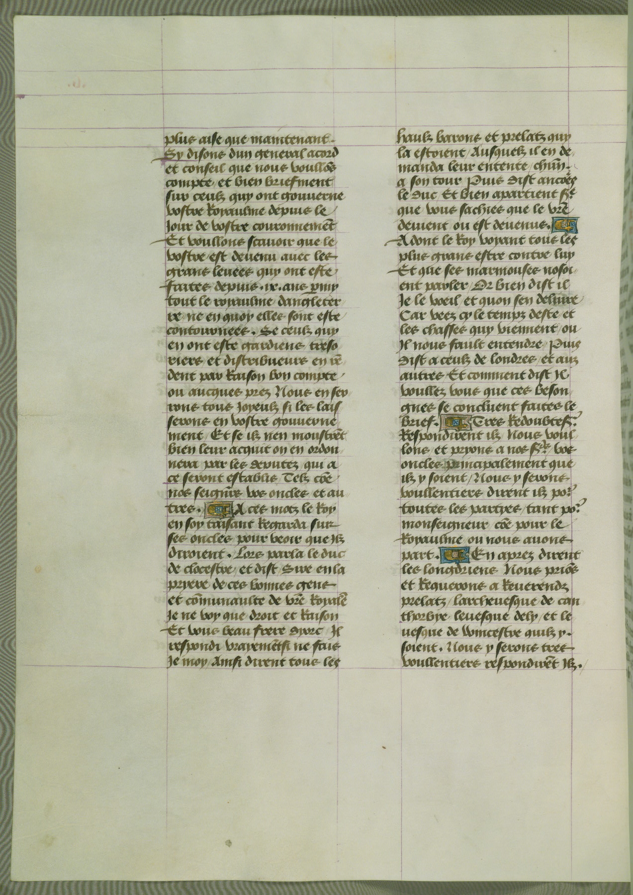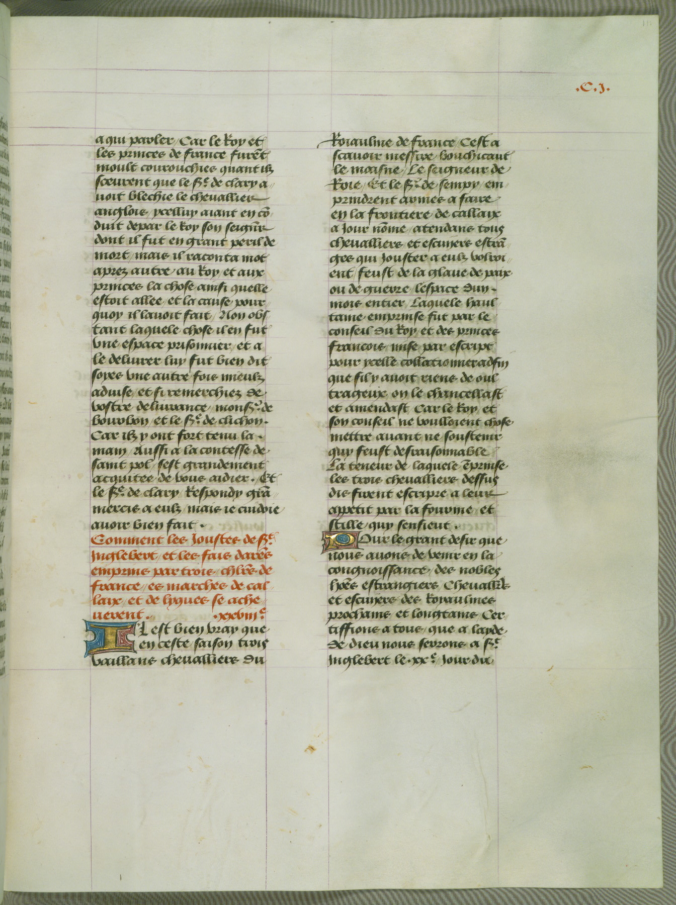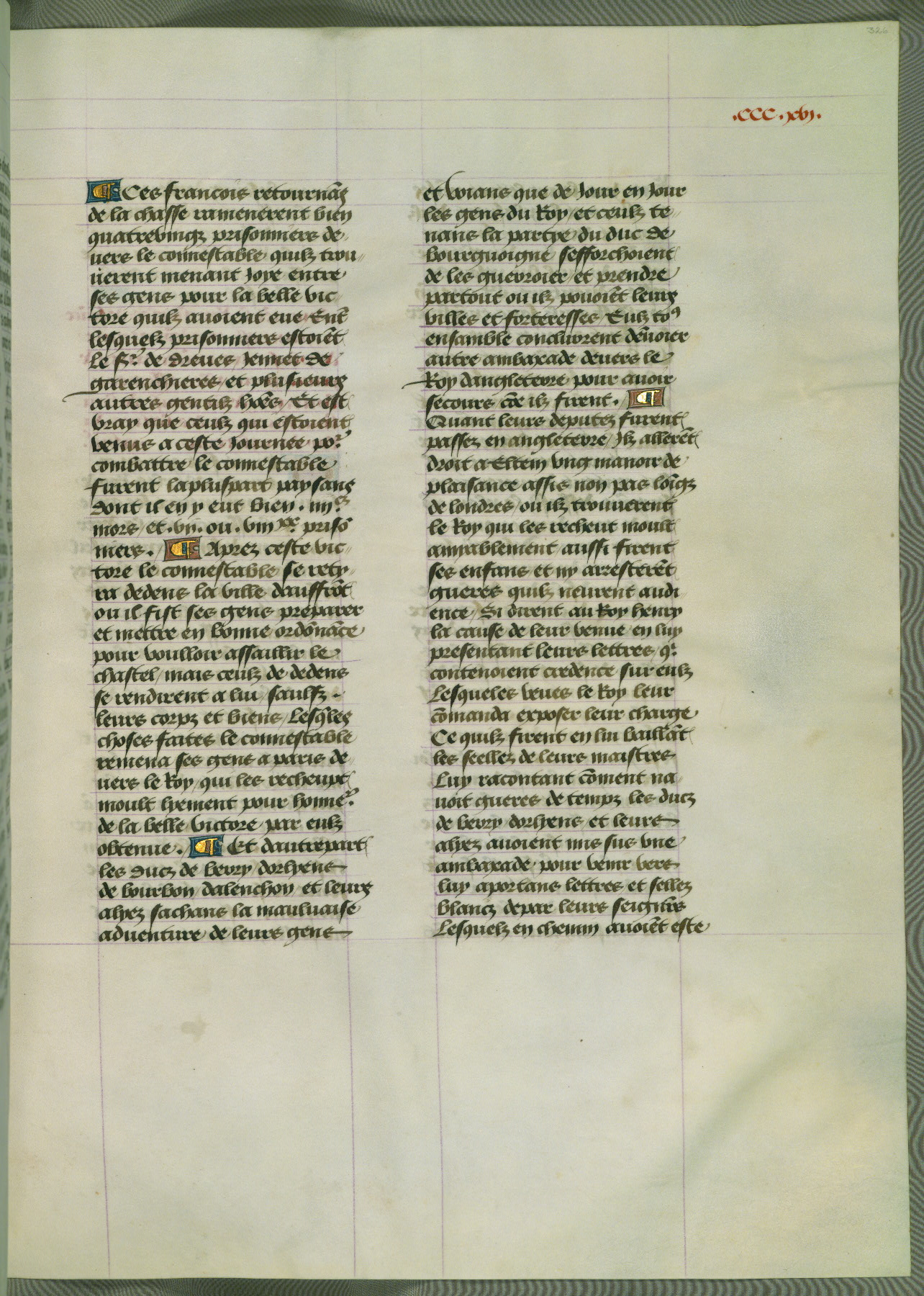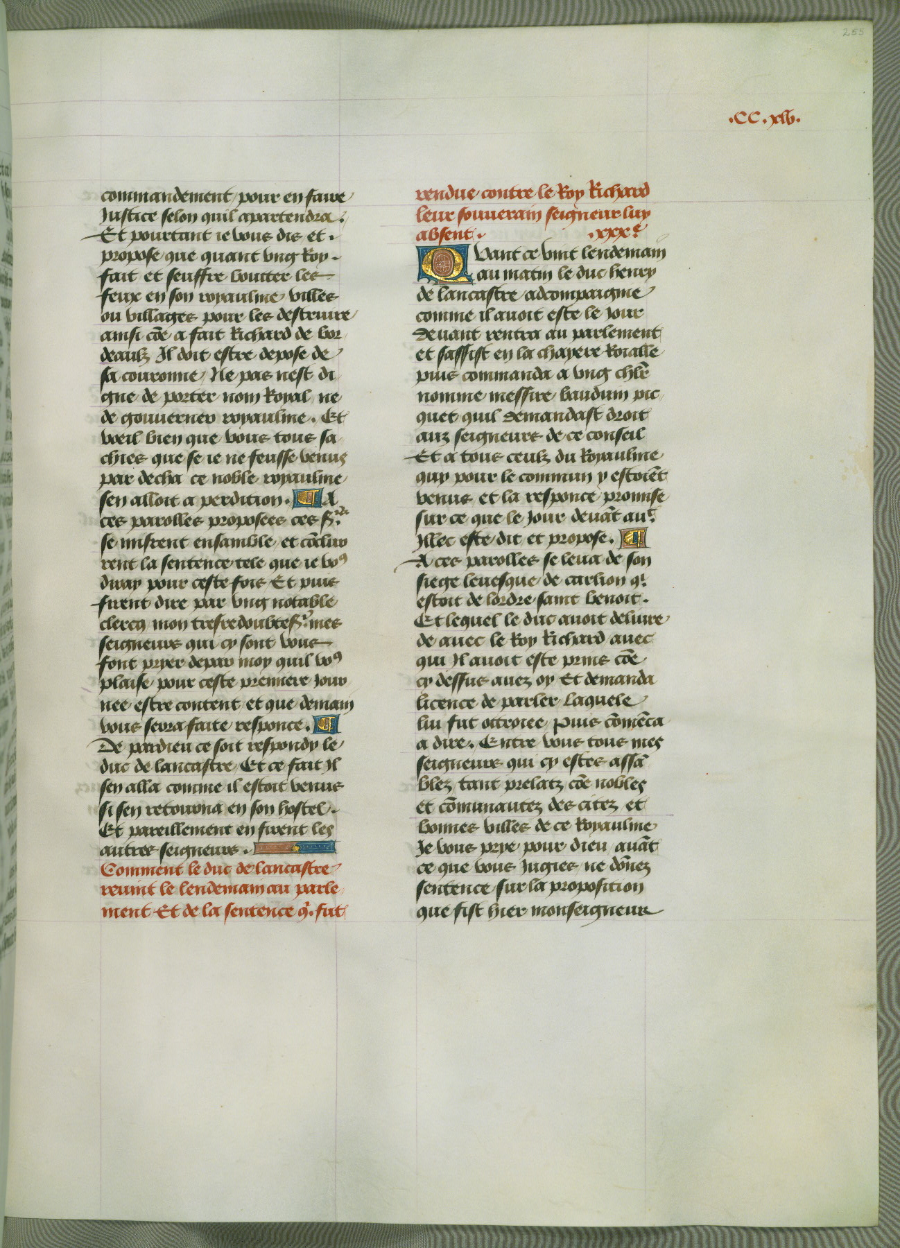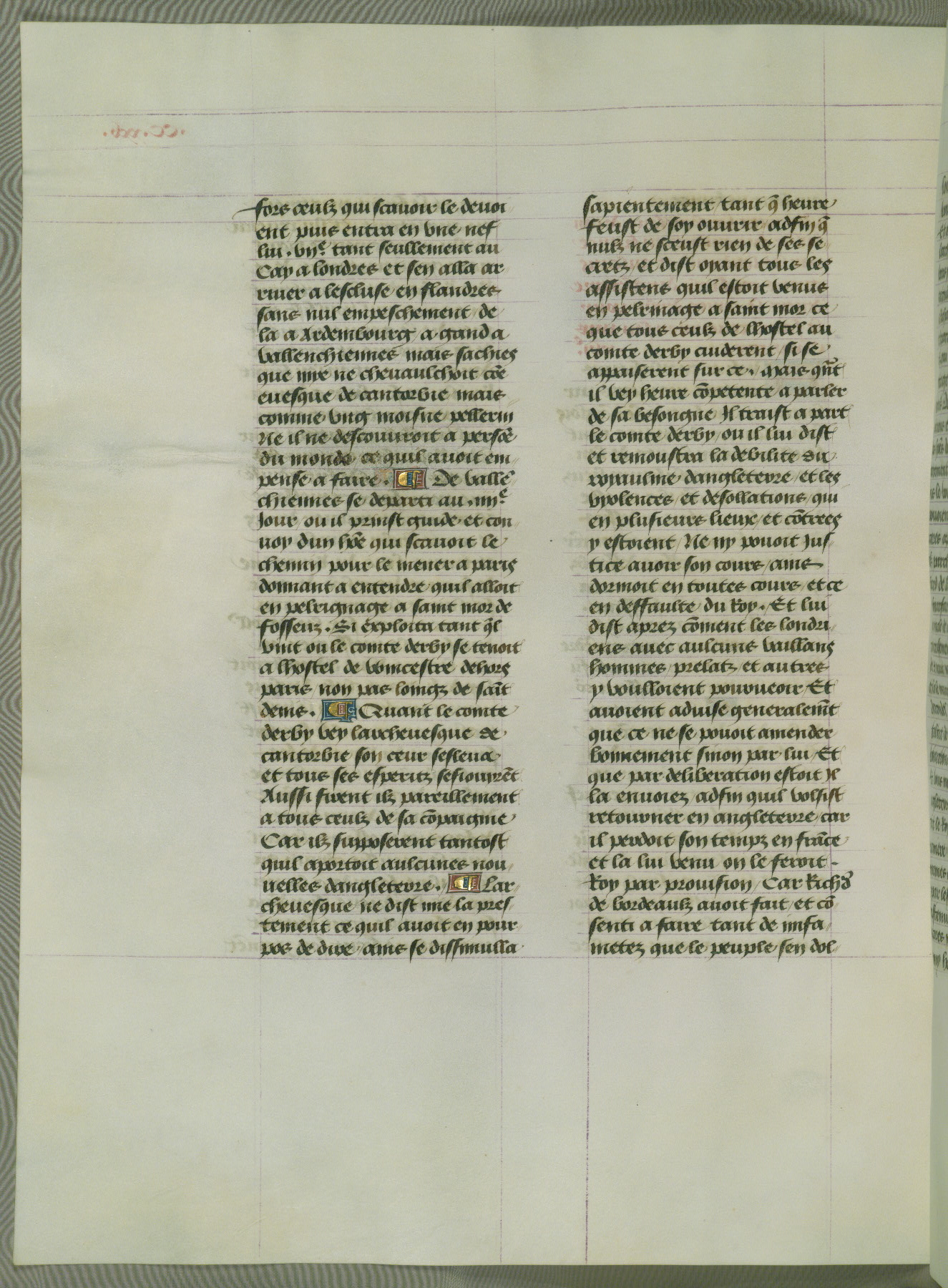 This manuscript is volume IV in a set of five from the collection "Recueil des chroniques et anchiennes istories de la Grant Bretaigne," written by Phillip the Good's counselor and chamberlain Jean de Wavrin. It chronicles the history of England from the early years of the reign of Richard II in 1377 to the demise of Henry IV, his successor, between 1400 and 1413. This volume, produced in Flanders between 1470 and 1480, was part of a set of which volumes II, III and V were recorded in the inventory of the library of William III of Orange in 1686, and was later rebound during the seventeenth or eighteenth century. Six three-quarter-page miniatures open the text of each book and depict events documented therein (with the exception of that of Book 1, portraying Richard II's coronation, which occurs prior to the period detailed in that book). The manuscript's margins are wide and relatively pristine throughout the textblock, but show significant signs of use on illuminated folios, indicating that this manuscript was primarily used for display and not as a historical text. Although few volumes of the Chroniques remain, this manuscript is particularly rare in that it is one of the two surviving exemplars of the text of volume IV, the other being part of the complete set in the Bibliothèque nationale de France (BN fr. 74-85). Volumes II, III, and V of the set to which this volume originally belonged are now in the collection of the Koninklijke Bibliotheek (Den Haag, KB : 133 A 7).