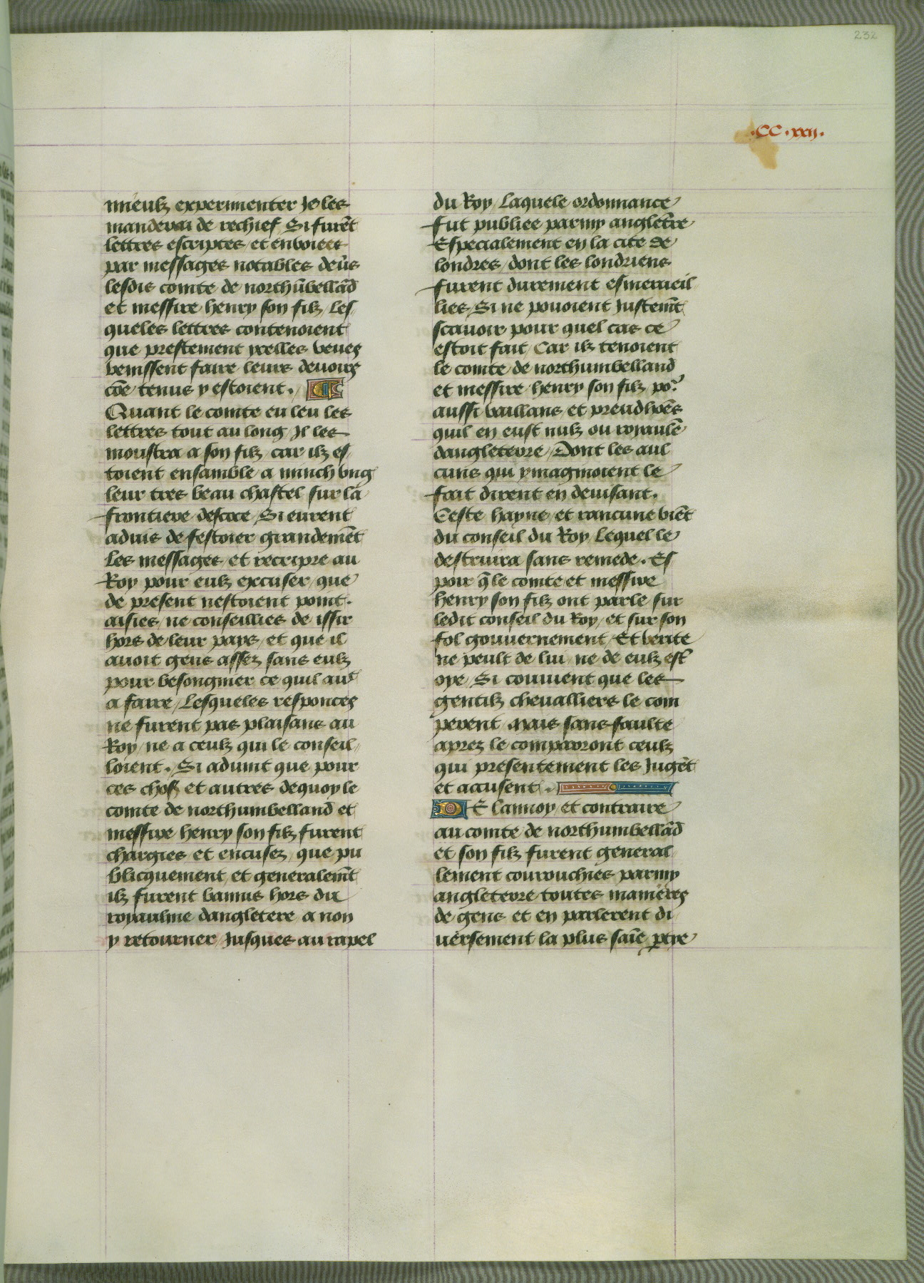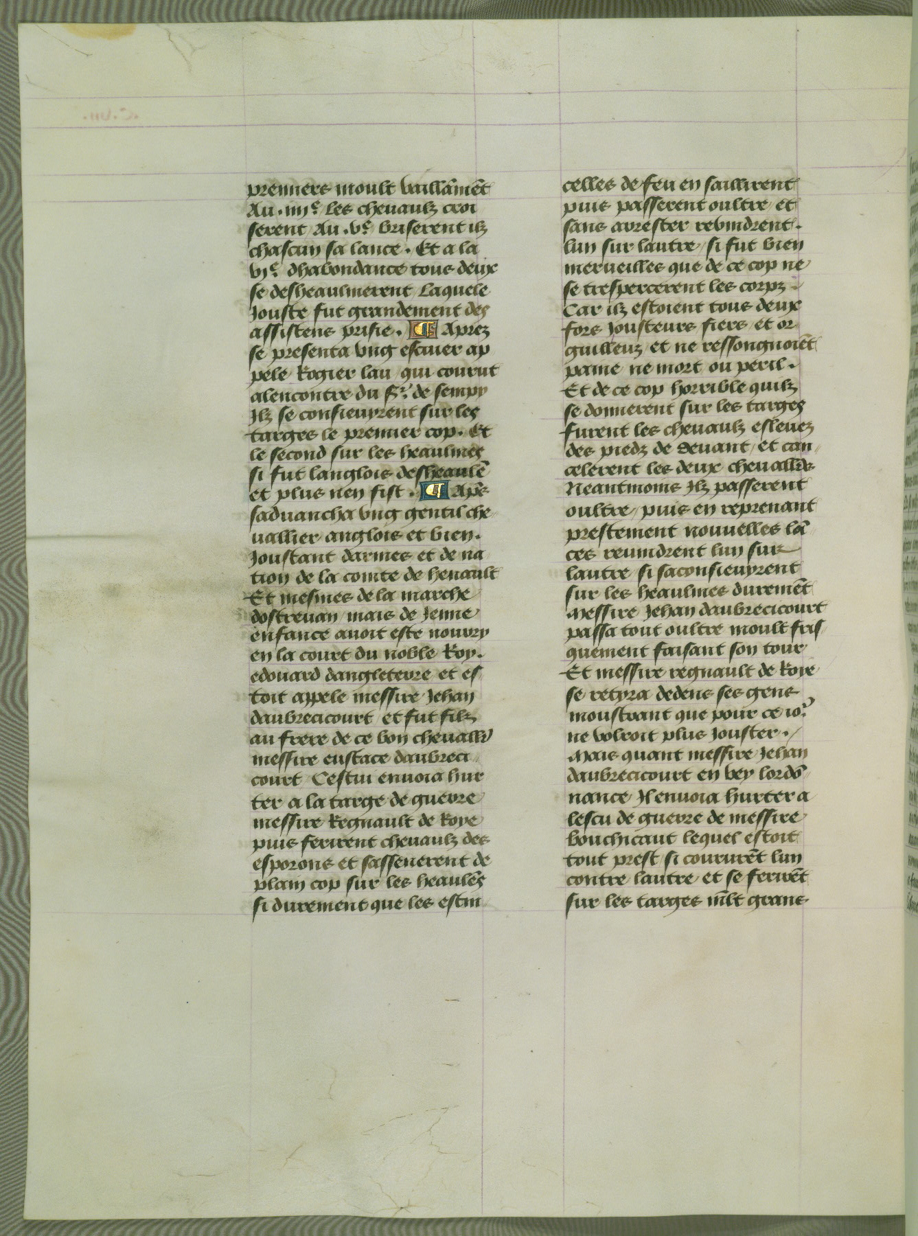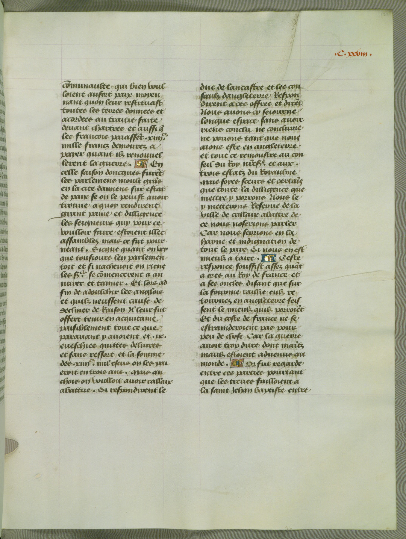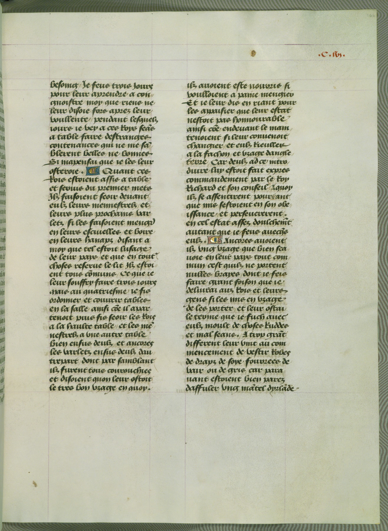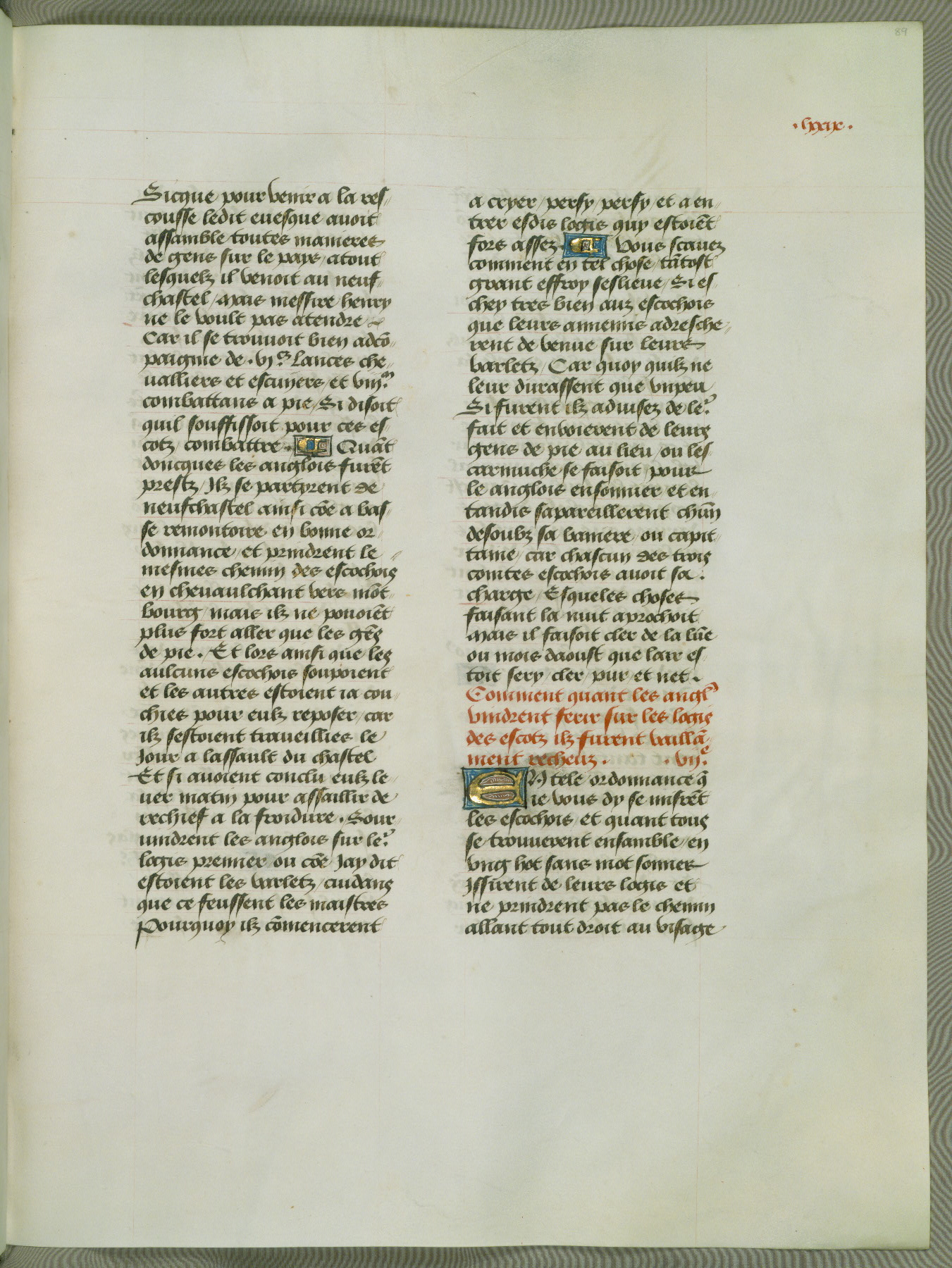 This manuscript is volume IV in a set of five from the collection "Recueil des chroniques et anchiennes istories de la Grant Bretaigne," written by Phillip the Good's counselor and chamberlain Jean de Wavrin. It chronicles the history of England from the early years of the reign of Richard II in 1377 to the demise of Henry IV, his successor, between 1400 and 1413. This volume, produced in Flanders between 1470 and 1480, was part of a set of which volumes II, III and V were recorded in the inventory of the library of William III of Orange in 1686, and was later rebound during the seventeenth or eighteenth century. Six three-quarter-page miniatures open the text of each book and depict events documented therein (with the exception of that of Book 1, portraying Richard II's coronation, which occurs prior to the period detailed in that book). The manuscript's margins are wide and relatively pristine throughout the textblock, but show significant signs of use on illuminated folios, indicating that this manuscript was primarily used for display and not as a historical text. Although few volumes of the Chroniques remain, this manuscript is particularly rare in that it is one of the two surviving exemplars of the text of volume IV, the other being part of the complete set in the Bibliothèque nationale de France (BN fr. 74-85). Volumes II, III, and V of the set to which this volume originally belonged are now in the collection of the Koninklijke Bibliotheek (Den Haag, KB : 133 A 7).