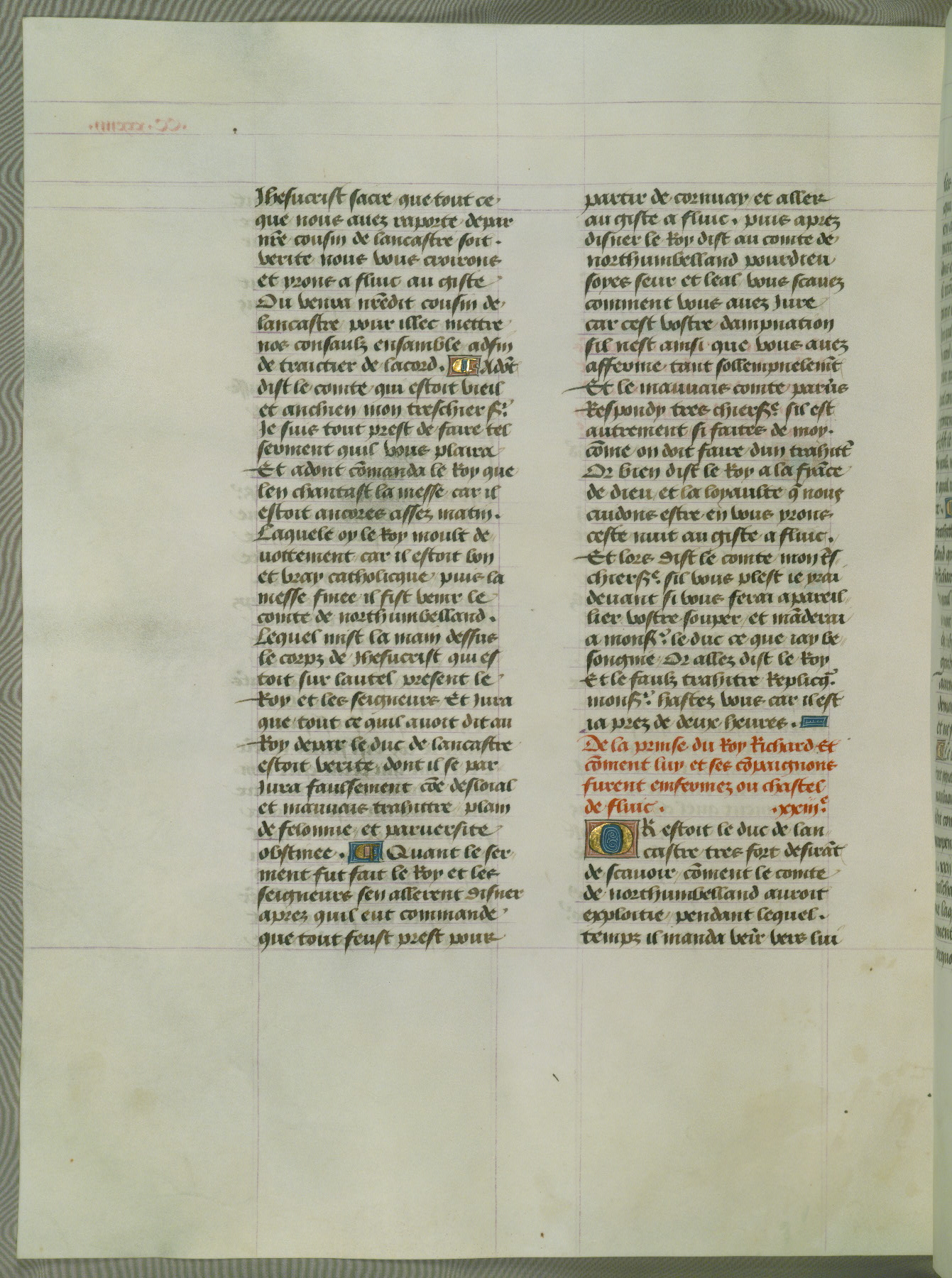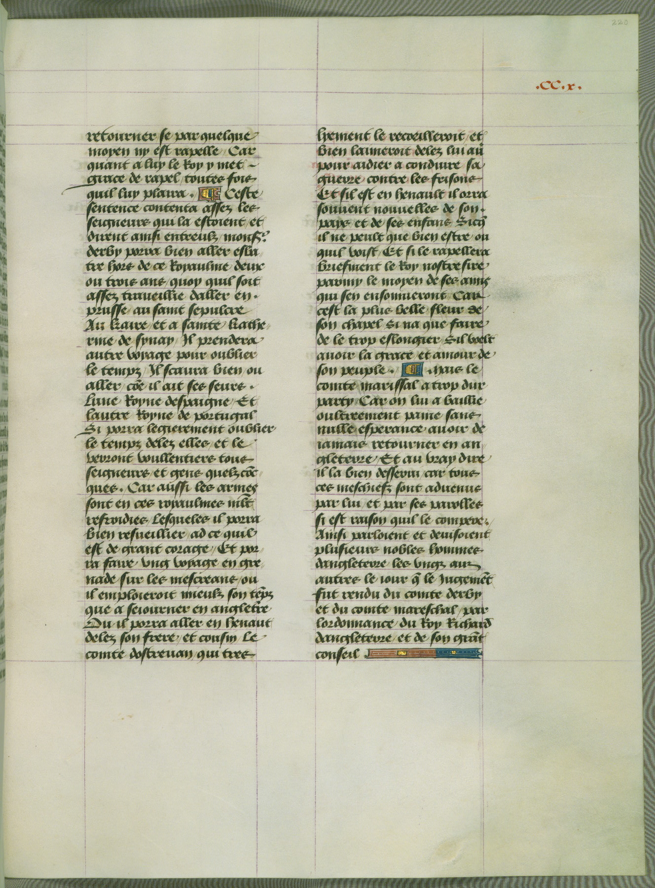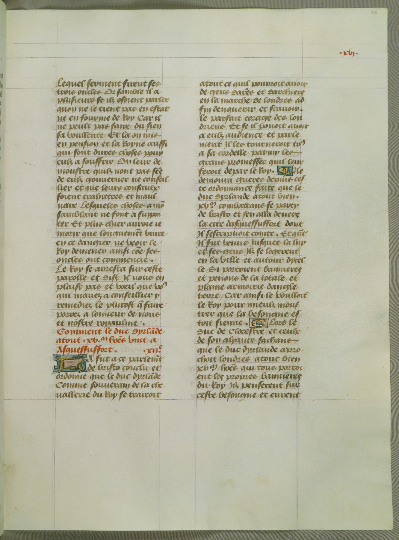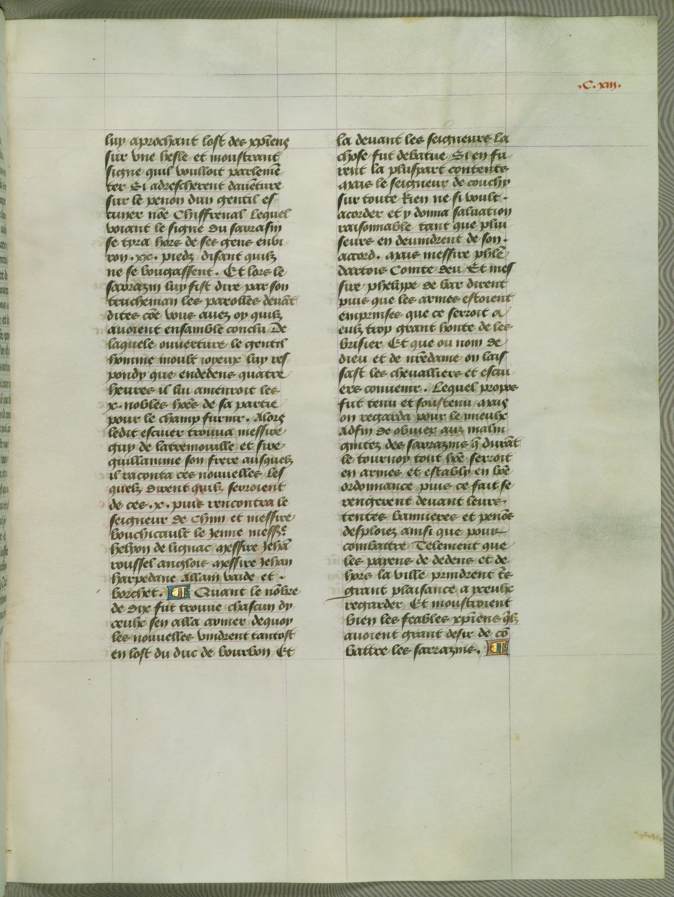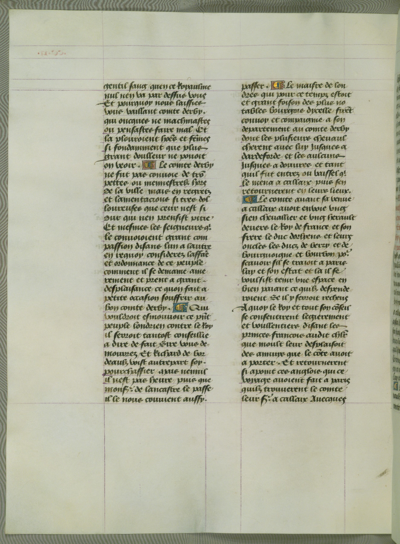 This manuscript is volume IV in a set of five from the collection "Recueil des chroniques et anchiennes istories de la Grant Bretaigne," written by Phillip the Good's counselor and chamberlain Jean de Wavrin. It chronicles the history of England from the early years of the reign of Richard II in 1377 to the demise of Henry IV, his successor, between 1400 and 1413. This volume, produced in Flanders between 1470 and 1480, was part of a set of which volumes II, III and V were recorded in the inventory of the library of William III of Orange in 1686, and was later rebound during the seventeenth or eighteenth century. Six three-quarter-page miniatures open the text of each book and depict events documented therein (with the exception of that of Book 1, portraying Richard II's coronation, which occurs prior to the period detailed in that book). The manuscript's margins are wide and relatively pristine throughout the textblock, but show significant signs of use on illuminated folios, indicating that this manuscript was primarily used for display and not as a historical text. Although few volumes of the Chroniques remain, this manuscript is particularly rare in that it is one of the two surviving exemplars of the text of volume IV, the other being part of the complete set in the Bibliothèque nationale de France (BN fr. 74-85). Volumes II, III, and V of the set to which this volume originally belonged are now in the collection of the Koninklijke Bibliotheek (Den Haag, KB : 133 A 7).