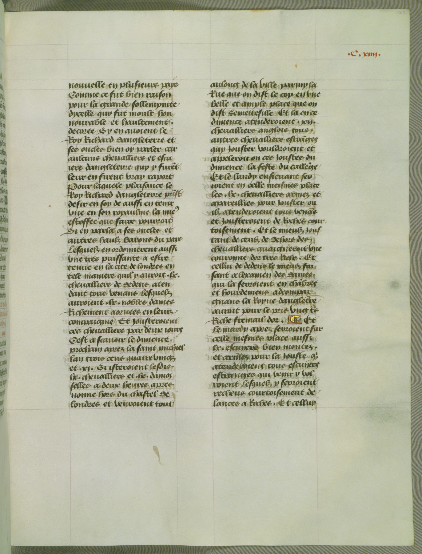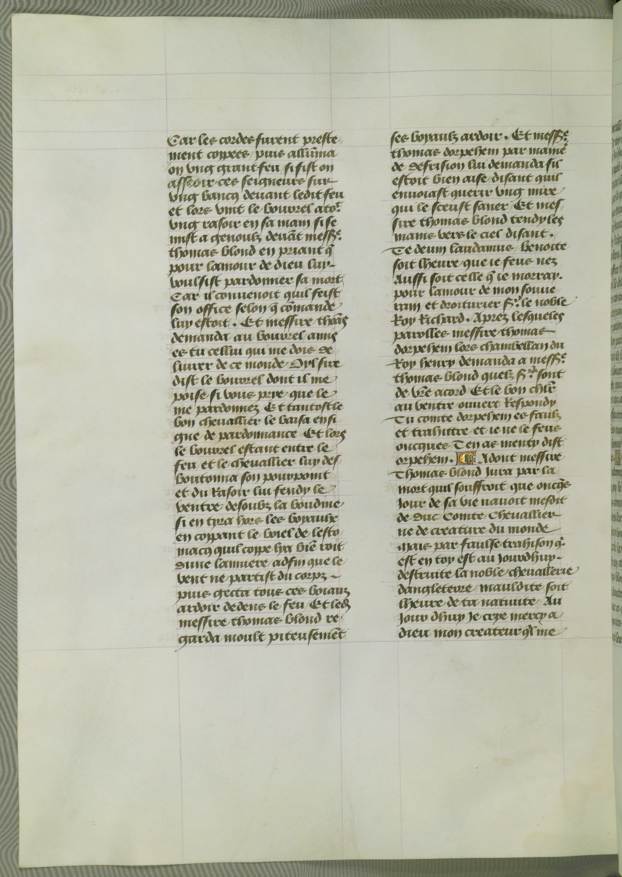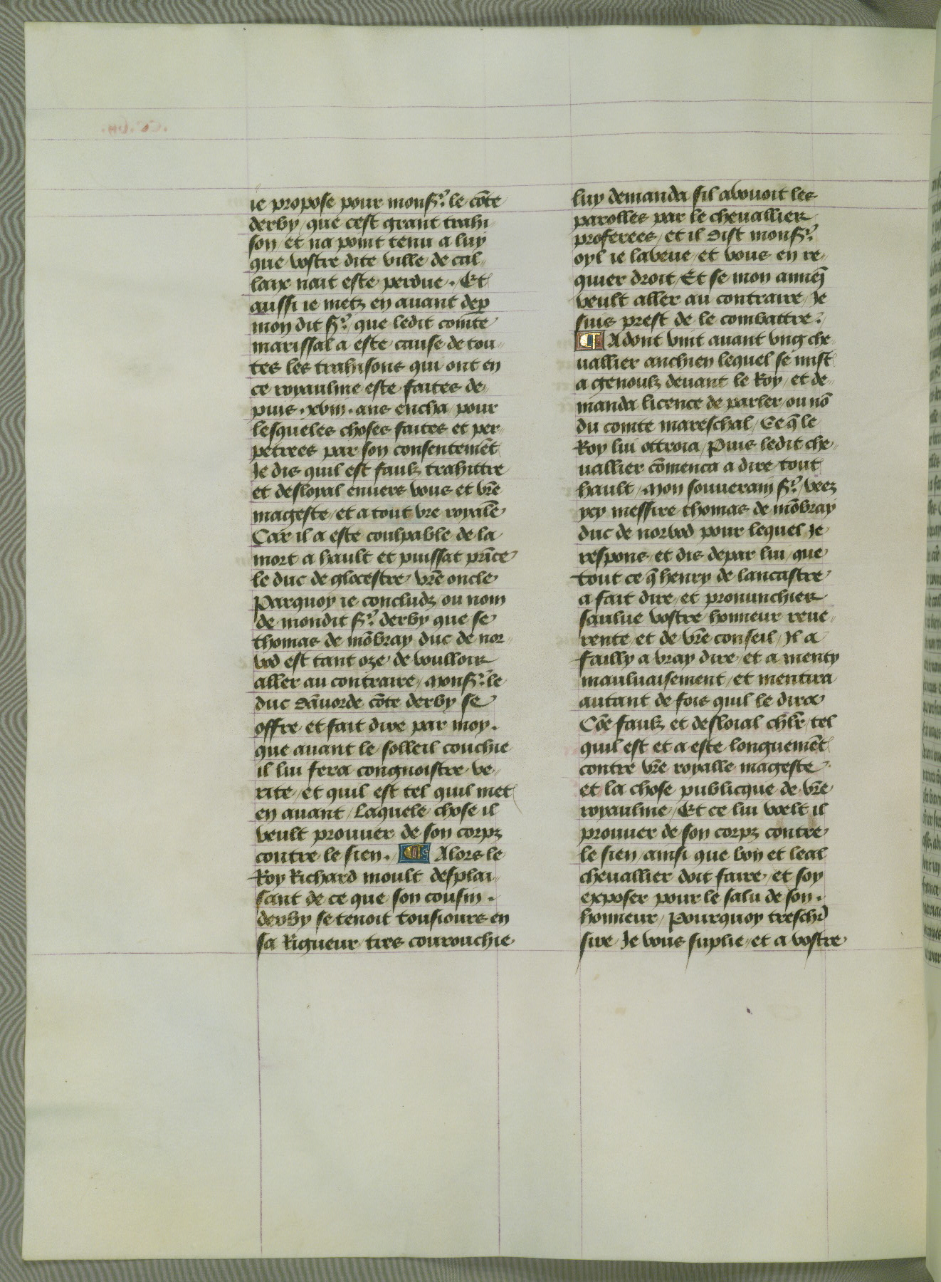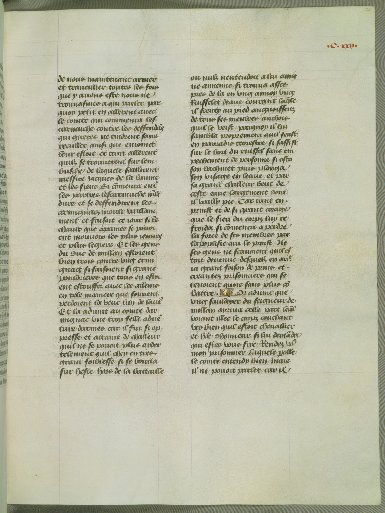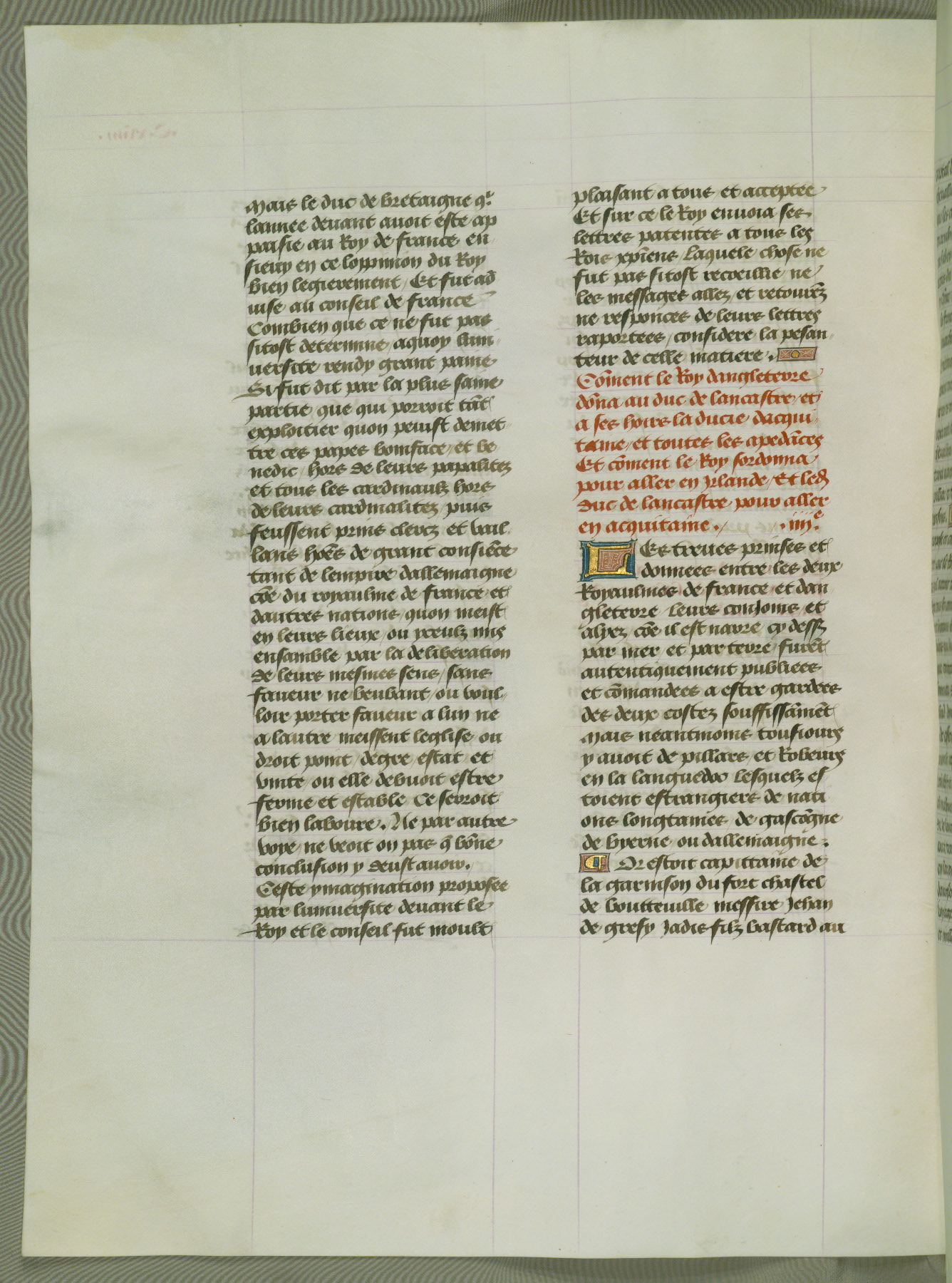 This manuscript is volume IV in a set of five from the collection "Recueil des chroniques et anchiennes istories de la Grant Bretaigne," written by Phillip the Good's counselor and chamberlain Jean de Wavrin. It chronicles the history of England from the early years of the reign of Richard II in 1377 to the demise of Henry IV, his successor, between 1400 and 1413. This volume, produced in Flanders between 1470 and 1480, was part of a set of which volumes II, III and V were recorded in the inventory of the library of William III of Orange in 1686, and was later rebound during the seventeenth or eighteenth century. Six three-quarter-page miniatures open the text of each book and depict events documented therein (with the exception of that of Book 1, portraying Richard II's coronation, which occurs prior to the period detailed in that book). The manuscript's margins are wide and relatively pristine throughout the textblock, but show significant signs of use on illuminated folios, indicating that this manuscript was primarily used for display and not as a historical text. Although few volumes of the Chroniques remain, this manuscript is particularly rare in that it is one of the two surviving exemplars of the text of volume IV, the other being part of the complete set in the Bibliothèque nationale de France (BN fr. 74-85). Volumes II, III, and V of the set to which this volume originally belonged are now in the collection of the Koninklijke Bibliotheek (Den Haag, KB : 133 A 7).