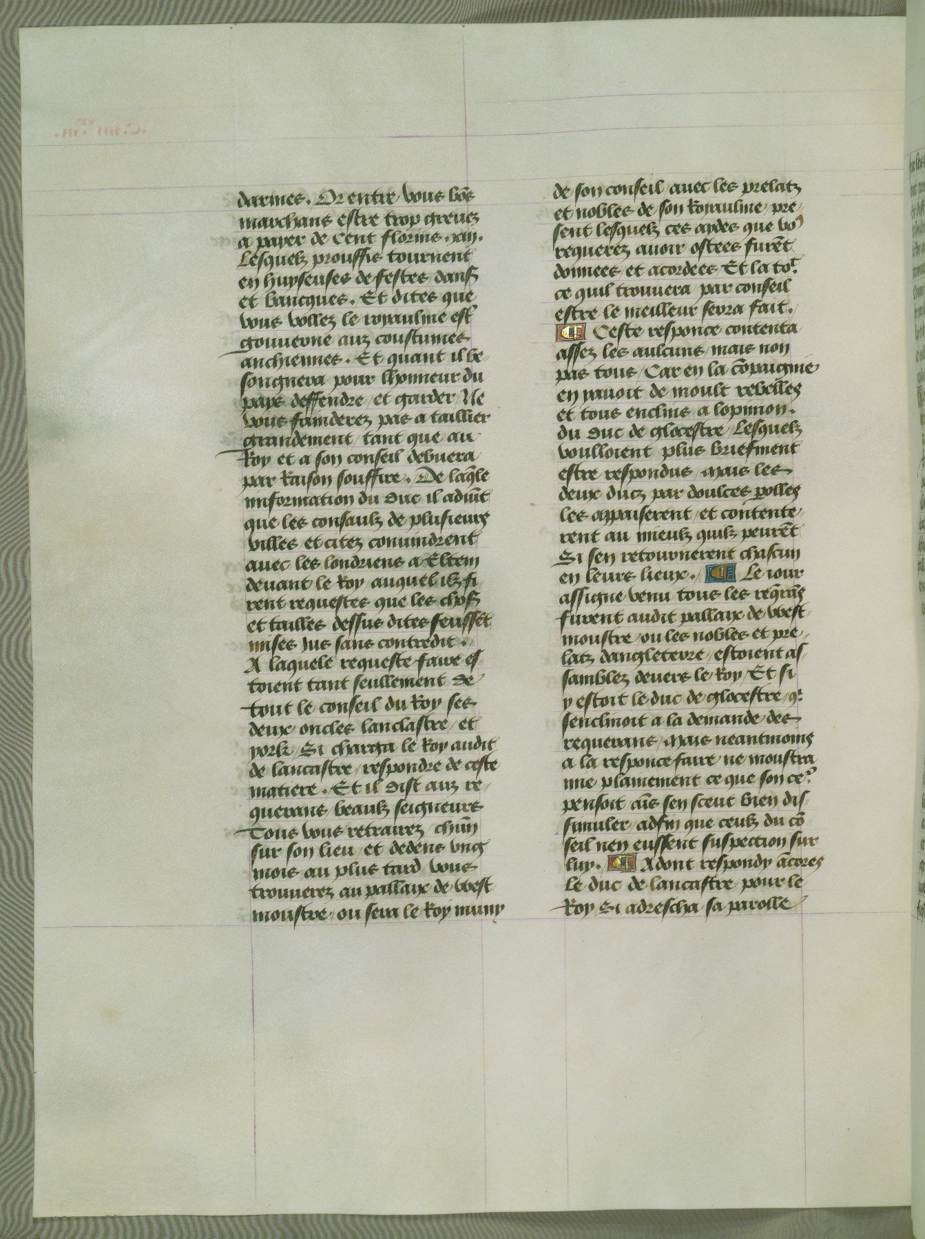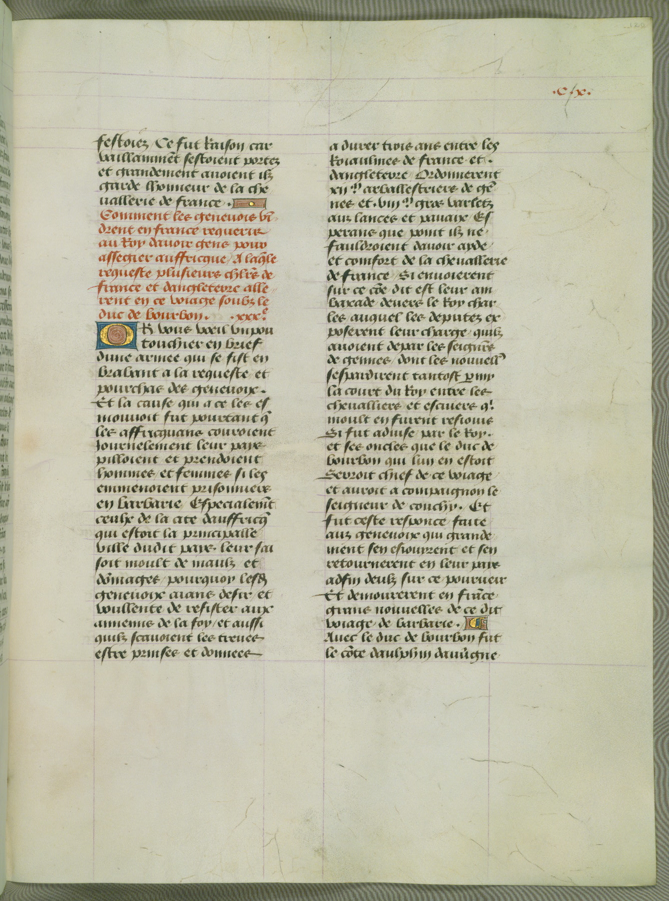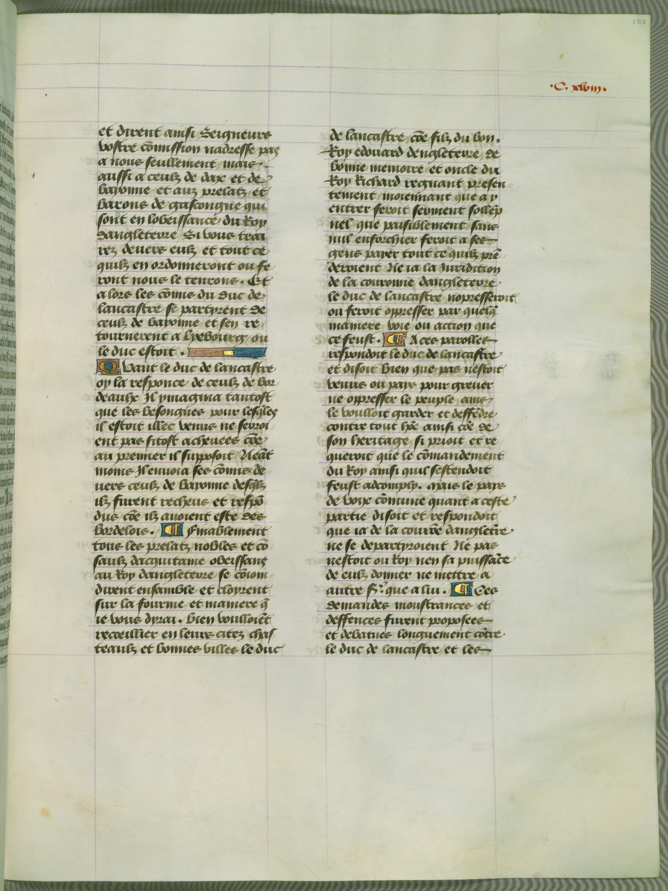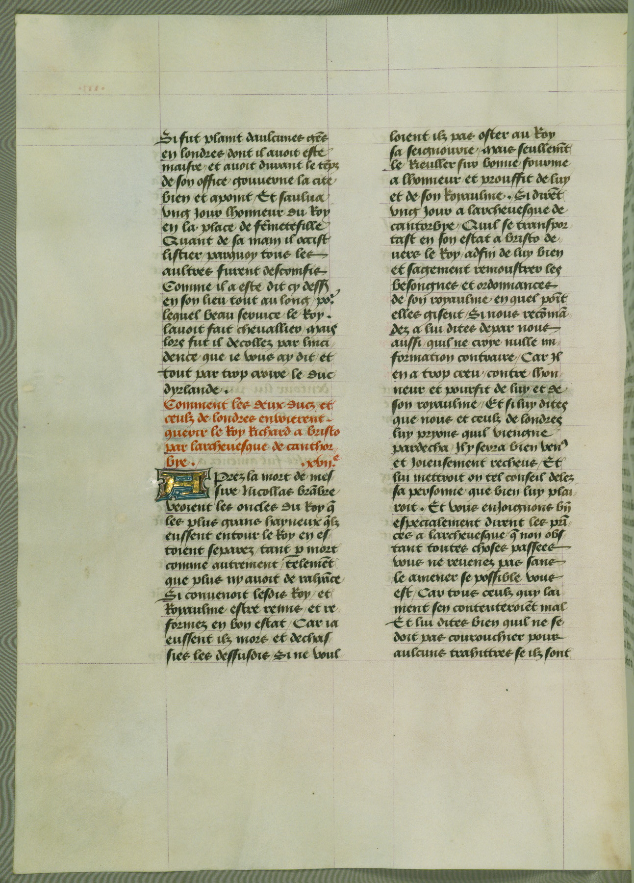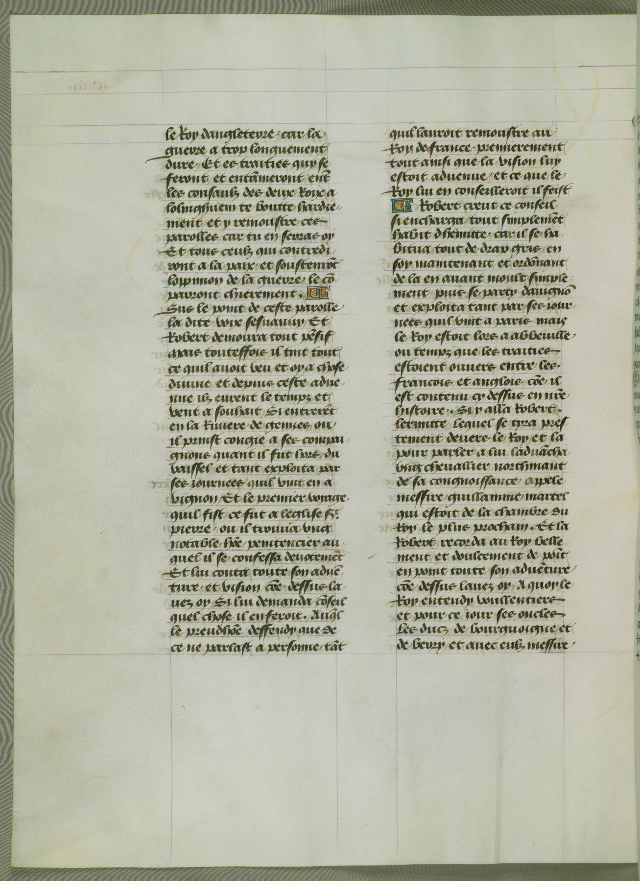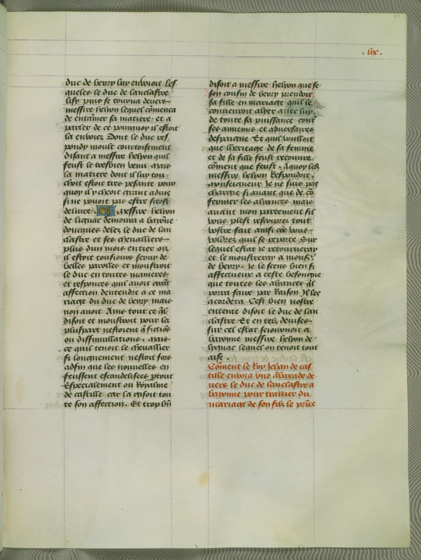 This manuscript is volume IV in a set of five from the collection "Recueil des chroniques et anchiennes istories de la Grant Bretaigne," written by Phillip the Good's counselor and chamberlain Jean de Wavrin. It chronicles the history of England from the early years of the reign of Richard II in 1377 to the demise of Henry IV, his successor, between 1400 and 1413. This volume, produced in Flanders between 1470 and 1480, was part of a set of which volumes II, III and V were recorded in the inventory of the library of William III of Orange in 1686, and was later rebound during the seventeenth or eighteenth century. Six three-quarter-page miniatures open the text of each book and depict events documented therein (with the exception of that of Book 1, portraying Richard II's coronation, which occurs prior to the period detailed in that book). The manuscript's margins are wide and relatively pristine throughout the textblock, but show significant signs of use on illuminated folios, indicating that this manuscript was primarily used for display and not as a historical text. Although few volumes of the Chroniques remain, this manuscript is particularly rare in that it is one of the two surviving exemplars of the text of volume IV, the other being part of the complete set in the Bibliothèque nationale de France (BN fr. 74-85). Volumes II, III, and V of the set to which this volume originally belonged are now in the collection of the Koninklijke Bibliotheek (Den Haag, KB : 133 A 7).