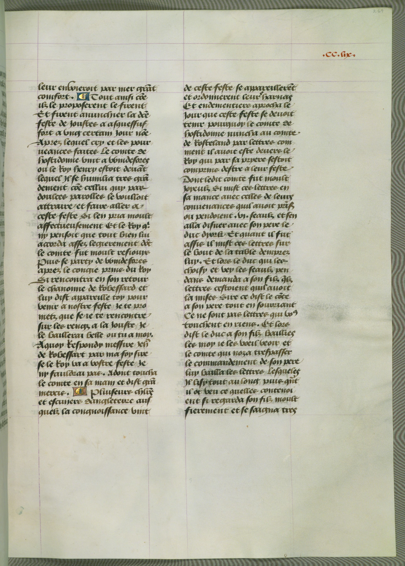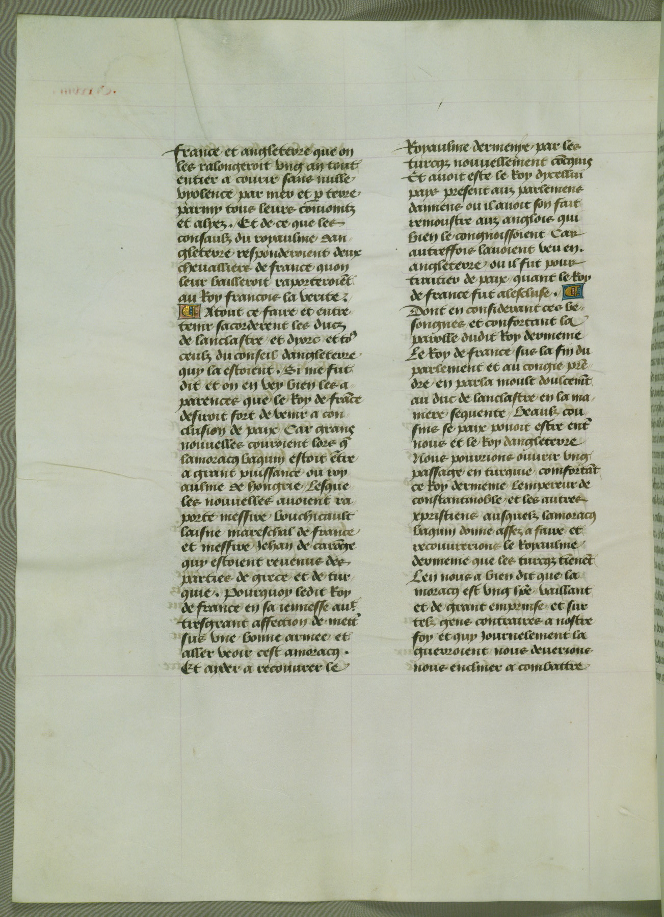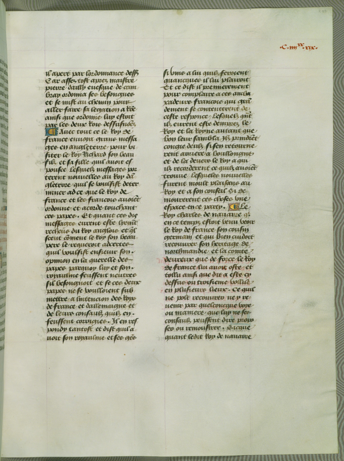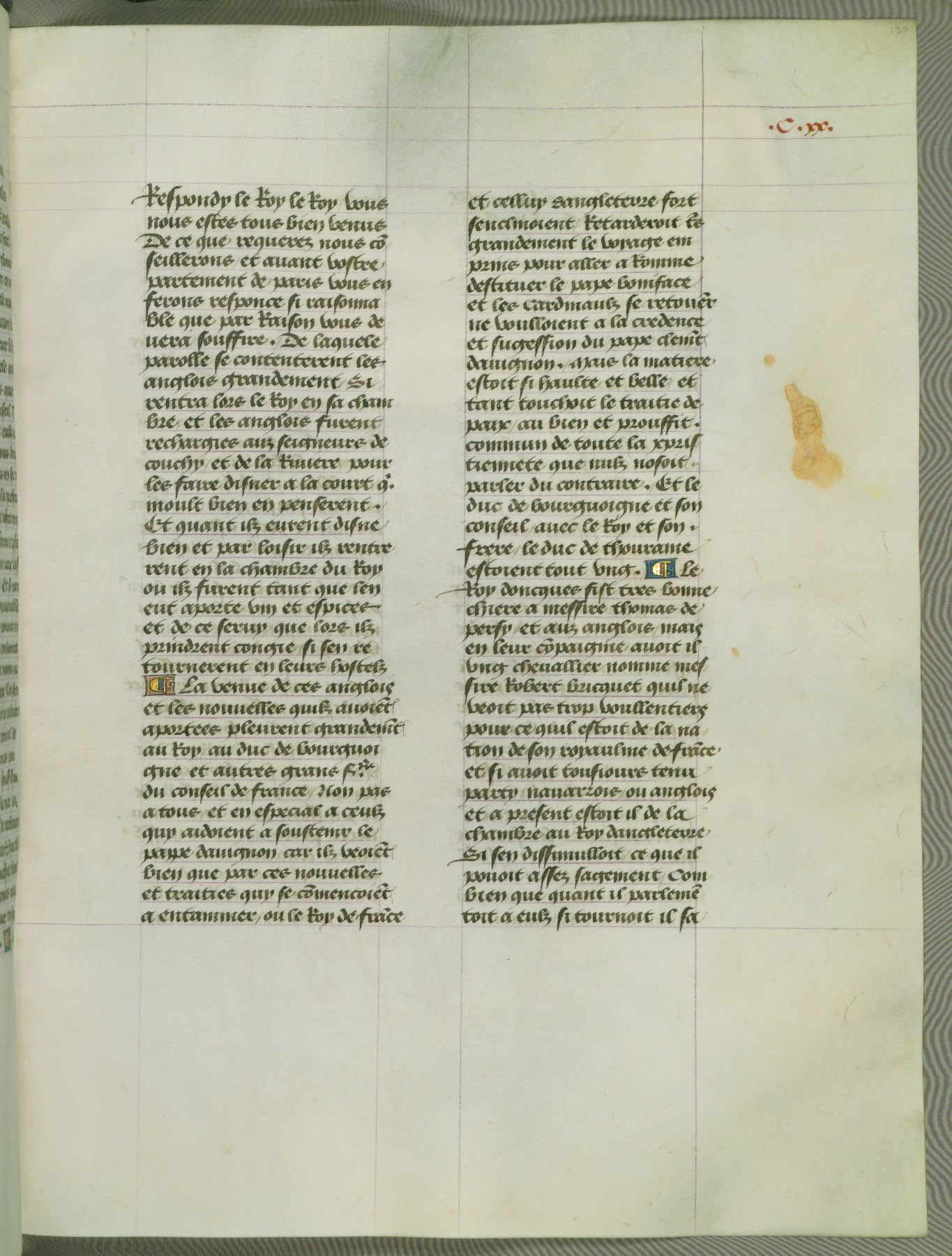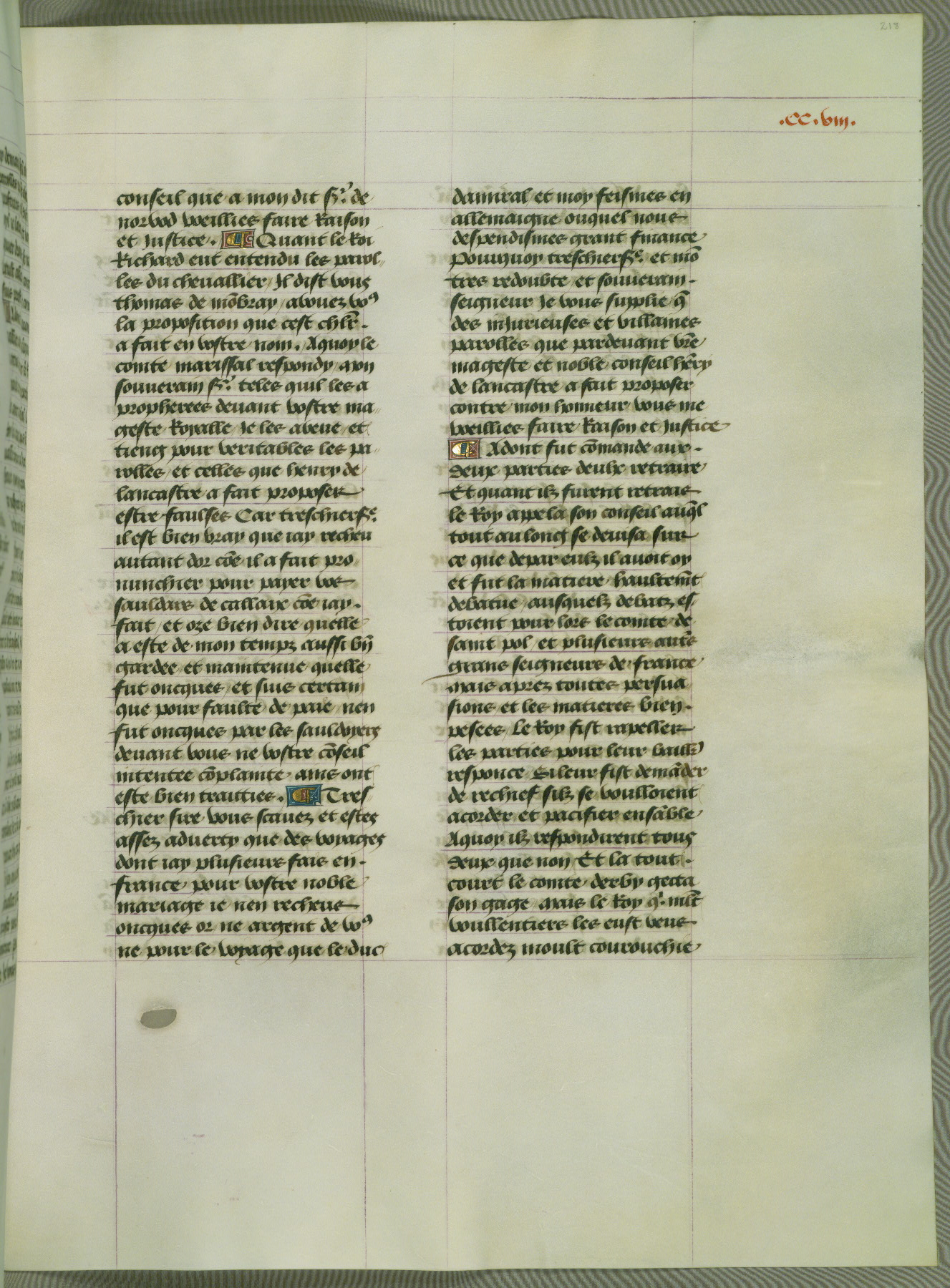 This manuscript is volume IV in a set of five from the collection "Recueil des chroniques et anchiennes istories de la Grant Bretaigne," written by Phillip the Good's counselor and chamberlain Jean de Wavrin. It chronicles the history of England from the early years of the reign of Richard II in 1377 to the demise of Henry IV, his successor, between 1400 and 1413. This volume, produced in Flanders between 1470 and 1480, was part of a set of which volumes II, III and V were recorded in the inventory of the library of William III of Orange in 1686, and was later rebound during the seventeenth or eighteenth century. Six three-quarter-page miniatures open the text of each book and depict events documented therein (with the exception of that of Book 1, portraying Richard II's coronation, which occurs prior to the period detailed in that book). The manuscript's margins are wide and relatively pristine throughout the textblock, but show significant signs of use on illuminated folios, indicating that this manuscript was primarily used for display and not as a historical text. Although few volumes of the Chroniques remain, this manuscript is particularly rare in that it is one of the two surviving exemplars of the text of volume IV, the other being part of the complete set in the Bibliothèque nationale de France (BN fr. 74-85). Volumes II, III, and V of the set to which this volume originally belonged are now in the collection of the Koninklijke Bibliotheek (Den Haag, KB : 133 A 7).