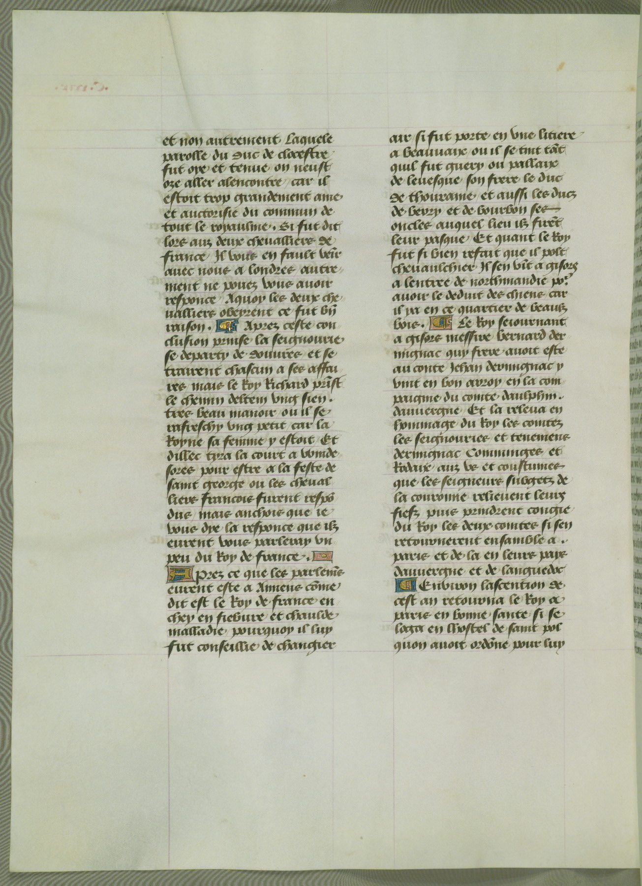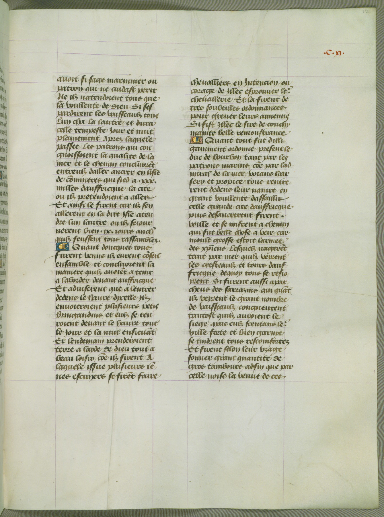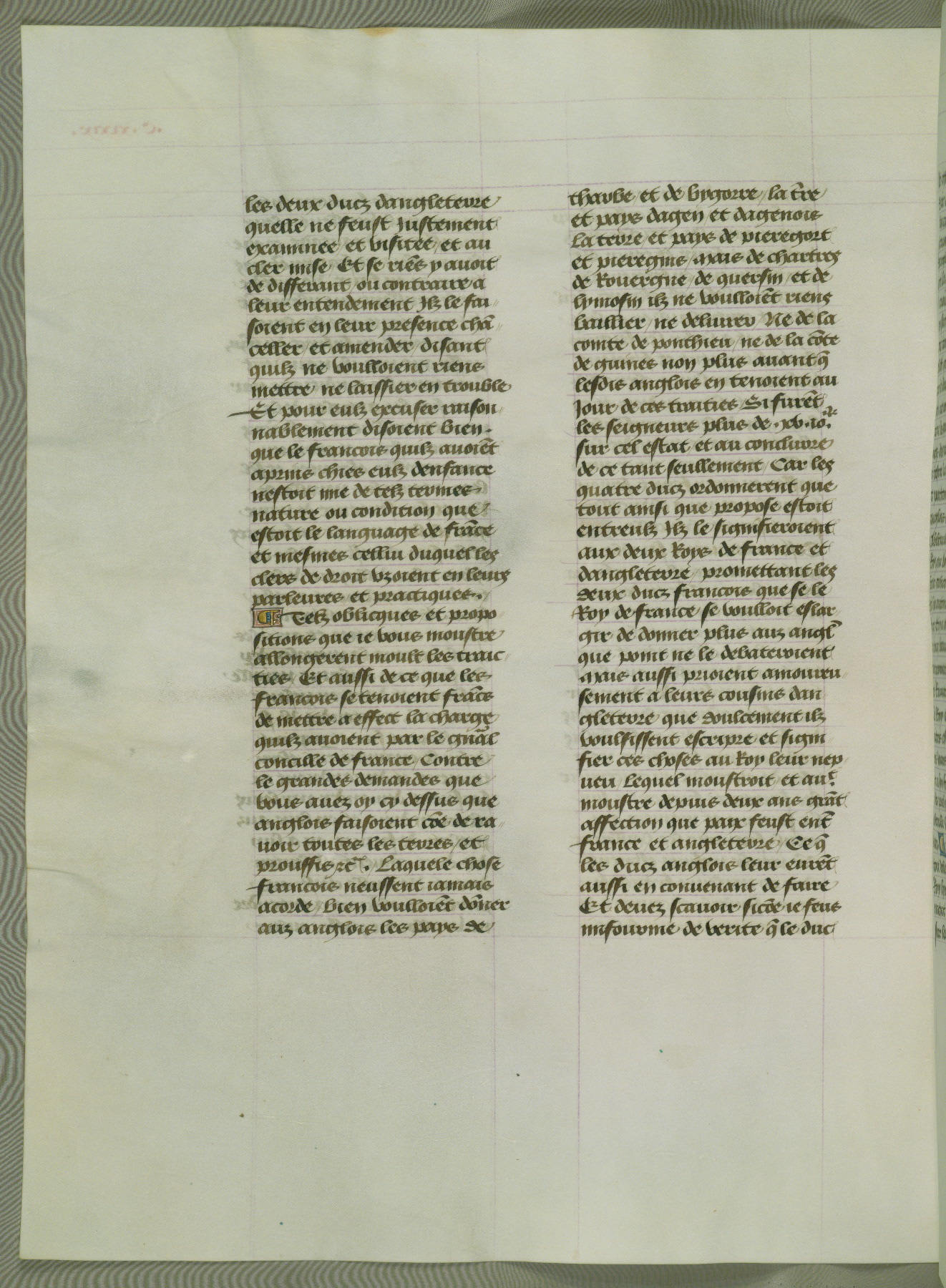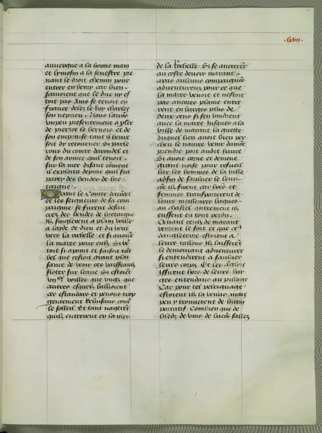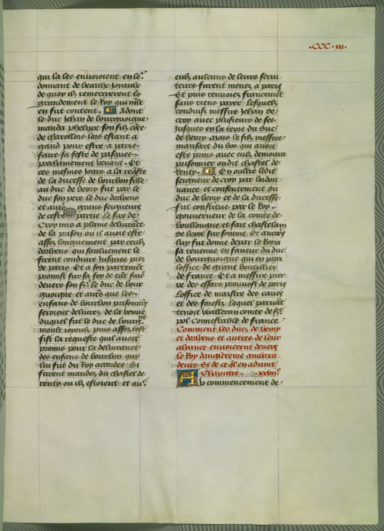This manuscript is volume IV in a set of five from the collection "Recueil des chroniques et anchiennes istories de la Grant Bretaigne," written by Phillip the Good's counselor and chamberlain Jean de Wavrin. It chronicles the history of England from the early years of the reign of Richard II in 1377 to the demise of Henry IV, his successor, between 1400 and 1413. This volume, produced in Flanders between 1470 and 1480, was part of a set of which volumes II, III and V were recorded in the inventory of the library of William III of Orange in 1686, and was later rebound during the seventeenth or eighteenth century. Six three-quarter-page miniatures open the text of each book and depict events documented therein (with the exception of that of Book 1, portraying Richard II's coronation, which occurs prior to the period detailed in that book). The manuscript's margins are wide and relatively pristine throughout the textblock, but show significant signs of use on illuminated folios, indicating that this manuscript was primarily used for display and not as a historical text. Although few volumes of the Chroniques remain, this manuscript is particularly rare in that it is one of the two surviving exemplars of the text of volume IV, the other being part of the complete set in the Bibliothèque nationale de France (BN fr. 74-85). Volumes II, III, and V of the set to which this volume originally belonged are now in the collection of the Koninklijke Bibliotheek (Den Haag, KB : 133 A 7).