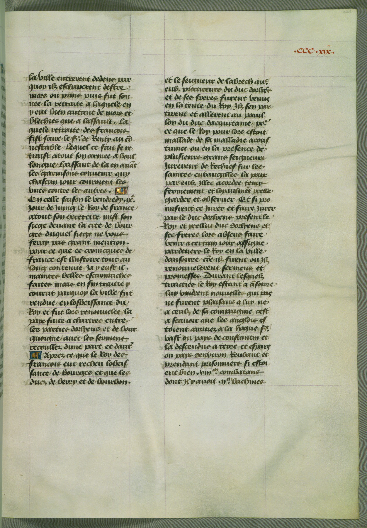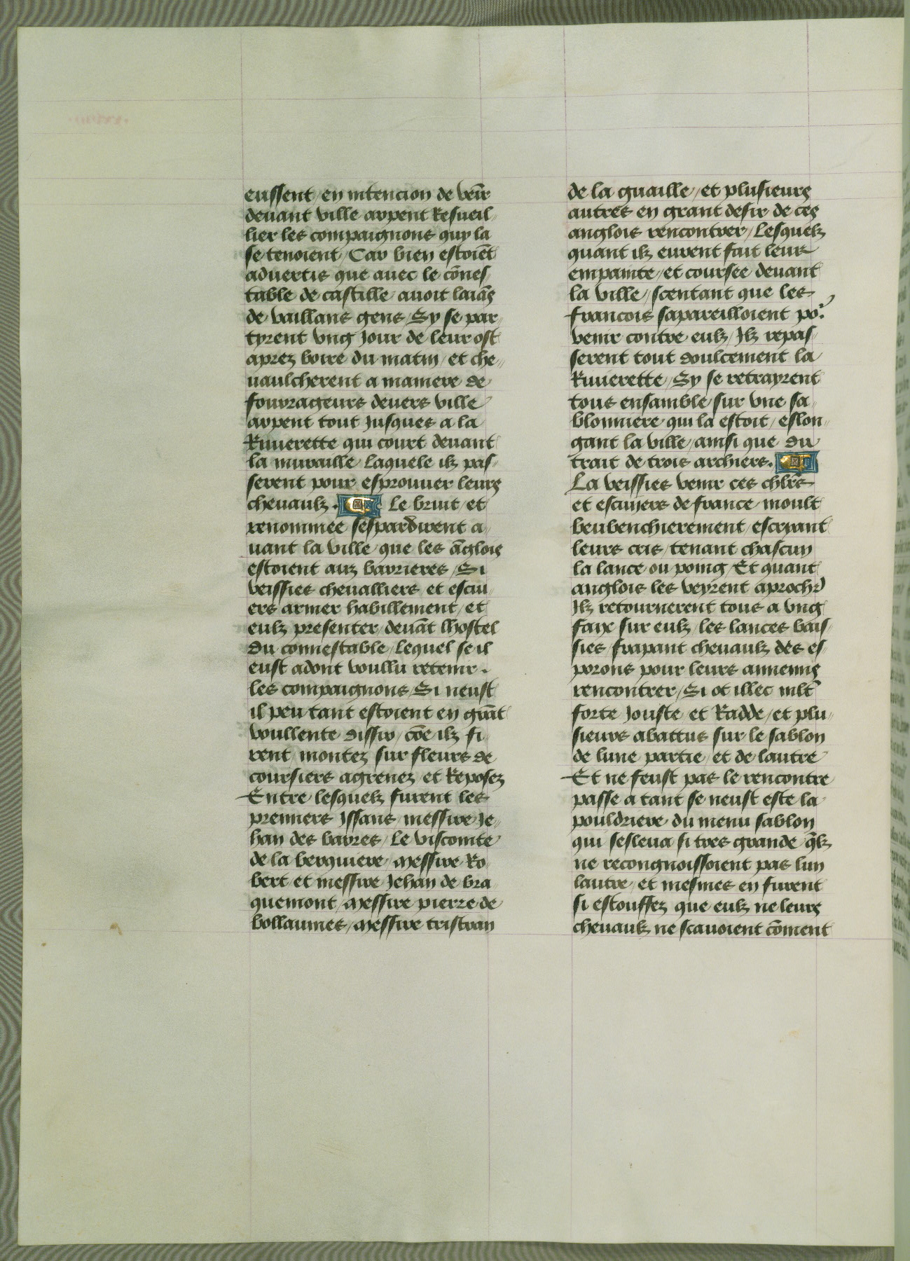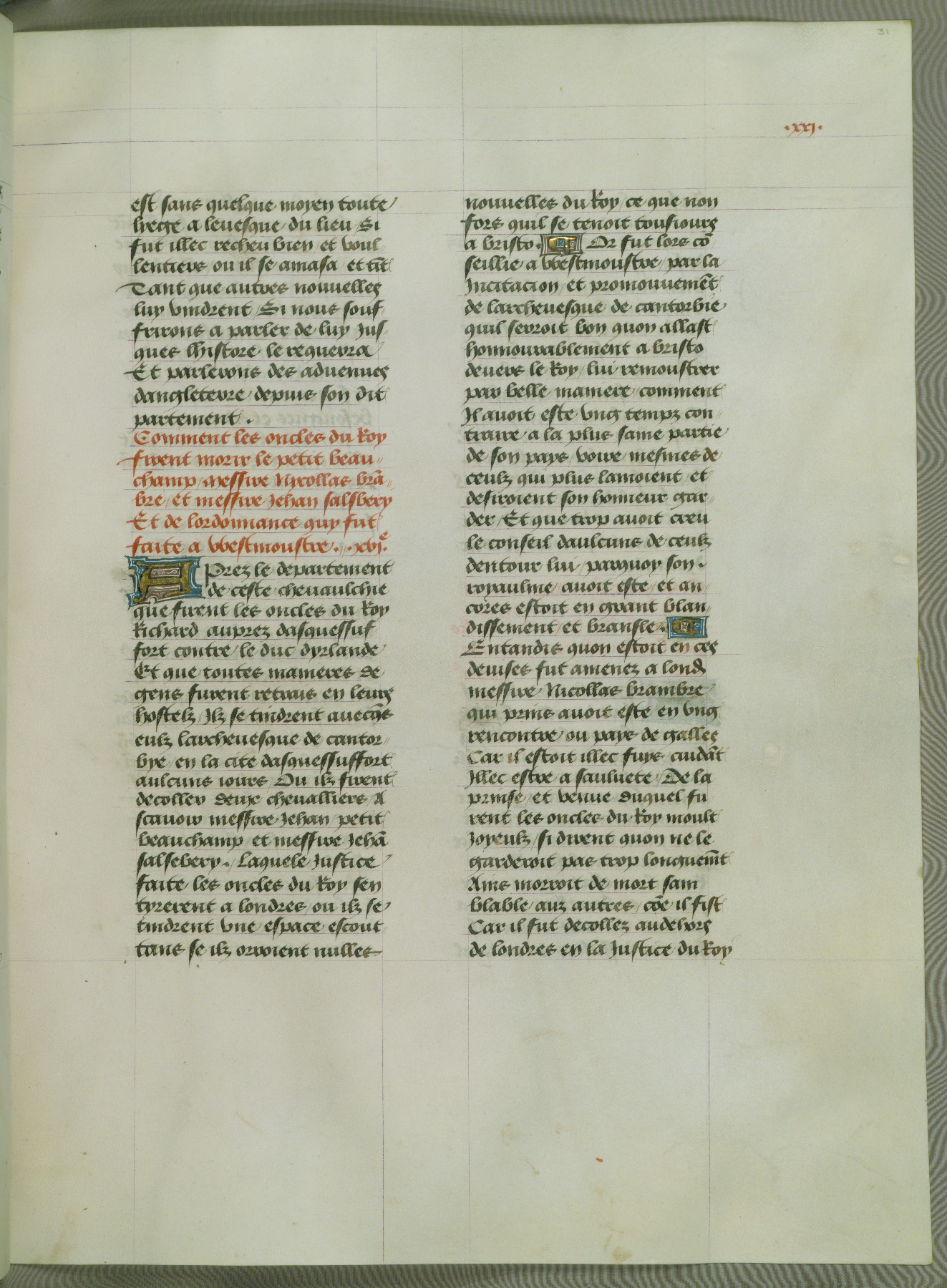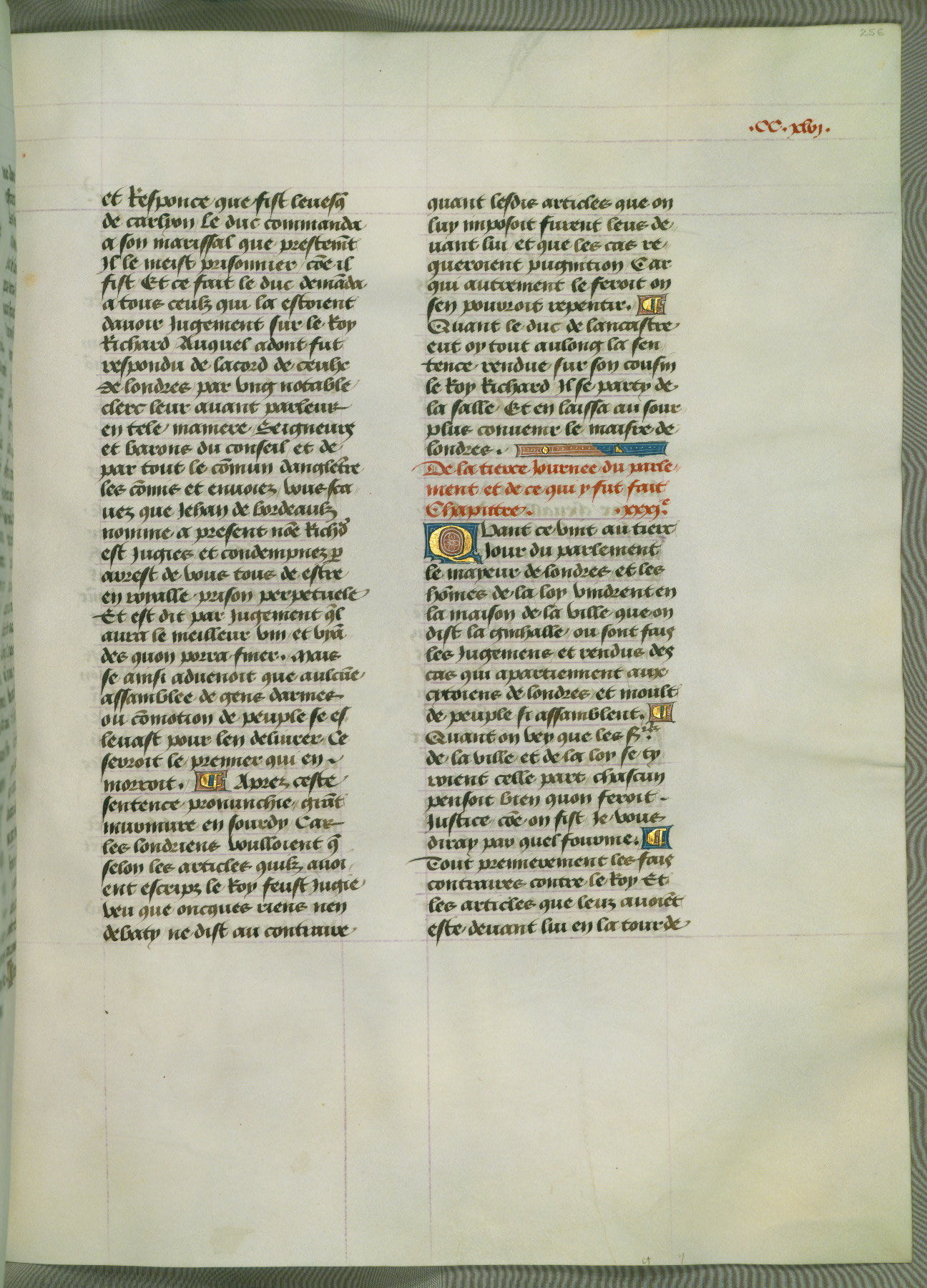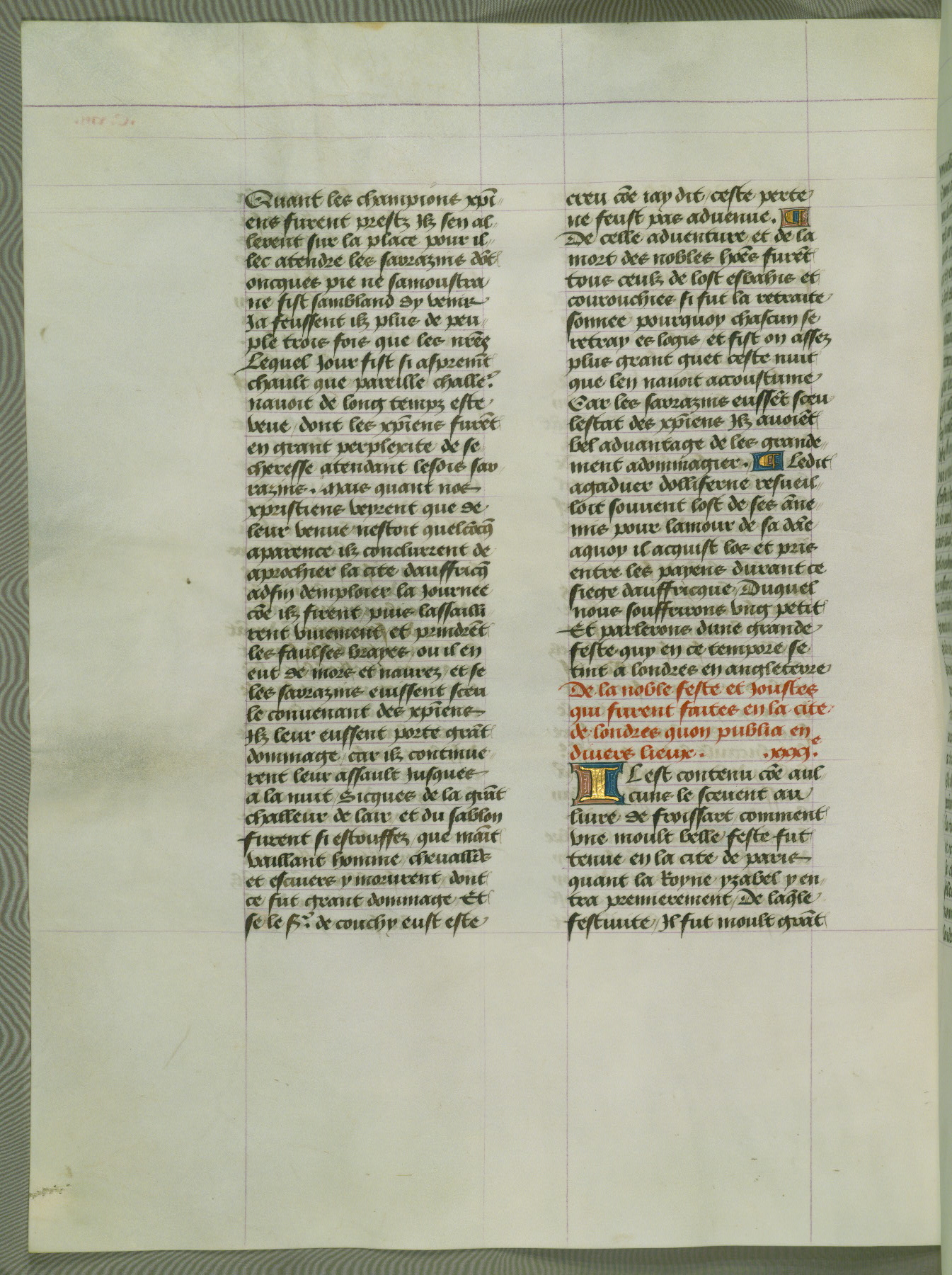 This manuscript is volume IV in a set of five from the collection "Recueil des chroniques et anchiennes istories de la Grant Bretaigne," written by Phillip the Good's counselor and chamberlain Jean de Wavrin. It chronicles the history of England from the early years of the reign of Richard II in 1377 to the demise of Henry IV, his successor, between 1400 and 1413. This volume, produced in Flanders between 1470 and 1480, was part of a set of which volumes II, III and V were recorded in the inventory of the library of William III of Orange in 1686, and was later rebound during the seventeenth or eighteenth century. Six three-quarter-page miniatures open the text of each book and depict events documented therein (with the exception of that of Book 1, portraying Richard II's coronation, which occurs prior to the period detailed in that book). The manuscript's margins are wide and relatively pristine throughout the textblock, but show significant signs of use on illuminated folios, indicating that this manuscript was primarily used for display and not as a historical text. Although few volumes of the Chroniques remain, this manuscript is particularly rare in that it is one of the two surviving exemplars of the text of volume IV, the other being part of the complete set in the Bibliothèque nationale de France (BN fr. 74-85). Volumes II, III, and V of the set to which this volume originally belonged are now in the collection of the Koninklijke Bibliotheek (Den Haag, KB : 133 A 7).