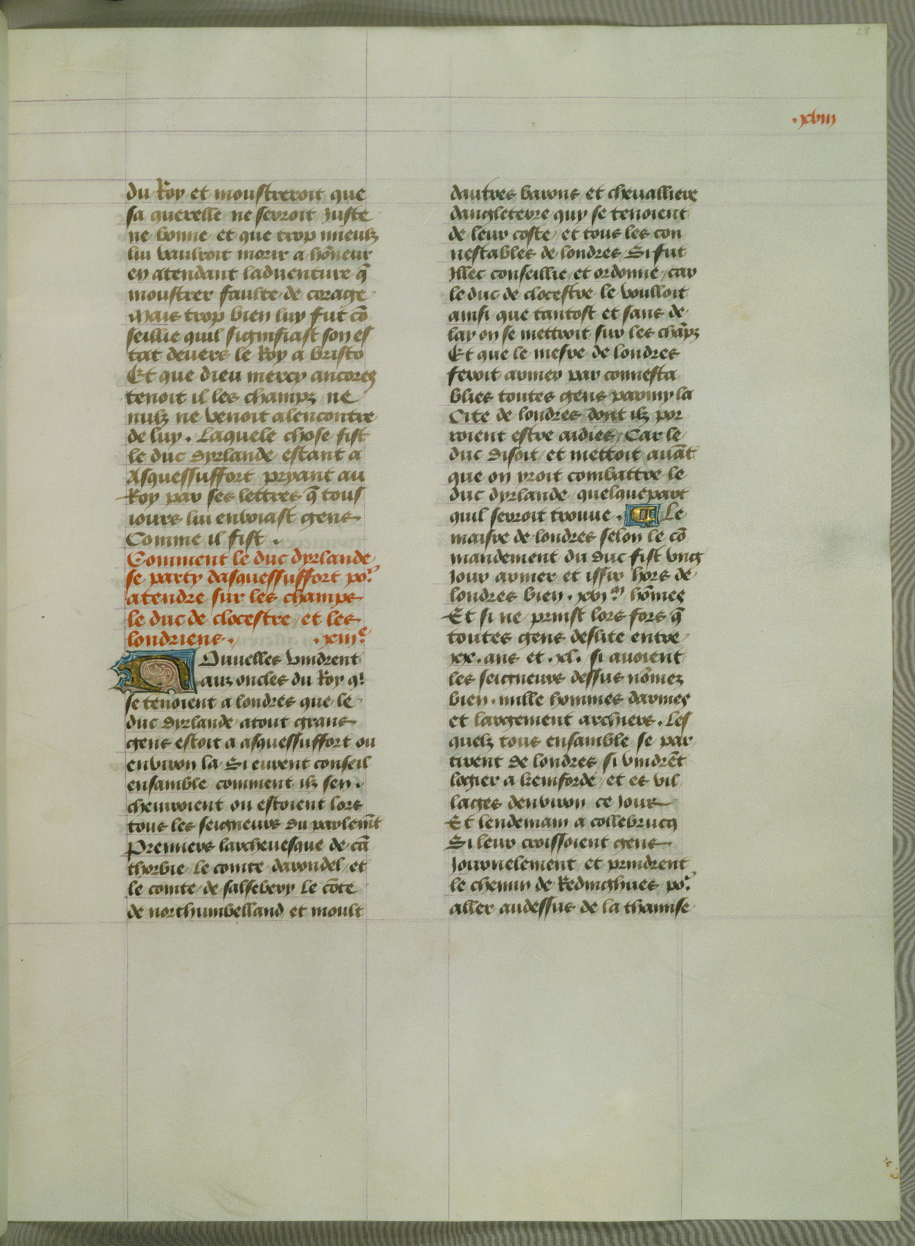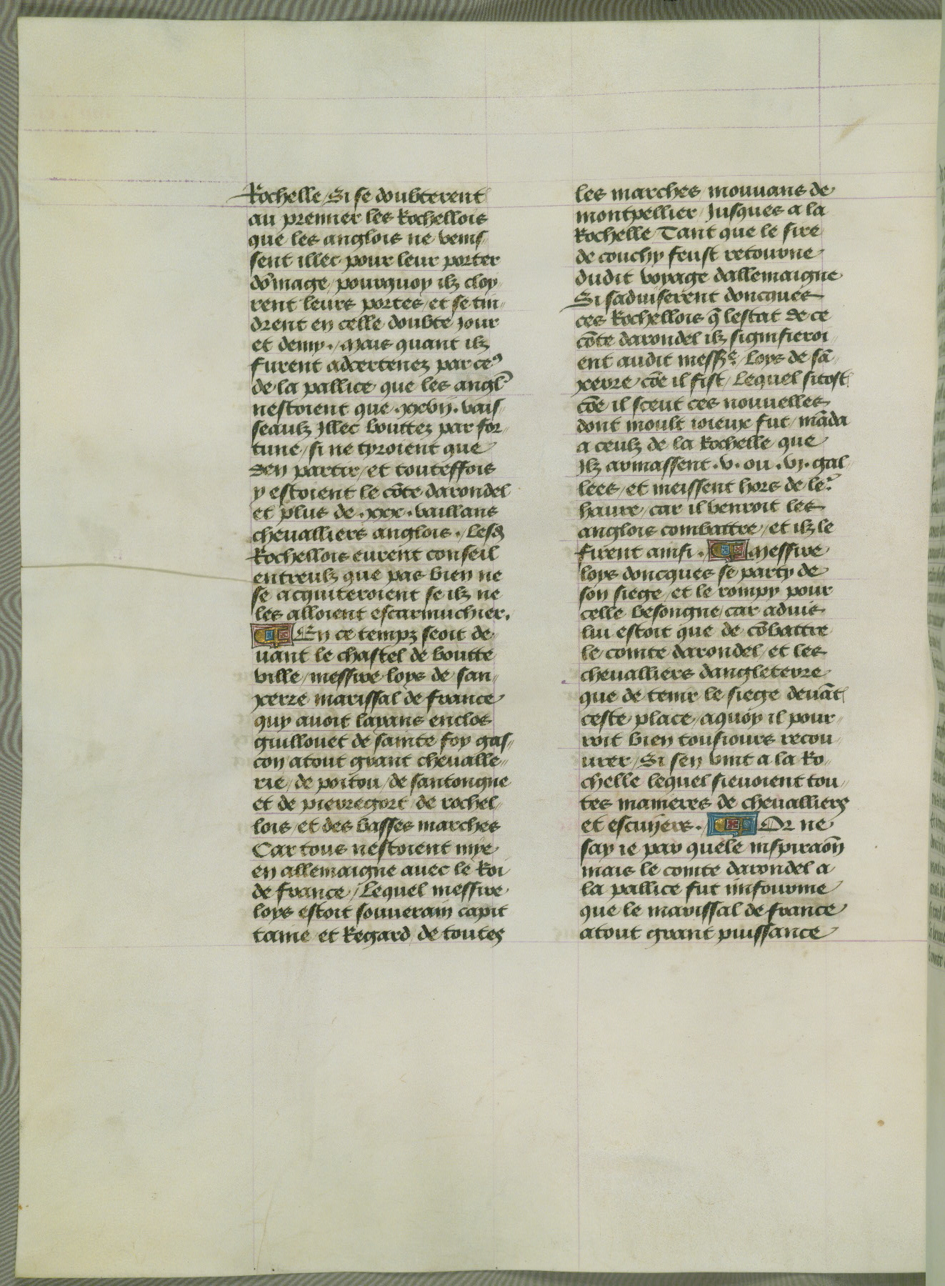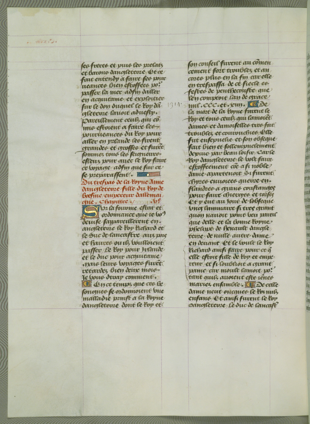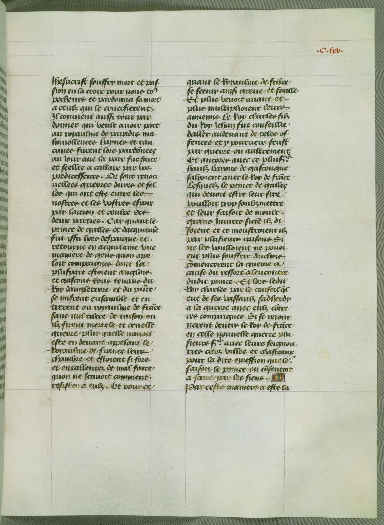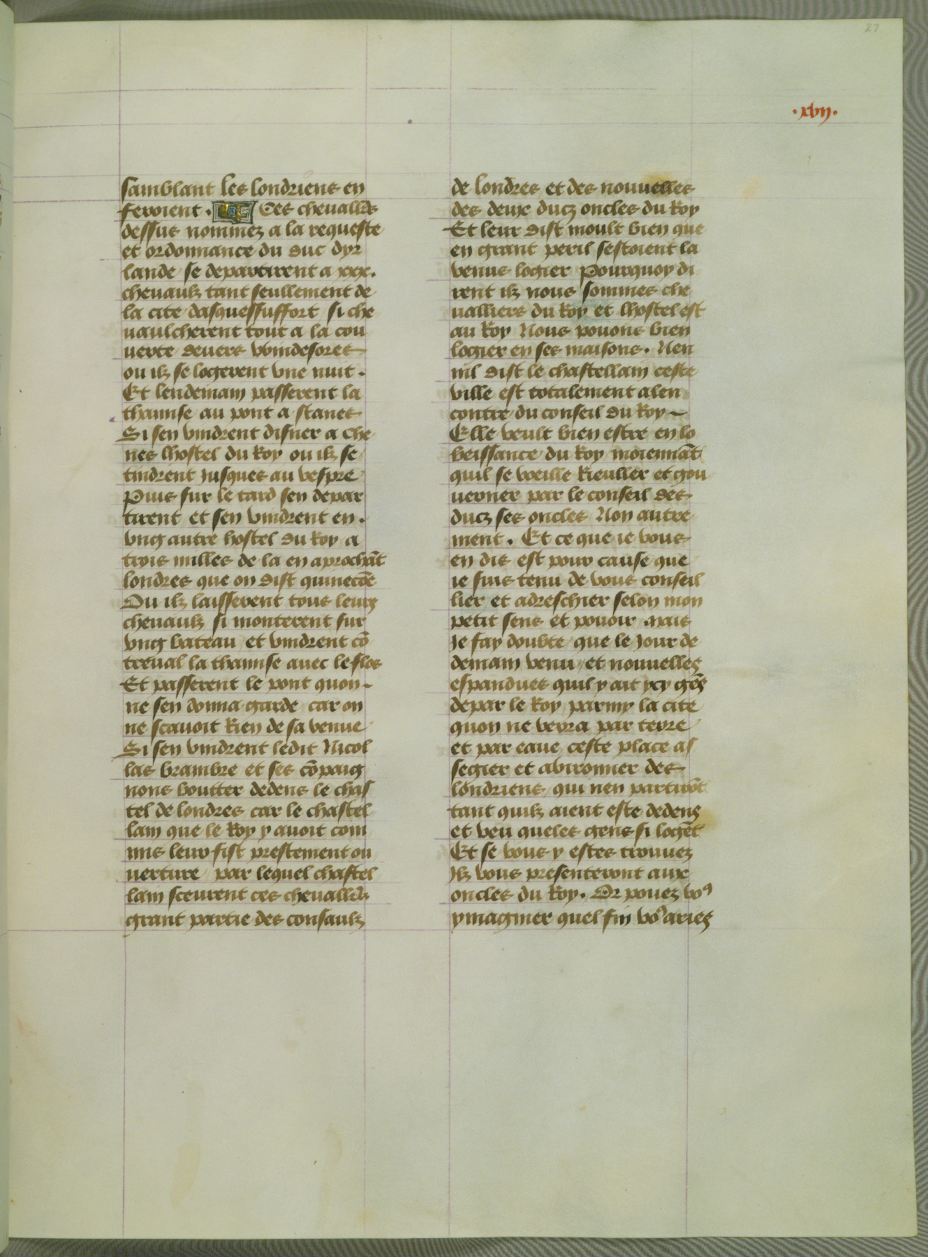 This manuscript is volume IV in a set of five from the collection "Recueil des chroniques et anchiennes istories de la Grant Bretaigne," written by Phillip the Good's counselor and chamberlain Jean de Wavrin. It chronicles the history of England from the early years of the reign of Richard II in 1377 to the demise of Henry IV, his successor, between 1400 and 1413. This volume, produced in Flanders between 1470 and 1480, was part of a set of which volumes II, III and V were recorded in the inventory of the library of William III of Orange in 1686, and was later rebound during the seventeenth or eighteenth century. Six three-quarter-page miniatures open the text of each book and depict events documented therein (with the exception of that of Book 1, portraying Richard II's coronation, which occurs prior to the period detailed in that book). The manuscript's margins are wide and relatively pristine throughout the textblock, but show significant signs of use on illuminated folios, indicating that this manuscript was primarily used for display and not as a historical text. Although few volumes of the Chroniques remain, this manuscript is particularly rare in that it is one of the two surviving exemplars of the text of volume IV, the other being part of the complete set in the Bibliothèque nationale de France (BN fr. 74-85). Volumes II, III, and V of the set to which this volume originally belonged are now in the collection of the Koninklijke Bibliotheek (Den Haag, KB : 133 A 7).
