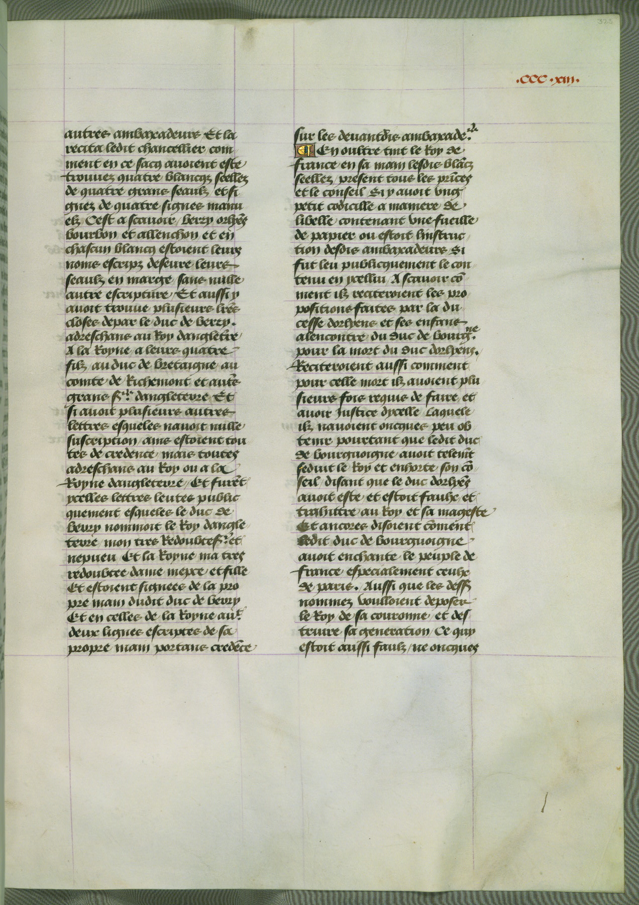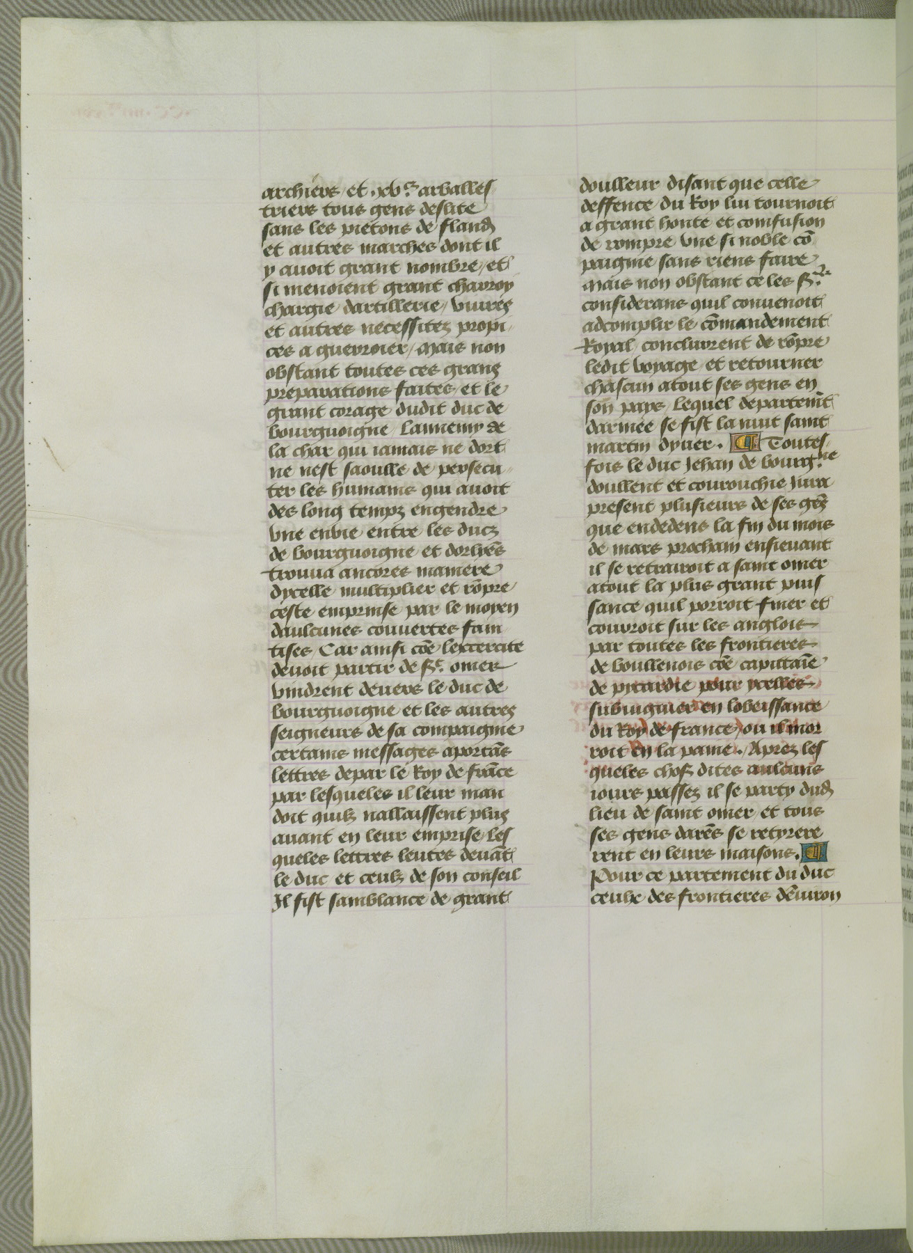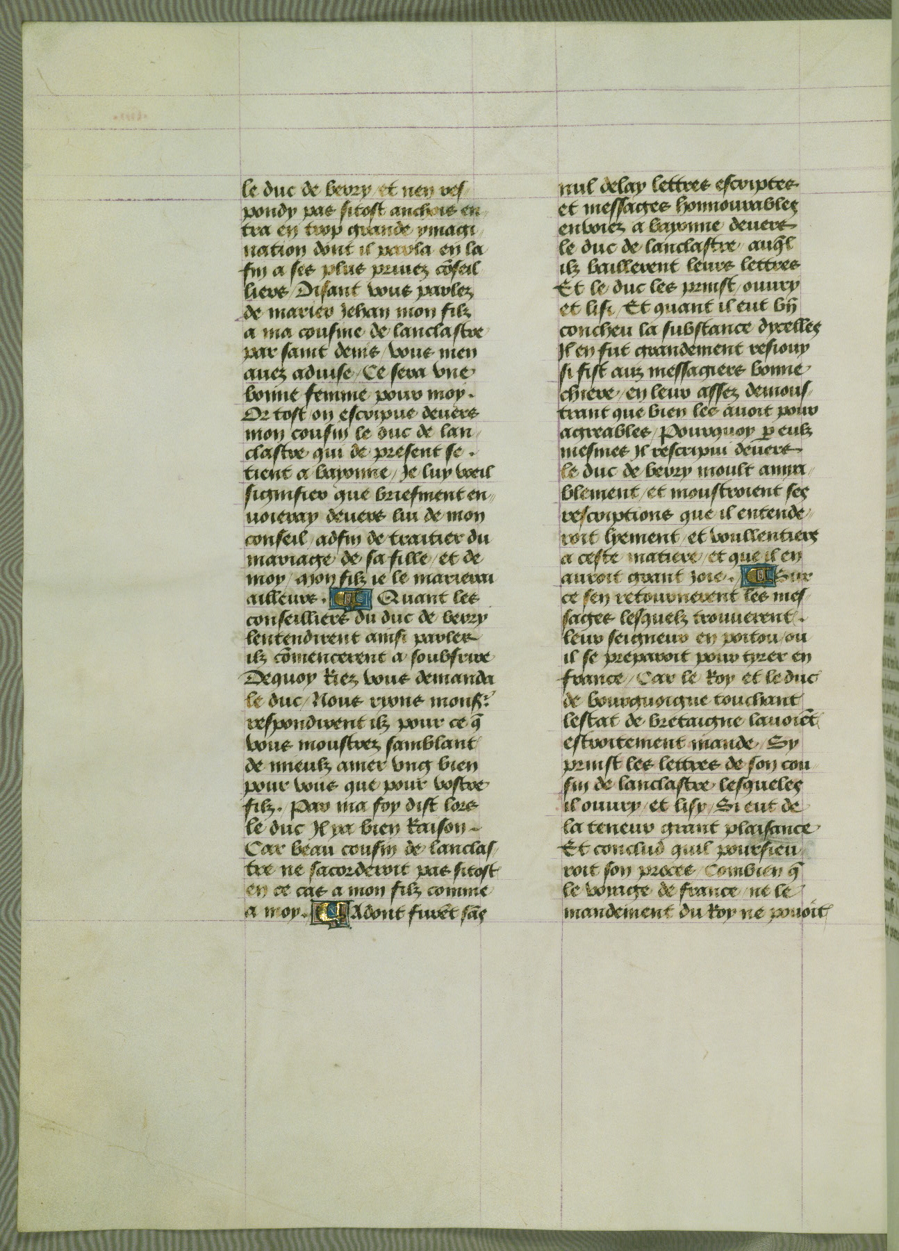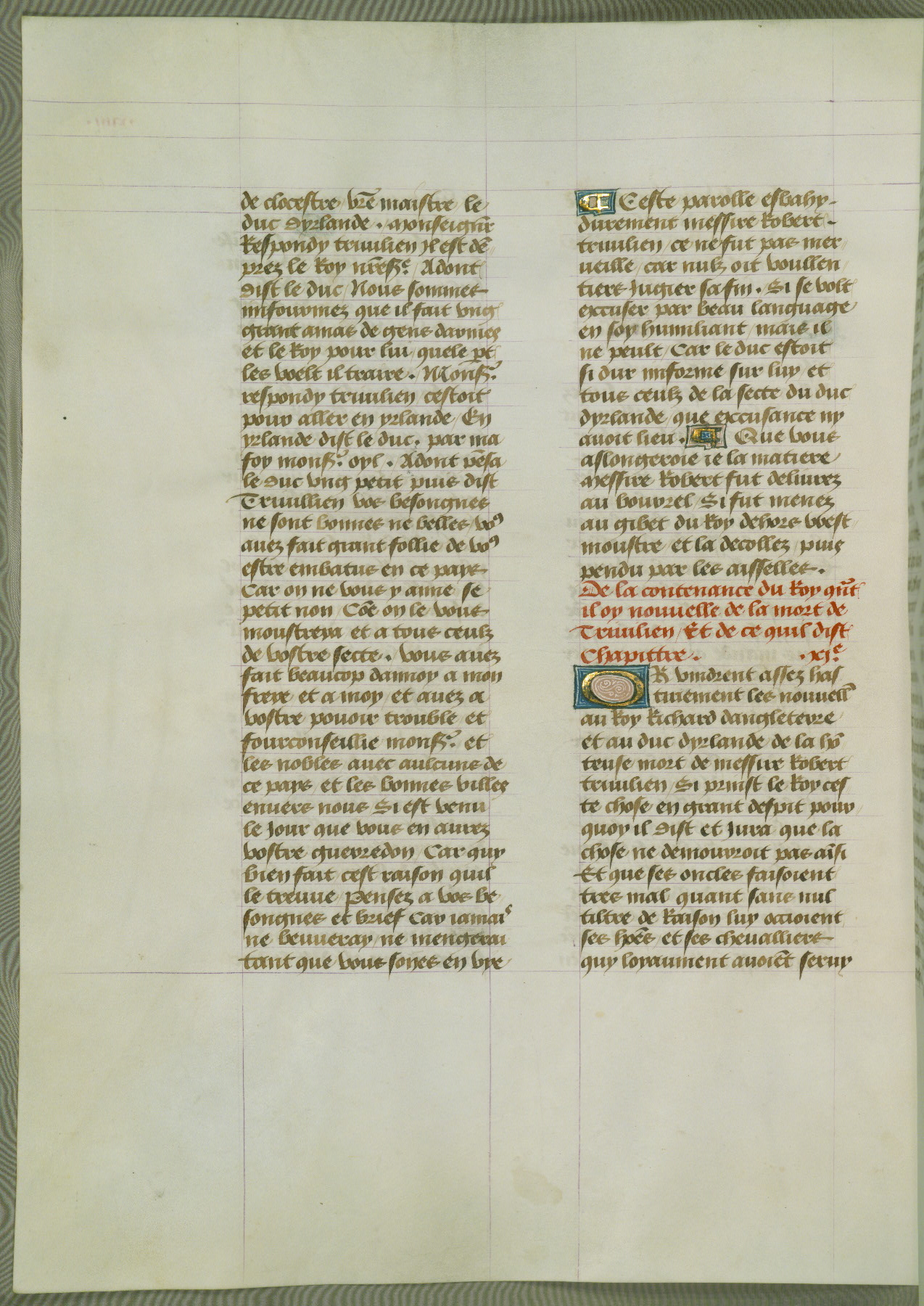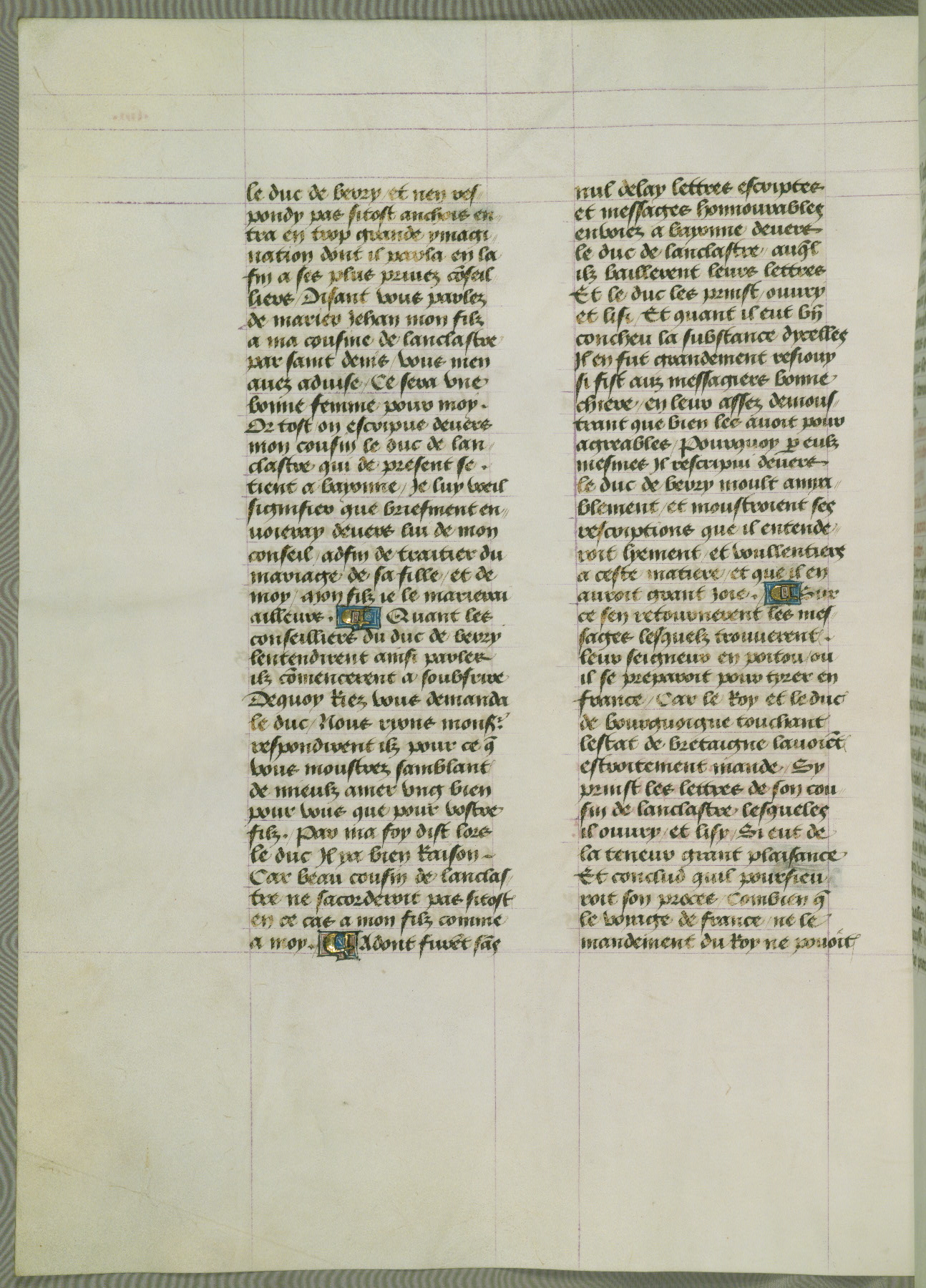 This manuscript is volume IV in a set of five from the collection "Recueil des chroniques et anchiennes istories de la Grant Bretaigne," written by Phillip the Good's counselor and chamberlain Jean de Wavrin. It chronicles the history of England from the early years of the reign of Richard II in 1377 to the demise of Henry IV, his successor, between 1400 and 1413. This volume, produced in Flanders between 1470 and 1480, was part of a set of which volumes II, III and V were recorded in the inventory of the library of William III of Orange in 1686, and was later rebound during the seventeenth or eighteenth century. Six three-quarter-page miniatures open the text of each book and depict events documented therein (with the exception of that of Book 1, portraying Richard II's coronation, which occurs prior to the period detailed in that book). The manuscript's margins are wide and relatively pristine throughout the textblock, but show significant signs of use on illuminated folios, indicating that this manuscript was primarily used for display and not as a historical text. Although few volumes of the Chroniques remain, this manuscript is particularly rare in that it is one of the two surviving exemplars of the text of volume IV, the other being part of the complete set in the Bibliothèque nationale de France (BN fr. 74-85). Volumes II, III, and V of the set to which this volume originally belonged are now in the collection of the Koninklijke Bibliotheek (Den Haag, KB : 133 A 7).